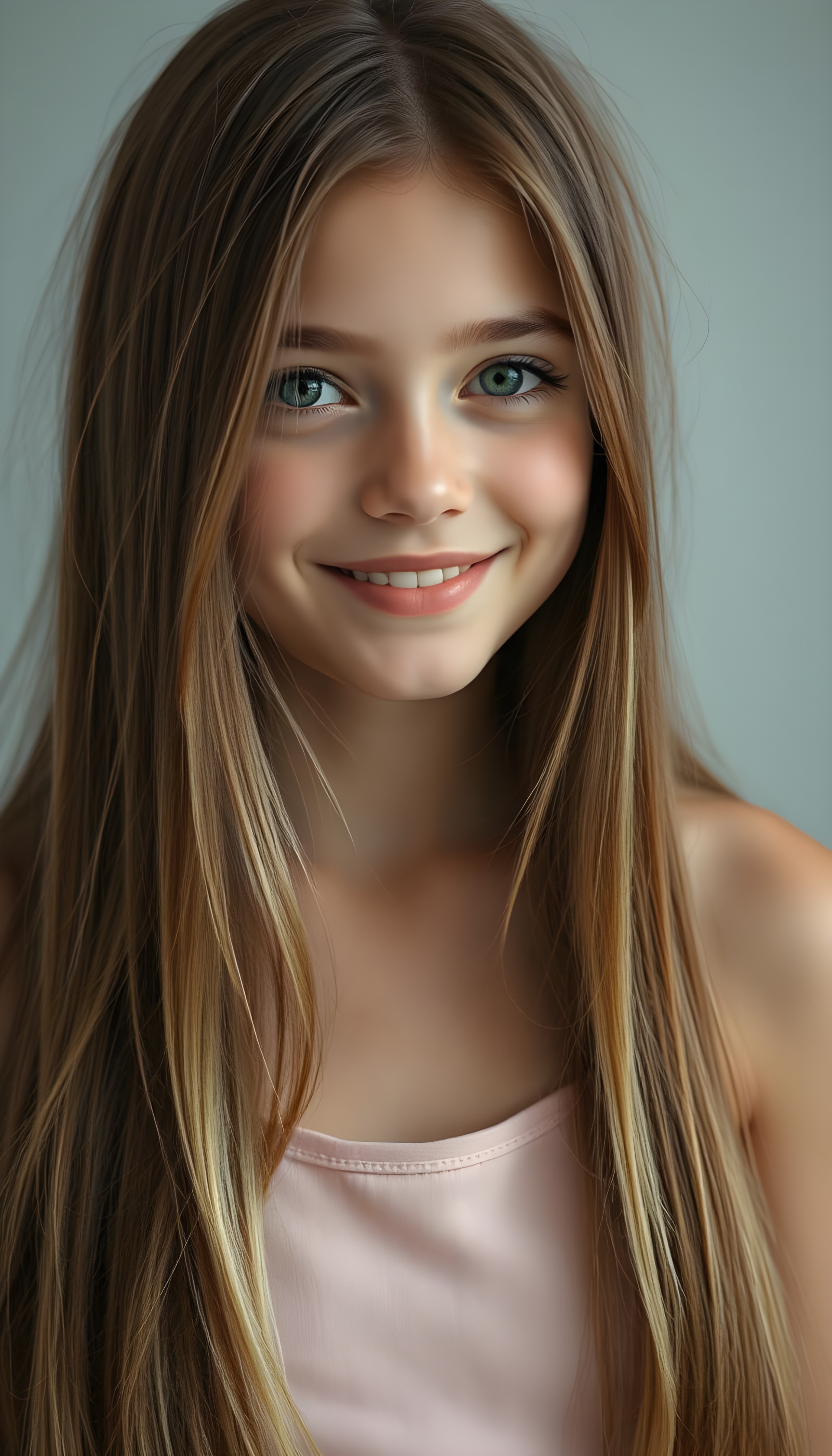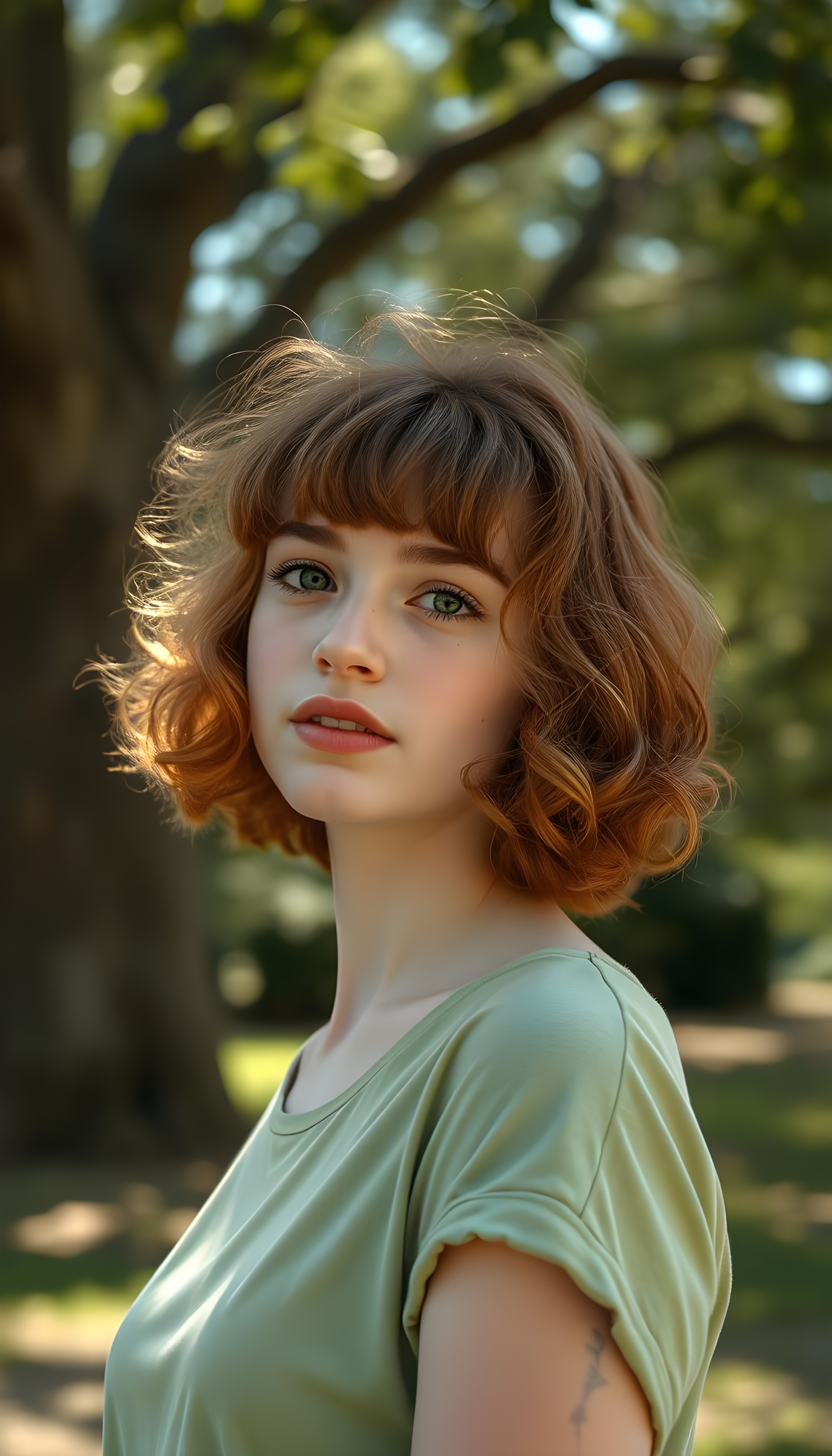 An attractive young woman with long, soft straight brown hair down to her shoulders. She is wearing only a simple blue and white horizontally striped T-shirt and a black beret. She has soft blue eyes and a flawless, round face. Joy. She is standing in a green park with lots of trees.