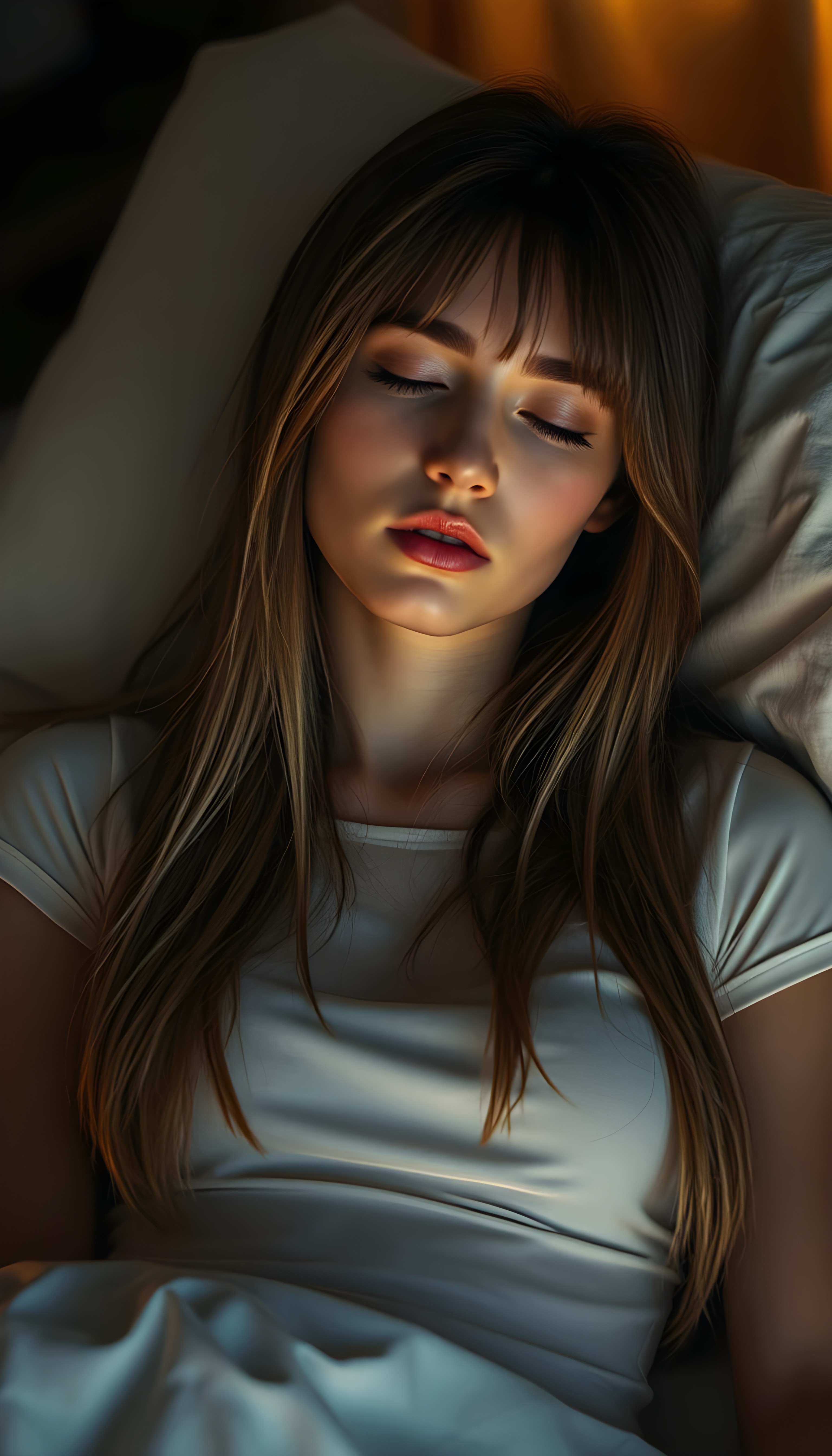 A masterfully detailed realistic photo of a young woman with long, straight dark blond hair, cascading down her shoulders, her features elegantly accentuated under the glow of a professional night photographer’s lens. She slumbers peacefully in a cozy bed, her eyes softly closed, delicate eyelashes resting against her rosy cheeks, while her cut bangs frame her angelic face, enhancing her serene expression. She wears a short, tight white T-shirt that drapes gracefully over her form, crafted from gossamer-thin silk, casting a subtle sheen under the warm, ambient light. The composition is set against a softly lit, dimly lit room, creating a dreamlike, ethereal atmosphere, and a subtle bokeh effect highlighting the tranquil scene.