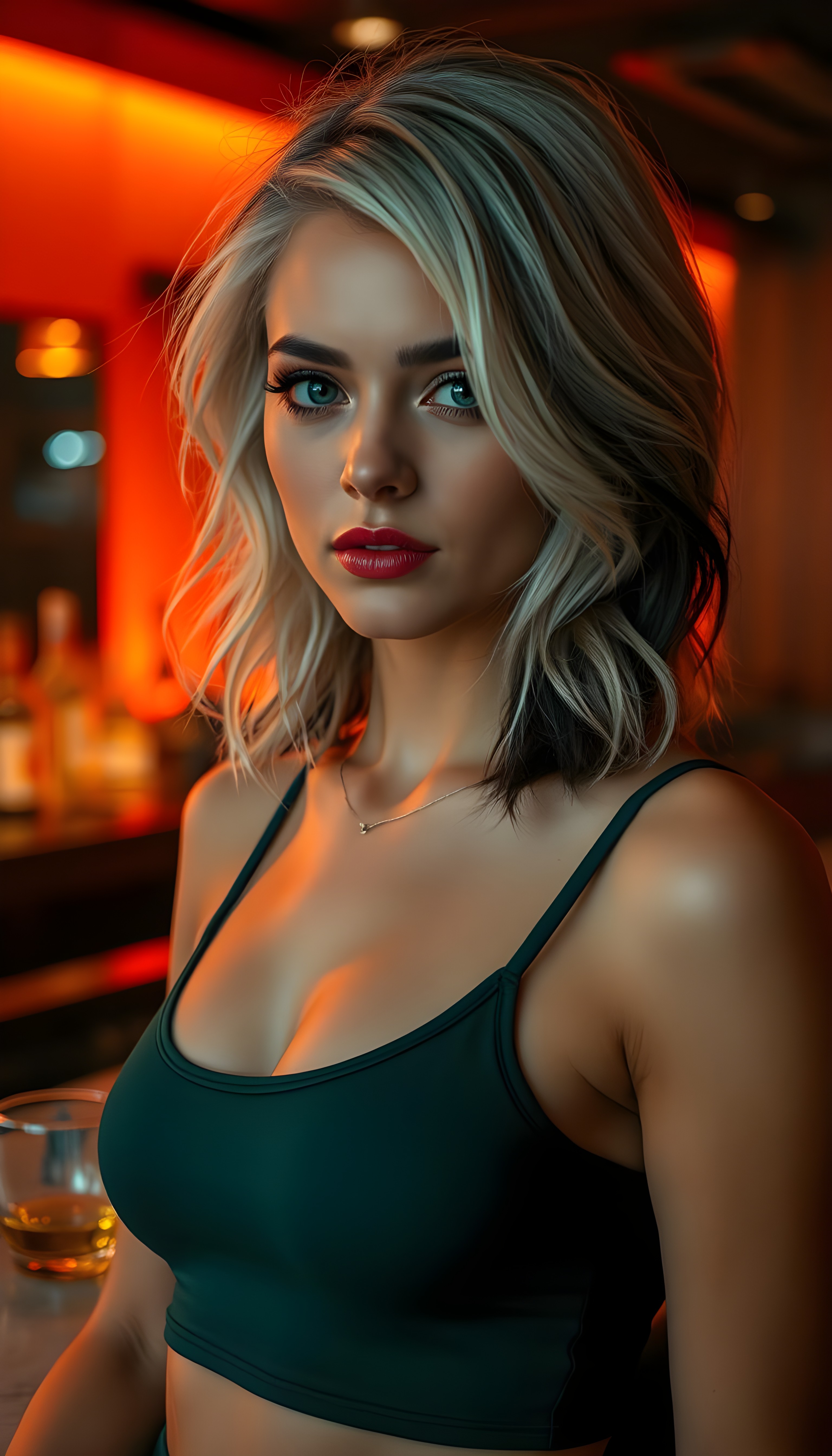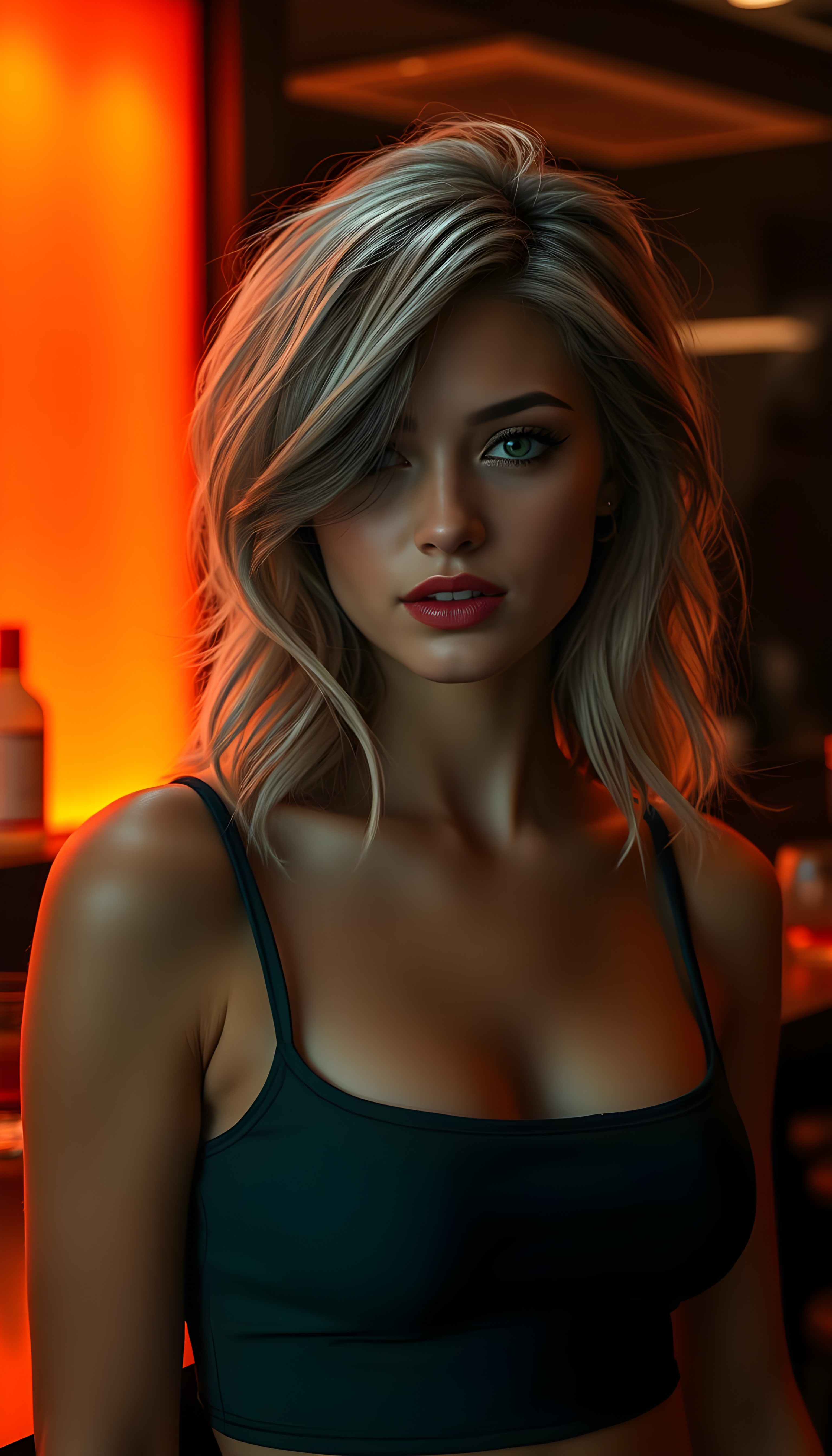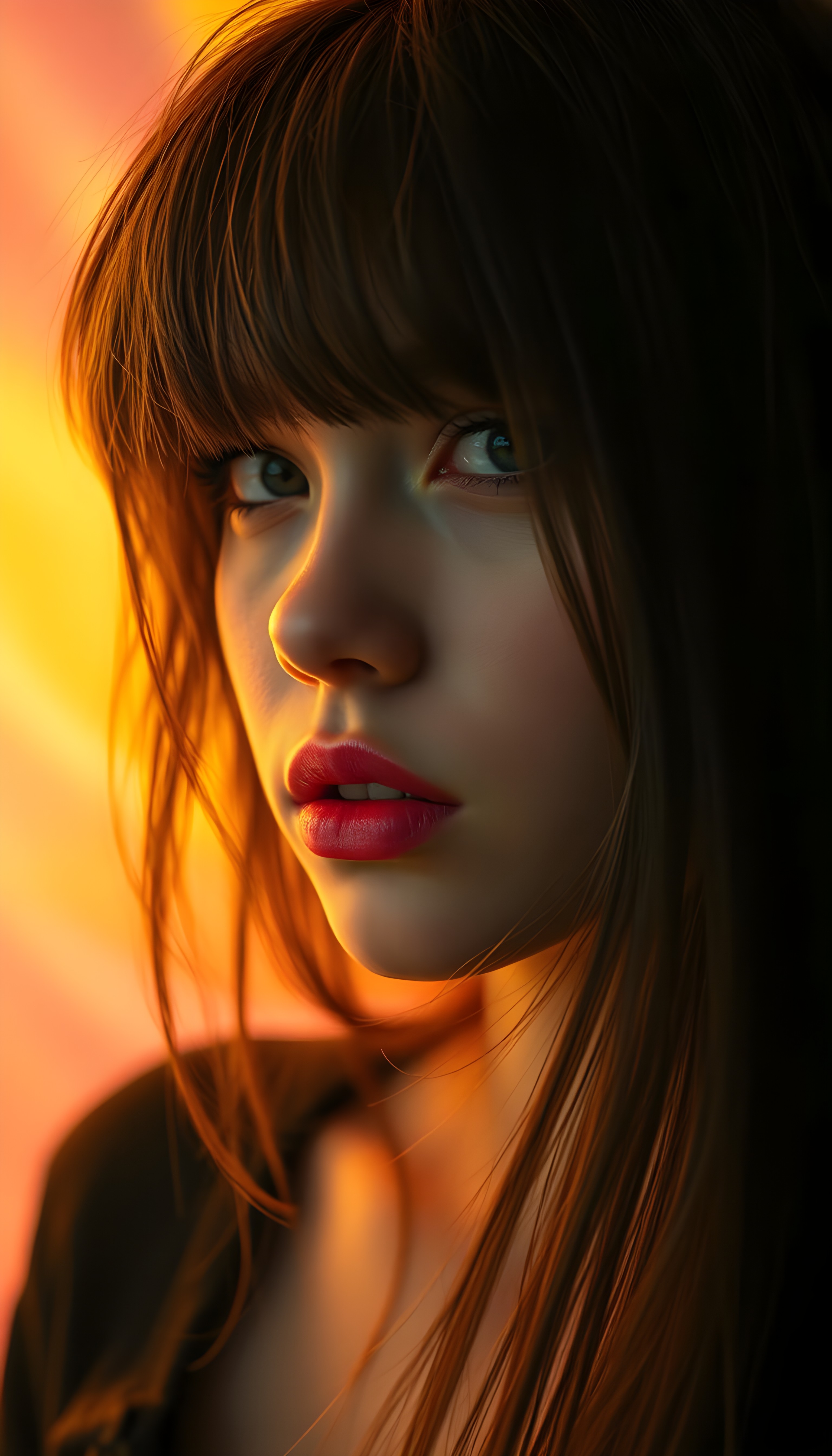 a (((realistically modelled, highly detailed))) (((close-up portrait))), with ((skin complexion)), (((straight hair))), and (((red lips))), capturing a (((cute emo girl aesthetic))) with a (((super long, messy, big hair))), framed by a (((vividly colorful, highly detailed backdrop))) that gives off a (((sunny, psychedelic glow))), suggestive of a (dreamy, cloudy, romantic setting)