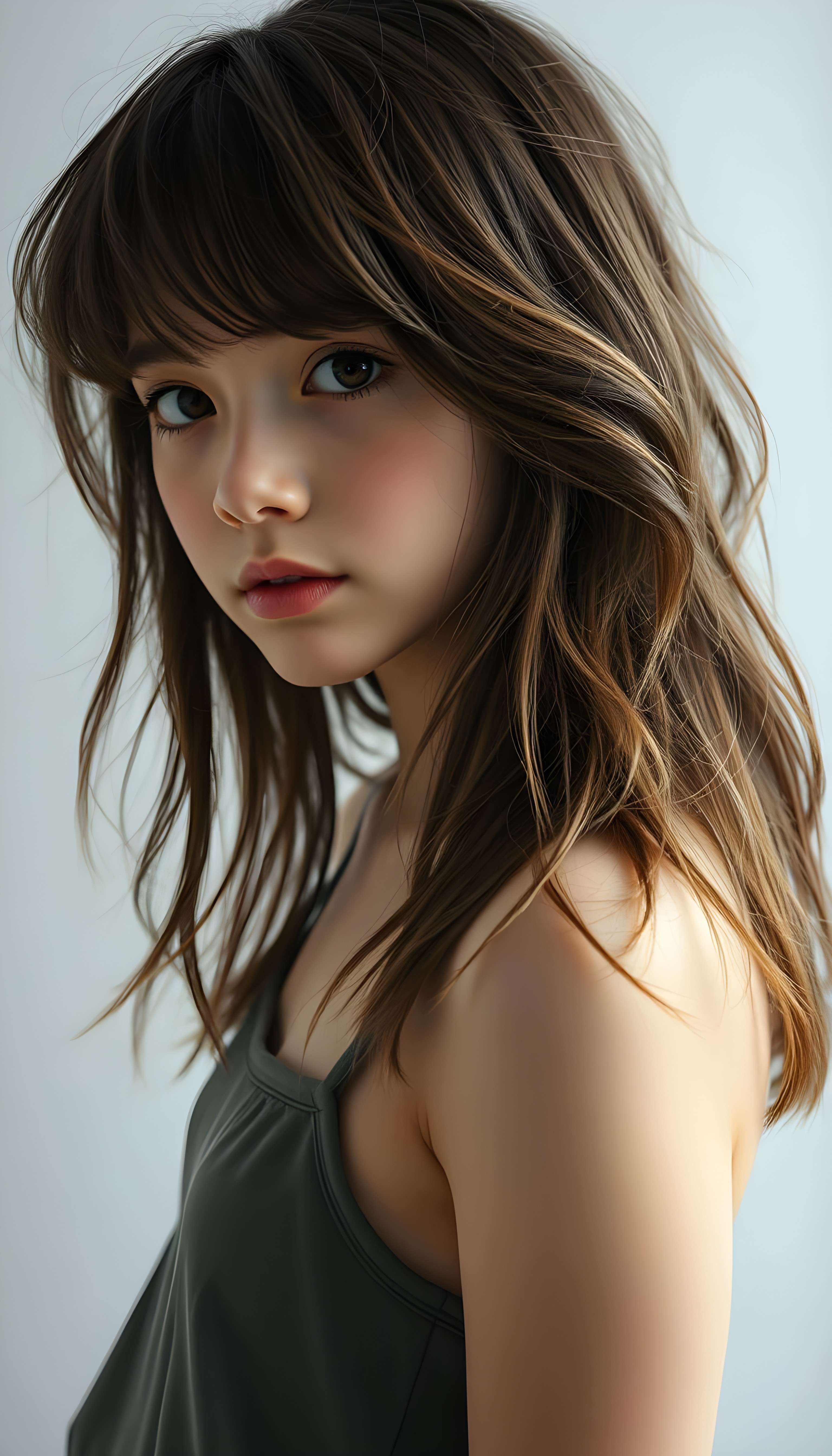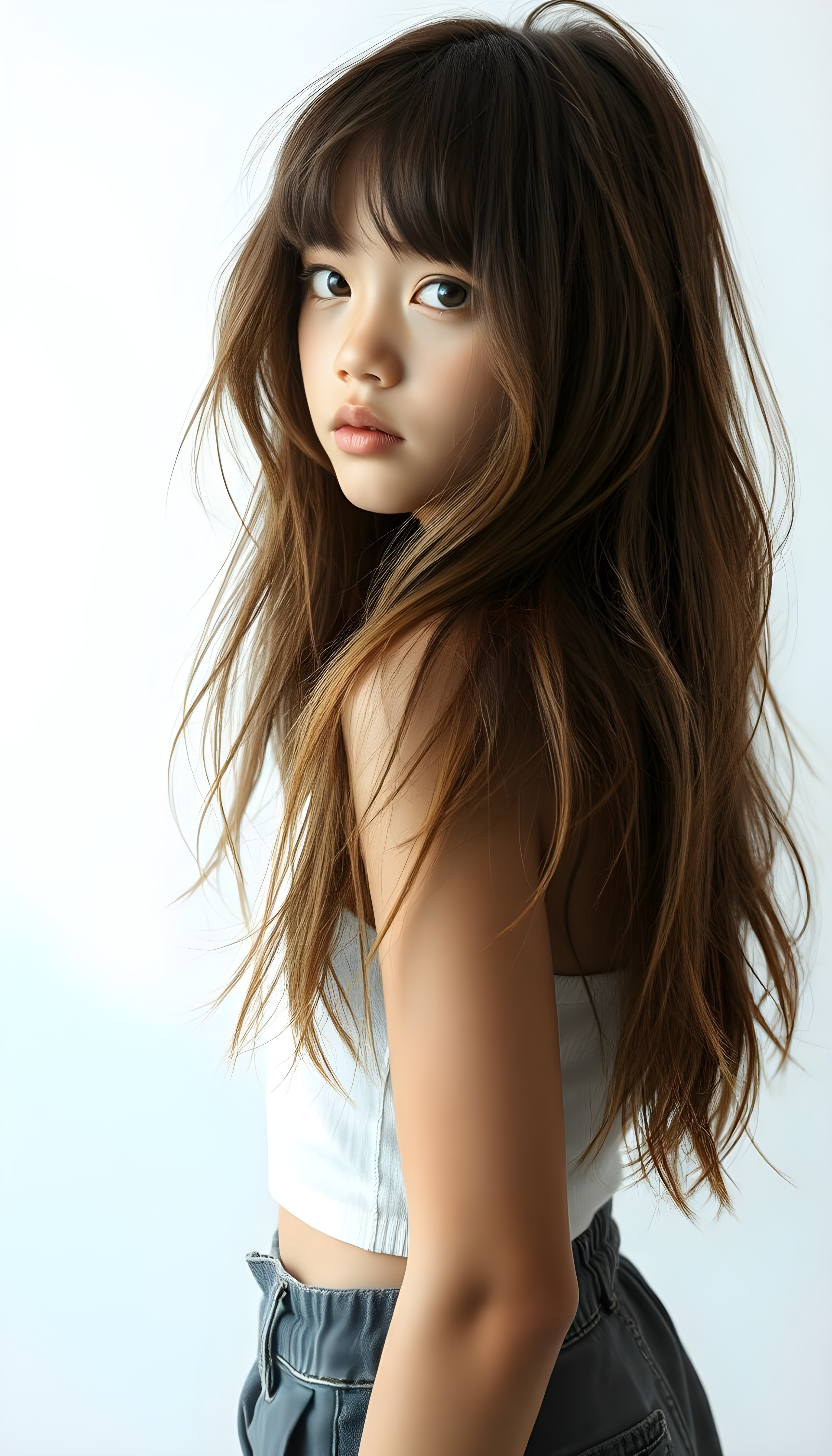 a (((beautifully full body portrait))) of a (((young teen girl with long, messy, straight shoulder-length hair))), capturing a (((stunningly realistic)) curl pattern), advanced facial features that exude cuteness, like ((baby-doll eyes)), a cropped bang haircut that frames her face, hair color that mimics (hazelnut) tones, a detailed yet angelic complexion, looking directly into the camera, a (((side profile portraits))), with impeccably drawn curves and contours that match her figure, against a (softly contrasting white backdrop), a short, sleeveless top and super short, cuffed pants that accentuate her (flawless anatomical proportions)