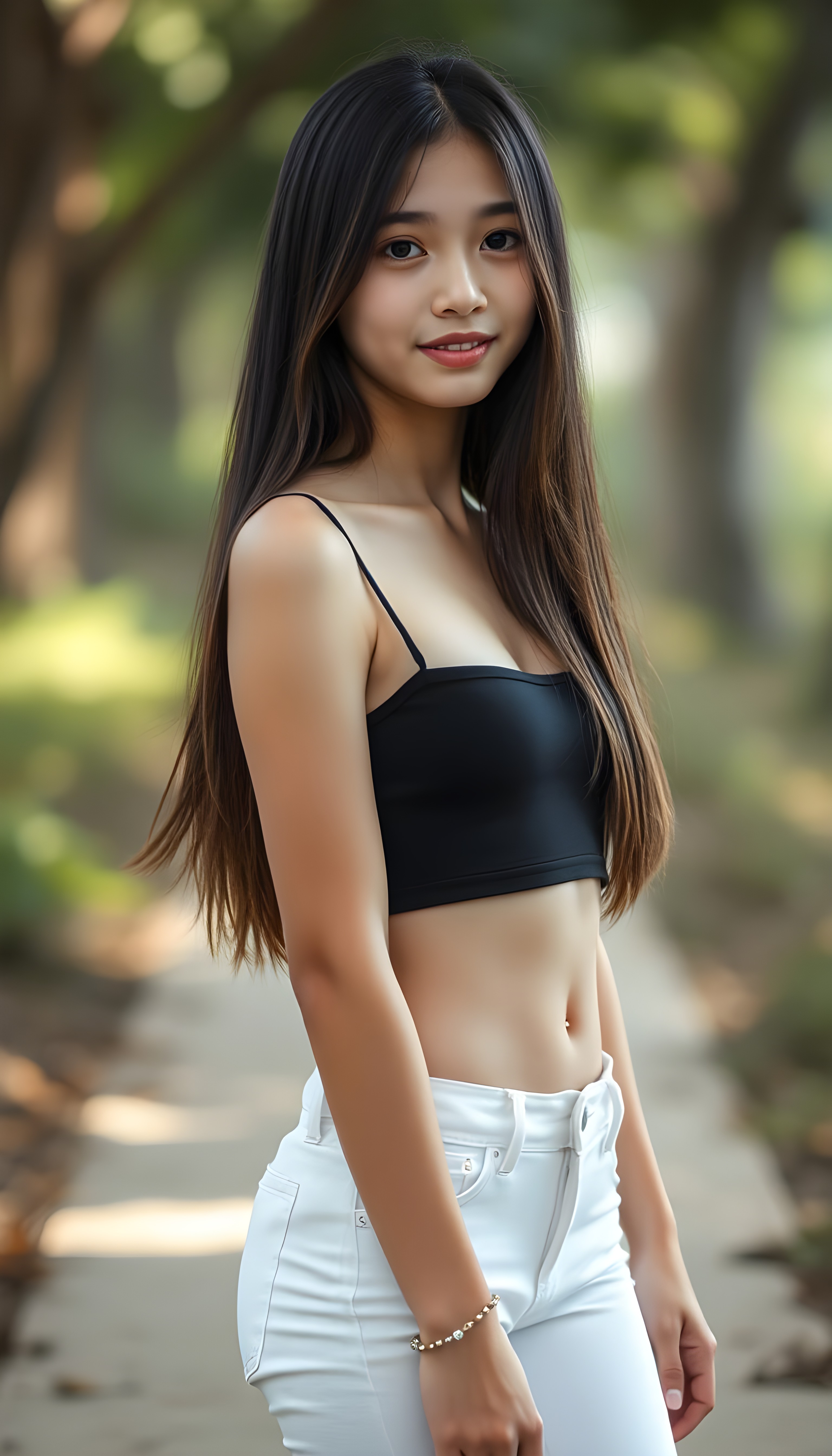a (((very young, slim teen girl))), with long, straight black hair and light brown highlights to her hip, and a delicate, ((thin and toned body)), adorned with sleek, (((white skinny jeans))), paired with a (((black sleeveless thin strap cropped spaghetti top))), that accentuates her slender figure. Her face is (((pale and flawless))), with (((bright white skin))), rosy cheeks and (((natural looking eyes))). She is exuding an air of youthful confidence and (natural beauty). (((Full body view))) of her looking happy and playful, set against a natural and (high-resolution) backdrop, showcasing her full figure and (((straight and toned legs))) that are distinctly visible, she stands in front of the viewer