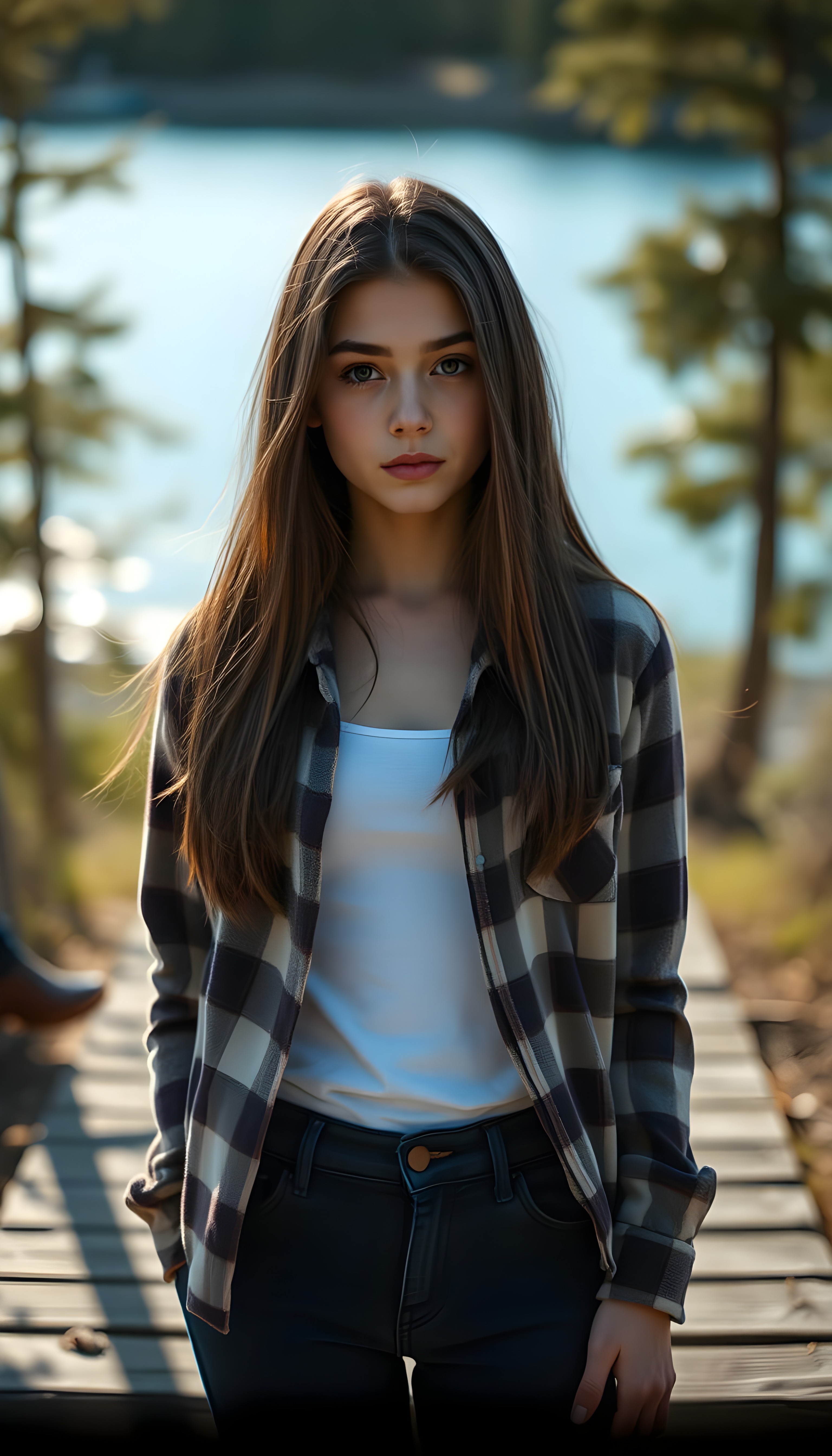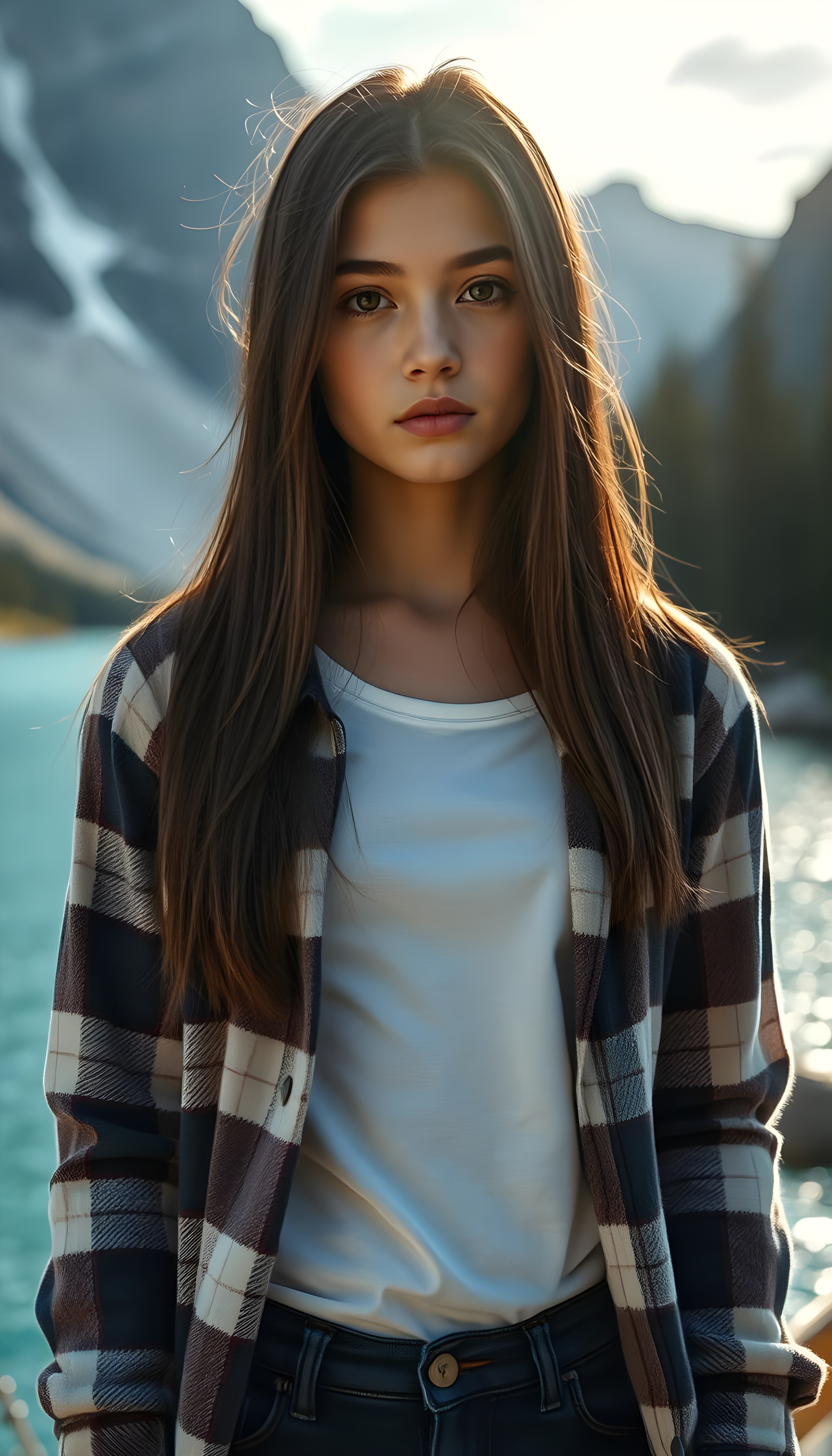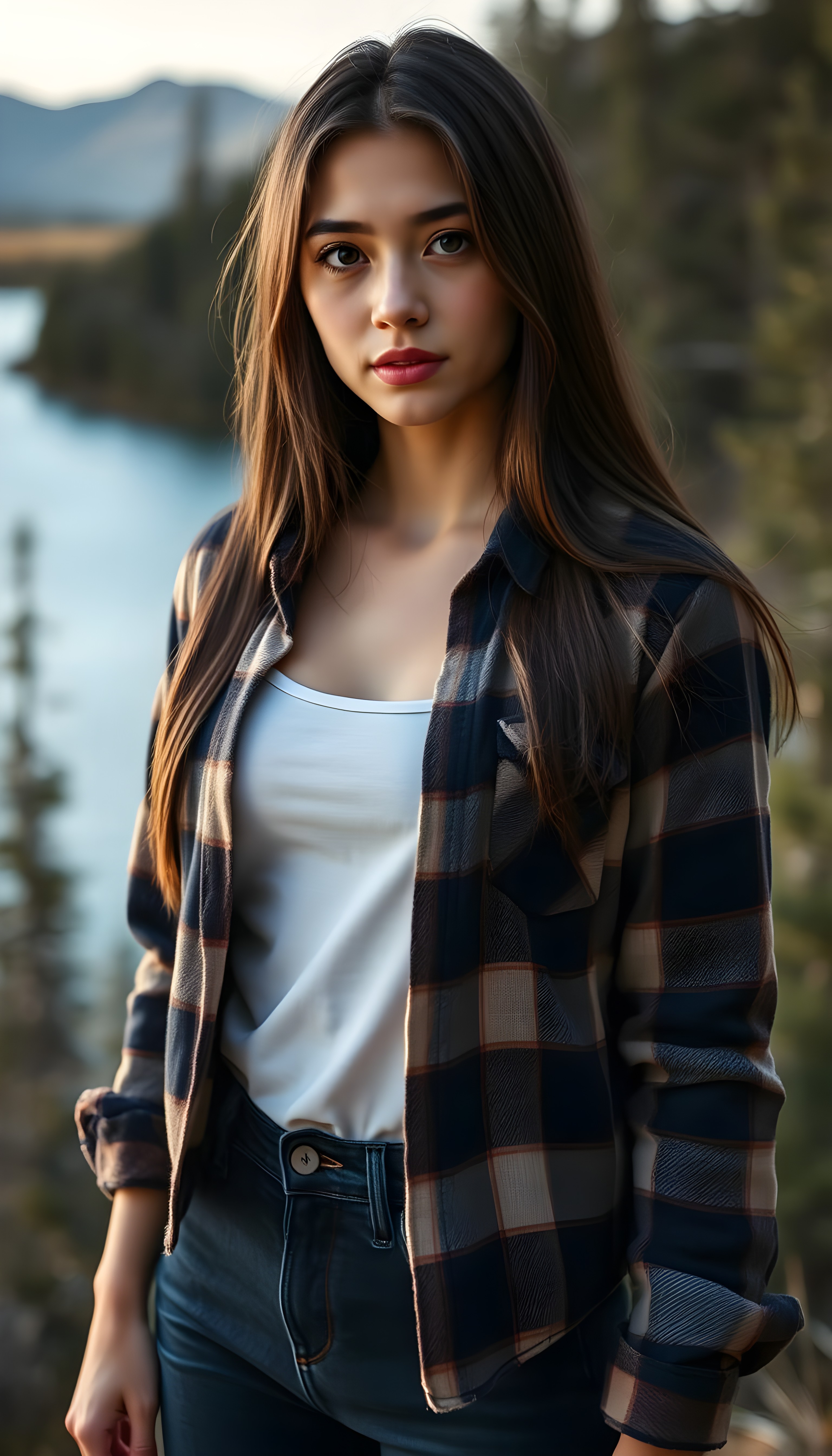 wide angle photo from a young stunning and gorgeous girl in a plaid open flannel shirt in brown, white and dark blue, underwear a white t-shirt made of fine wool. The T-shirt and flannel shirt extends beyond the waistband of the pants. She has long, straight dark hair and blond straps, dark eyes. Her silky hair falls over her shoulders and across her upper body. She wears dark blue jeans. The picture is very detailed. Full lips and an angelic face. A blue lake can be seen in the background and typical Canadian landscape. She is standing in the front of the viewer. The sun kiss her flawless skin.
