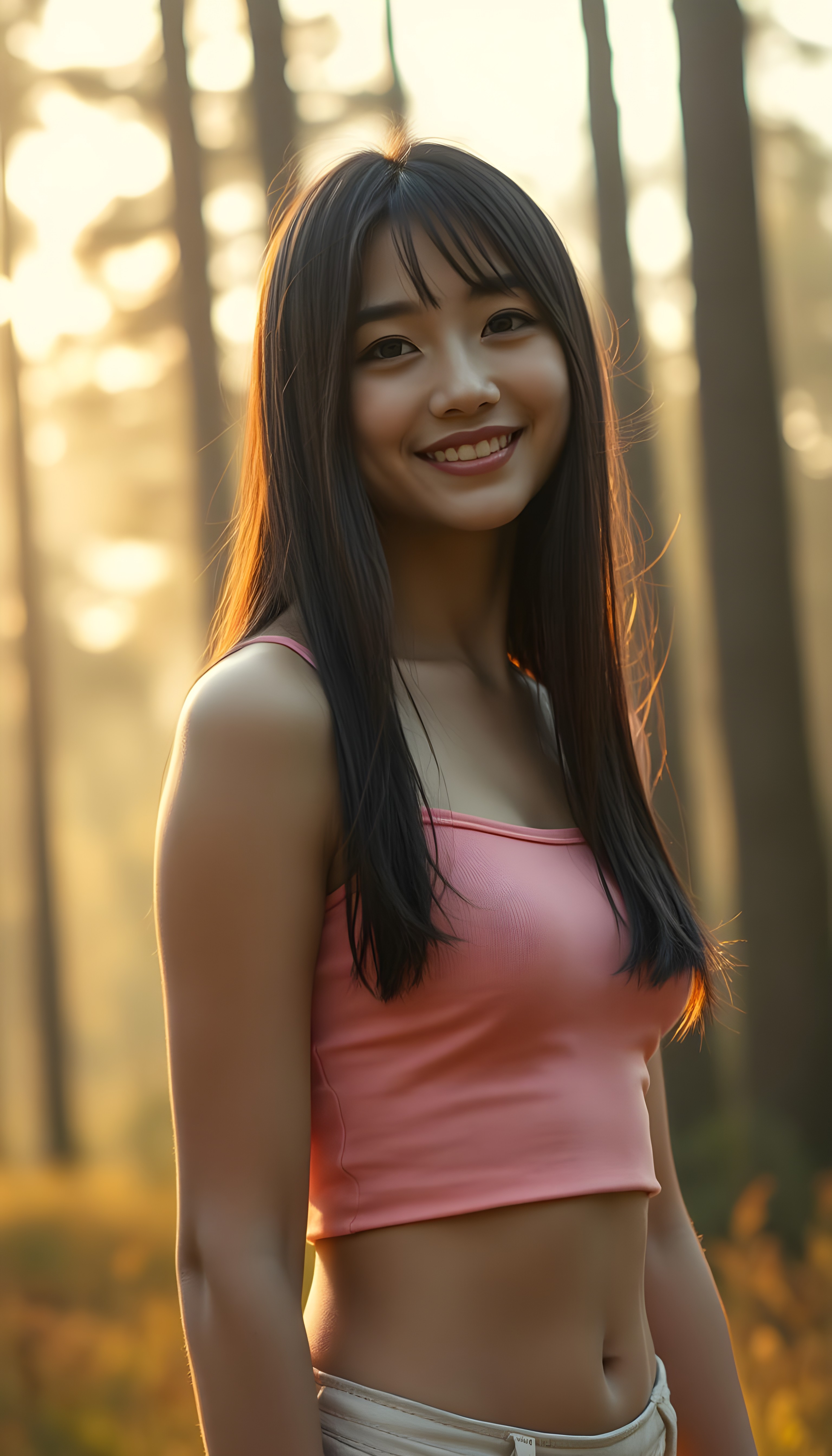 A detailed and realistic portrait of a stunning, gorgeous girl, her eyes sparkling with joy. Straight jet soft dark long hair reach her shoulder, and she wears a short, pink tank top that contrasts beautifully with the golden, sun-kissed setting. She wears a round mini skirt, flawless legs. The background is a lush forest with tall trees and a soft, misty sky with a soft glow.