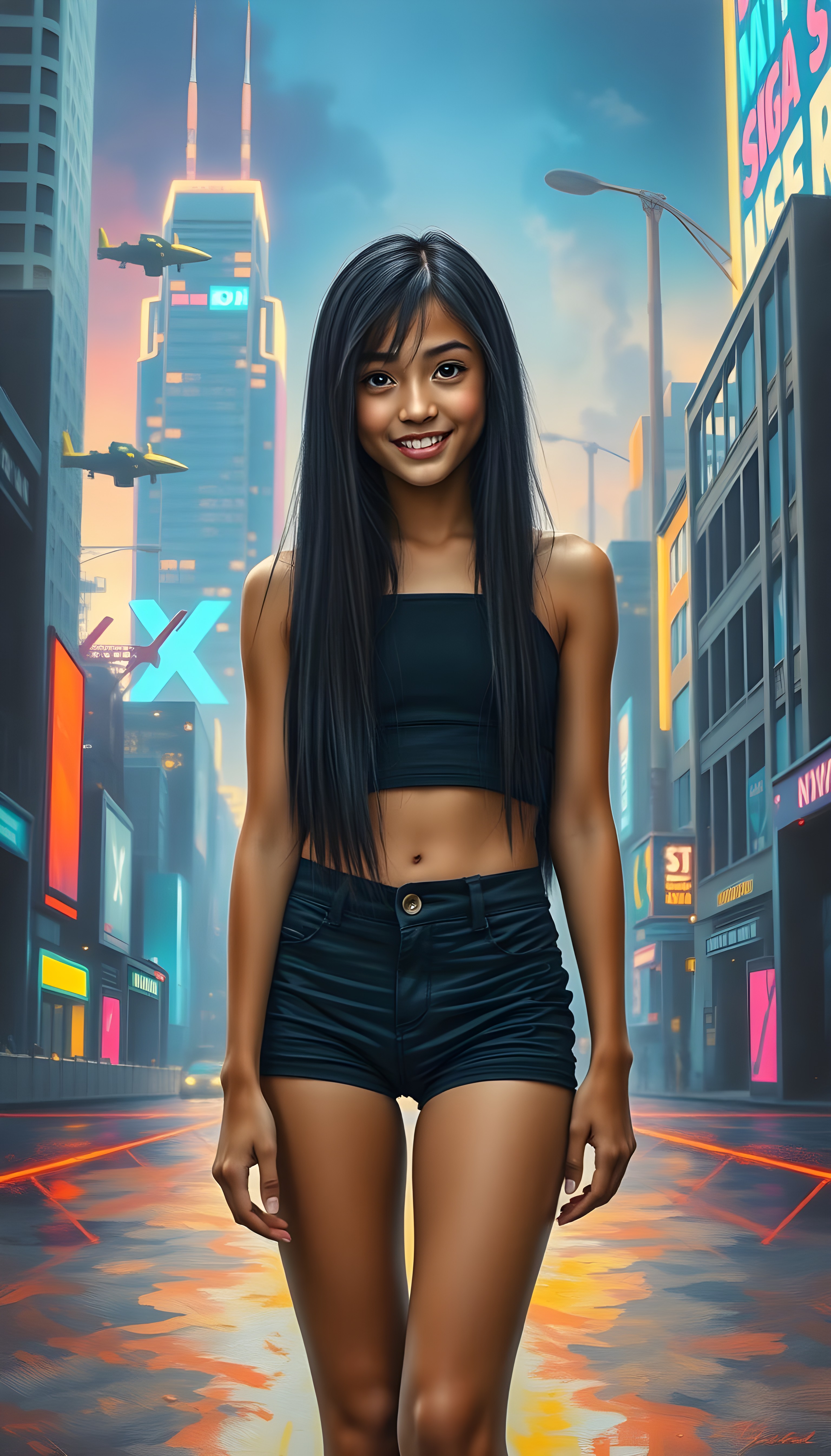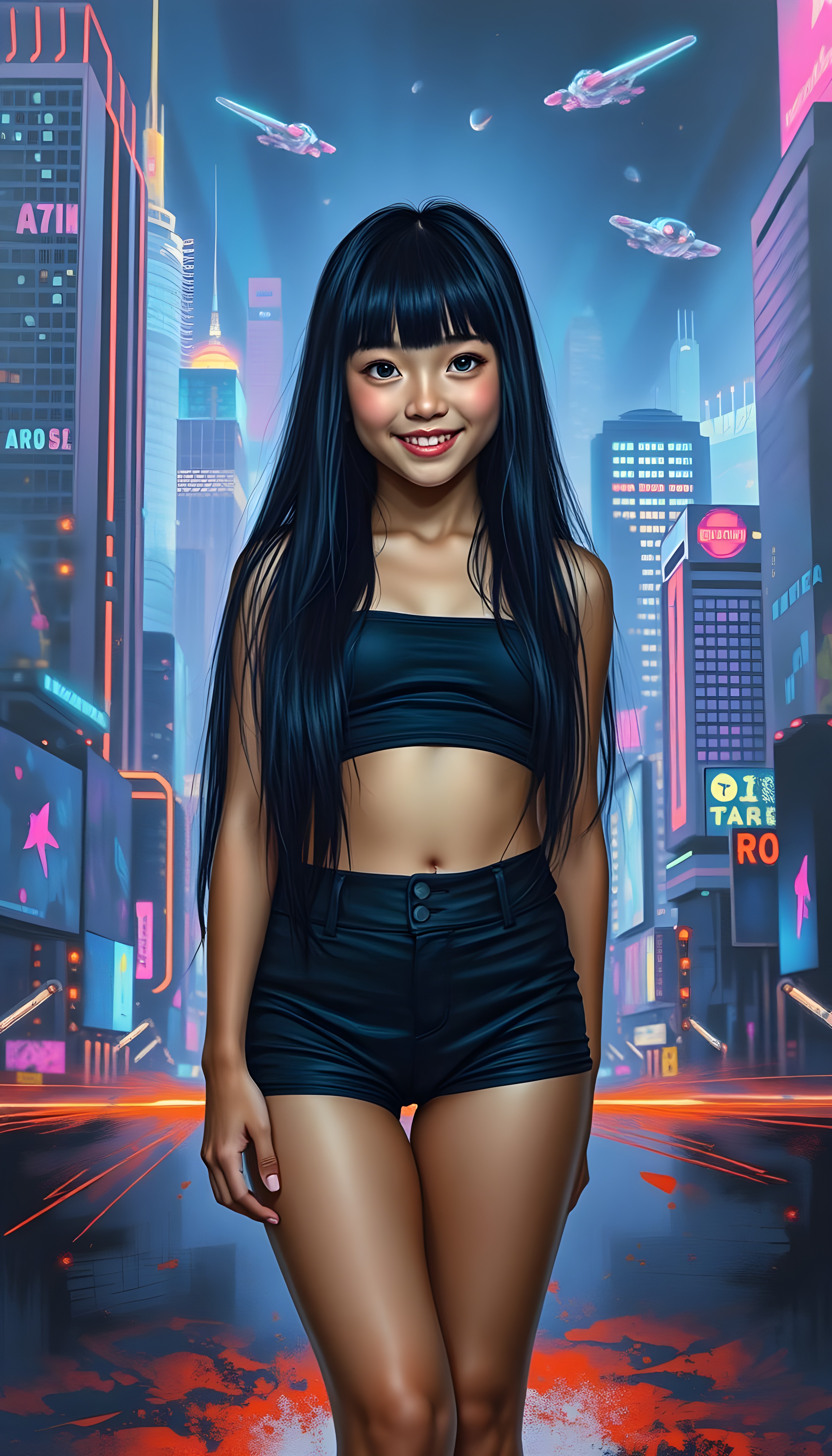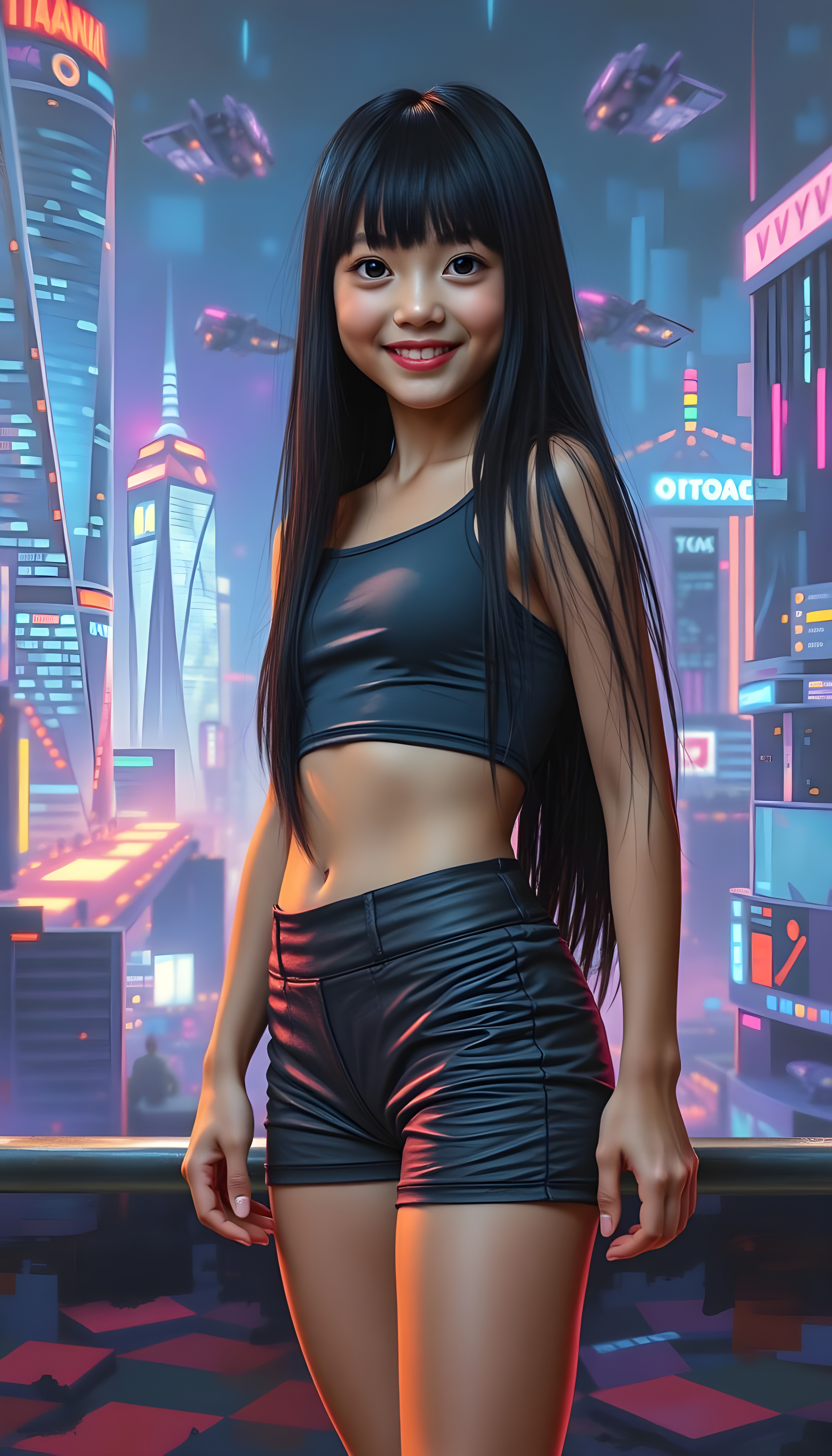 A young girl with long, straight black hair cascading down her back, standing confidently in a futuristic, neon-lit cityscape. She wears a sleek, form-fitting crop top and high-waisted shorts, her posture exuding elegance and playfulness. Her eyes sparkle with determination as she looks directly at the viewer, her smile radiant. The background features a vibrant, holographic skyline with towering skyscrapers and flying vehicles, illuminated by an array of colorful lights. The scene is dynamic, with a subtle glow emanating from the ground, adding a sense of motion and energy to the image. Front view.