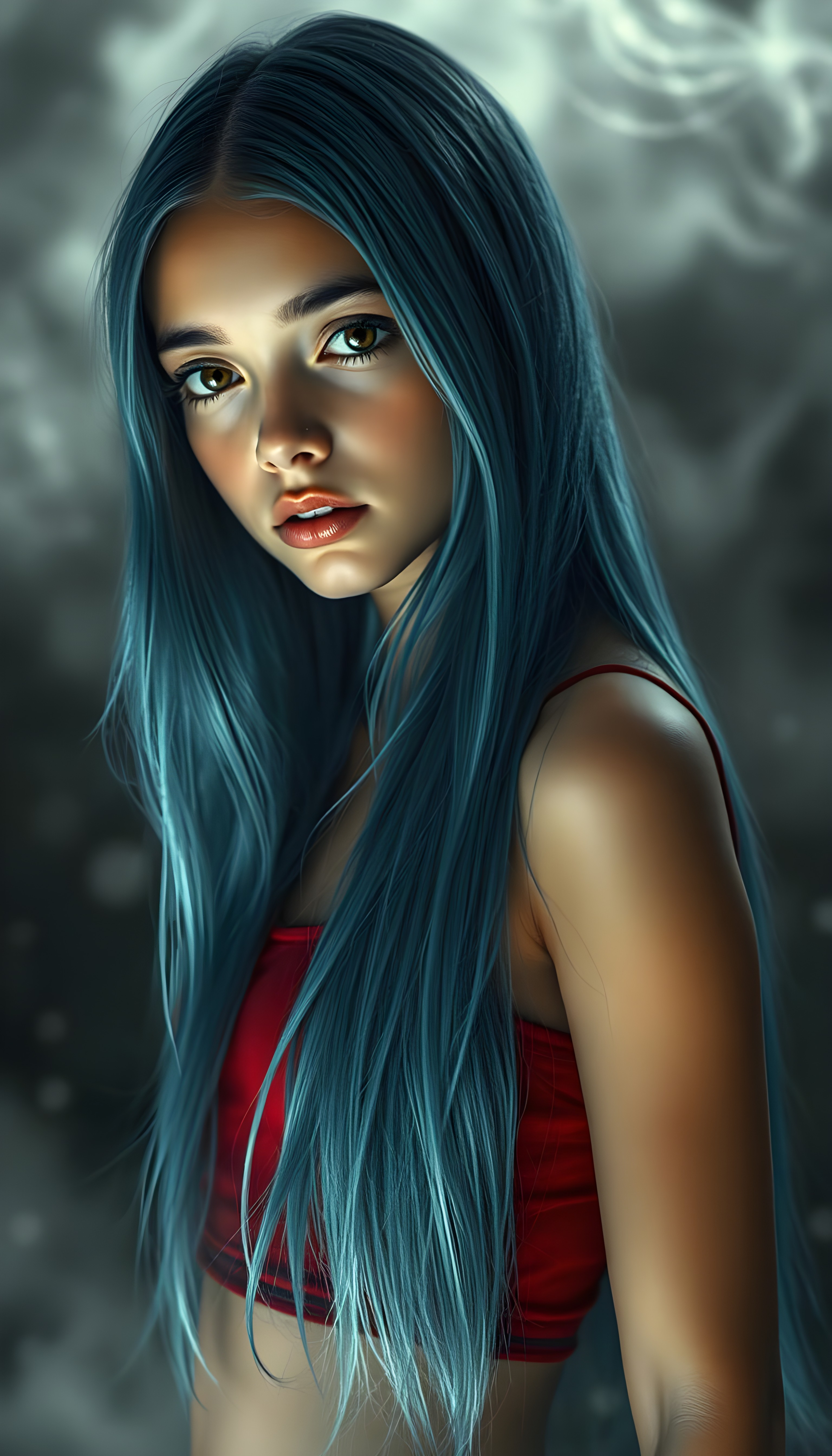 Realistic Photo: in a fantastical realm, a young girl with luxuriously long, straight blue hair, like cascading silk, stands amidst swirling gray clouds and ethereal shadows. Her amber eyes, deep and expressive, shimmer with unspoken tales. Glistening skin reflect the soft, dreamlike light, as she wears a vibrant crimson short tank top that contrasts against the monochrome backdrop, creating a mystical, otherworldly ambiance. The scene is bathed in a soft, ethereal glow, highlighting the girl’s delicate features and the intricate details of her surroundings, evoking a sense of melancholy and wonder.