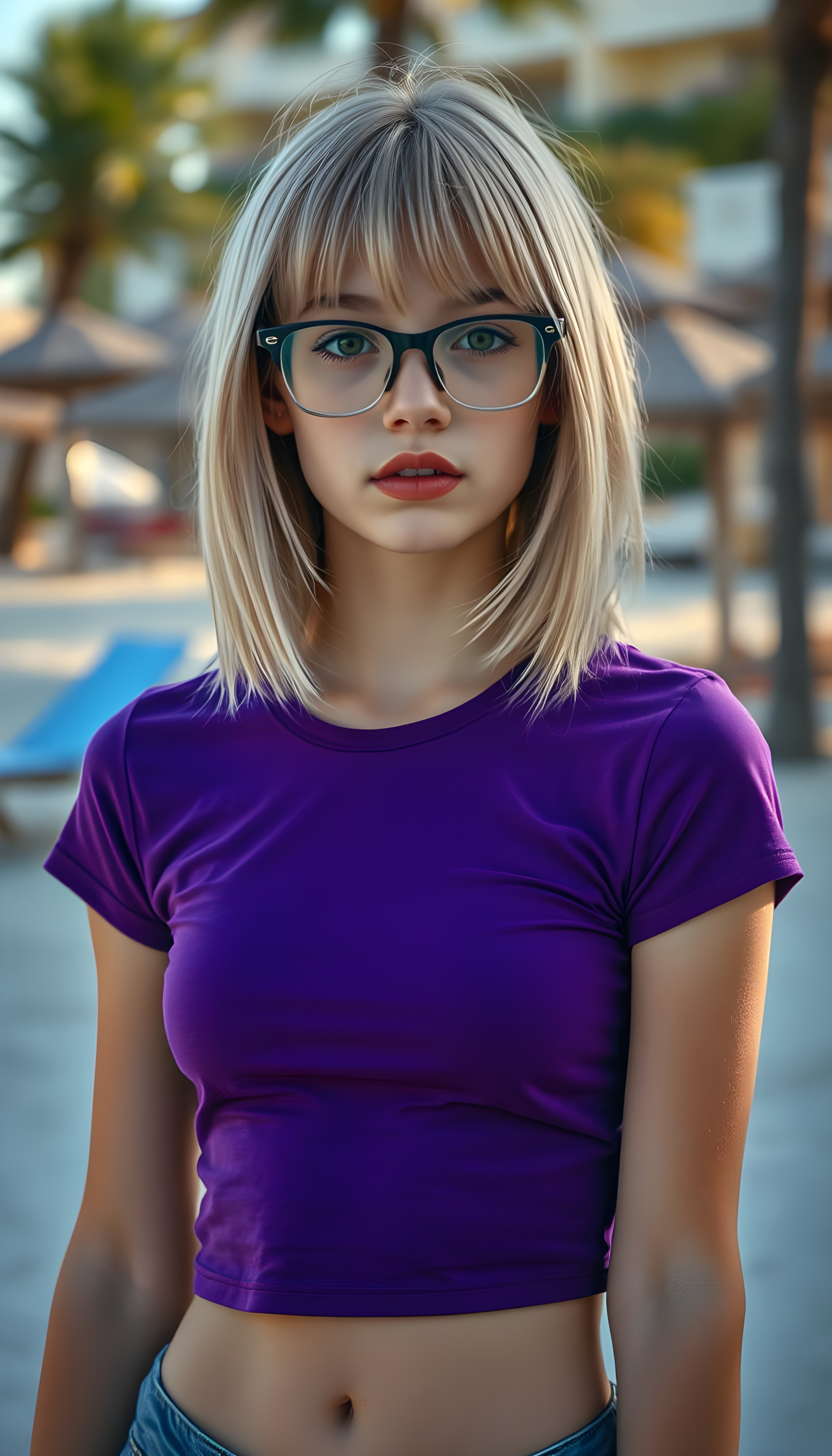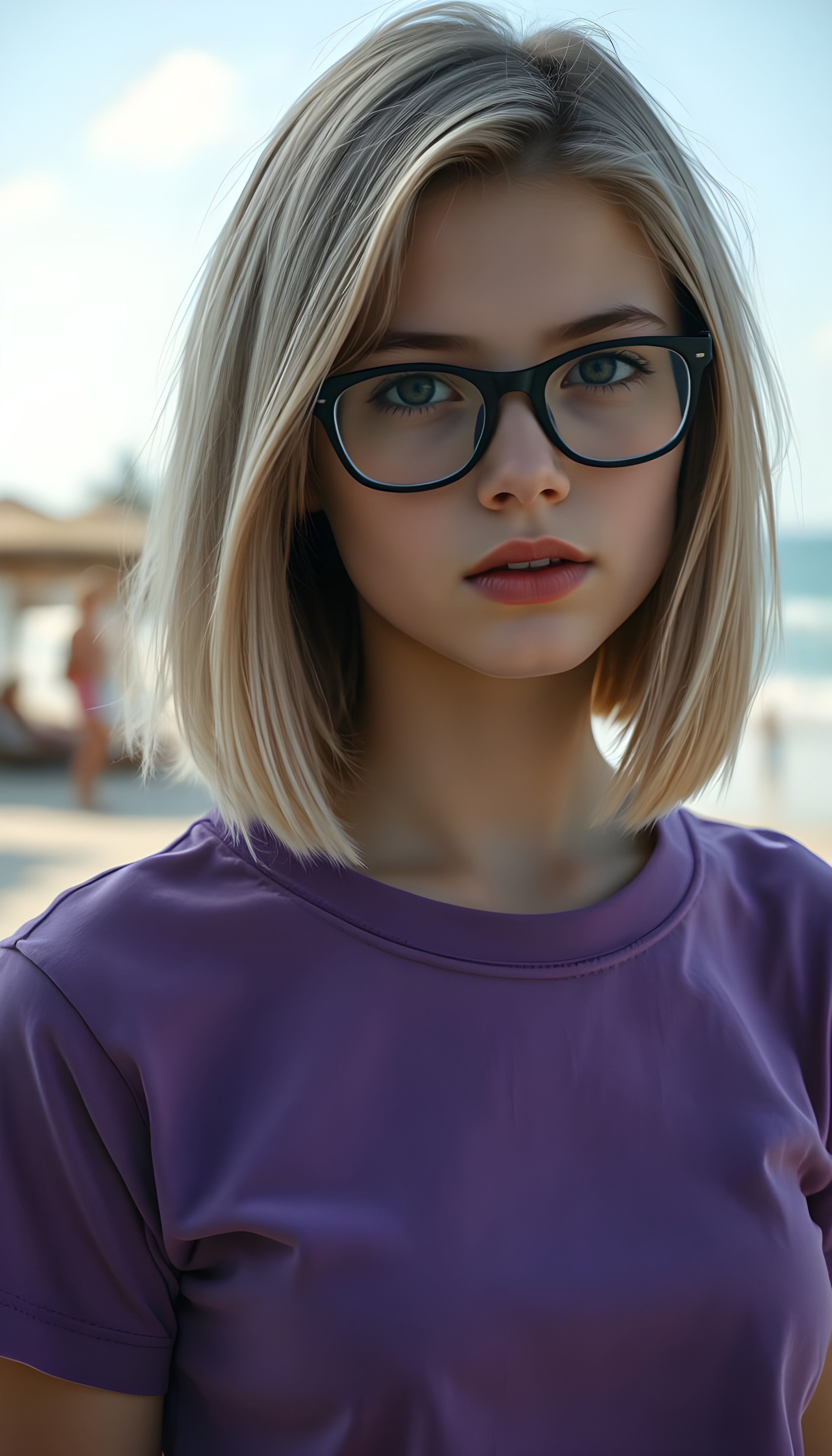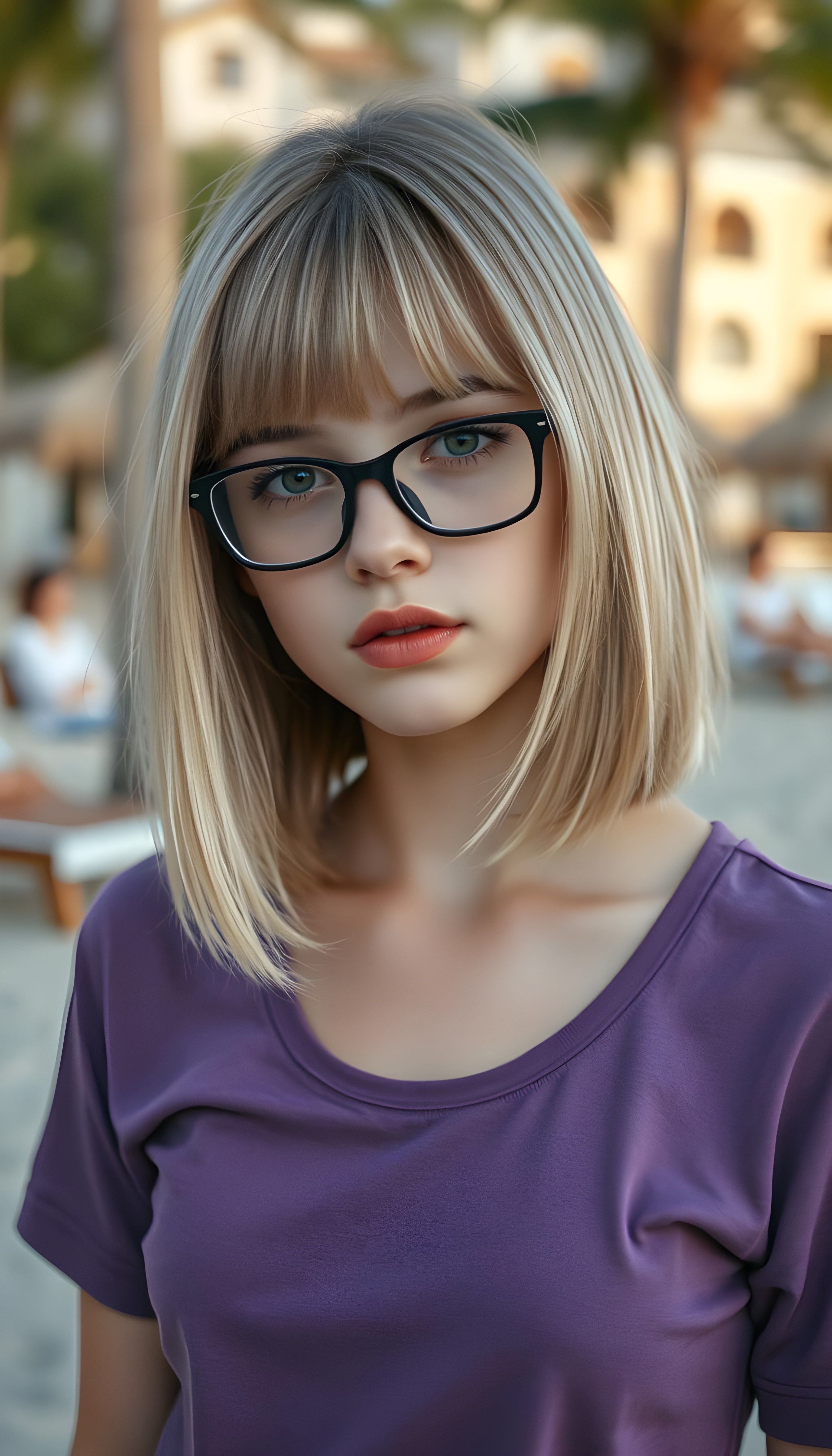 a (((cute young teenage girl))), with shoulder length bob cut, straight, ((blond hair)), and a (((purple very thin and tight t-shirt))), ((red, full lips)), ((brown eyes)), all set against a backdrop of a (beach resort), black glasses, sun kissed