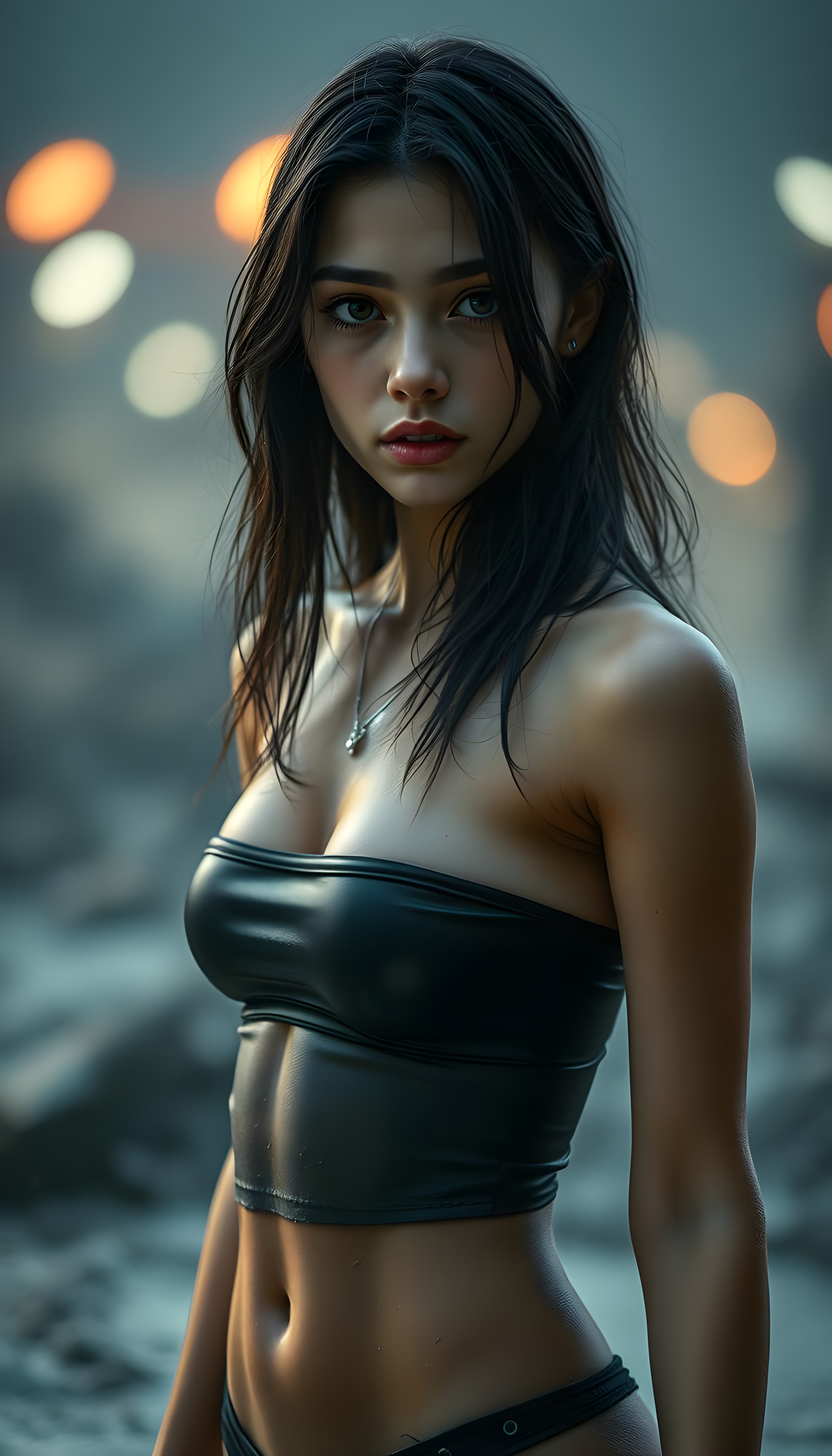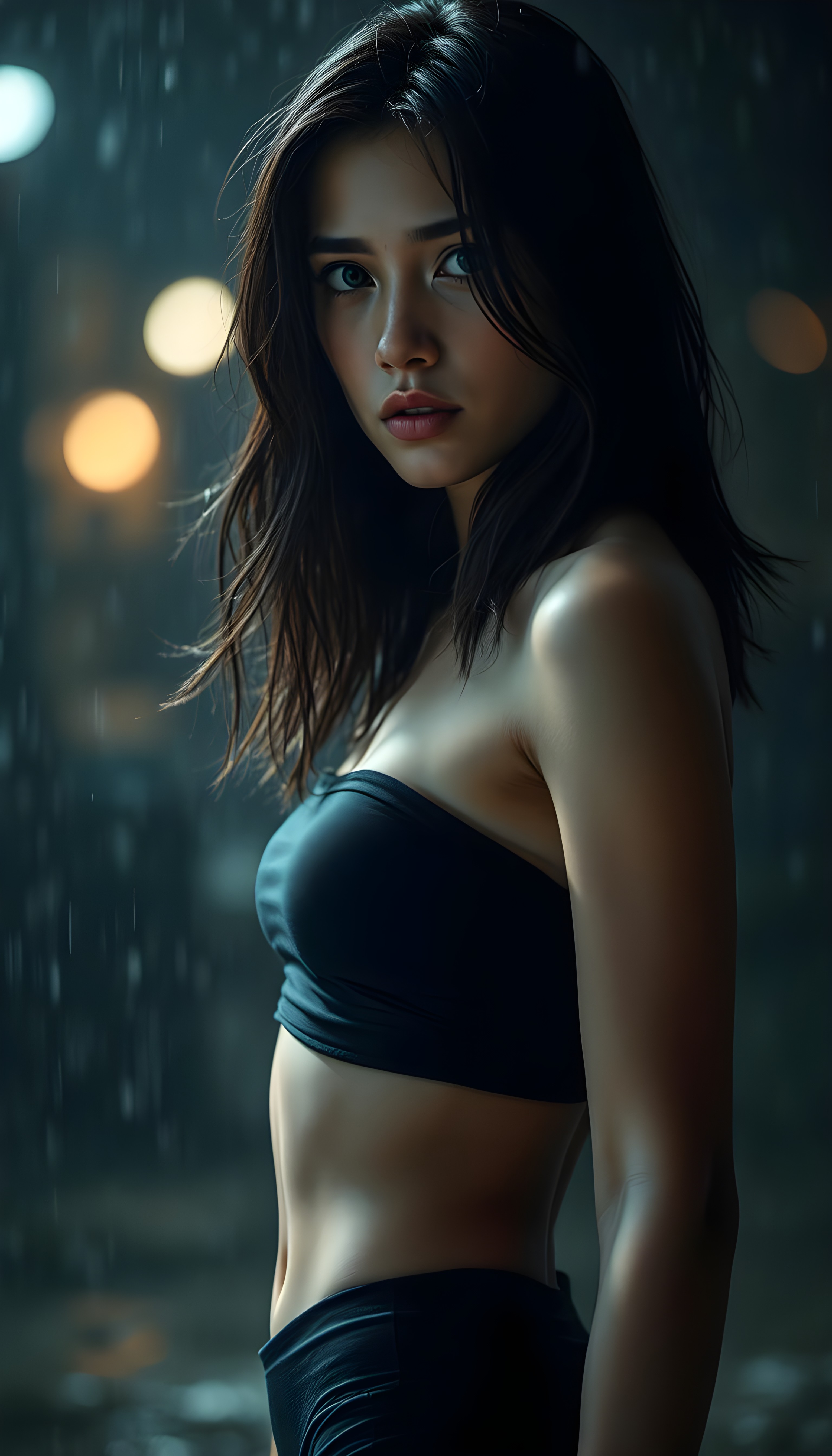 hyper realistic upper body photography of beautiful Exotic teen girl, with detailed shoulder-length full wet soft hair, realistic and detailed eyes, standing in a storm, looking sadly into the camera, wear wet tight black spanned tube top, perfect curved body, dynamic cinematic lights, full body shot, exotic perfect detailed round face, ultra hyper detailed, wet skin