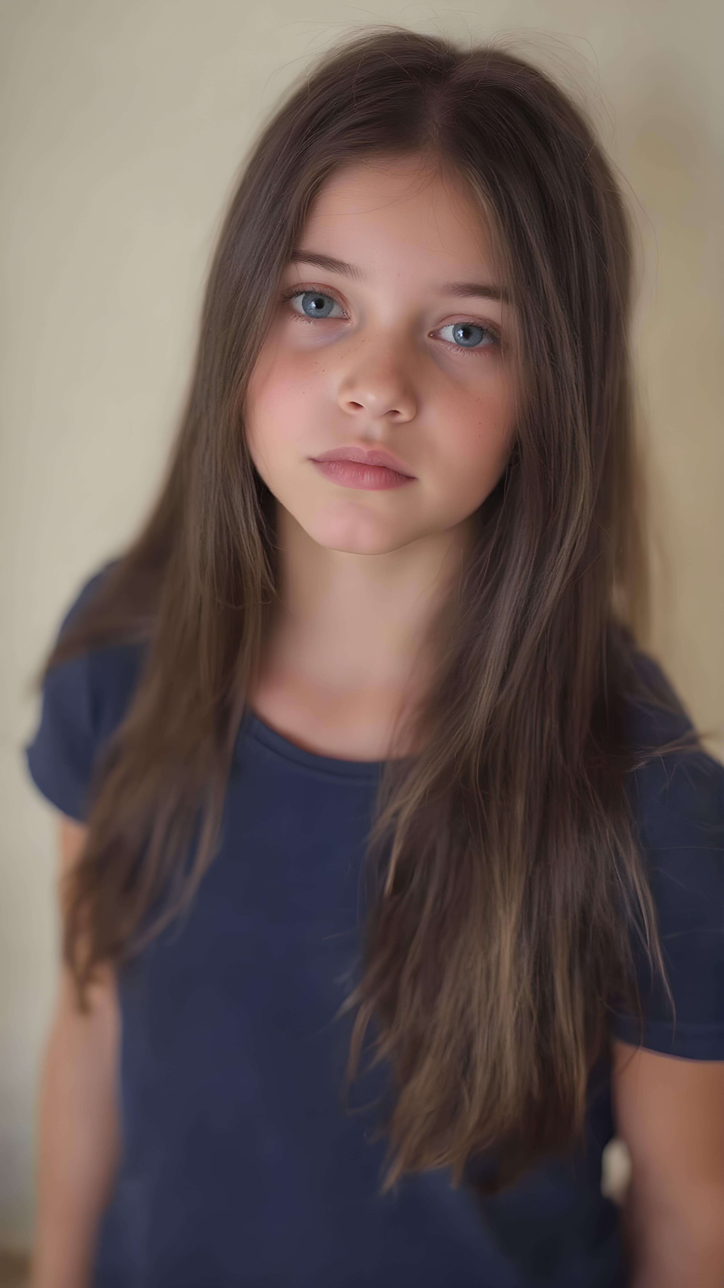 a beautiful young teen girl, with (long, straight, thick, jet natural black soft hair) (with visible natural freckles on her face) (full body view, with a slightly turned head, looking up into the camera) She wears an indigo (thigh-length) t-shirt, (that perfectly complements her youthful figure), the lighting is soft and warm, highlighting her natural beauty and the intricate details of her dress. There is a hint of mischief on her face, reflecting the playful essence of a teenager. The overall mood of the image is one of natural beauty and youthful confidence