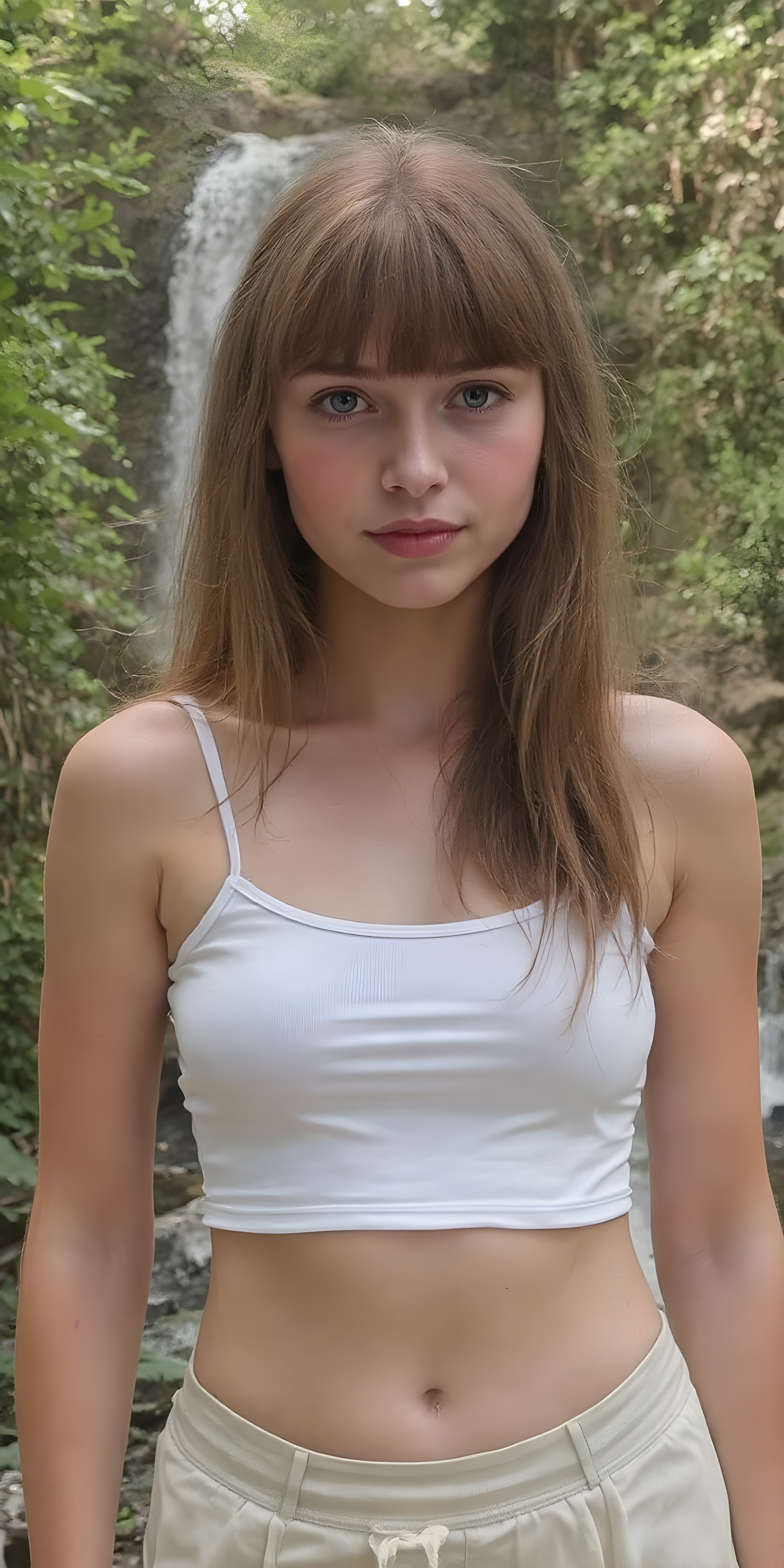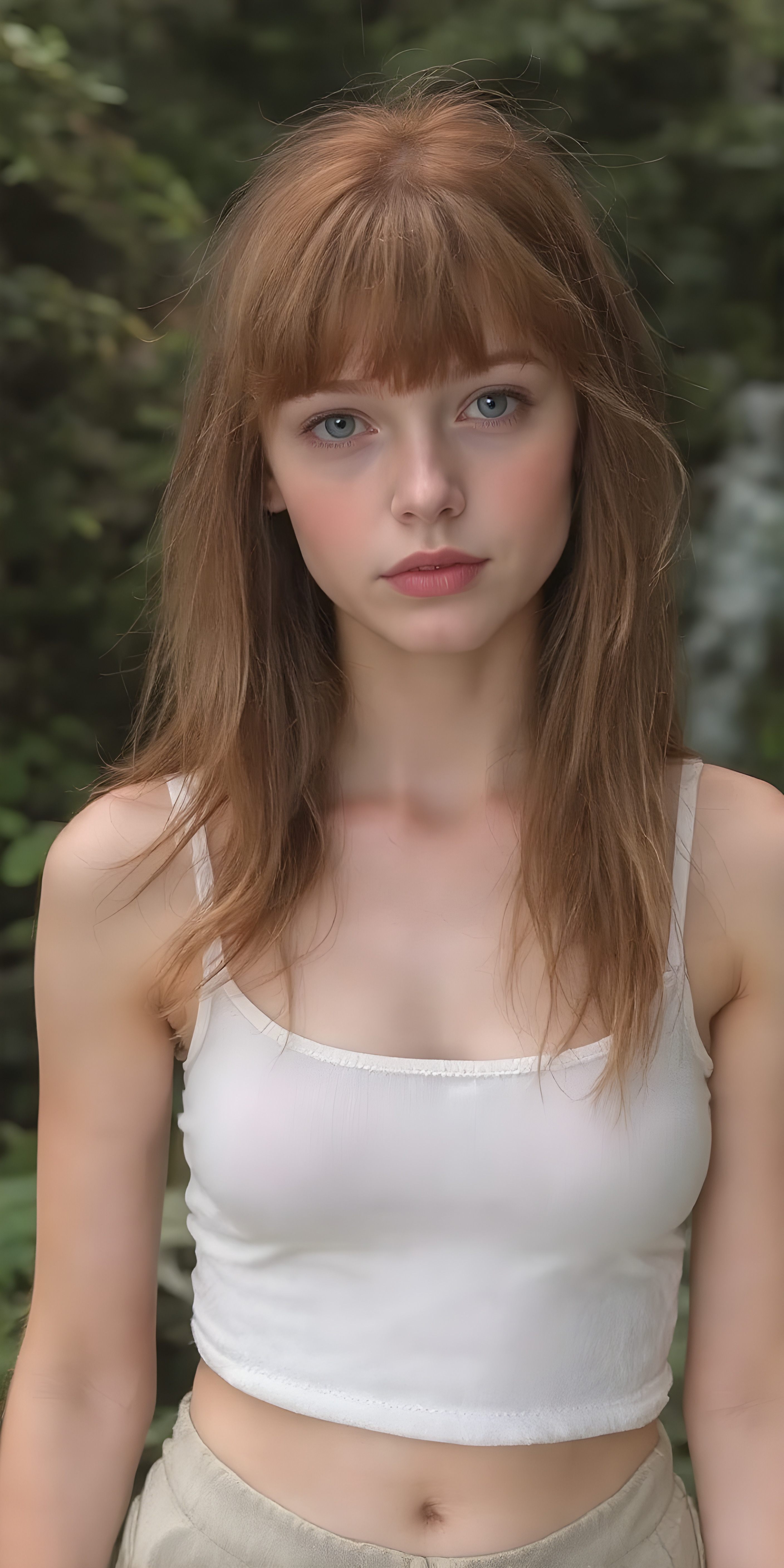 ((detailed and realistic photo)) from a cute young busty teen girl with long jet soft red hair, bangs cut frame her perfect round face, accentuating her ((belly button)) with a (white cropped sport spaghetti tank top) made of fine wool, ((short, leggins pants, cut to frame her shape)), all against a natural green backdrop in the jungle, waterfall