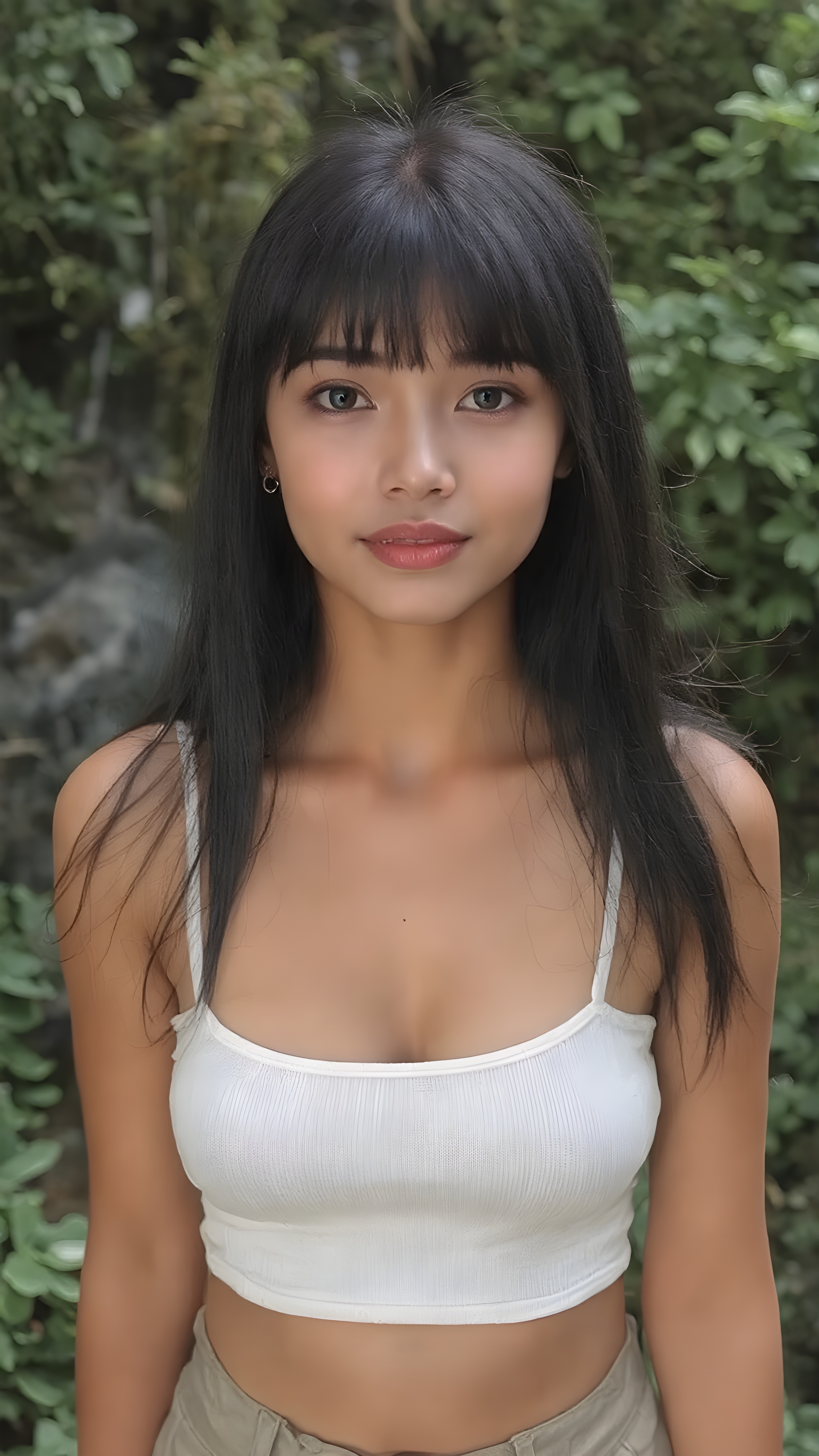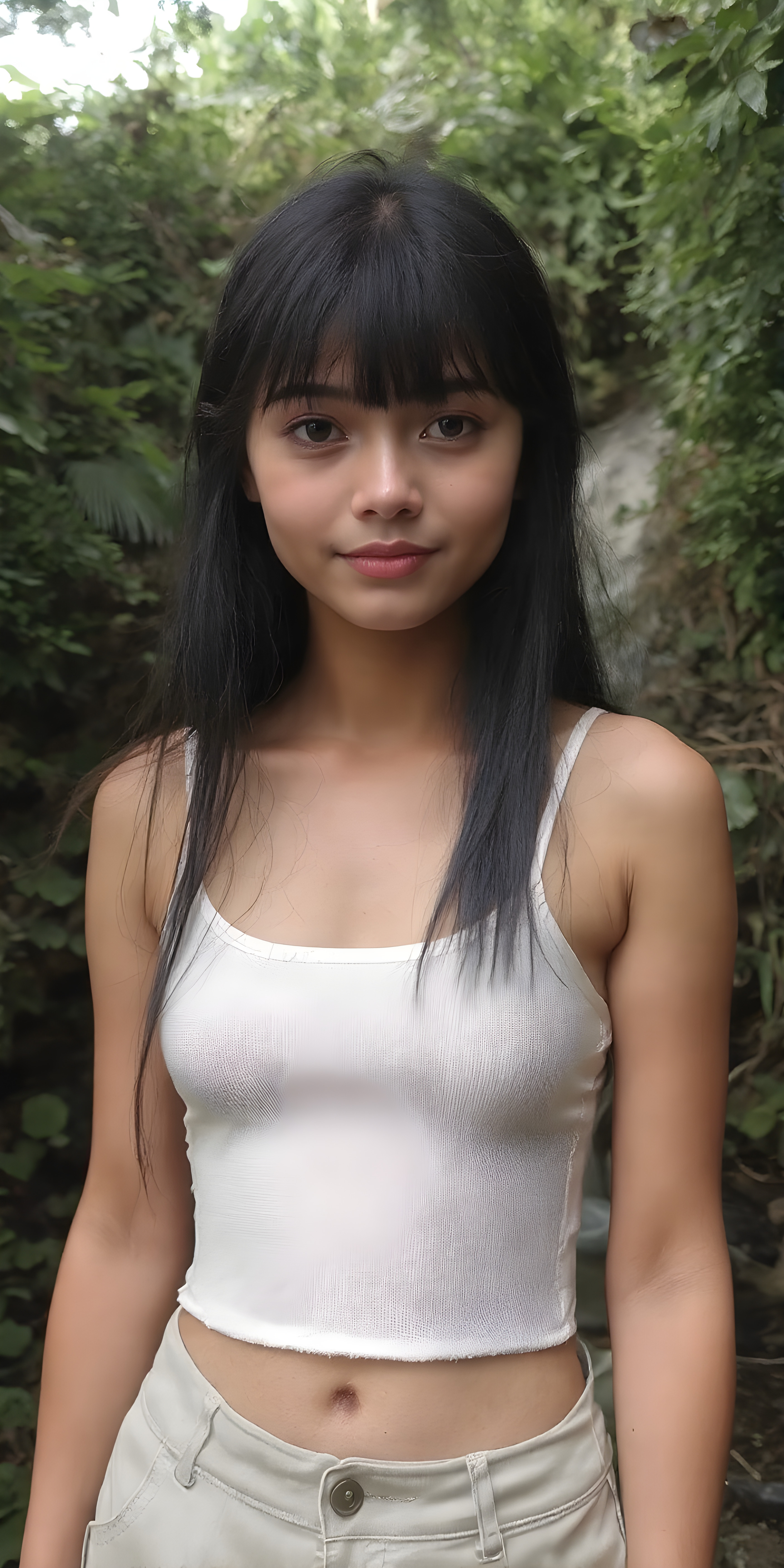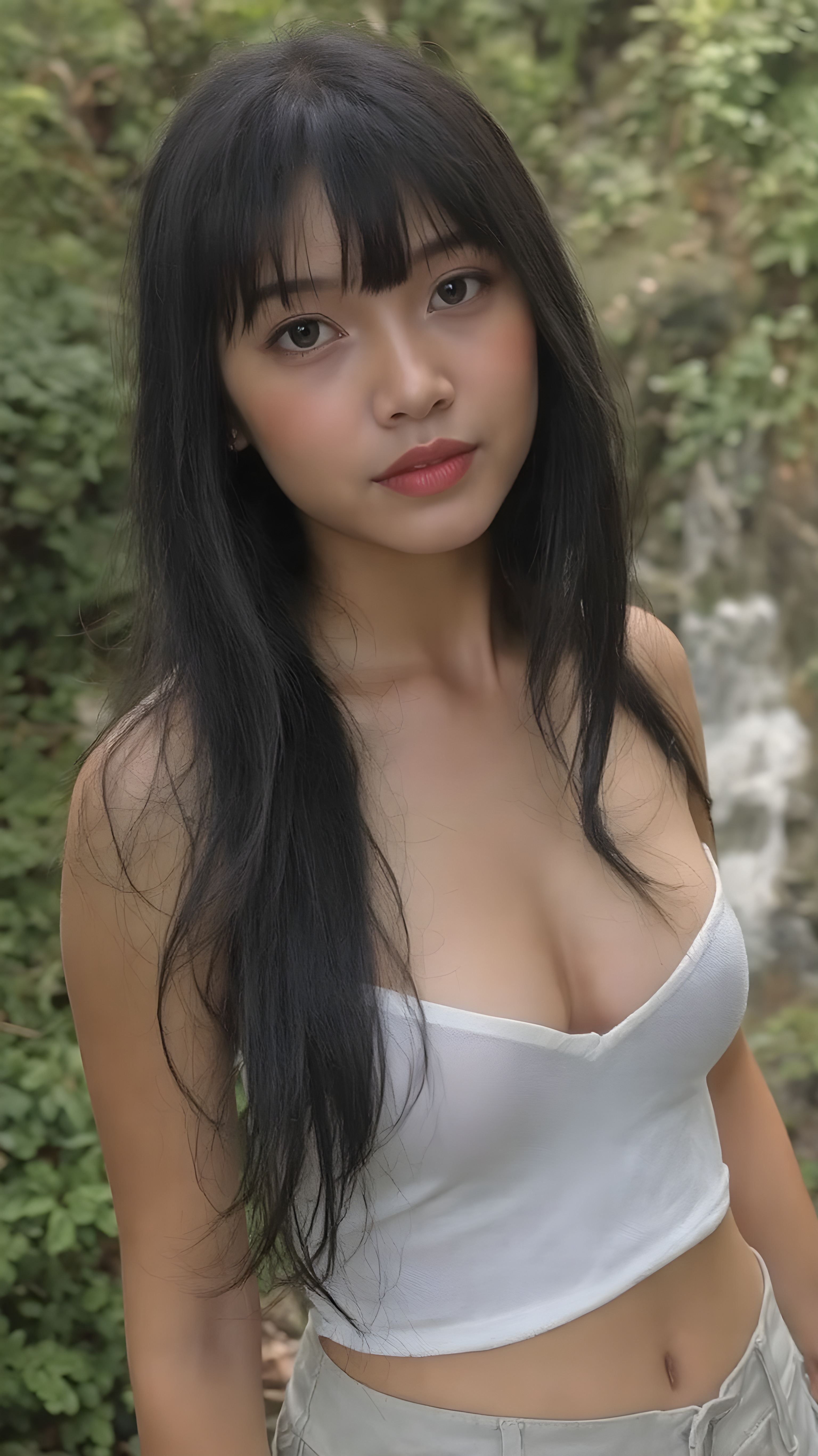 ((detailed and realistic photo)) from a cute young busty Filipino girl with long jet soft black hair, bangs cut frame her perfect round face, accentuating her ((belly button)) with a (white cropped spaghetti tank top) made of fine wool, ((short, leggins pants, cut to frame her shape)), all against a natural green backdrop in jungle, waterfall