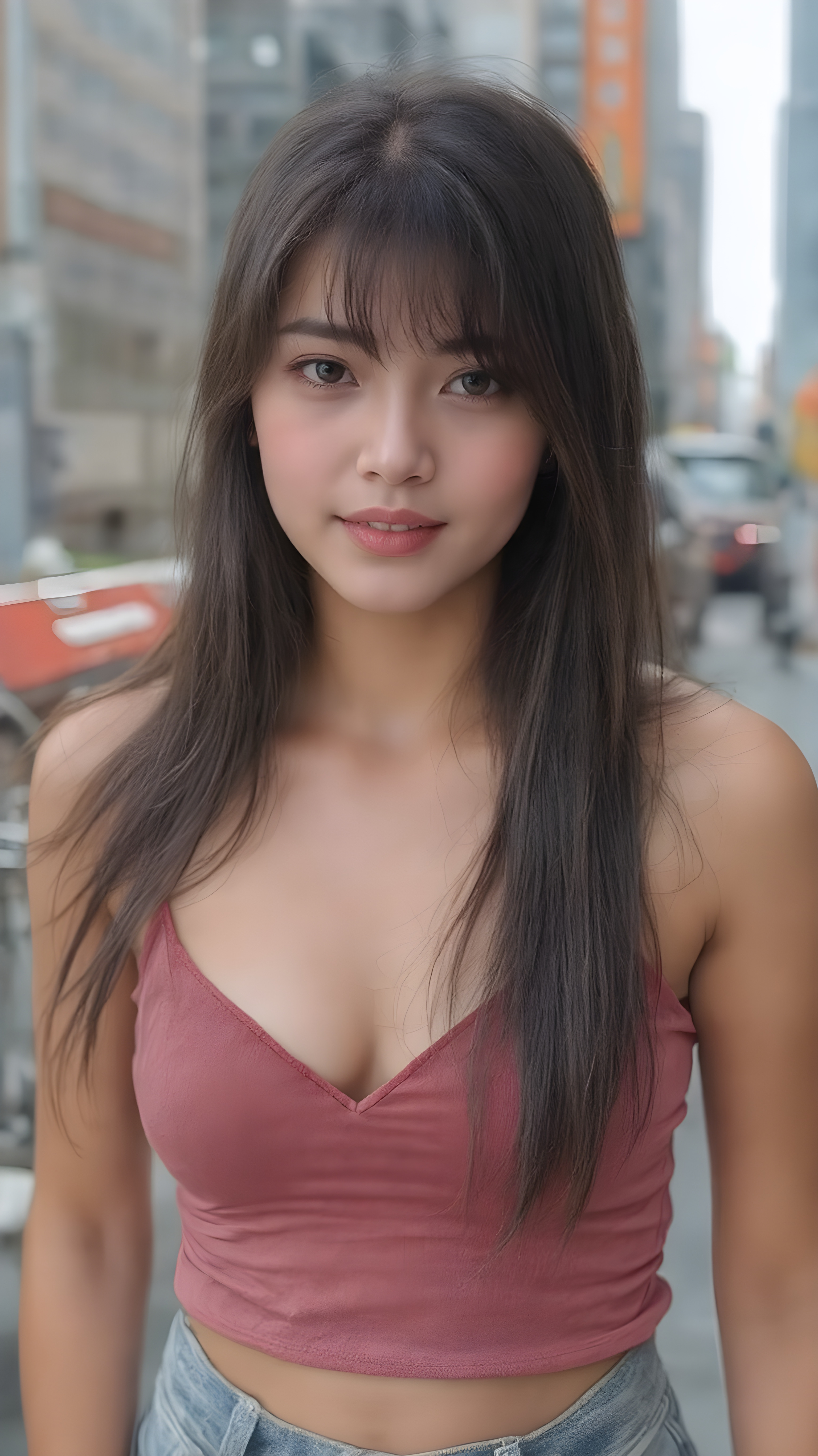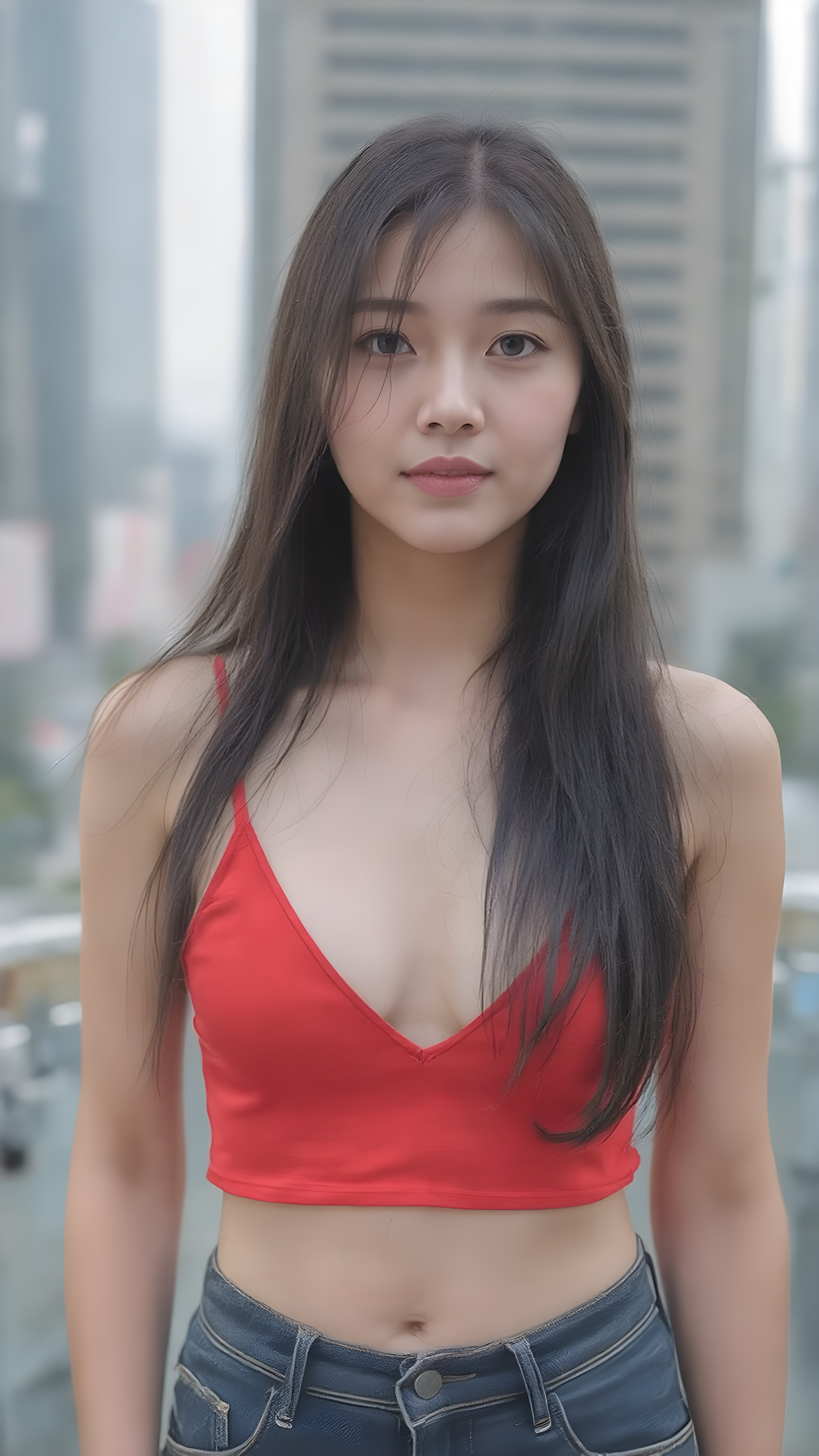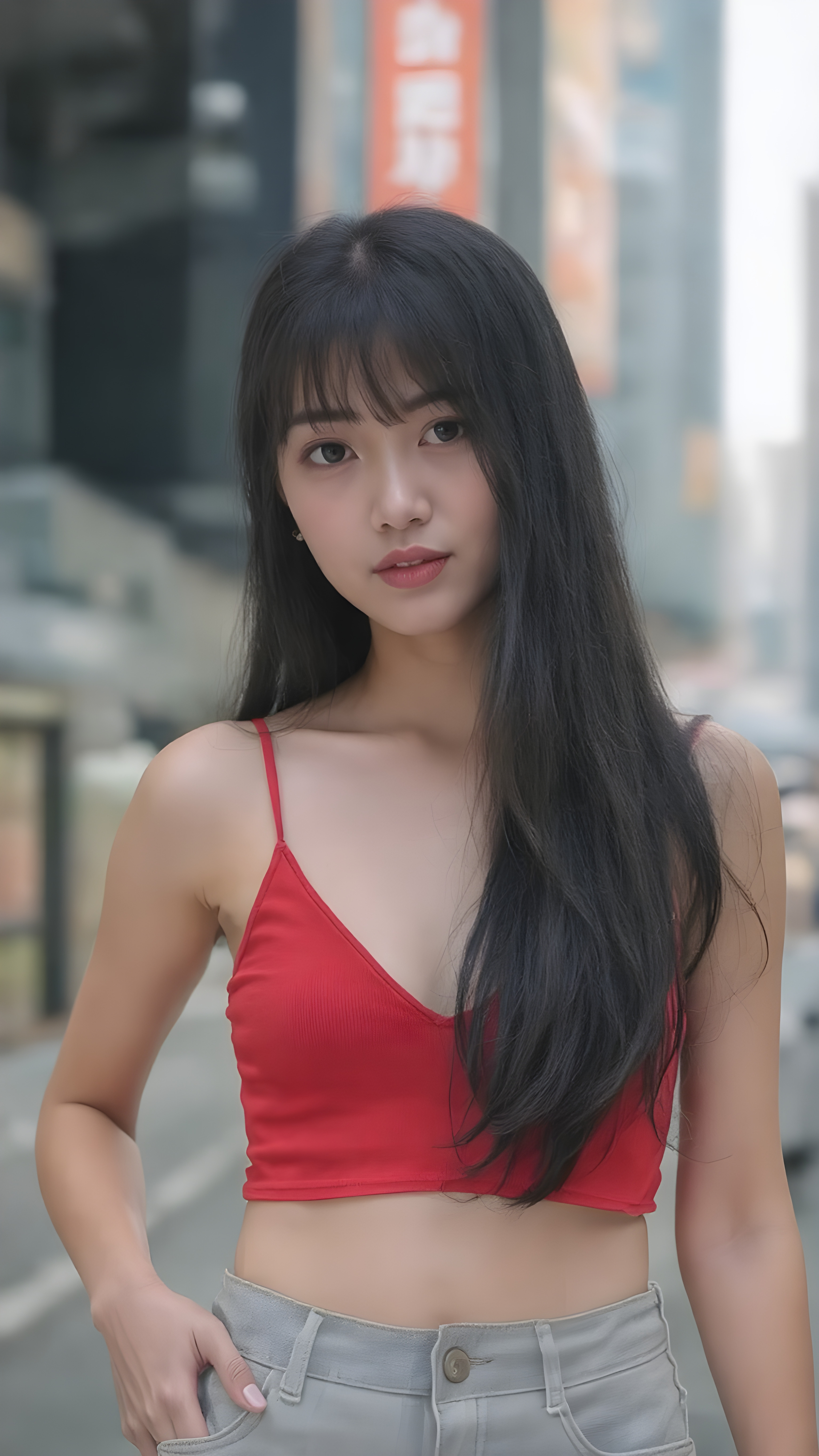 ((detailed and realistic photo)) from a cute young Korean girl with long jet soft black hair, accentuating her ((belly button)) with a (red cropped spaghetti tank top, deep v-neck), ((short jeans pants)), all against a backdrop in a big city