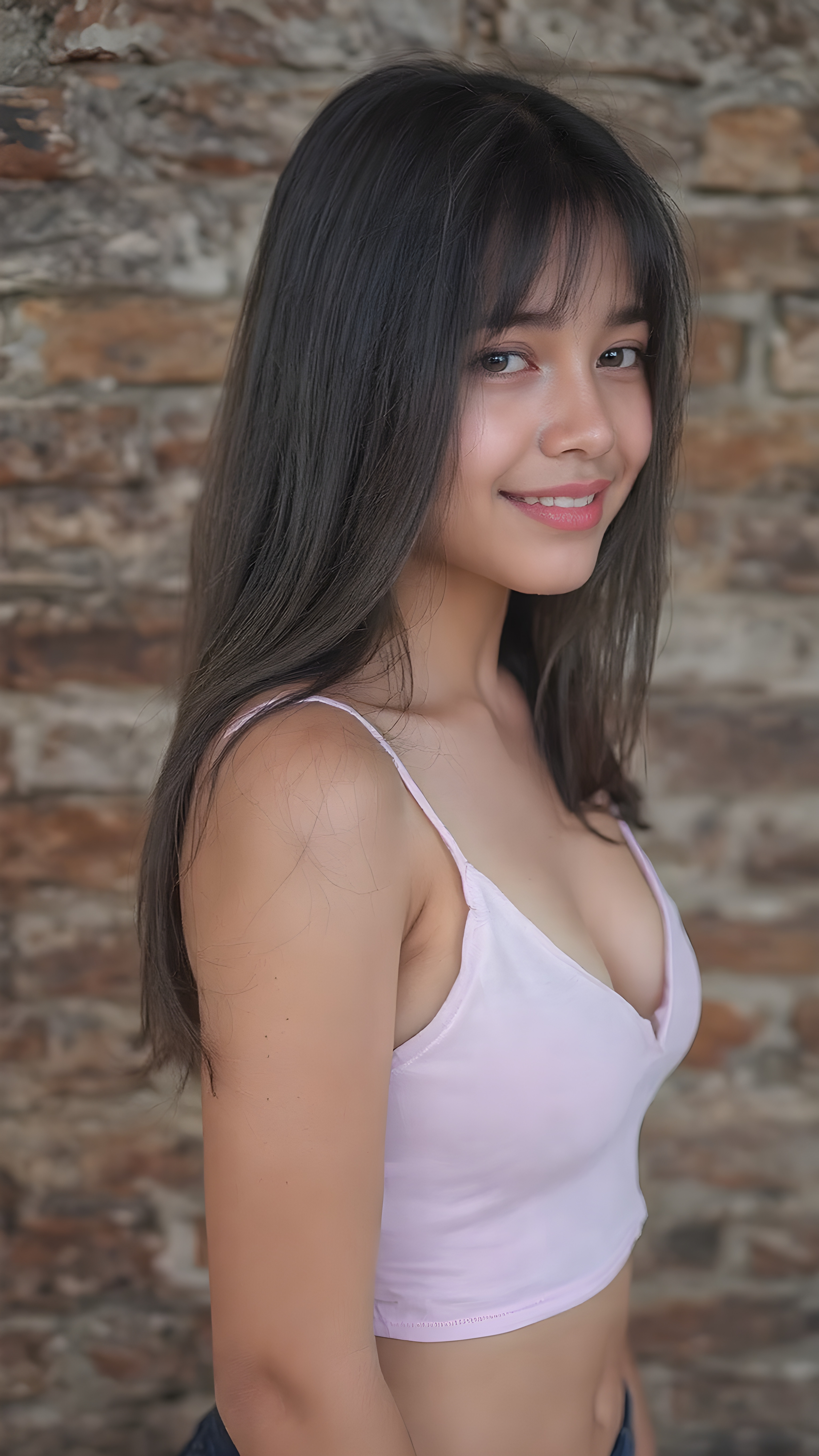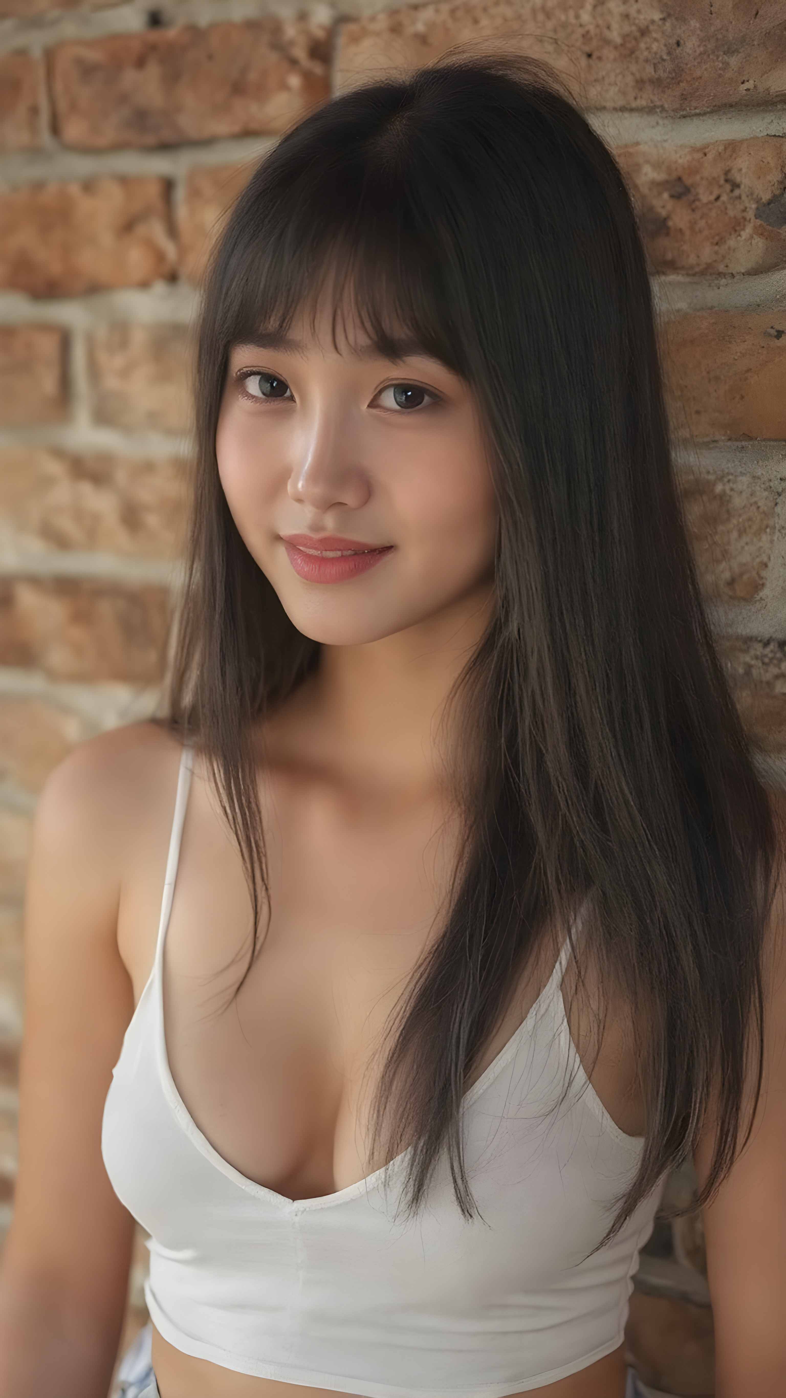 ((detailed and realistic photo)) from a cute young Asian teen girl with (jet, soft, straight hair, her hair falls elegantly over her upper body), bangs cut frame her perfect round face, accentuating her ((belly button)) with a (white cropped spaghetti tank top, deep v-neck), ((she stands in front of a realistic wall made of bricks)), side view, warm smile, seductive, perfect curved body