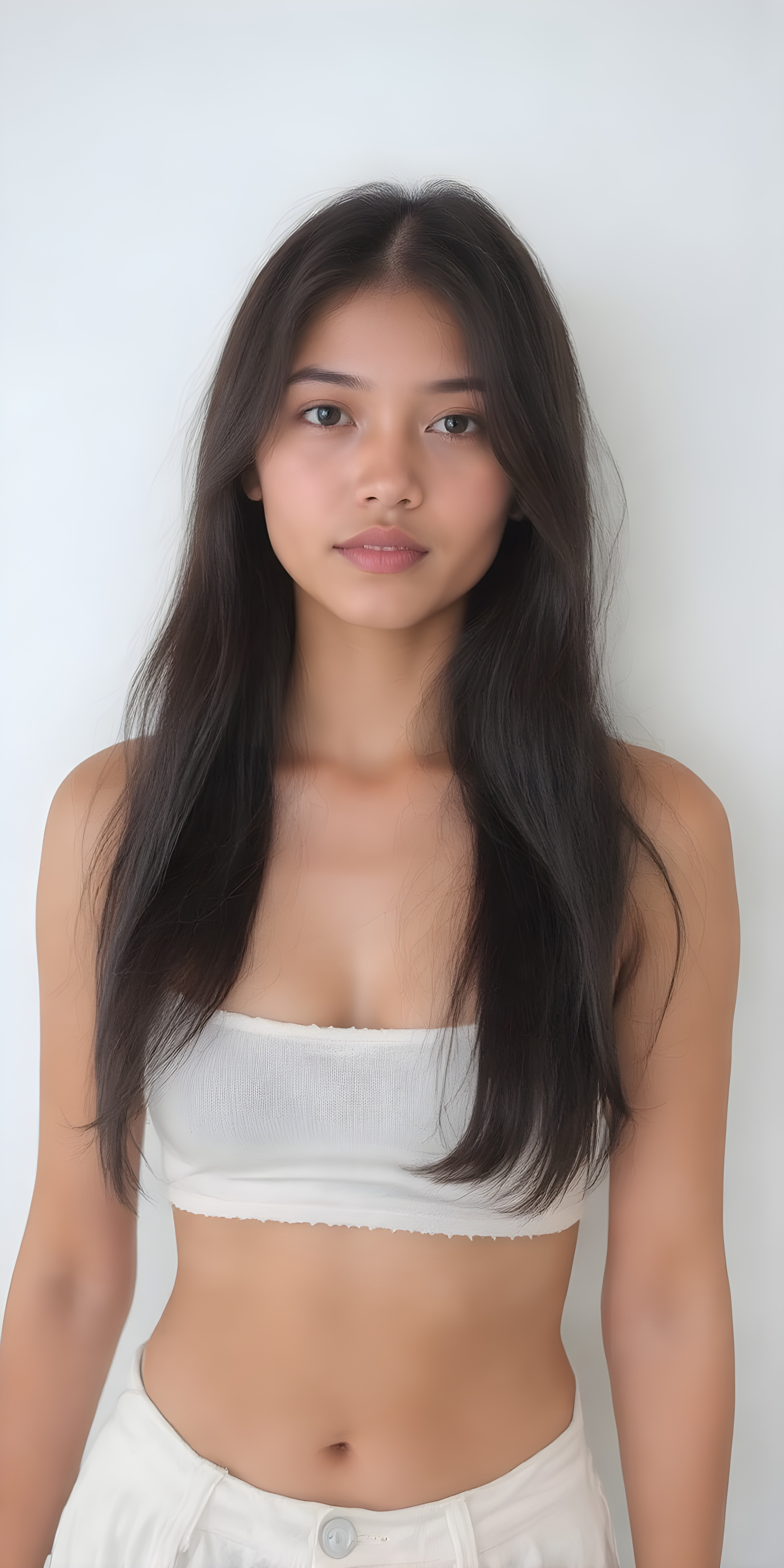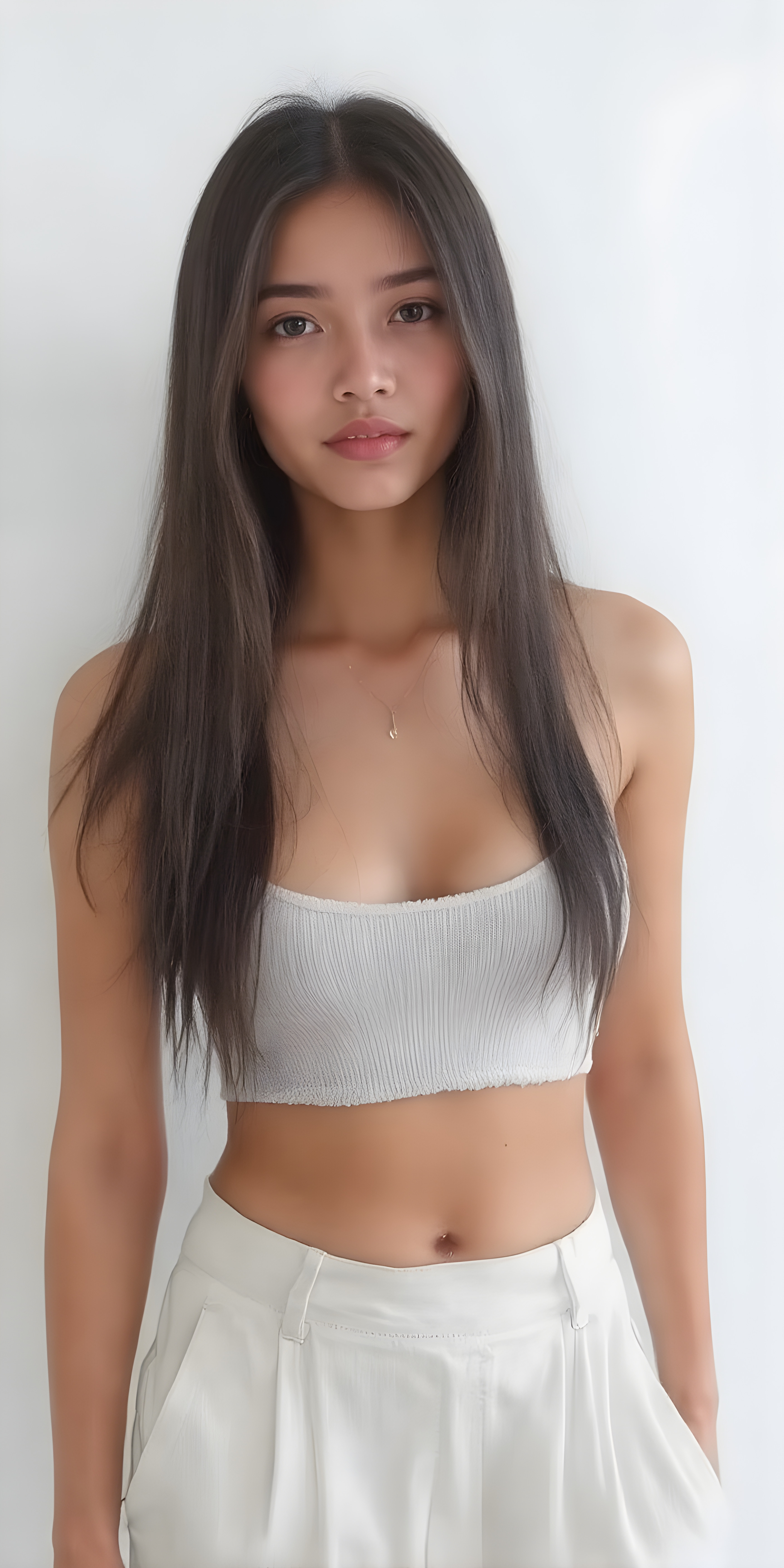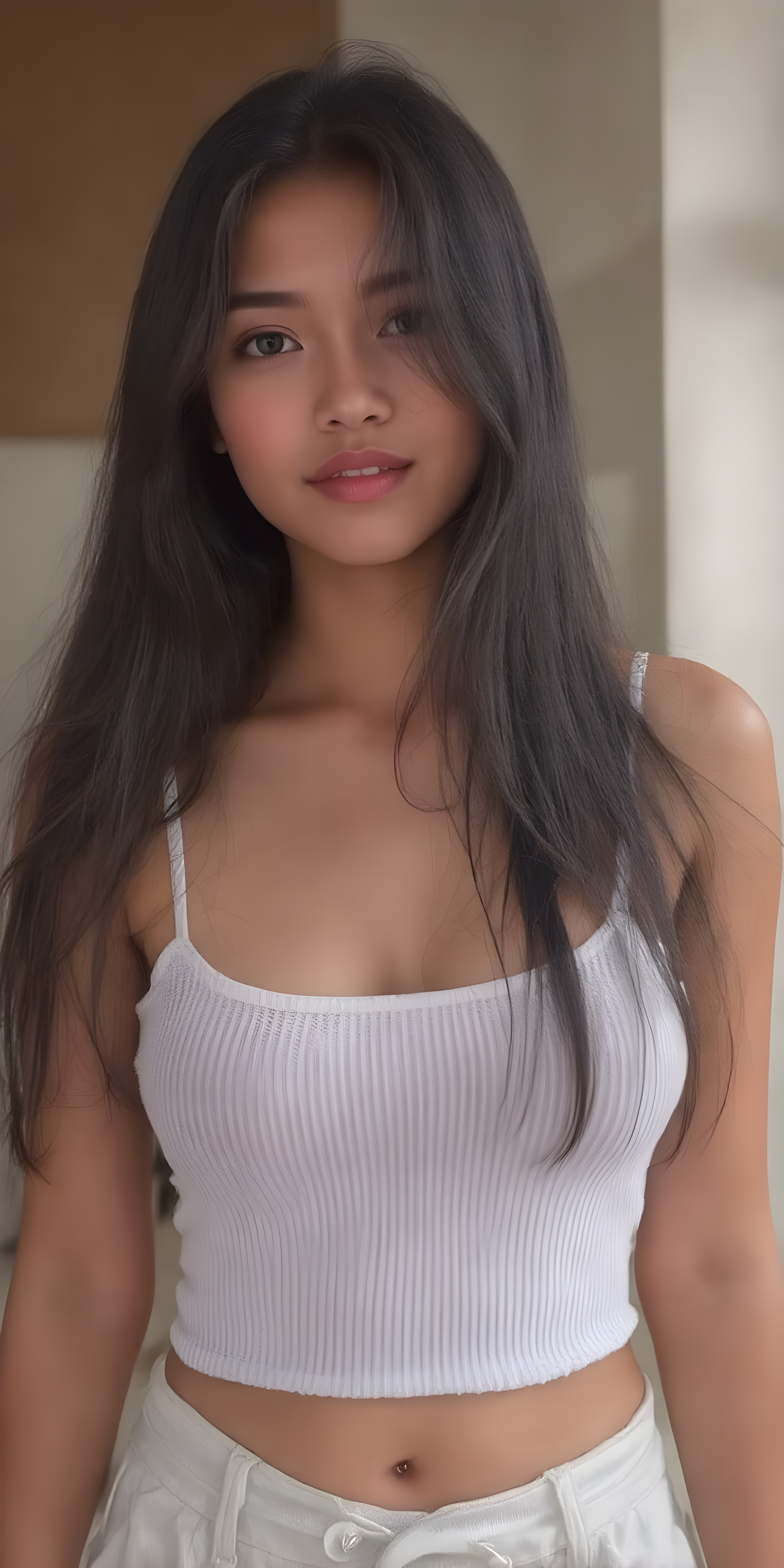 detailed and realistic photo from a cute young busty Filipino girl with long jet black hair, accentuating her (((navel))) with a (white cropped spaghetti tank top) made of fine wool, ((wide, baggy white pants, cut to frame her shape))
