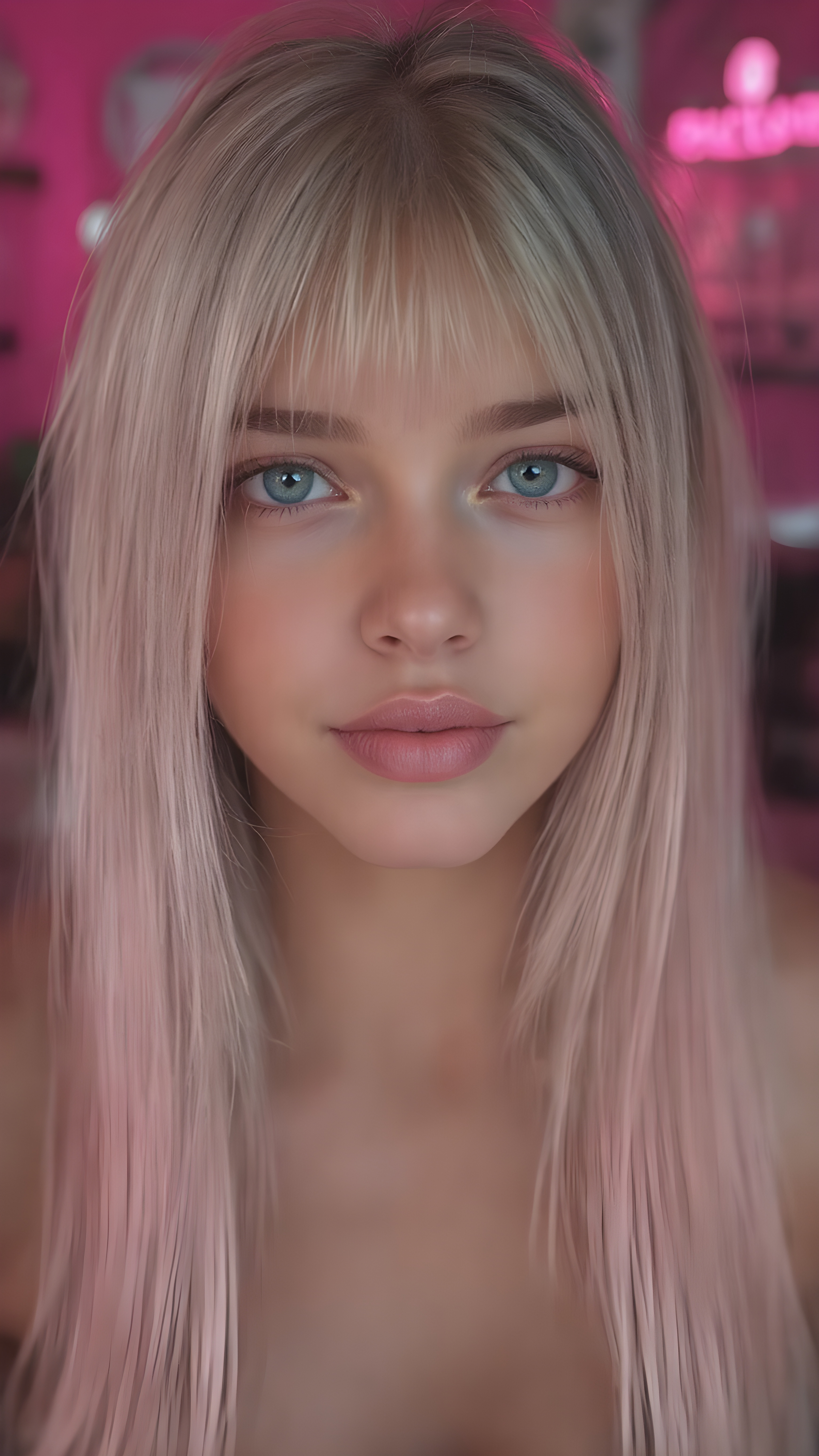 a (((beautiful young super realistic and detailed girl))), with ((extremely long, straight, thick soft pink hair)), and ((big, expressive, bright, natural pink eyes)), that convey a sense of youthful allure. Her ((skin is flawless)), with ((perfect pink lips)) that add to her enchanting smile. She’s ((busty)), with ((big, round, full, slightly parted lips)), that are just barely parted in a playful smile. Her ((almond skin)) adds to her ((natural beauty)), with ((pink mini low-cut v-neck tank top)) that accentuates her ((female figure)), (soft, pink background)