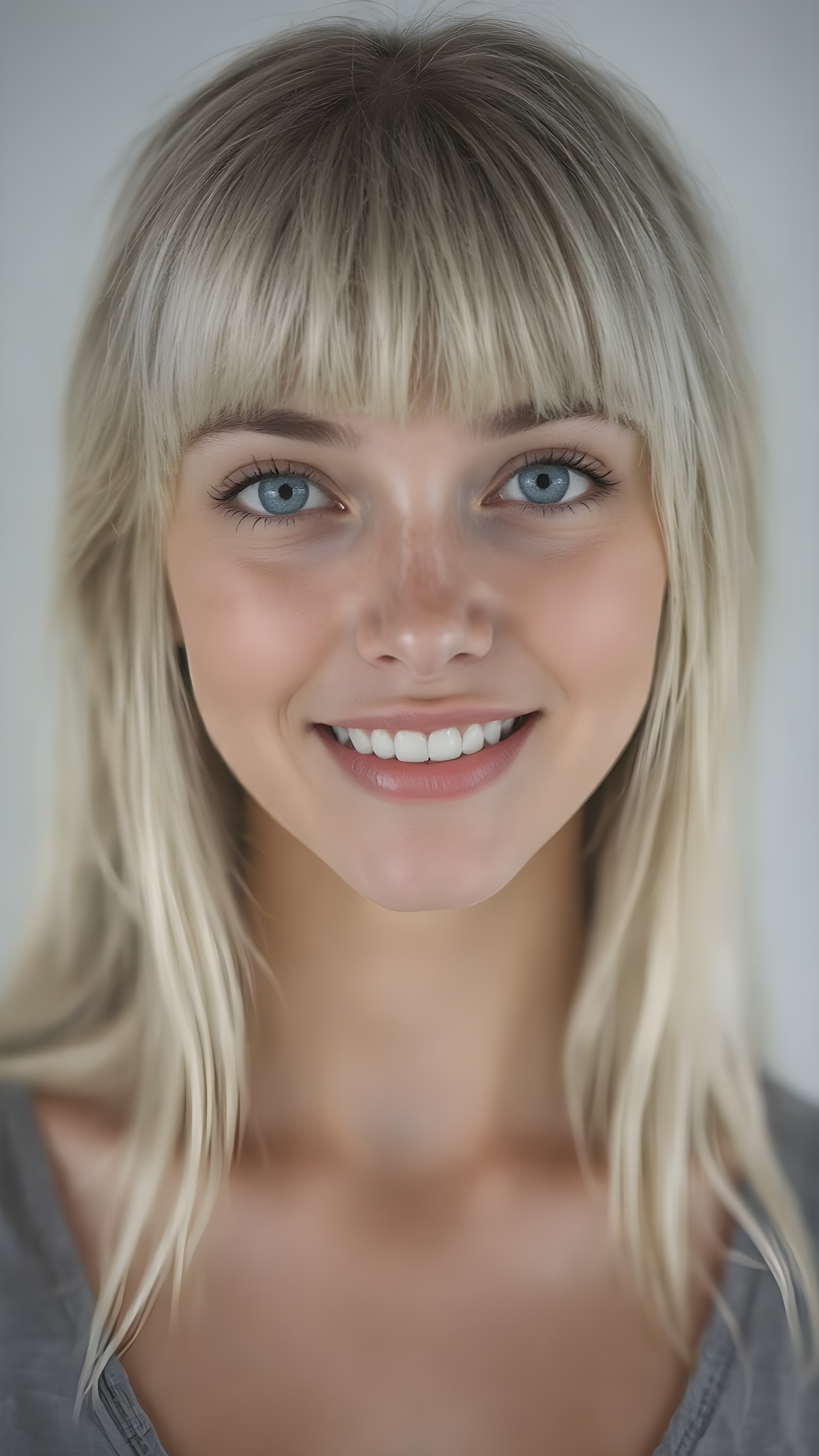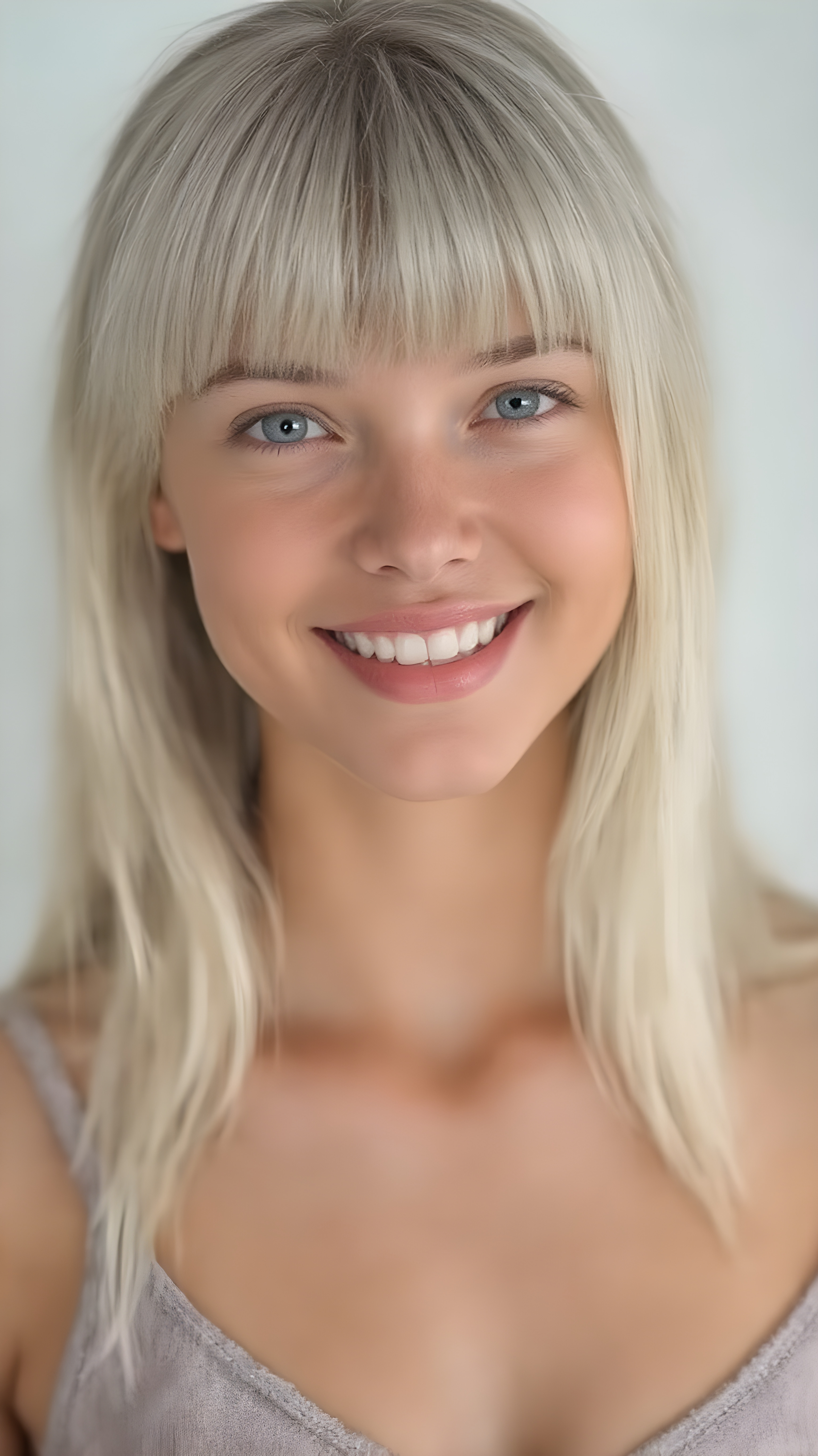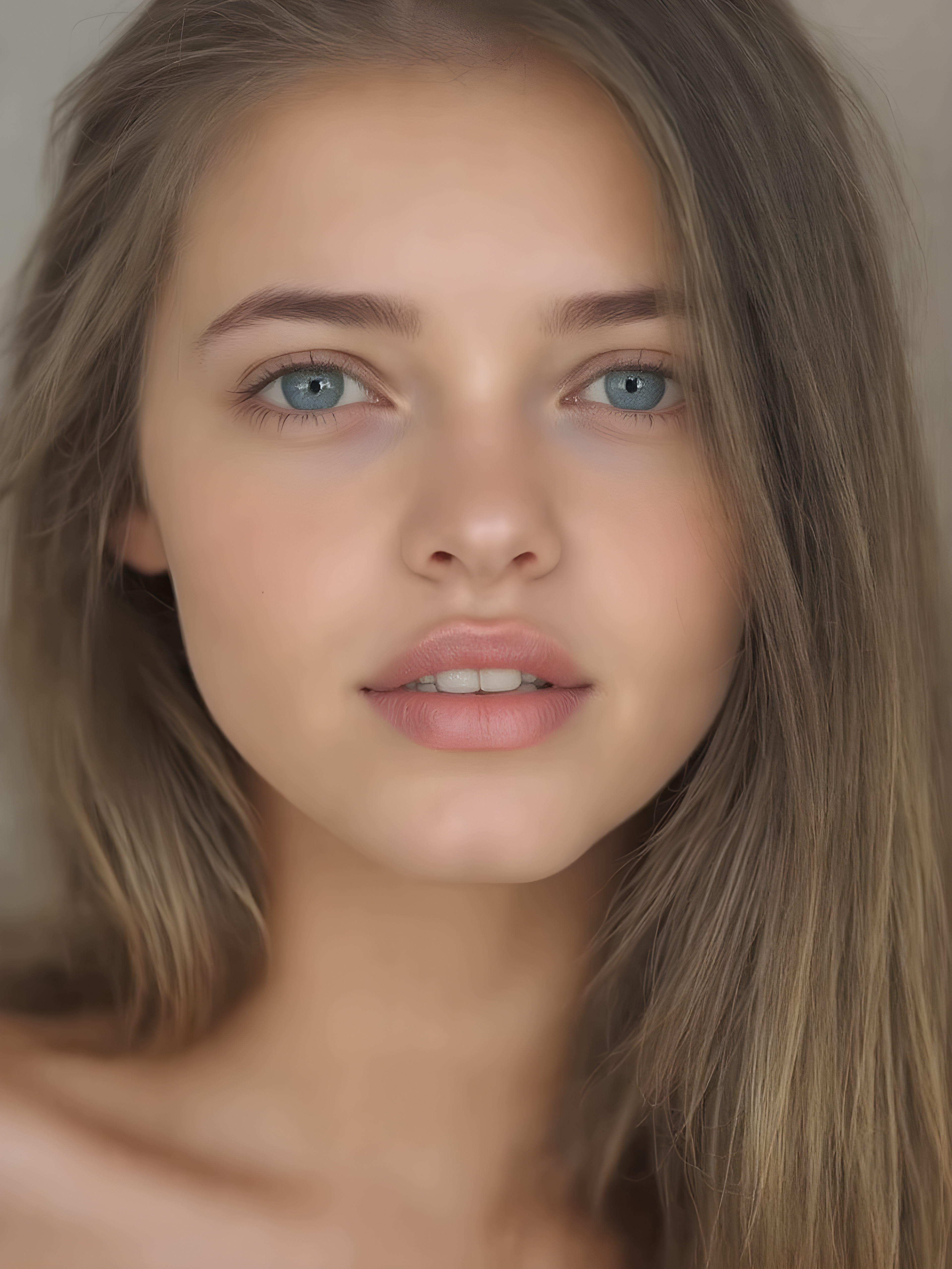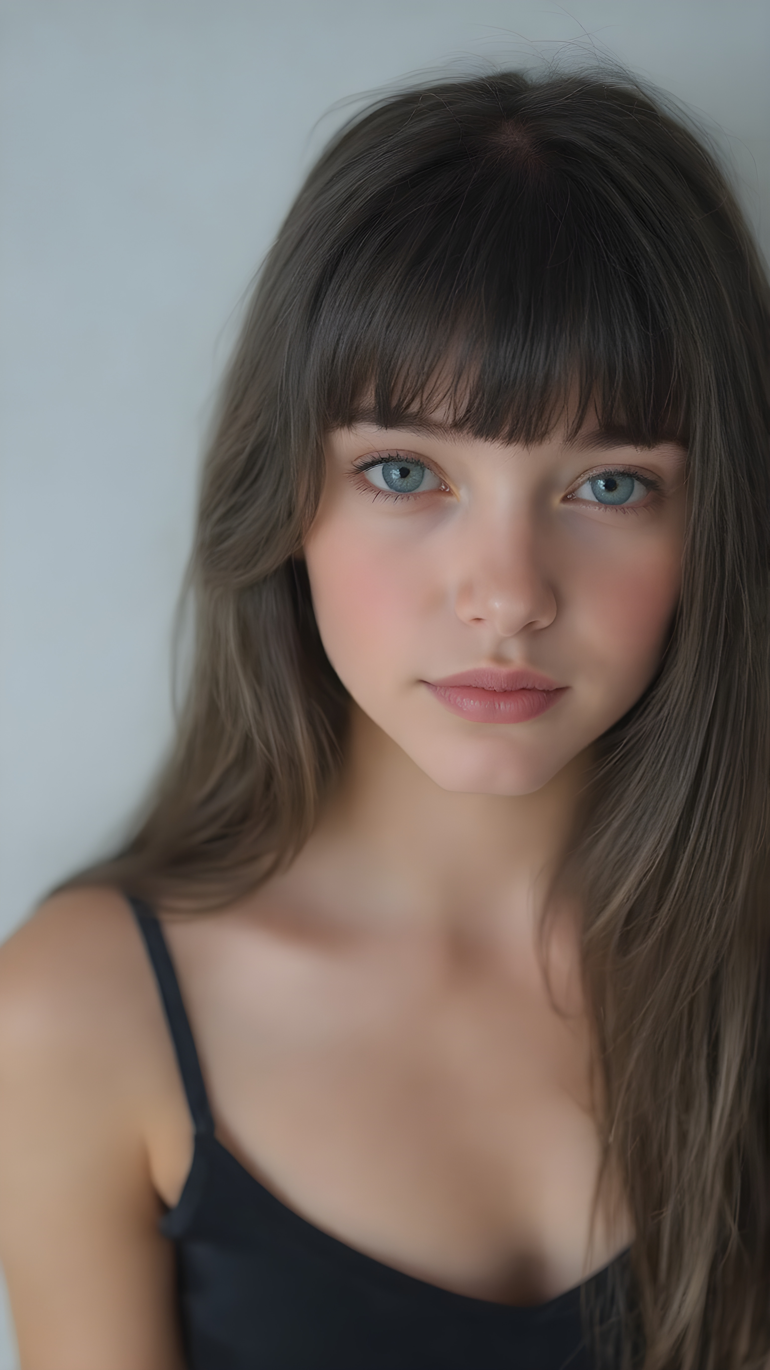 a (((beautiful young girl looks like a doll))), with ((extremely long, straight, thick, untucked soft brown hair, bangs)), and ((big, expressive, bright, natural light blue eyes)), that convey a sense of youthful allure. Her ((skin is flawless)). She’s ((busty)), with ((big, round, full, slightly parted lips that add to her enchanting smile)). Her ((almond skin)) adds to her ((natural beauty)), with ((long, sheer, thin, tight tank top)), light grey studio backdrop
