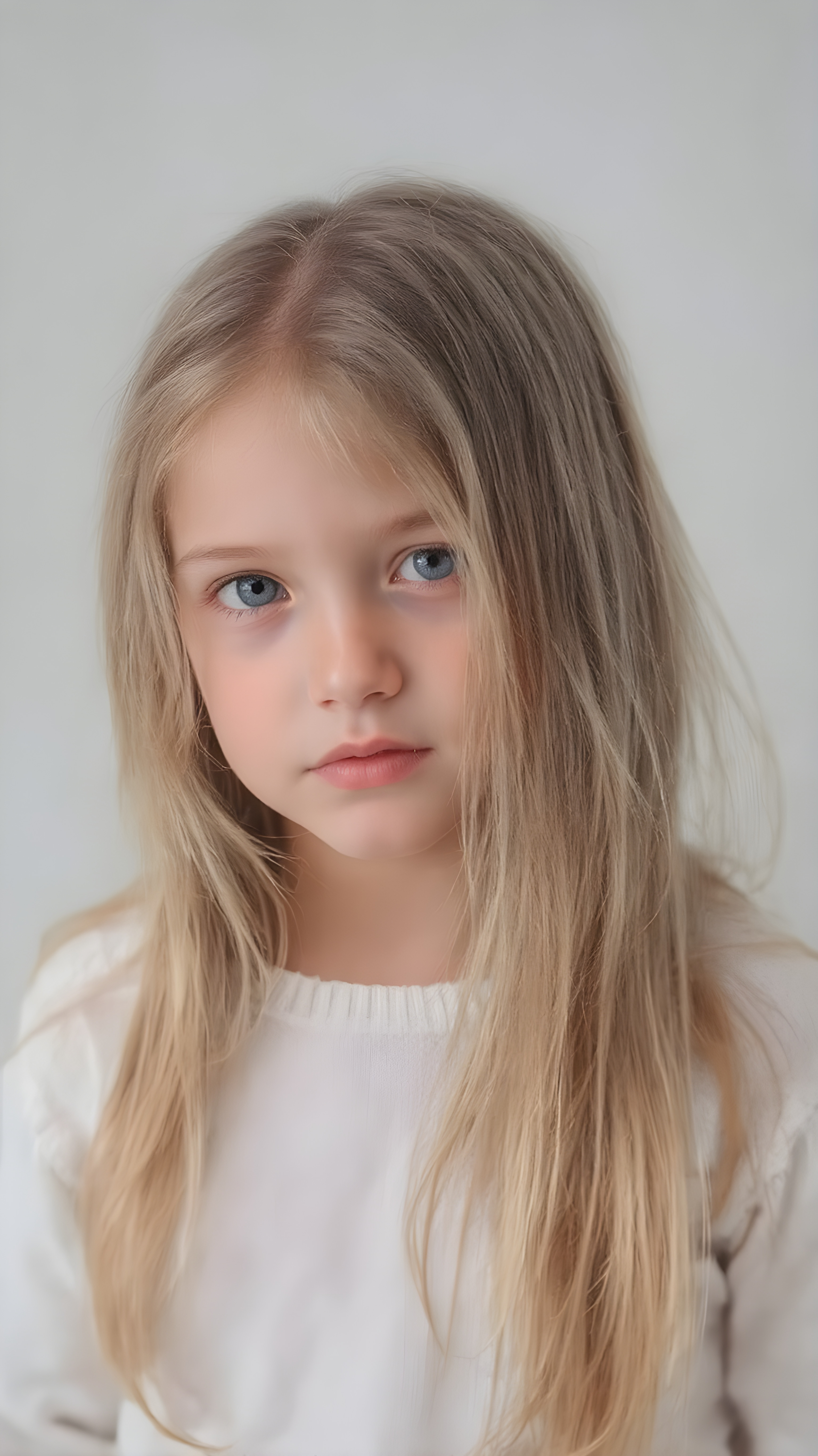 a (((professional photograph))) featuring a beautiful young girl with very long, straight, thick, untucked natural white golden blonde hair worn down, full body view, where her face exudes curiosity and inquisitiveness. She is wearing a white fine sweater that emphasizes her youthful beauty. Against a backdrop of a (simple, plain grey background) that complements the warm tones of the scene, the girl stands out in a striking pose, capturing attention to detail in every aspect of the image. Soft lighting, high resolution, full HD