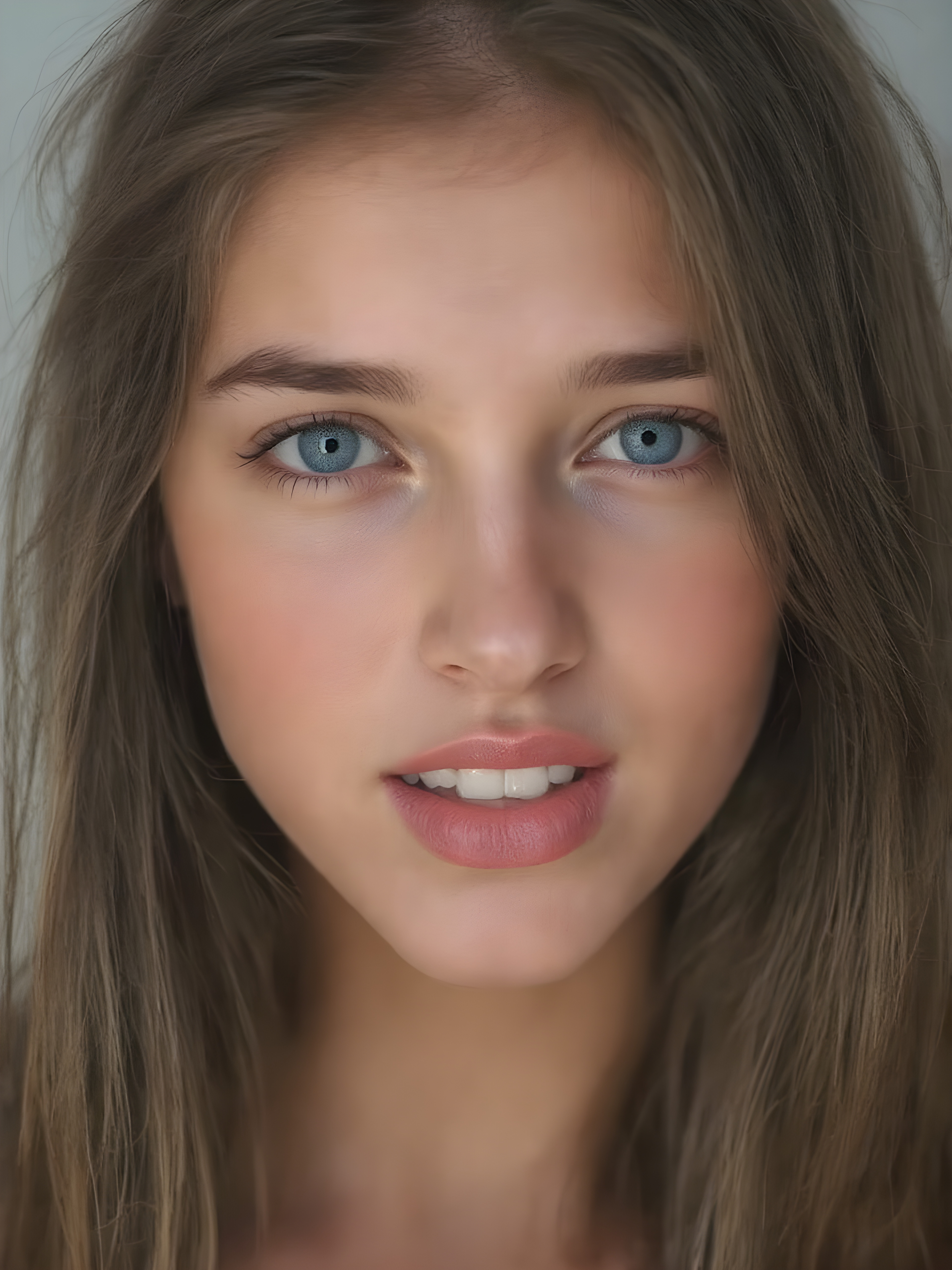 ((centered portrait)) a beautiful young woman with plump, full kissable red lips, a gentle face and fine, straight brown hair. Her eyes shine like blue diamonds, flawless skin, wonderful make-up. She has white teeth and a small nose. Her face is round, with big eyes. The picture has something magical about it. Her mouth is wide open and the girl radiates pure desire.