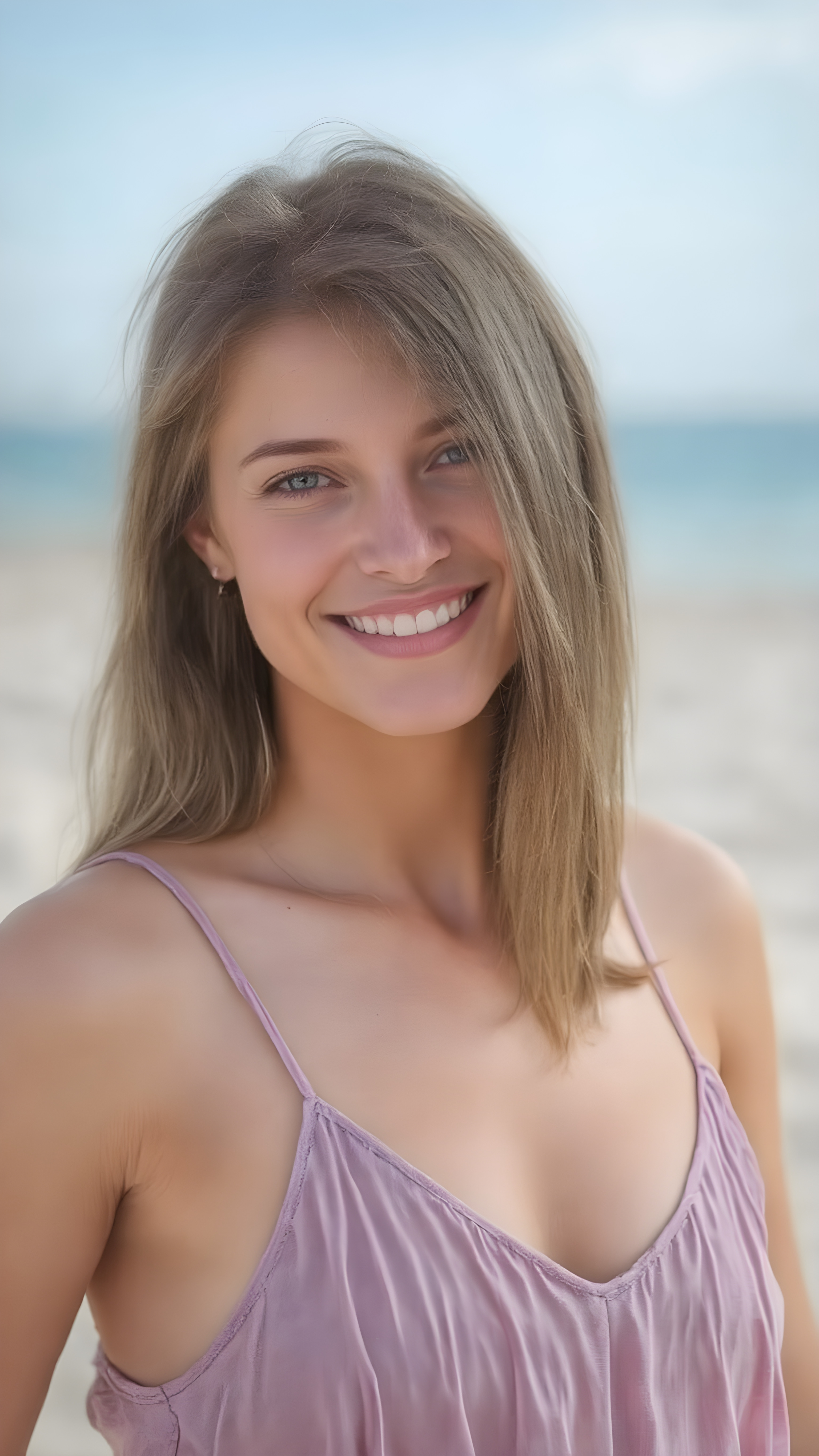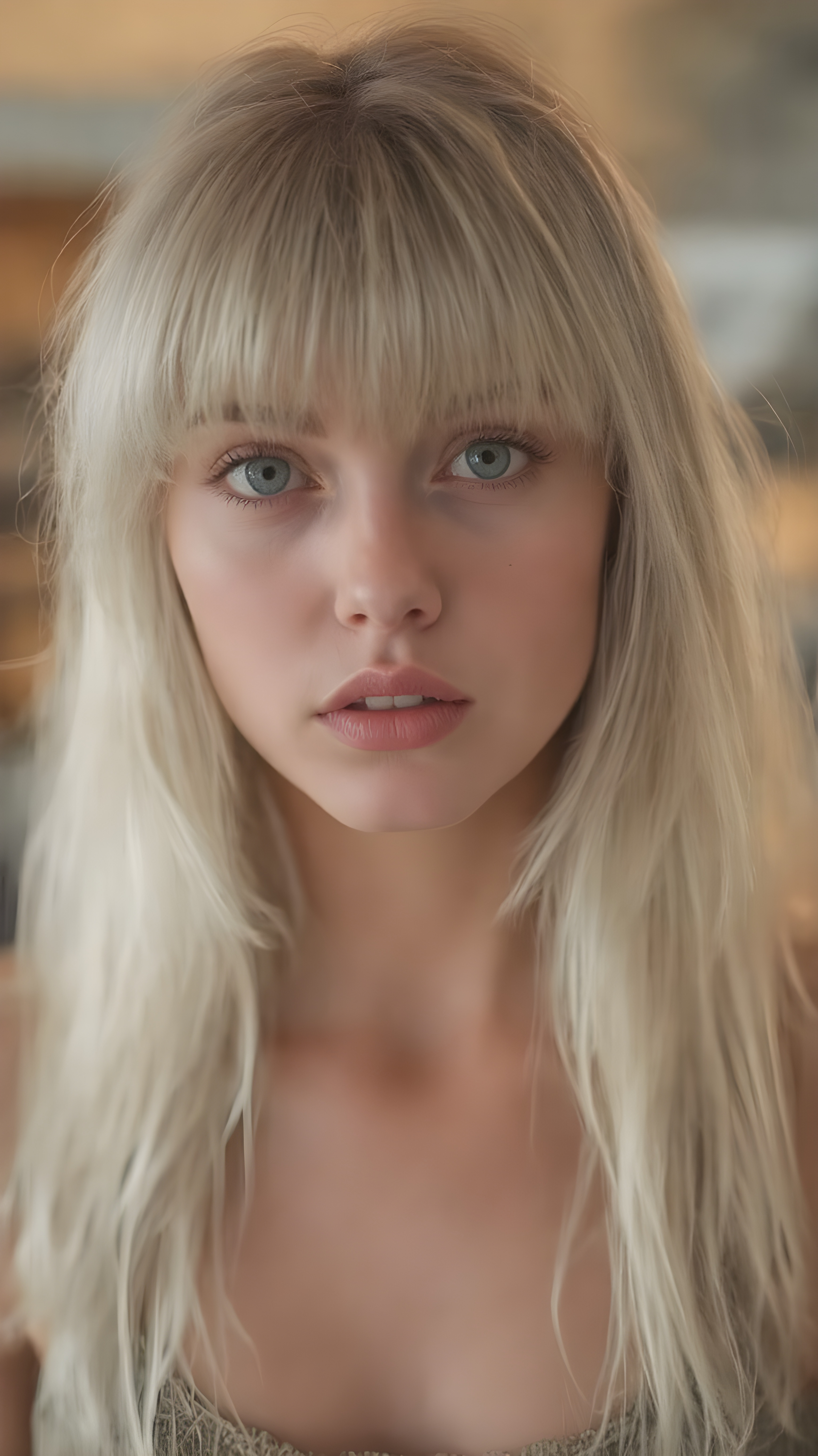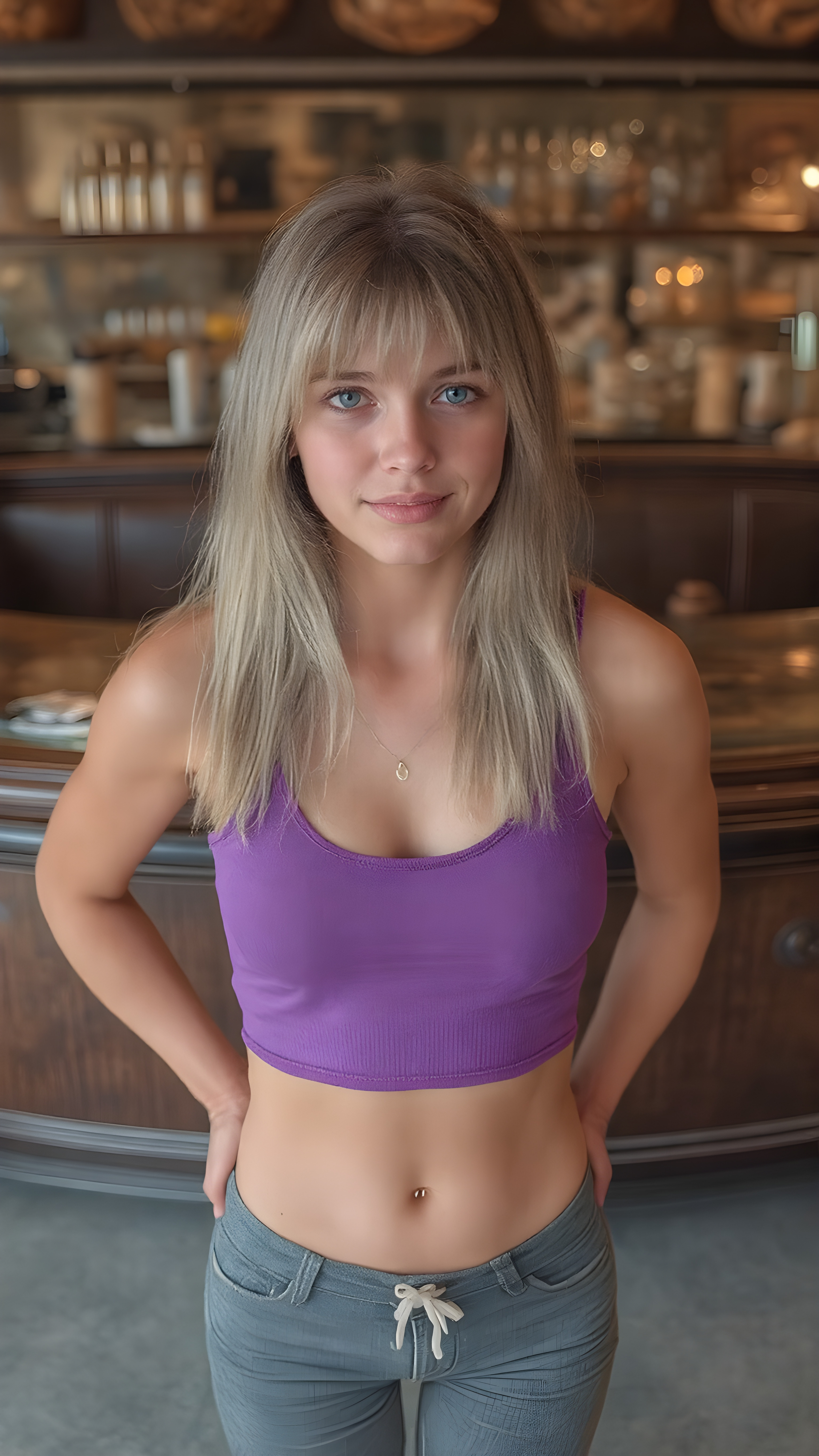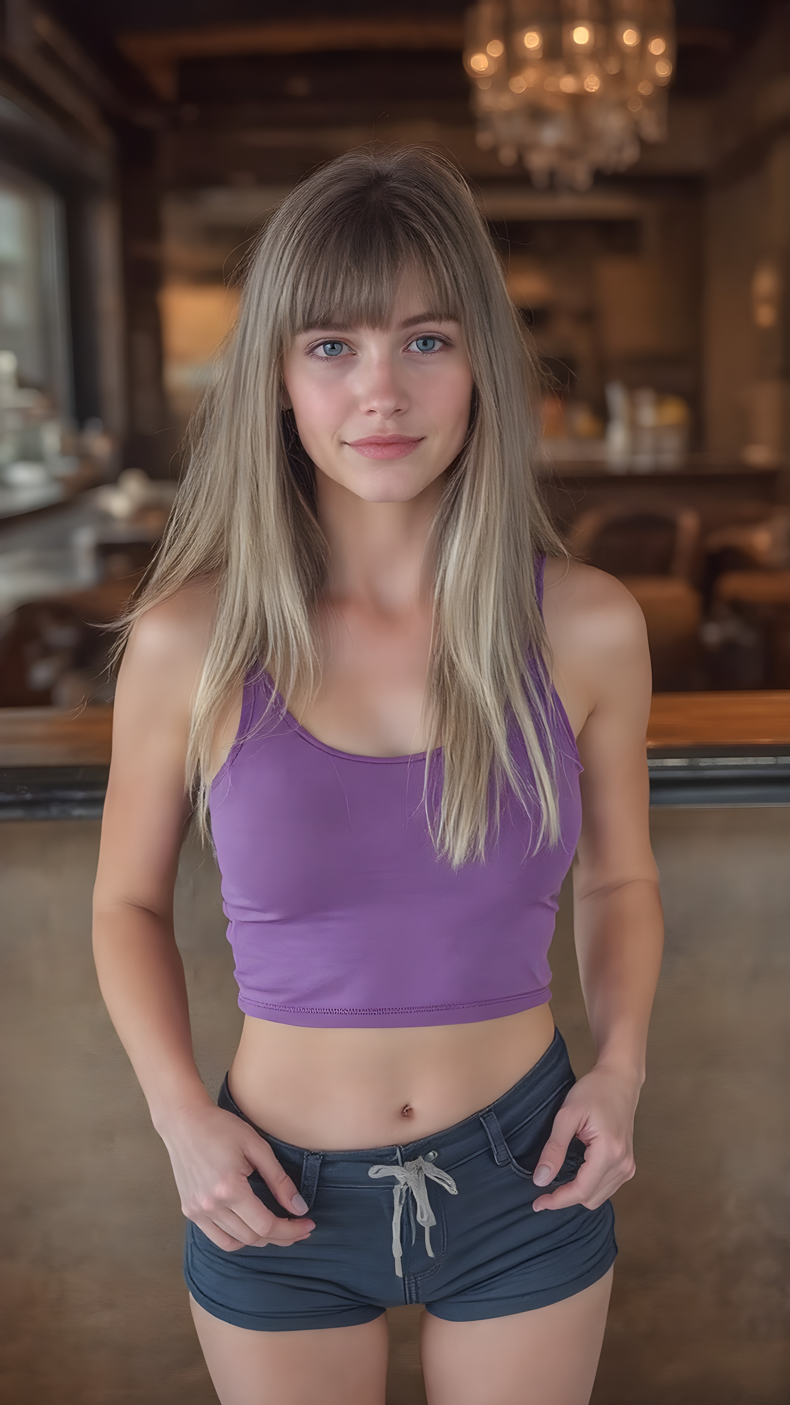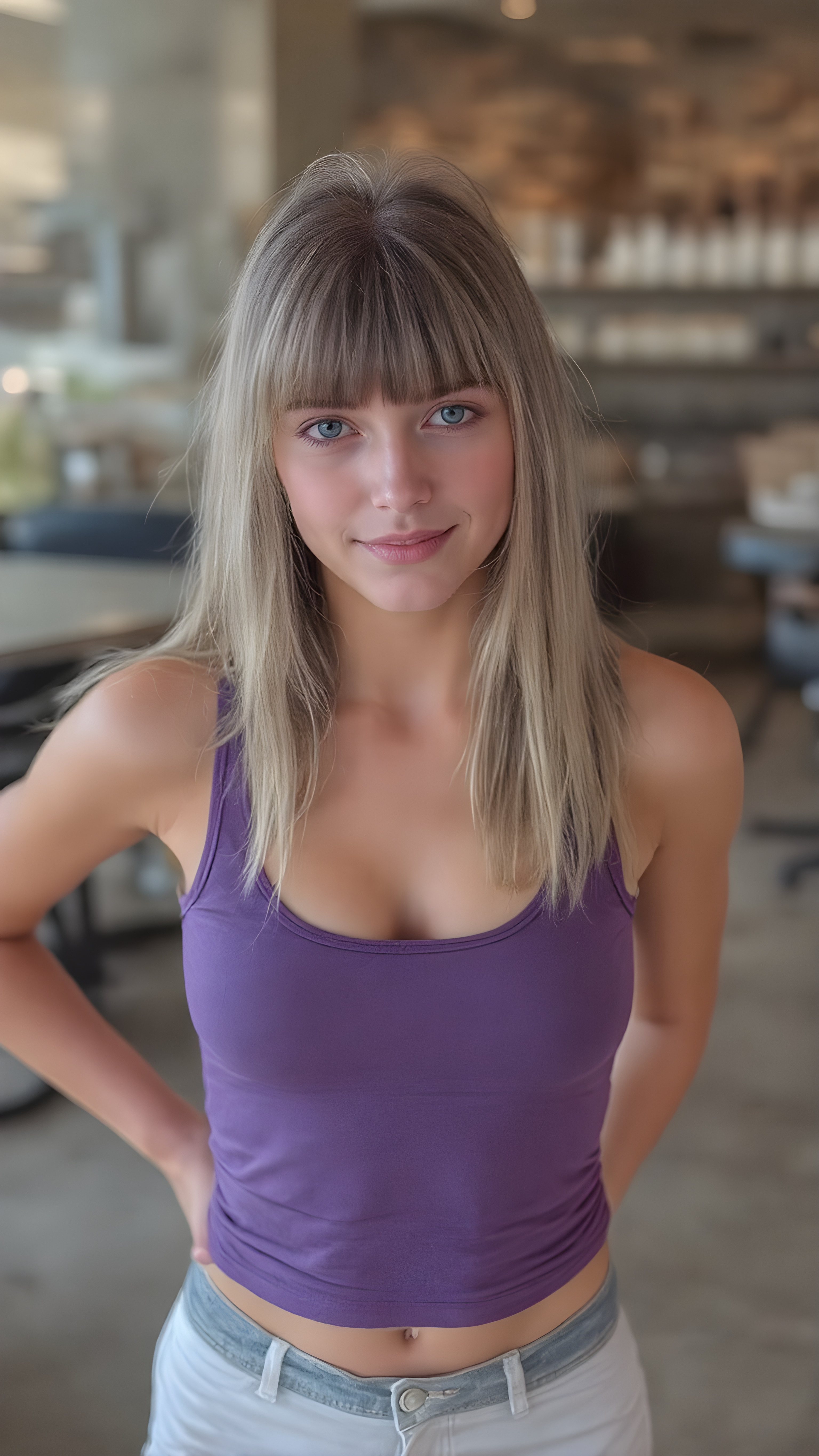 a girl with a beautiful pout, long soft hair in perfect bangs cut frame her round face, realistic and detailed, she wears a lifted cropped tank top, stunning female body, she waits seductively for a kiss
