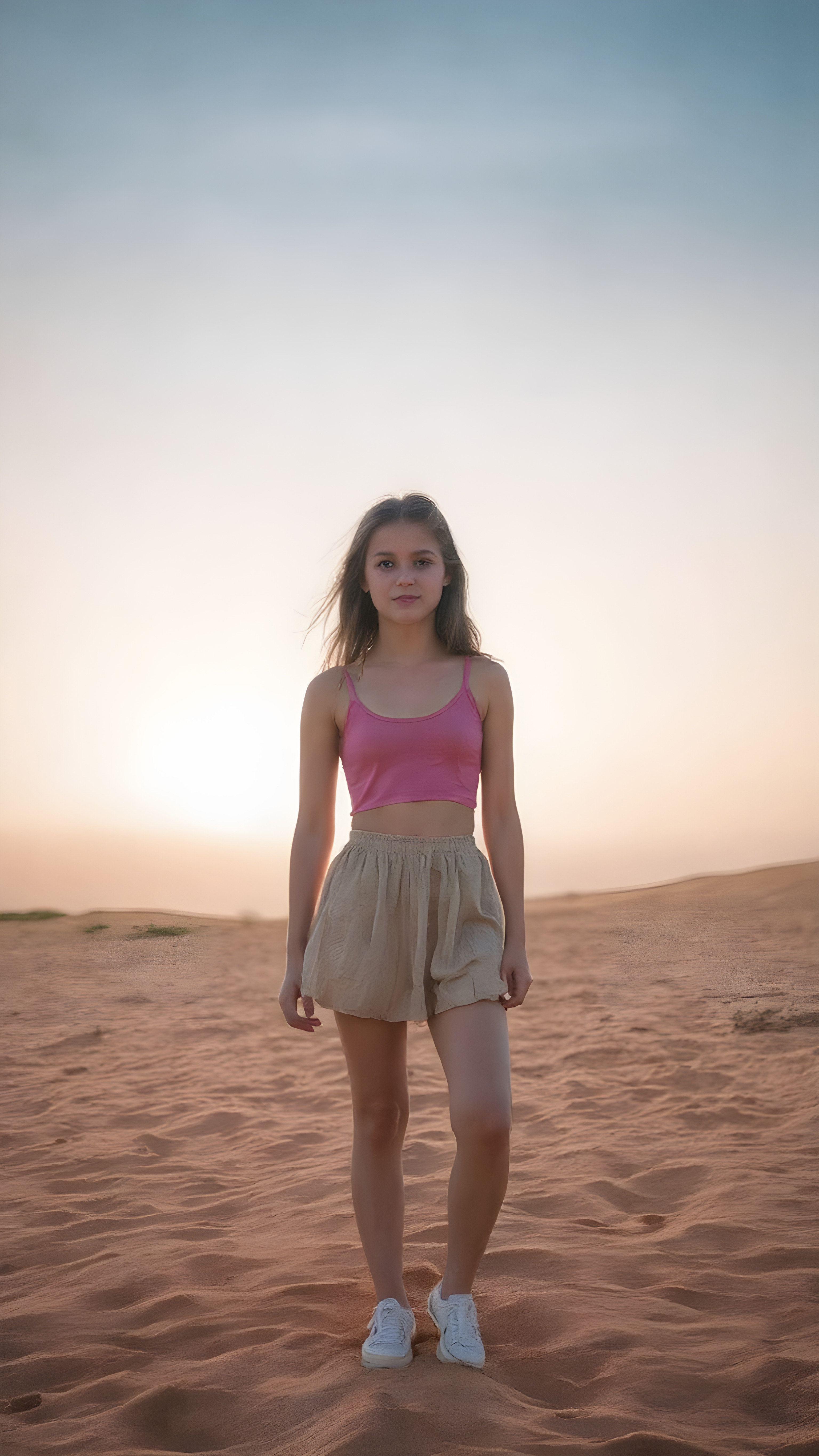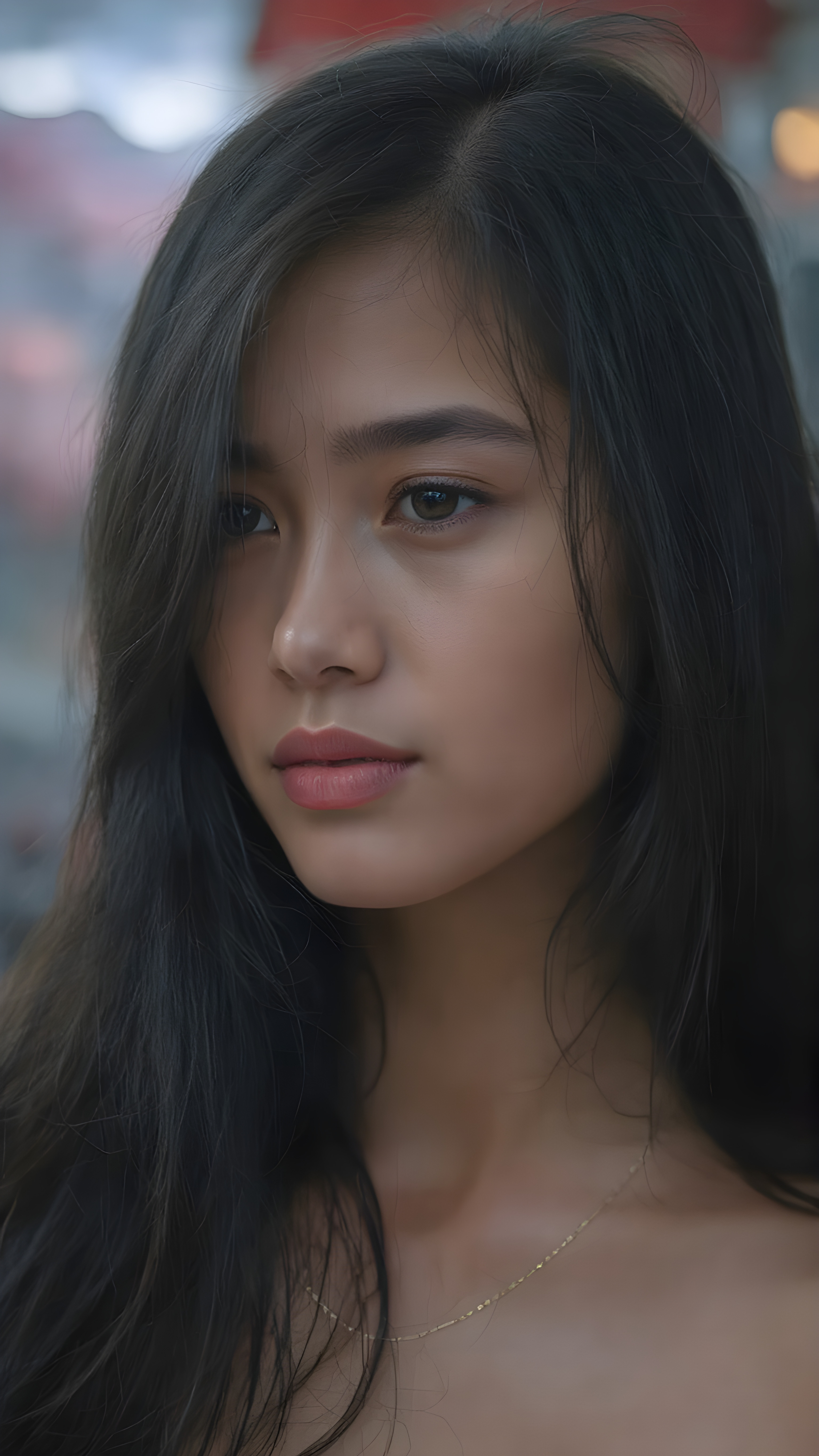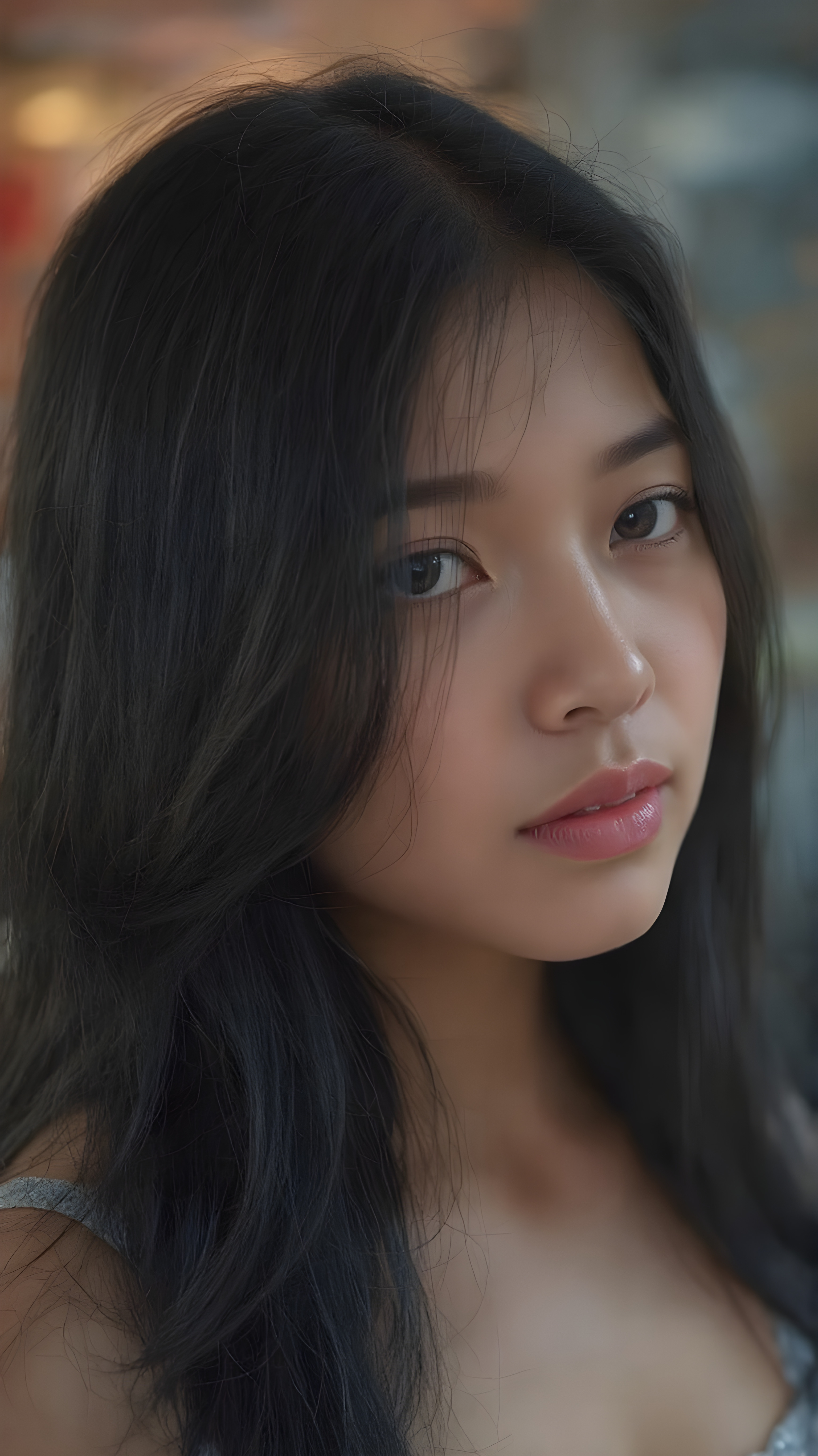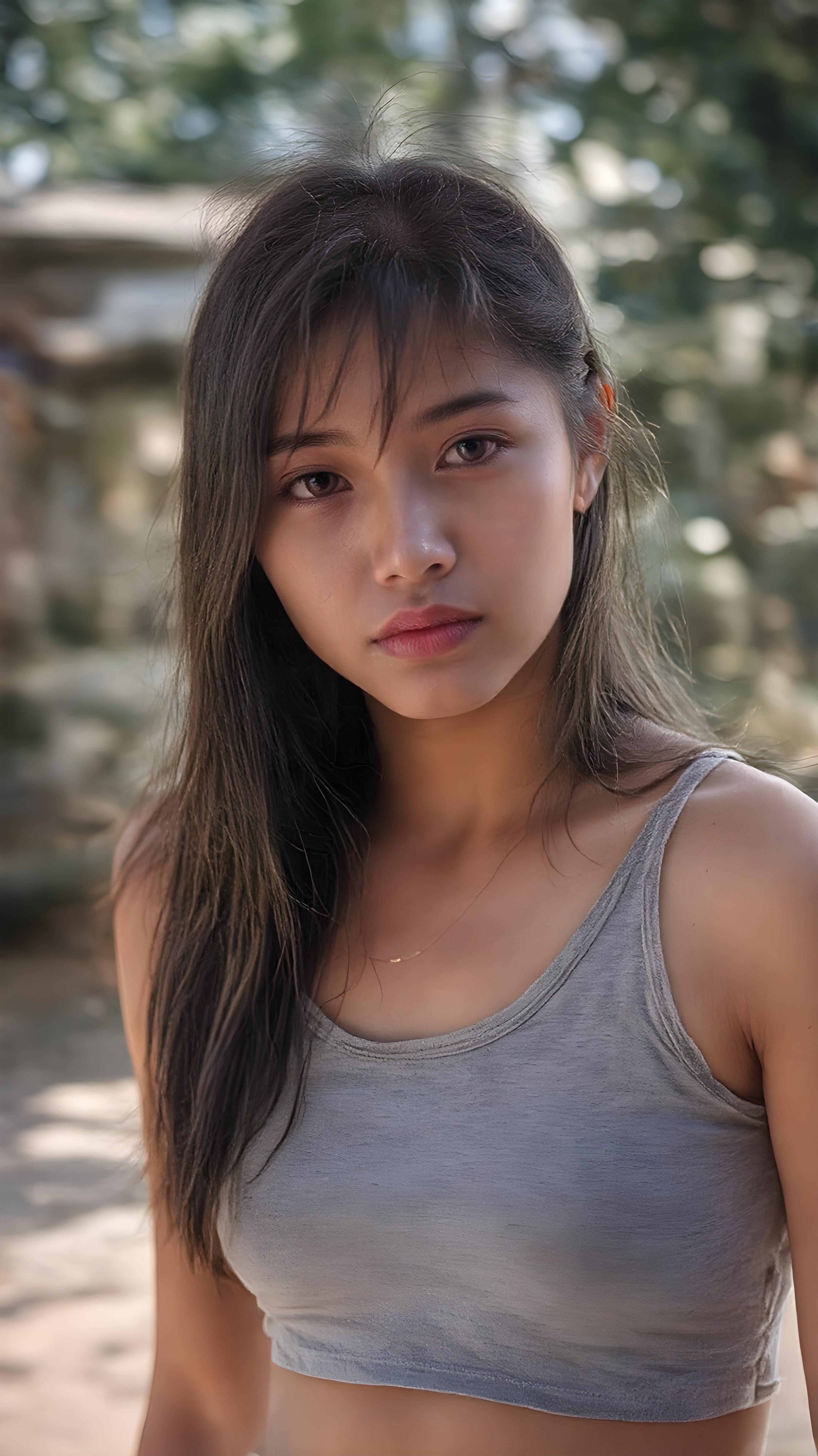 a realistic close up photo (((beautiful young Javanese girl, full body, photography, cinematic))), long black hair, (((extremely skinny and slender, with a sleek, yet softly proportioned figure))), wearing a ((cropped grey t-shirt)) that accentuates her toned physique against a backdrop of a sunny, outdoor setting