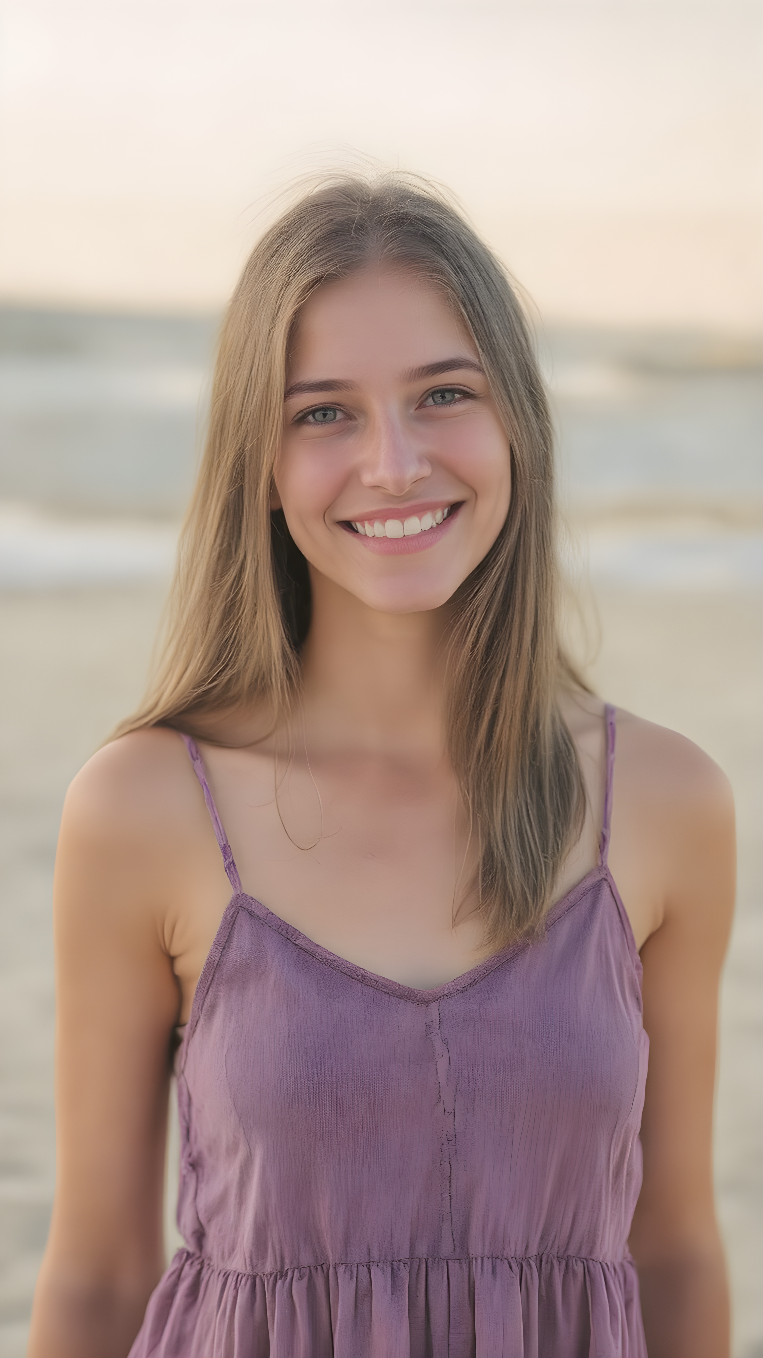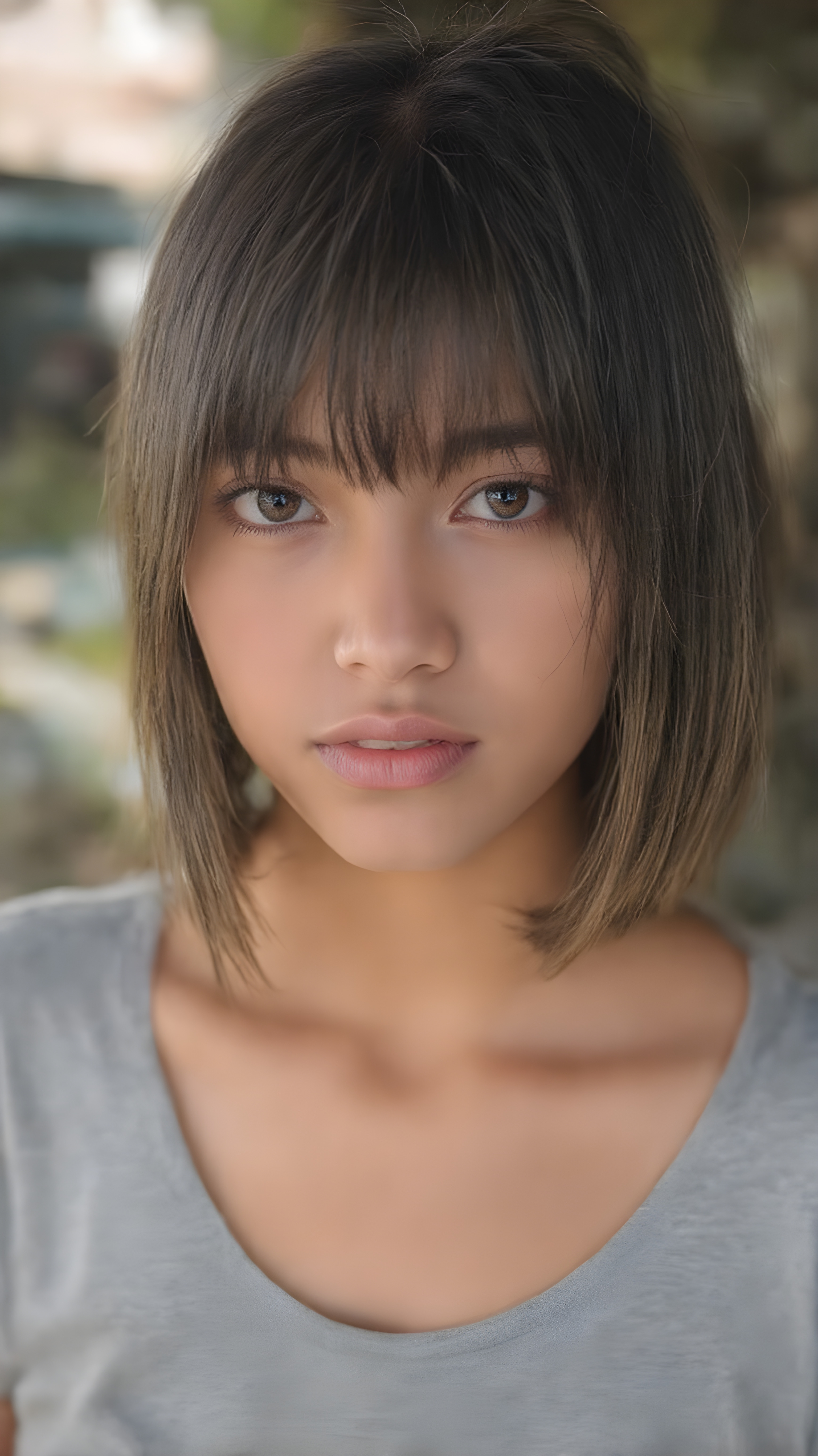 a realistic close up photo (((beautiful young Javanese girl, full body, photography, cinematic))), with super straight, (((bright brown hair, bangs and bob cut))), (((extremely skinny and slender, with a sleek, yet softly proportioned figure))), wearing a ((cropped grey t-shirt)) that accentuates her toned physique against a backdrop of a sunny, outdoor setting