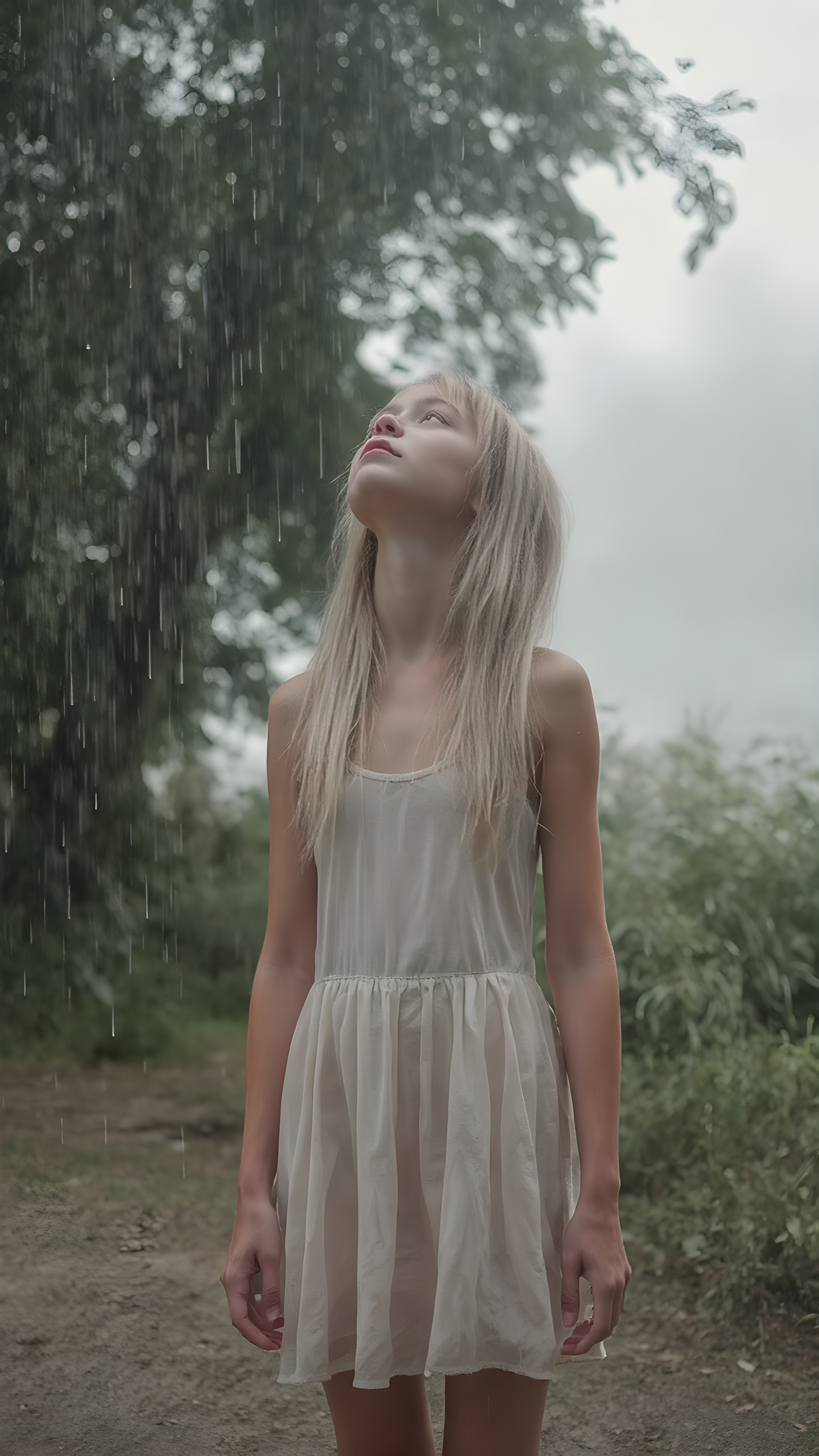 a tall girl stands alone in the summer rain, she is very lightly dressed, has wet straight blond hair and looks up at the sky