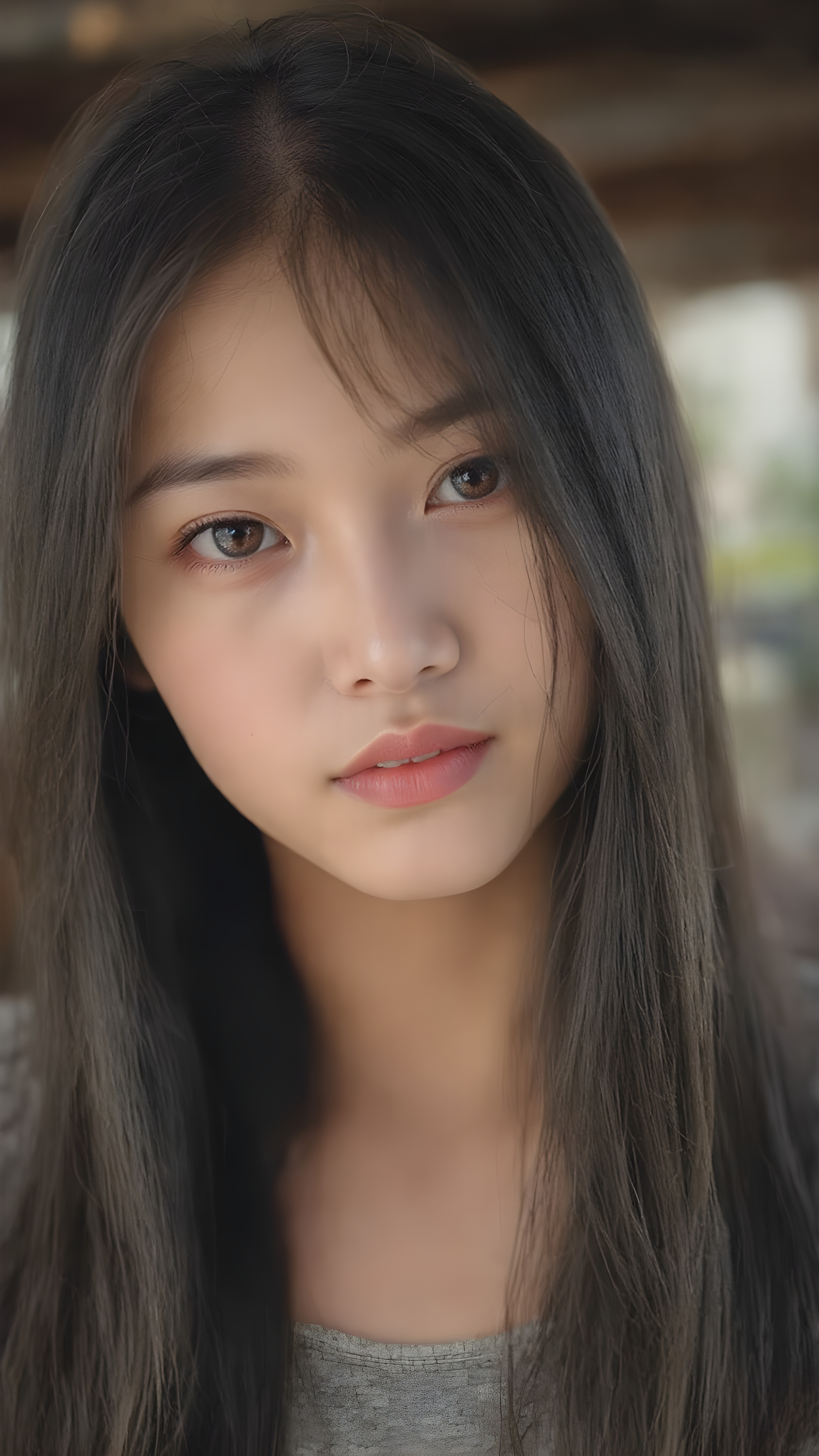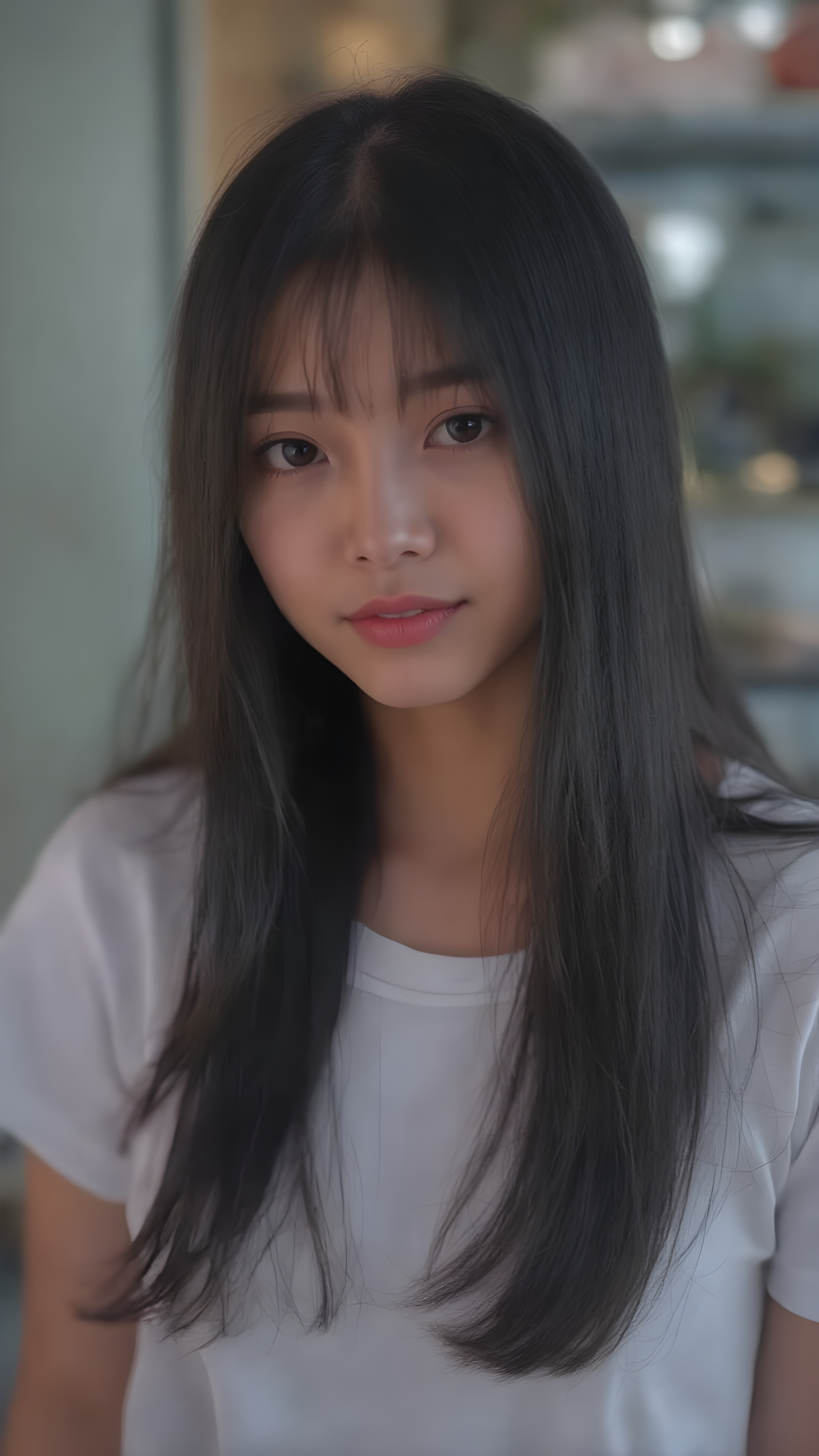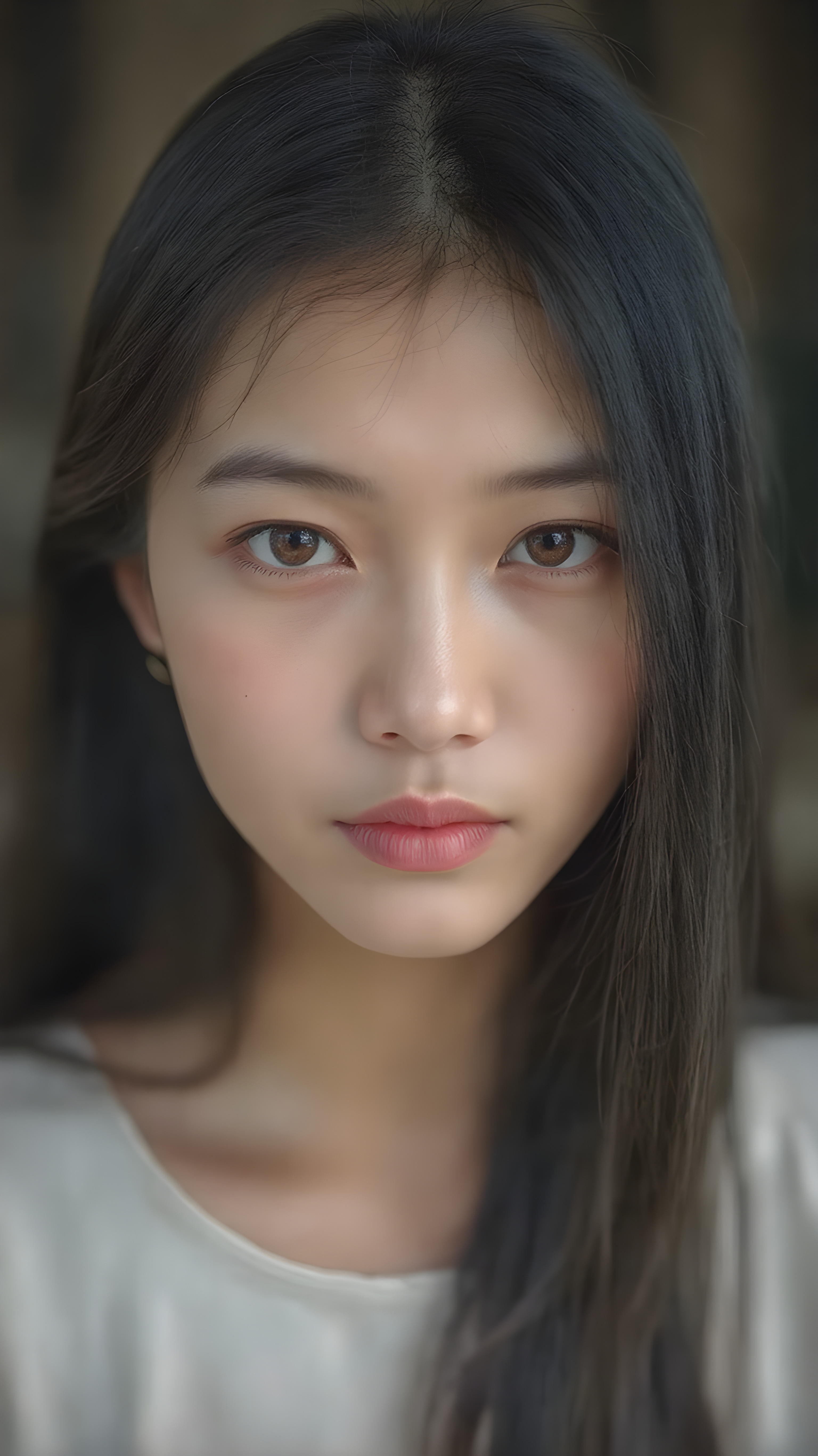 A (((beautiful Asian girl))) who exudes an air of youthful confidence, with (((long, straight silky black hair))), that falls in soft, gentle waves framing her face, complemented by delicate, (((freckles))). Her features are (((perfectly symmetrical))), with (((bright, piercing red eyes))), that gives off an ethereal glow. Looking directly into the camera, she emits an unmistakable air of elegance and grace. (((Full body view))) The overall atmosphere of the photograph is one of (extreme detail and clarity) that reflects a (hyper realistic and hyper detailed rendering) of this stunningly beautiful scene, showcasing this breathtaking girl in a truly unforgettable moment.
