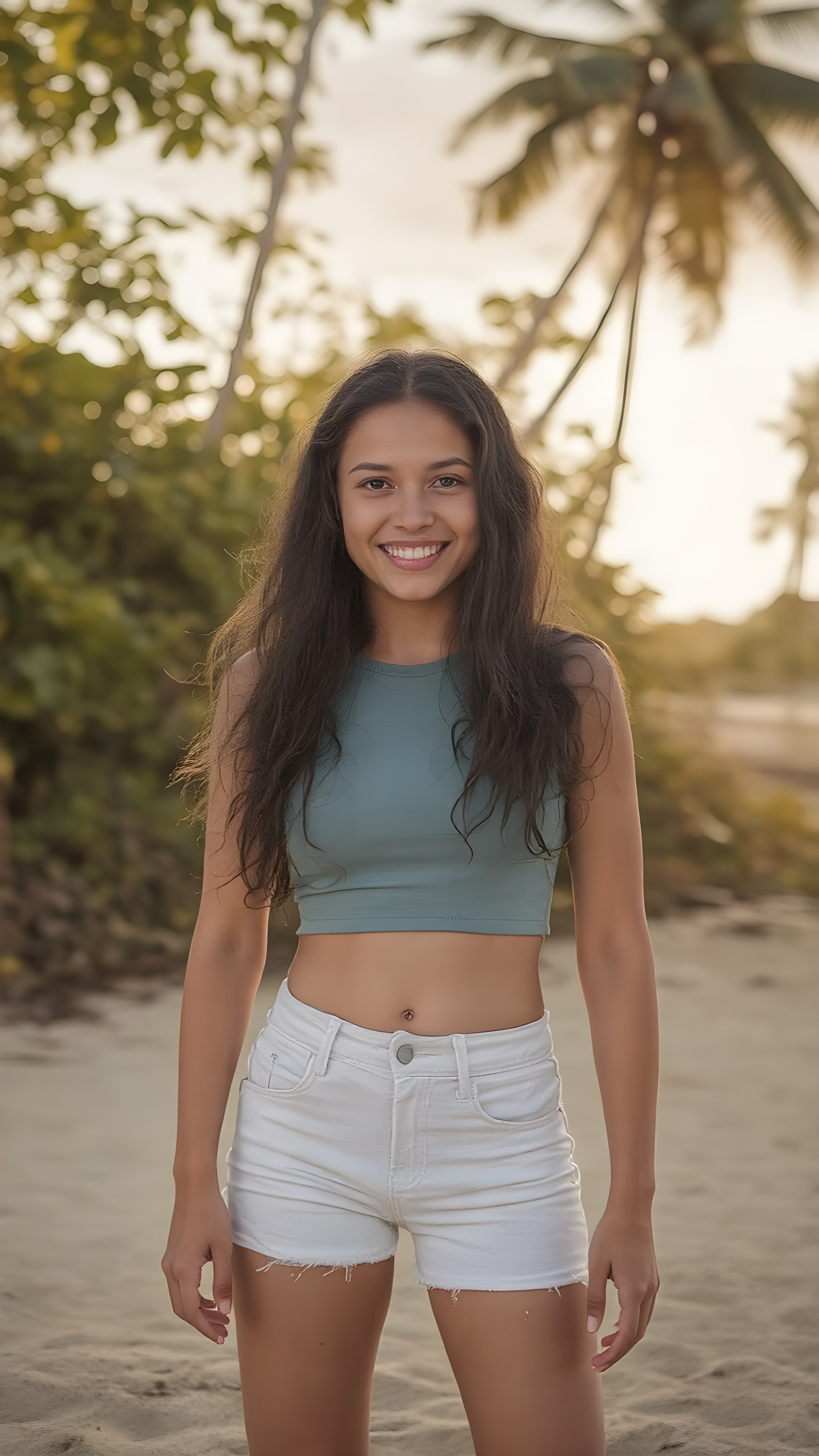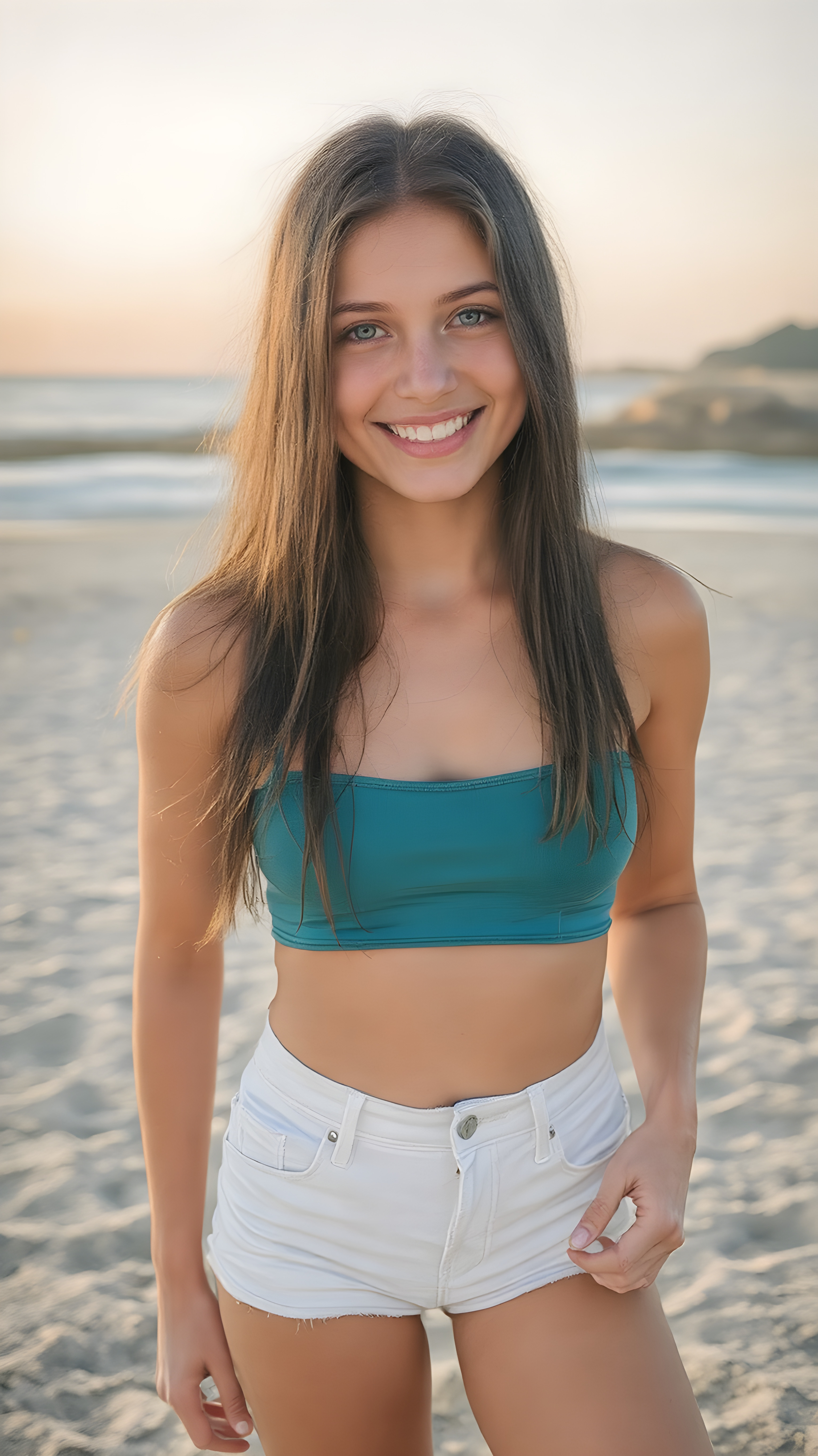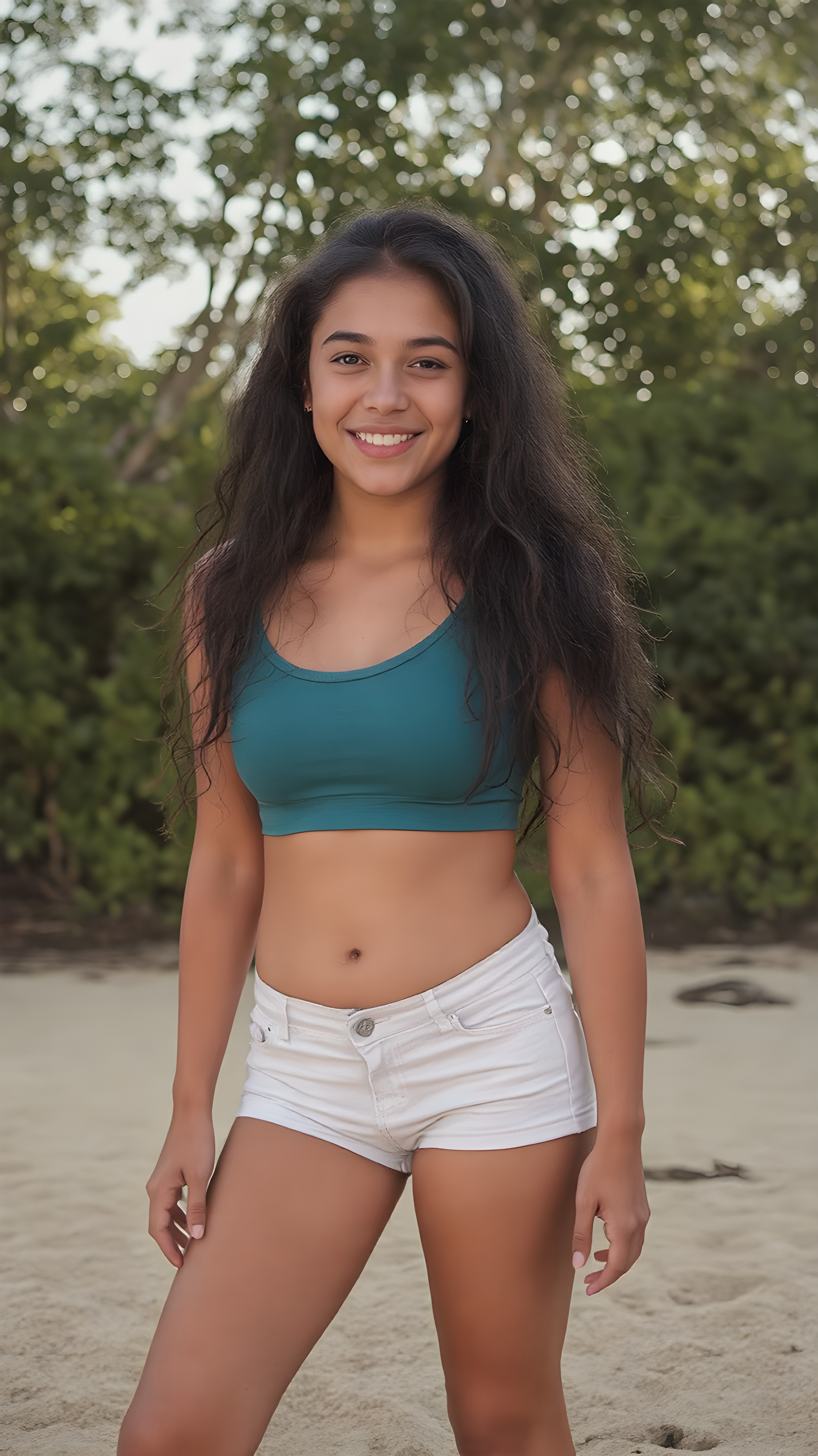 full body shot of a (((very happy teen girl))) with warm, sun-kissed skin and long, softly curled ((black hair)), wearing a tight-fitting, short ((teal top)) and (tight (white denim jean shorts)), posed confidently on a (sandy beach) under a (softly glowing (sky))