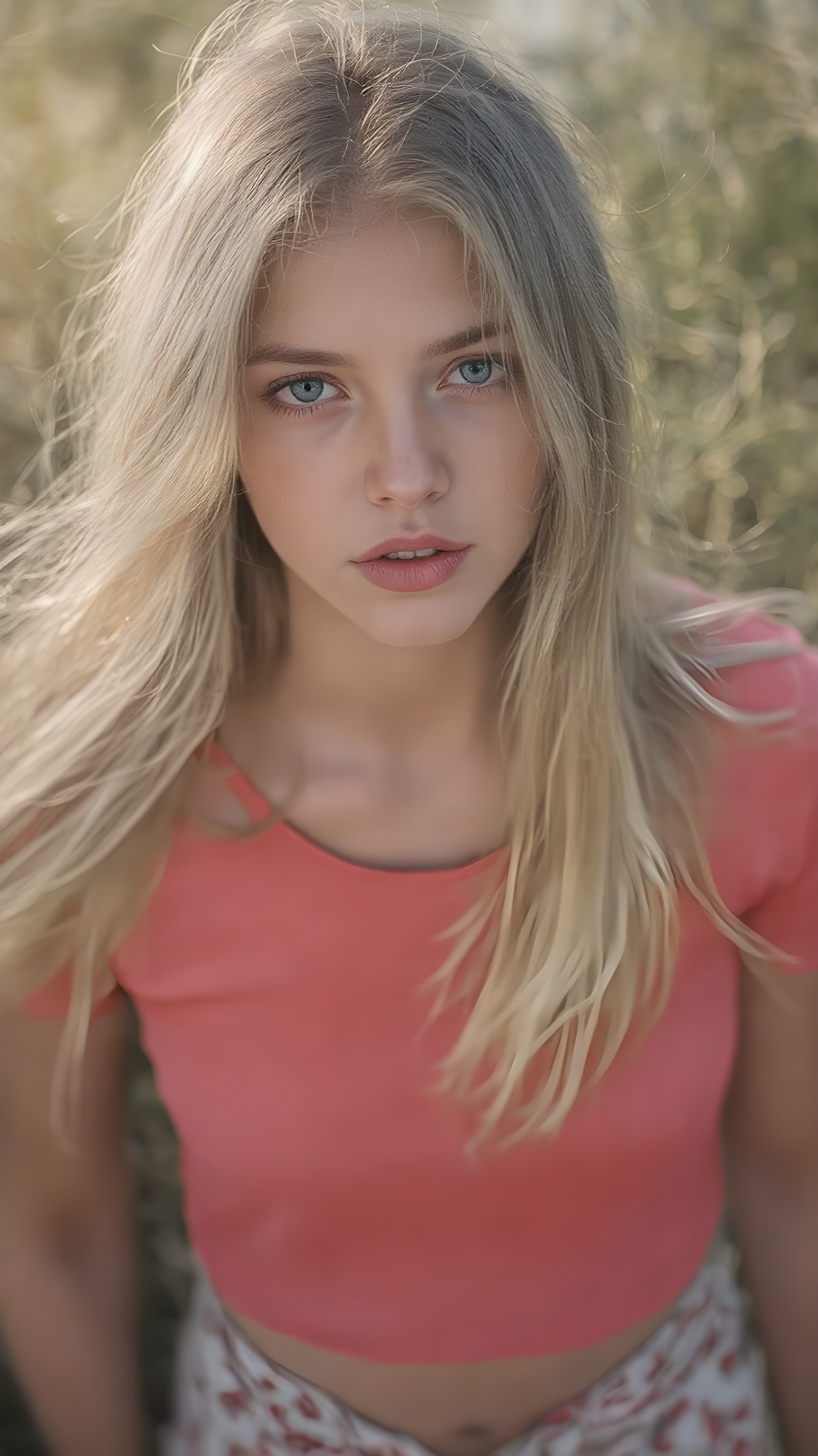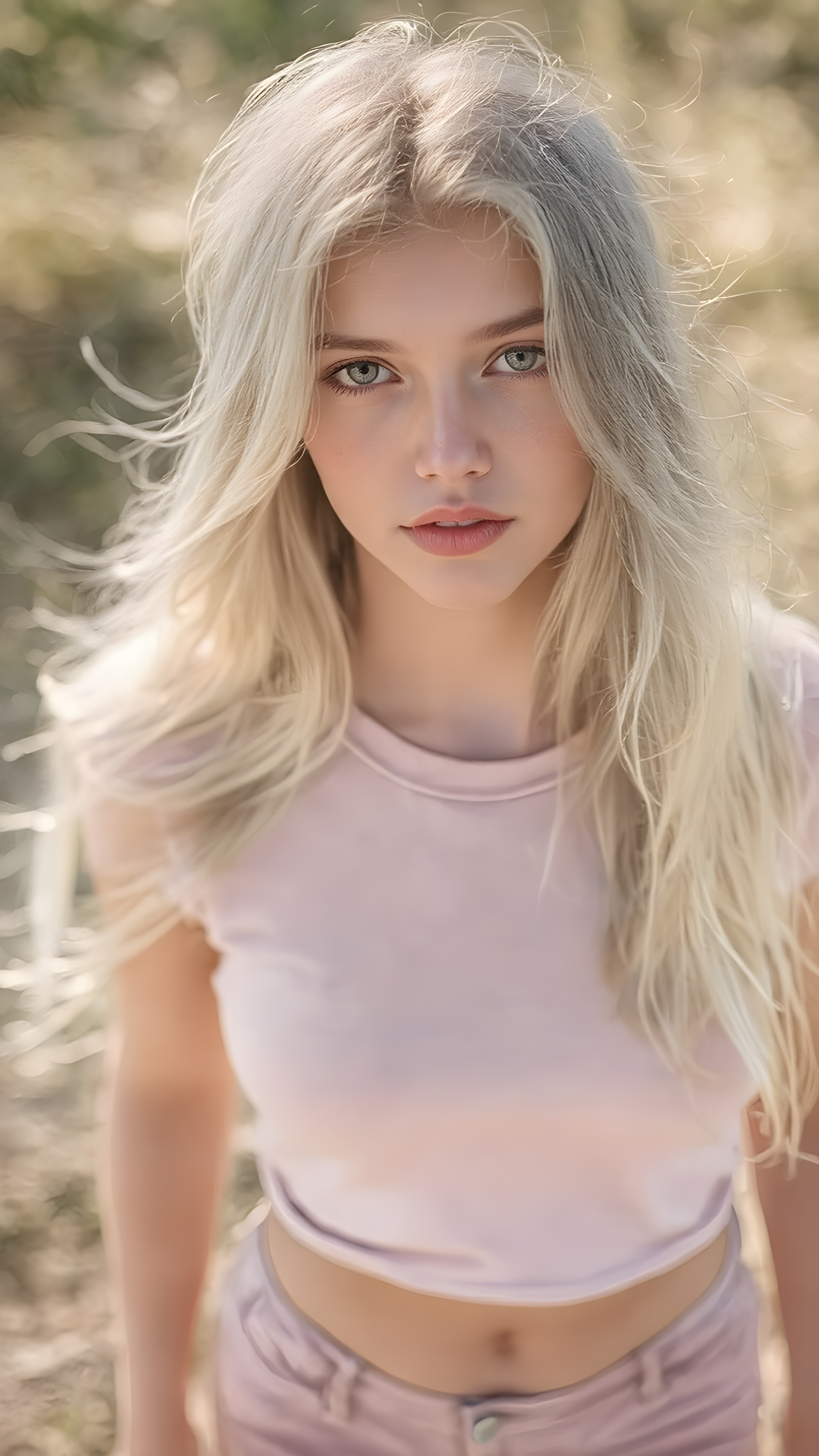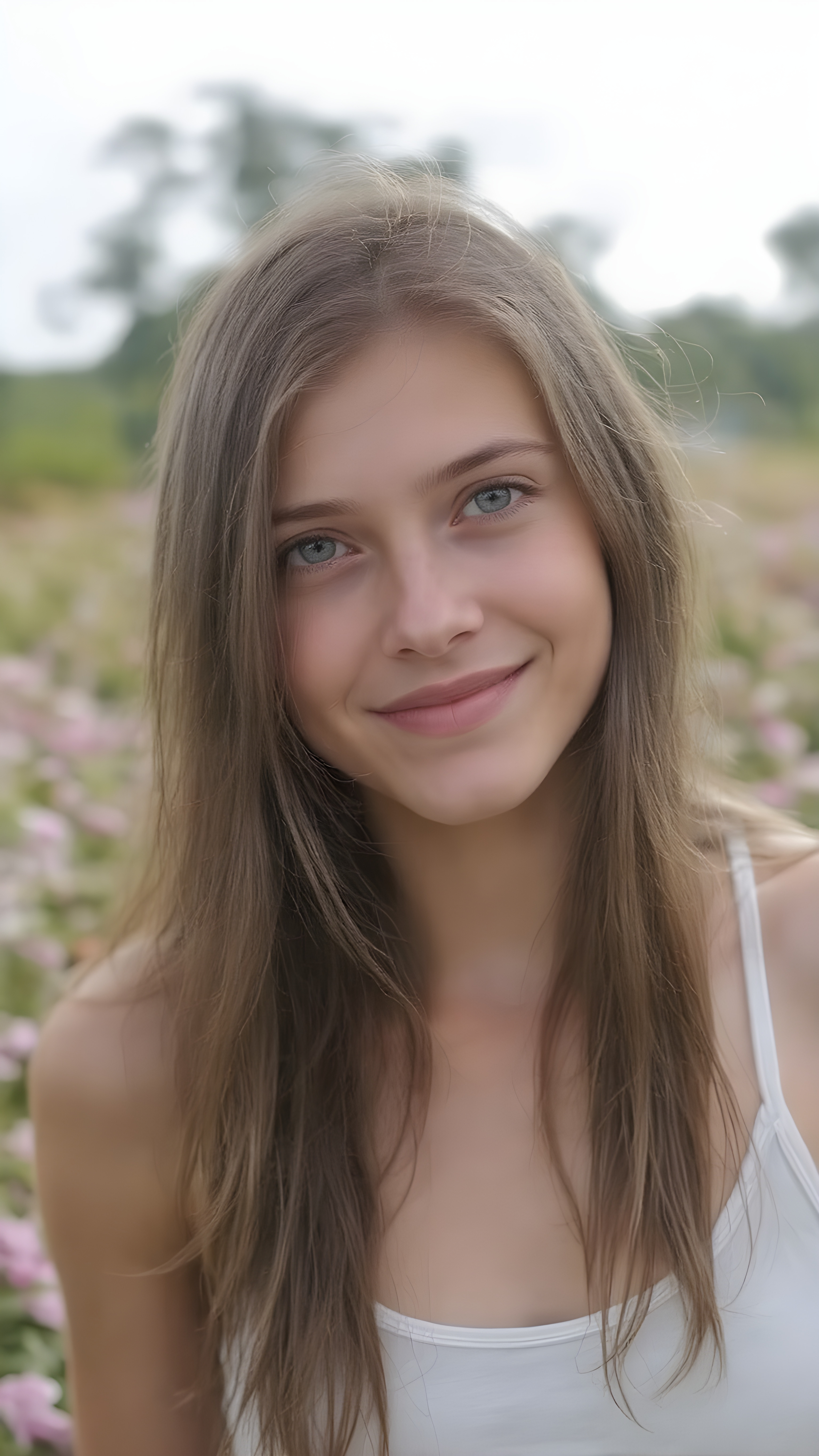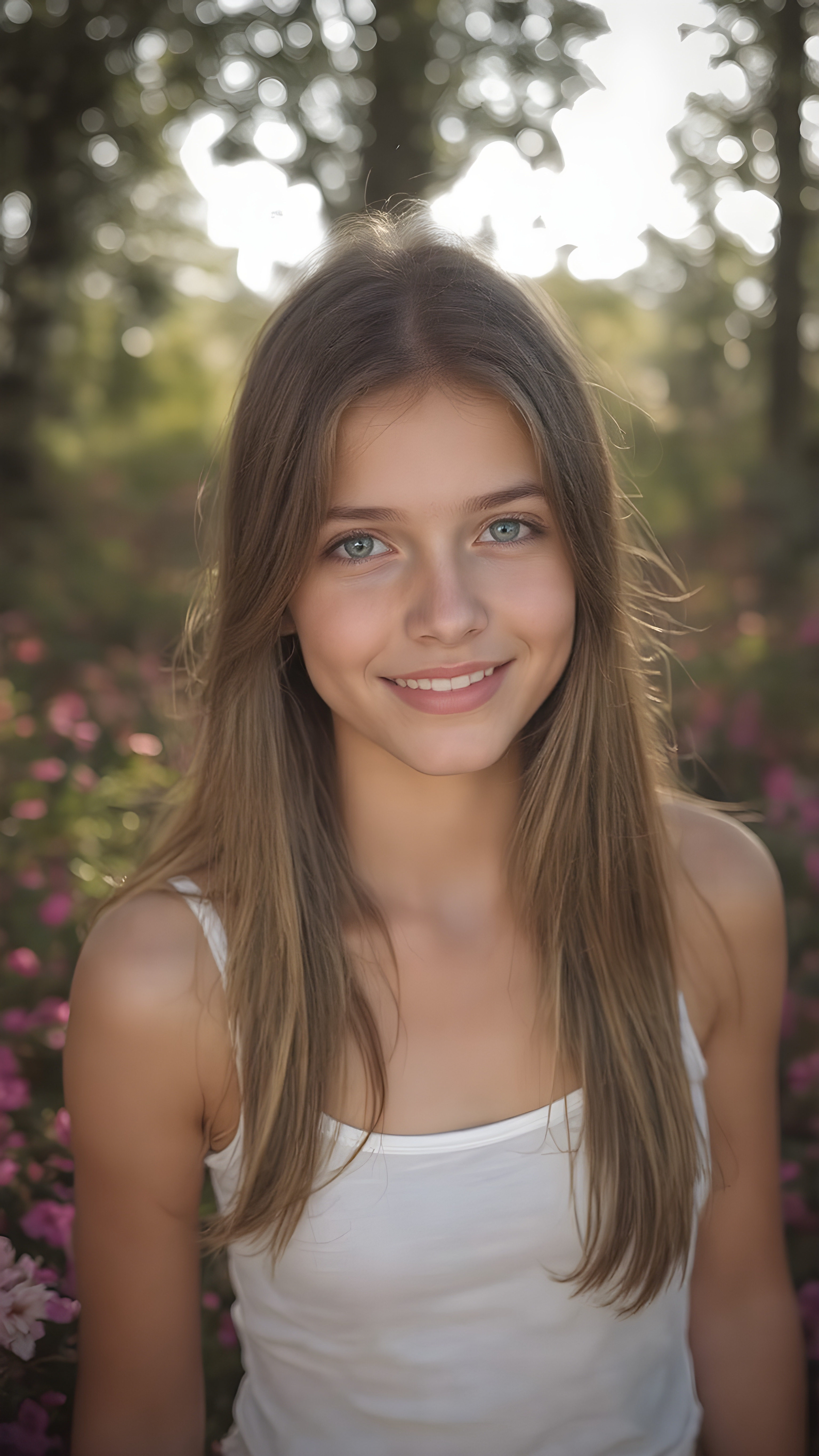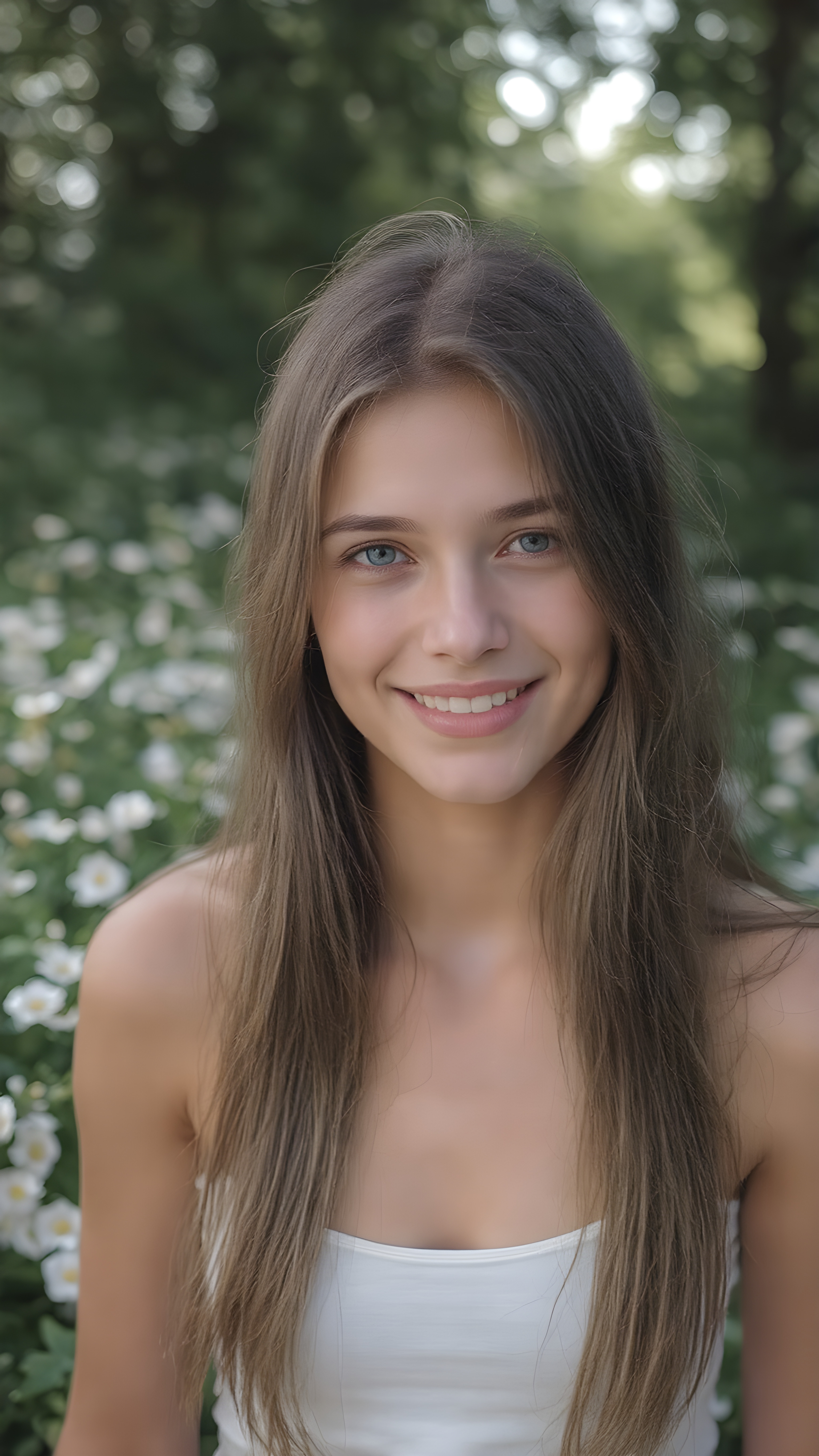 ultra-realistic portrait of a smiling teenage girl, long brown straight soft hair, green eyes, light freckles, wearing a white lifted sport spaghetti tank top, standing in a blooming flower field, soft natural sunlight, 4k, shallow depth of field