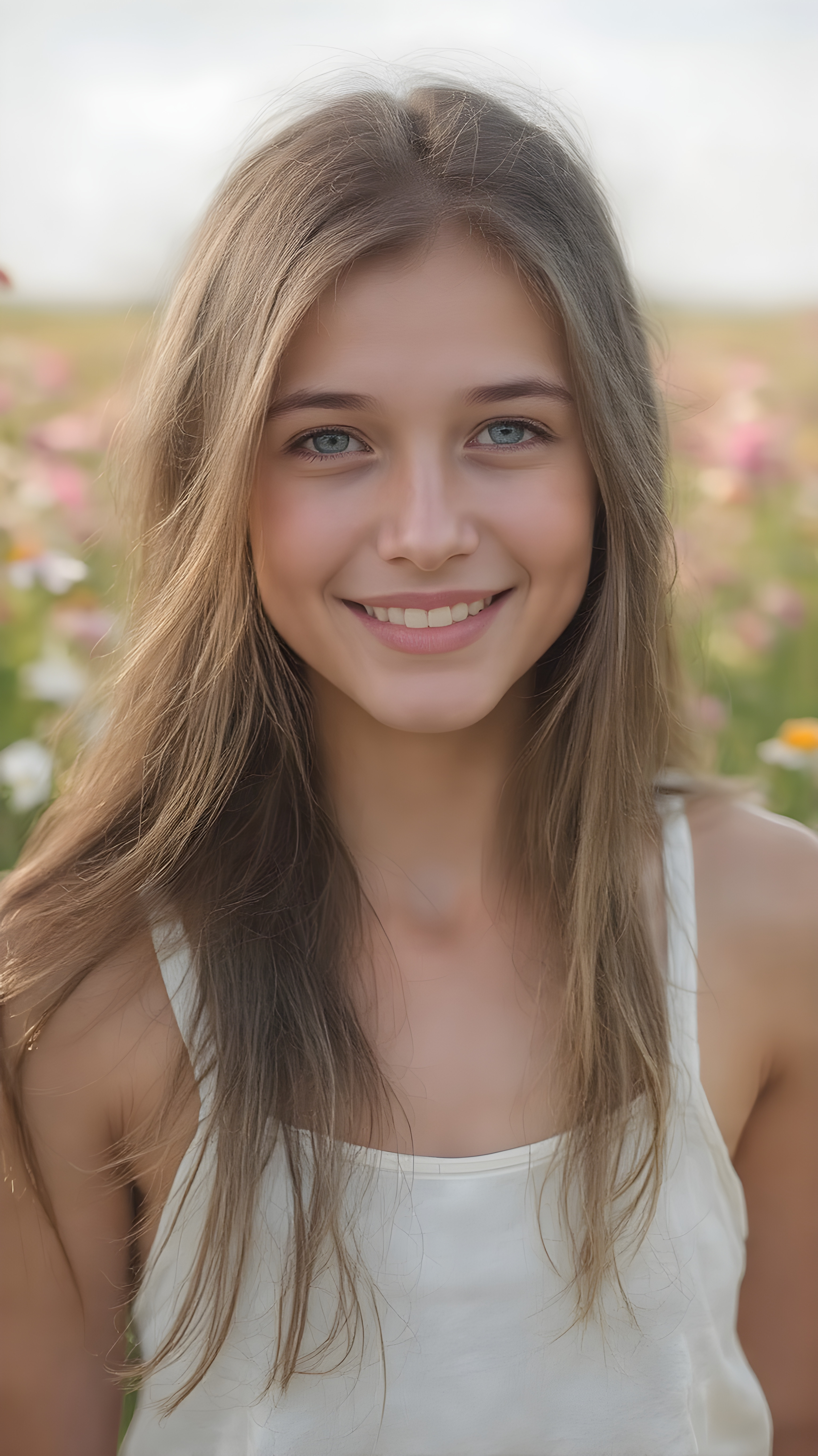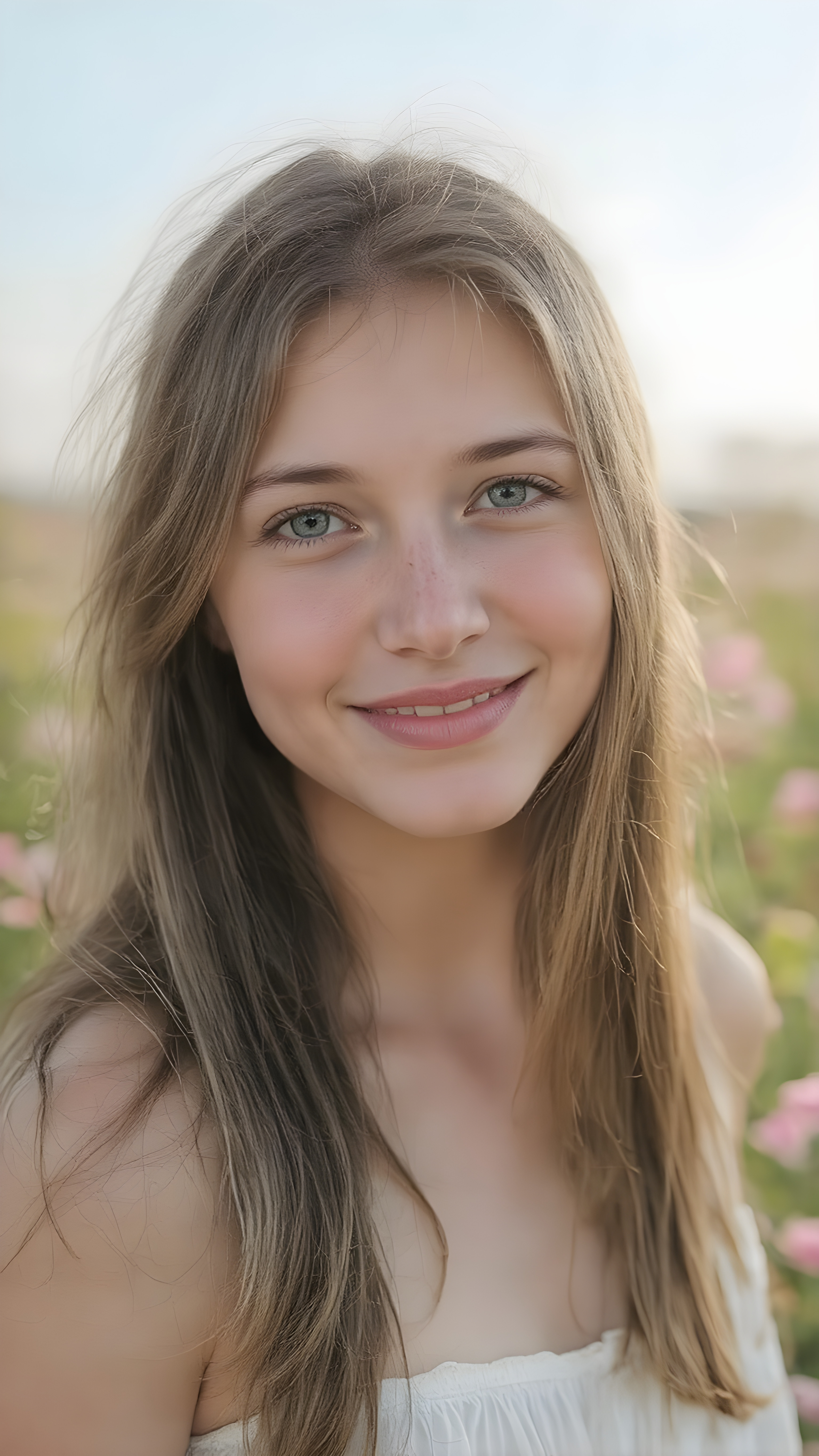 ultra-realistic portrait of a smiling teenage girl, long brown hair, green eyes, light freckles, wearing a white summer dress, standing in a blooming flower field, soft natural sunlight, 4k, shallow depth of field