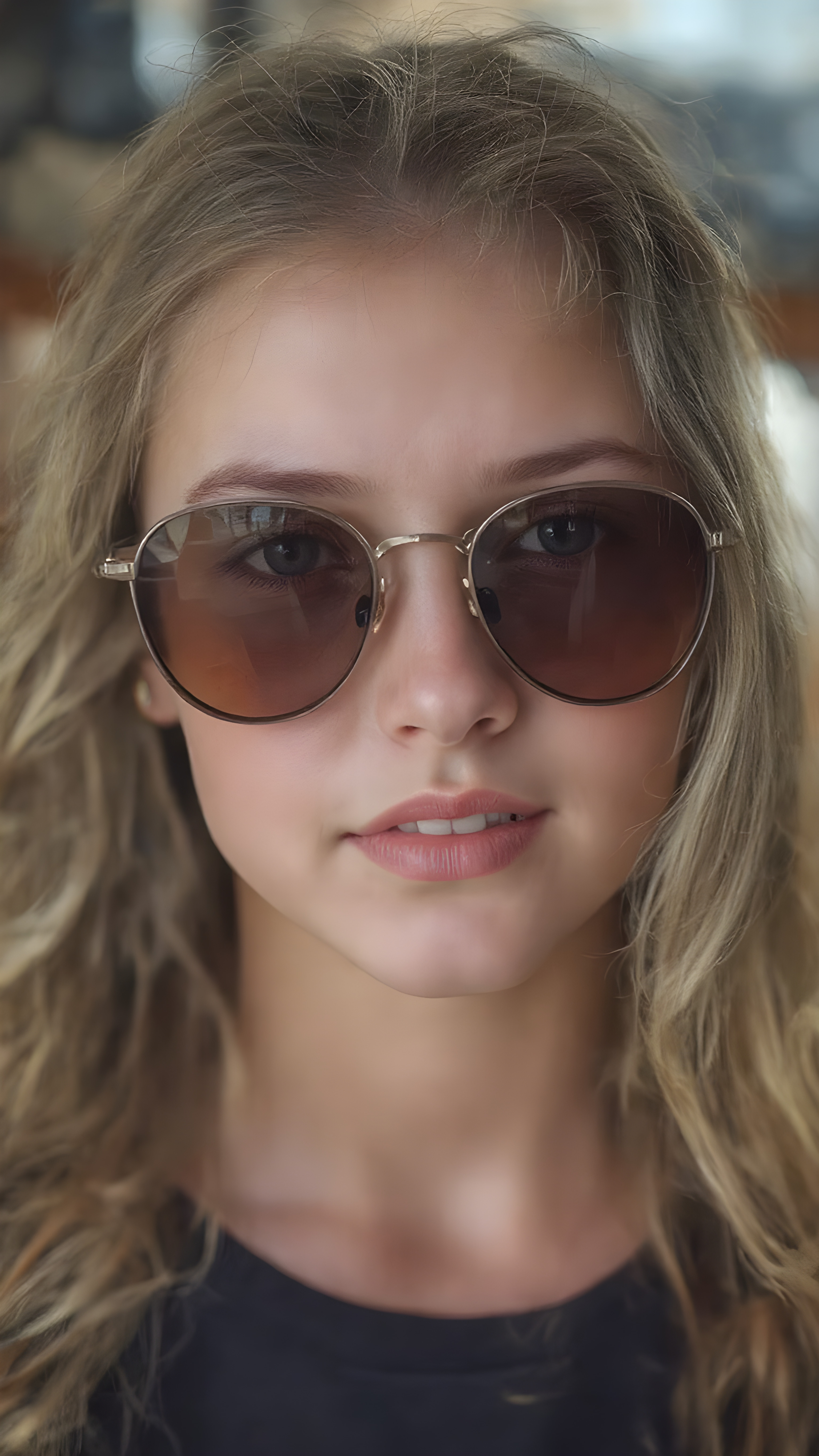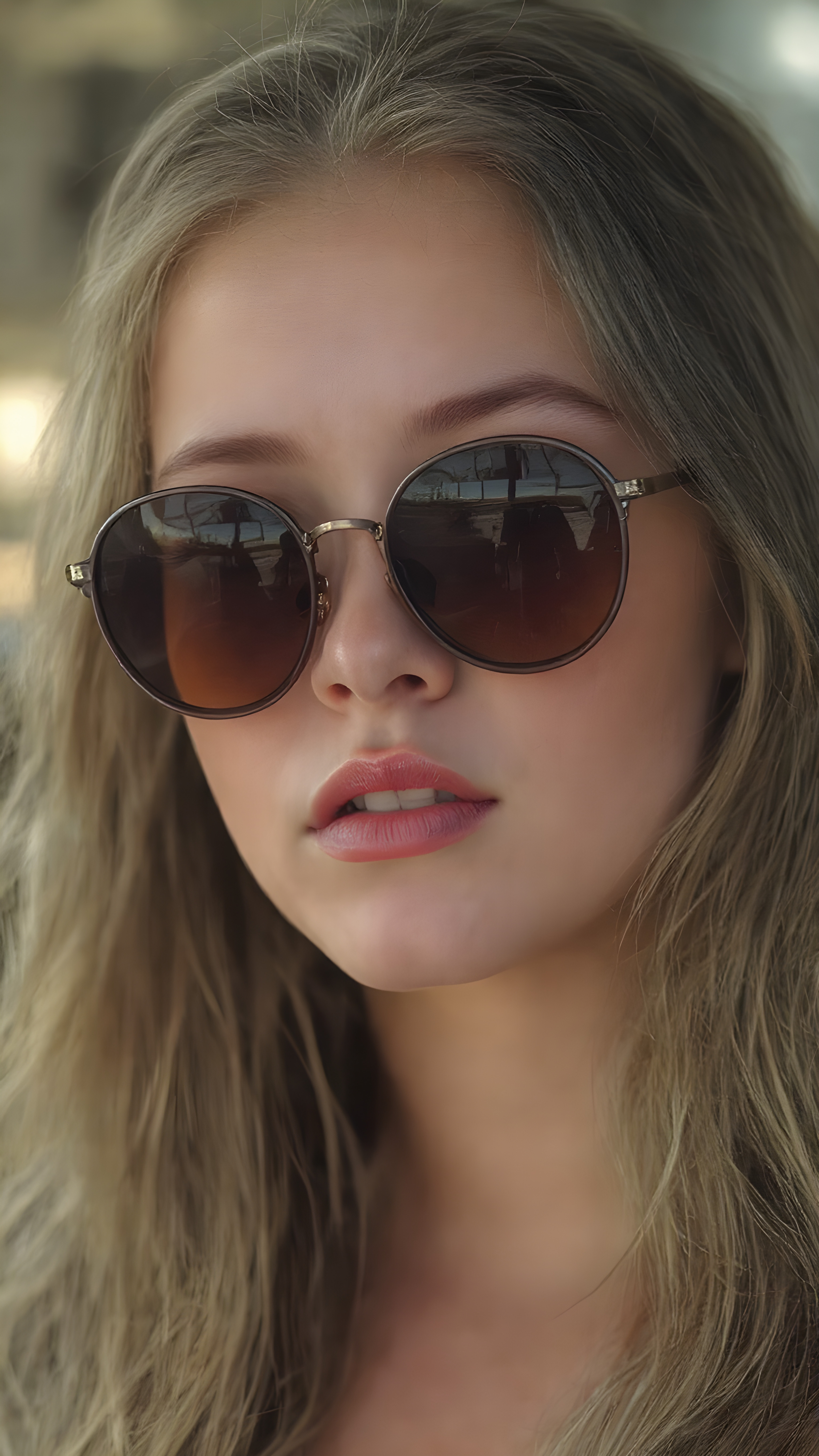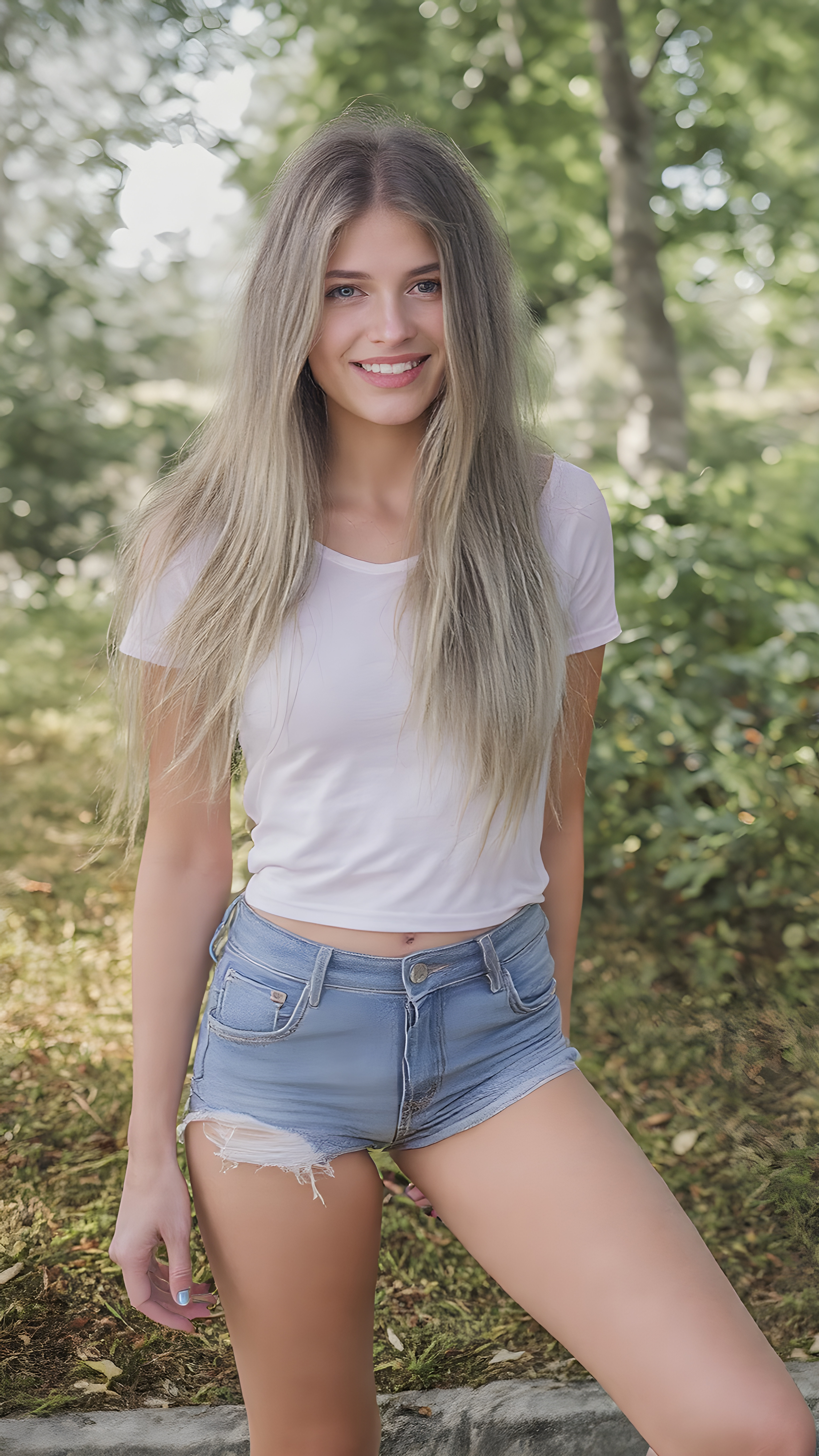 A (((vivid full body))) photo of an incredibly attractive, (((stunning cute girl))) with long, flowing silky blonde hair and (fit, toned legs), dressed in a very thin tight (white T-shirt) and (tattered denim shorts) that cling to her body in a playful yet sophisticated pose. Her smile is warm and inviting. She’s posed against a backdrop of a lush, vivid city park