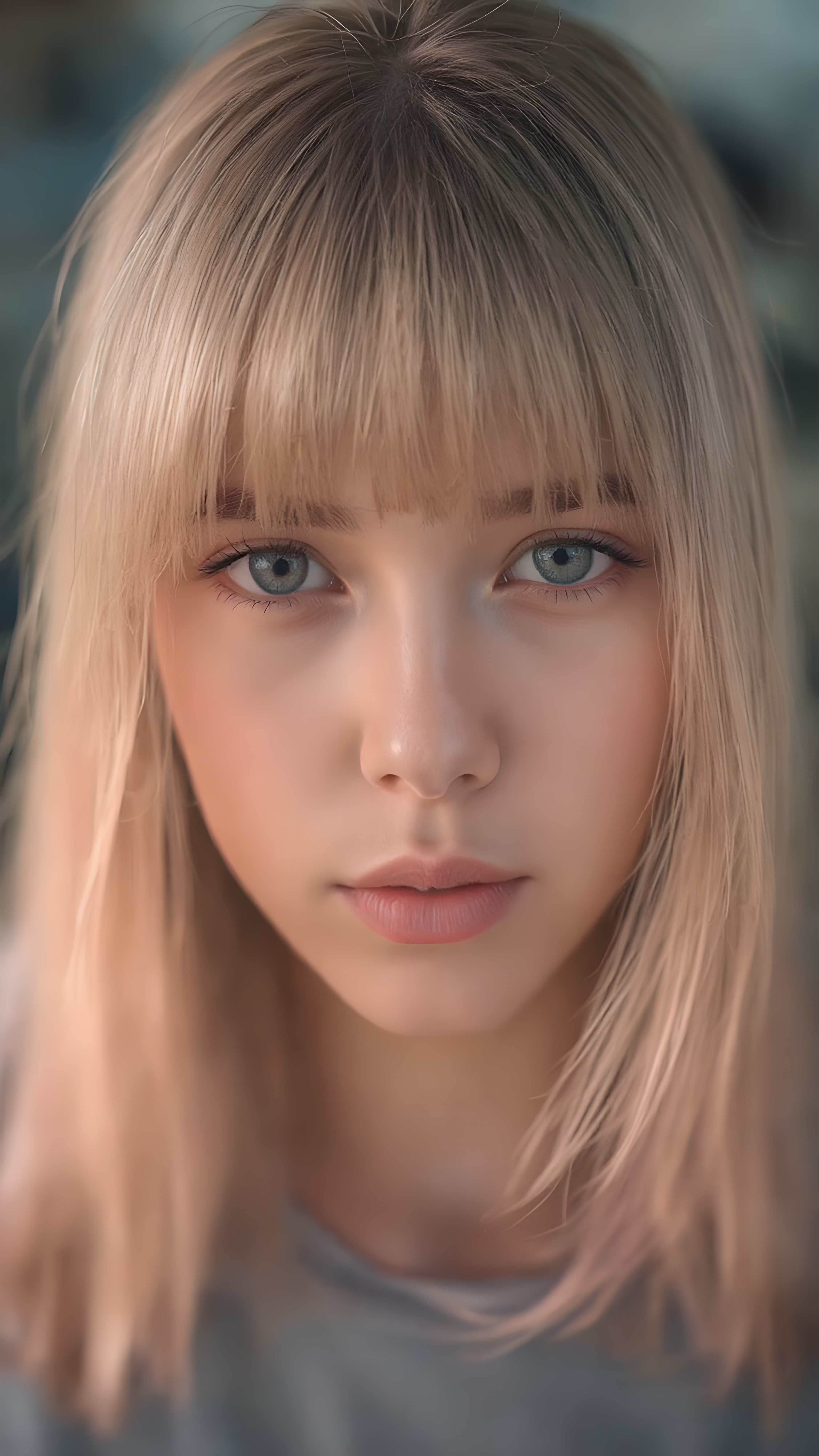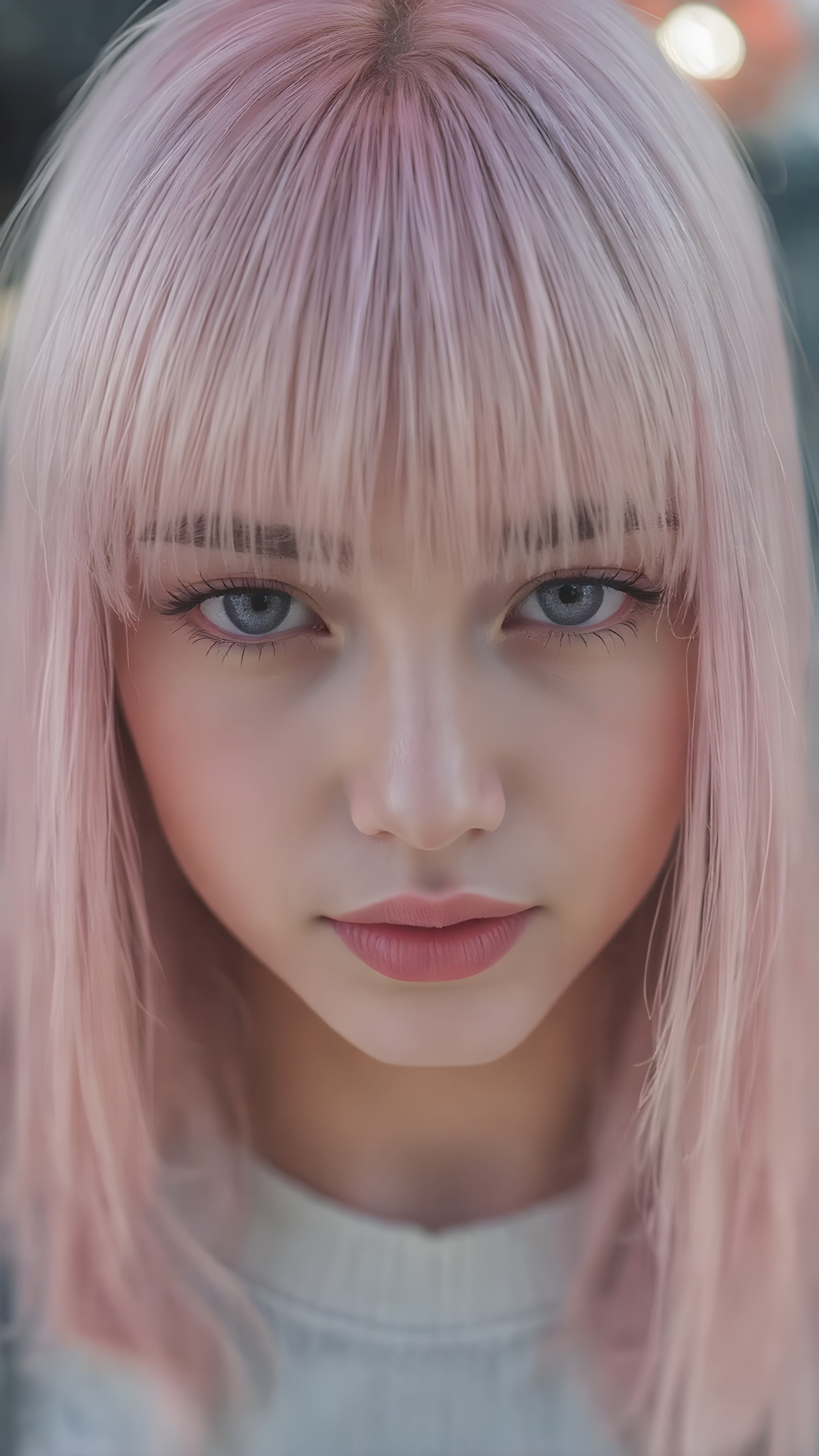 a detailed and realistic young woman with straight pink soft hair, the hair frame her round face, bangs, cute, gorgeous, stunning