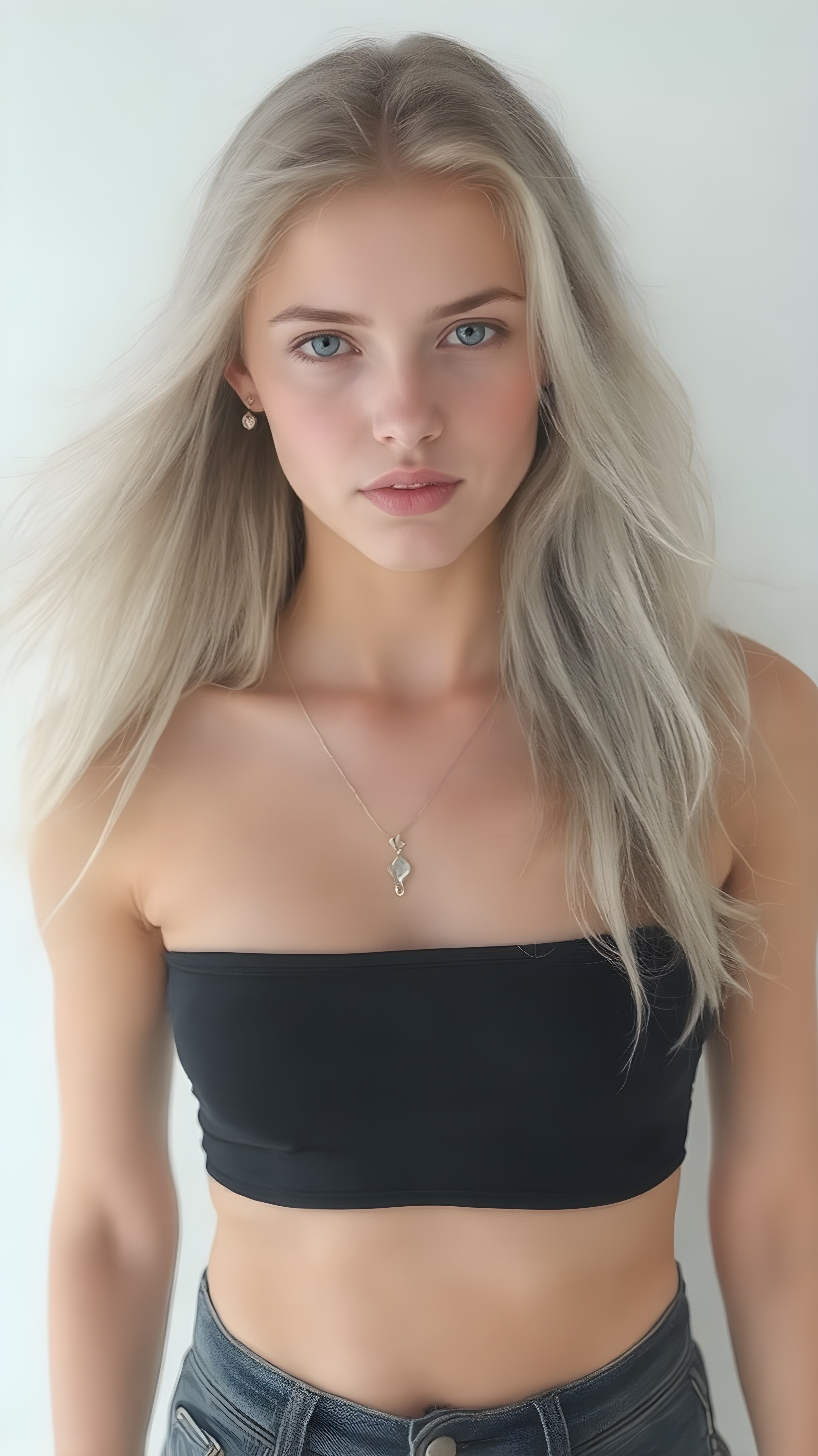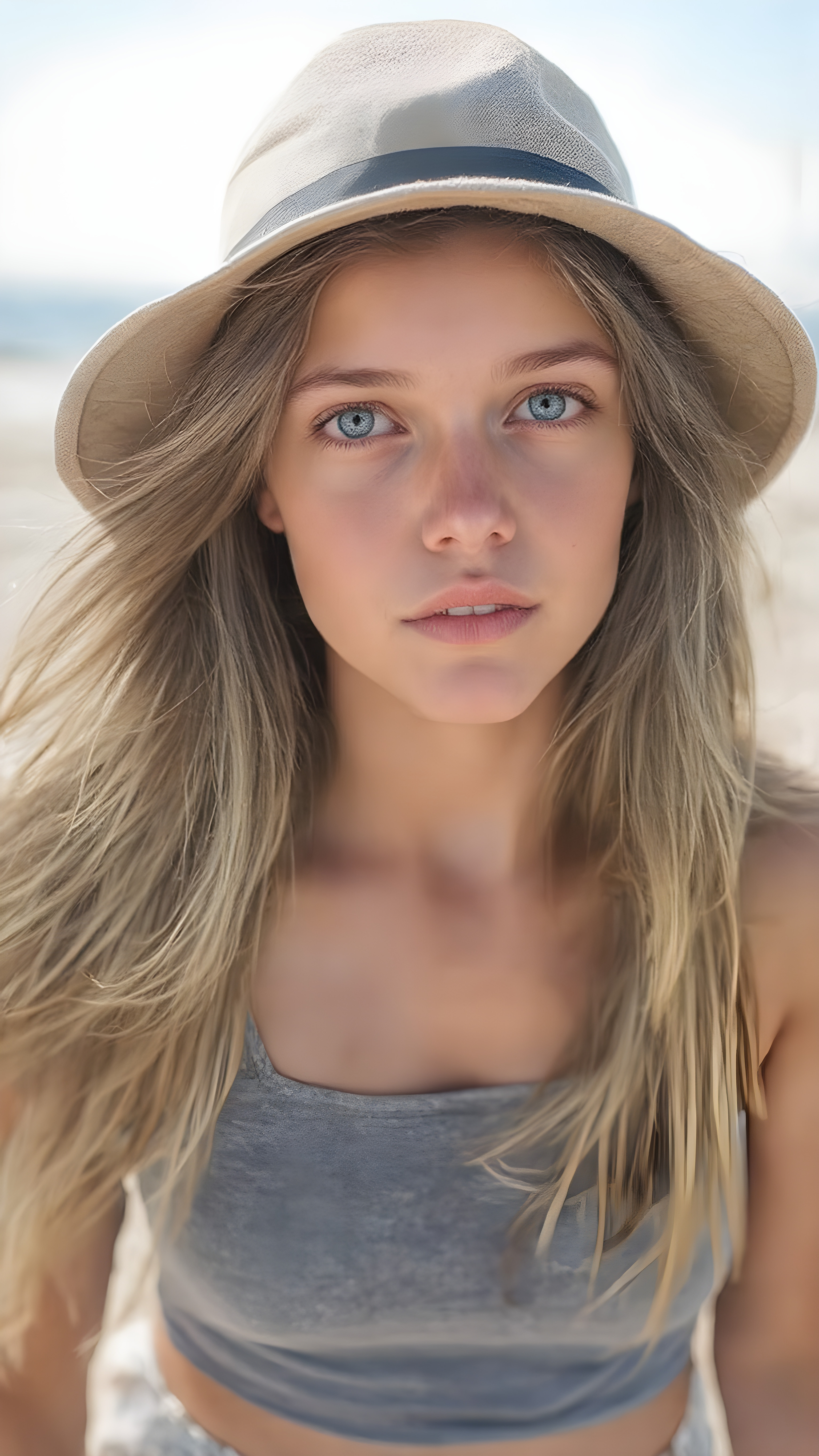 A (((beautiful girl with exceptionally long, thick, straight blond brown hair, right and left the same length))), wearing (((light denim shorts, grey cropped tank top))), a ((sunhat))) that accentuates her (((perfectly curved figure))), with (pale skin) and (brightly blue eyes) that exude an air of youthful confidence and whimsy, complemented by (((white skin with barely visible freckles))), and (((full, defined lips))) that add a playful touch to her face. Her (((eyes are a captivating shade of blue))), yet they remain distinctly casual, with (long, straight wavy) that frame her face in a warm, inviting glow. The scene is a summer day at the beach, with the sun’s rays reaching out towards her, reflecting off her hair and skin for a serene, sun-kissed glow. She has (((the most perfectly straight, level white teeth in the world))) that add to her overall beauty and complement her youthful appearance