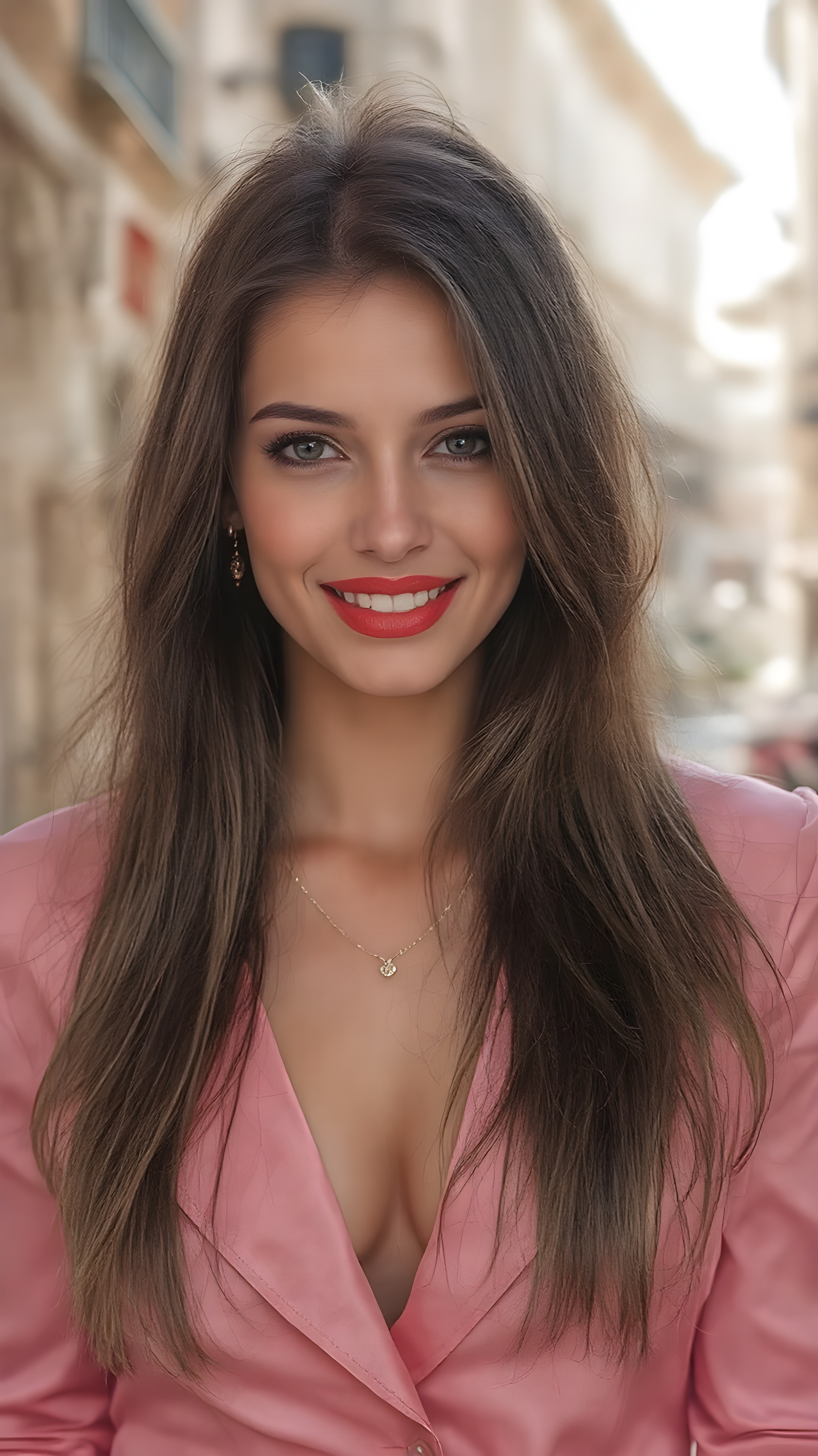 A (((full body shot))) of a (((beautiful girl))), with luxuriously flowing (((very long, straight light brown hair))), (intricate details around her eyes) that capture the light in a (dazzlingly bright and inviting glow), dressed in a ((modern, seductive pink silk blazer)), (highly detailed, seductive poses) that convey a sense of (fantasy sophistication). Her smile is wide and seductive, with perfectly (white teeth), and her lips are full and painted in (bright red lipstick). She wears elegant jewelry that catches the light, accessorizing in a way that complements her overall look. Her dress is made of (soft silk, in a luxurious round neckline and slit details) that give off a sense of (seduction). The backdrop is a beautiful, sunny street in Europe, where the architecture is ((intricate and elegant))