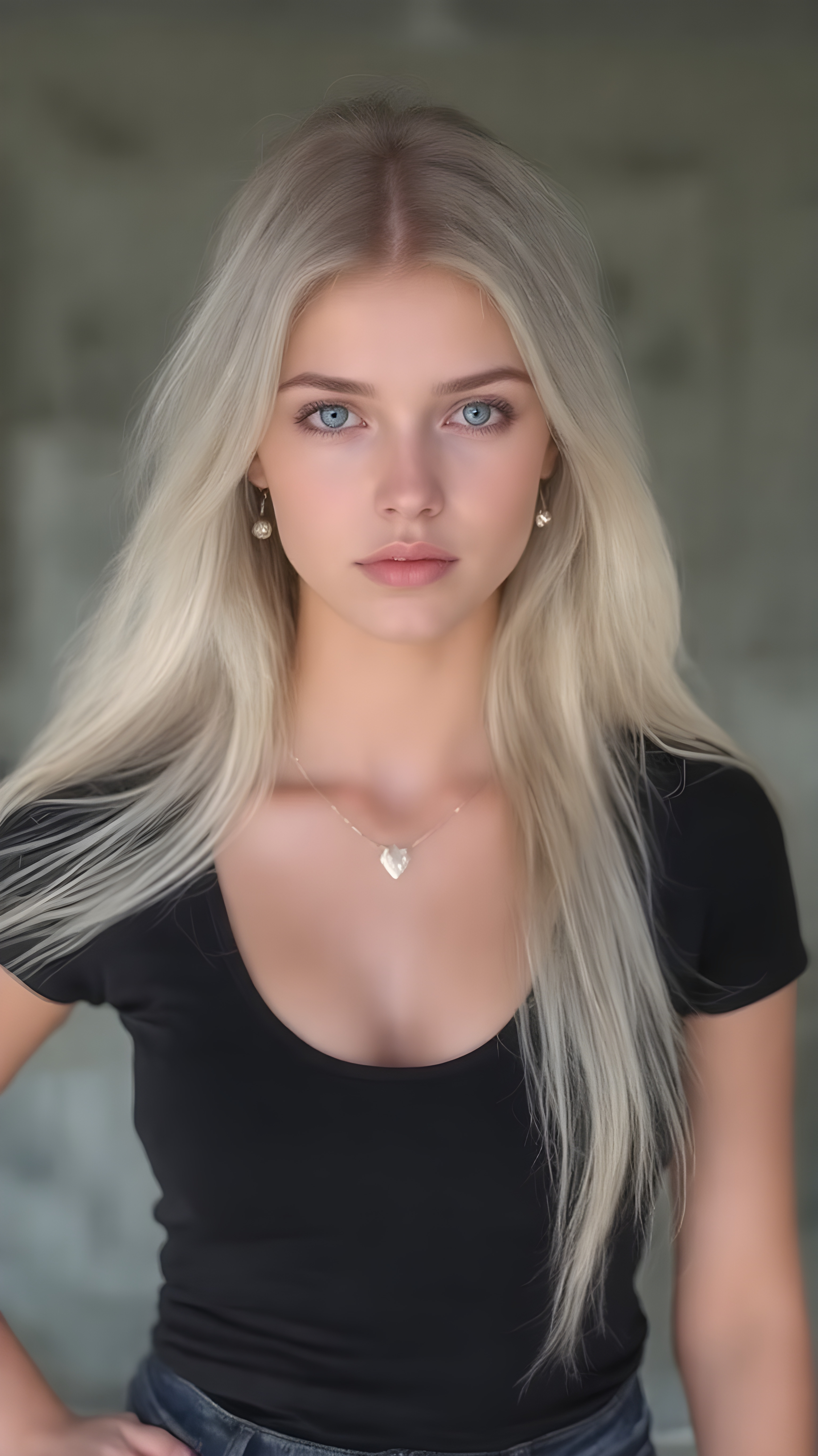 show me the cutest young happiest teen girl in the world, upper body portrait, outdoor setting, long straight silky super soft amber hair, bangs, white plain t-shirt, female fit body, detailed and realistic
