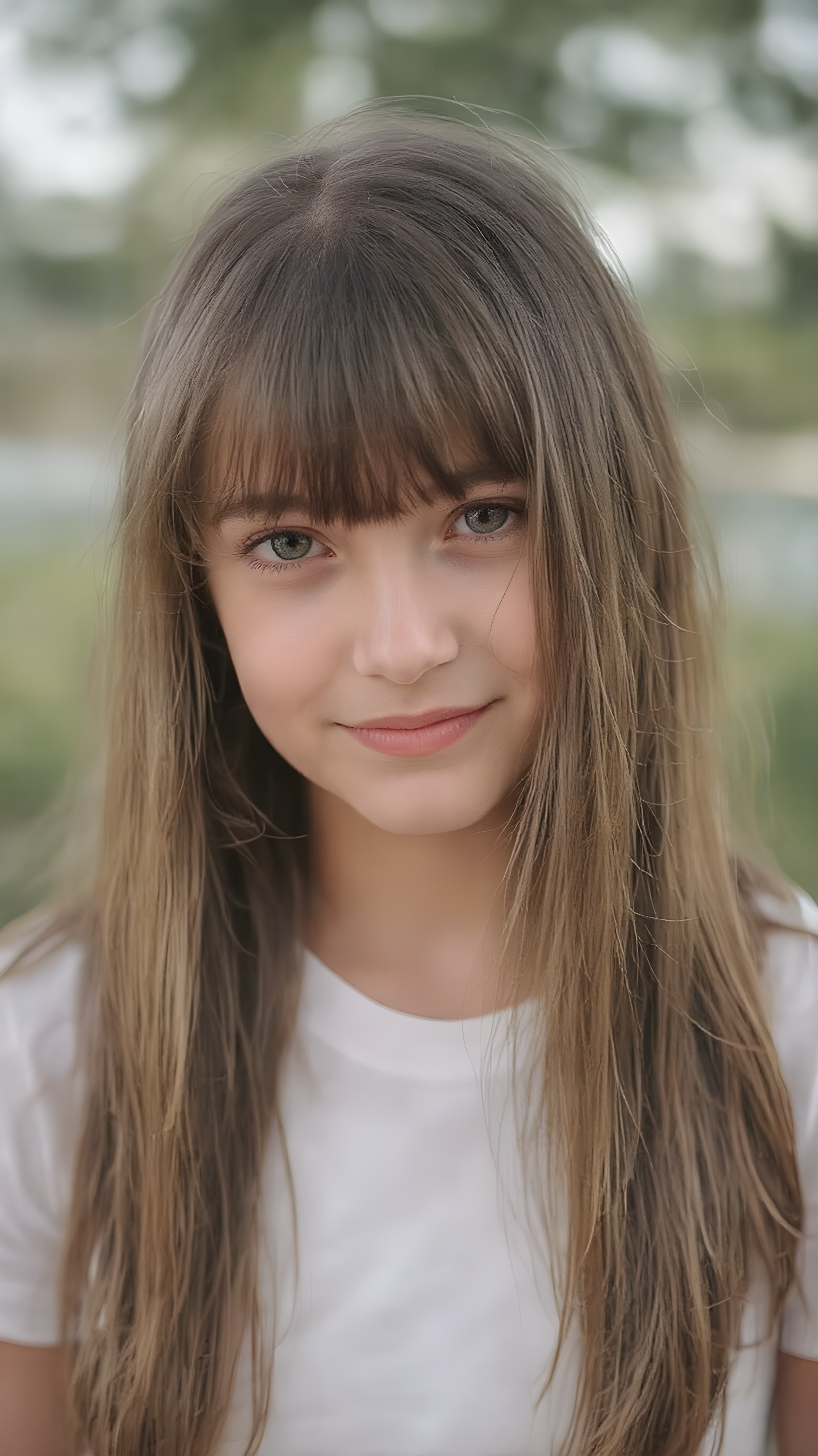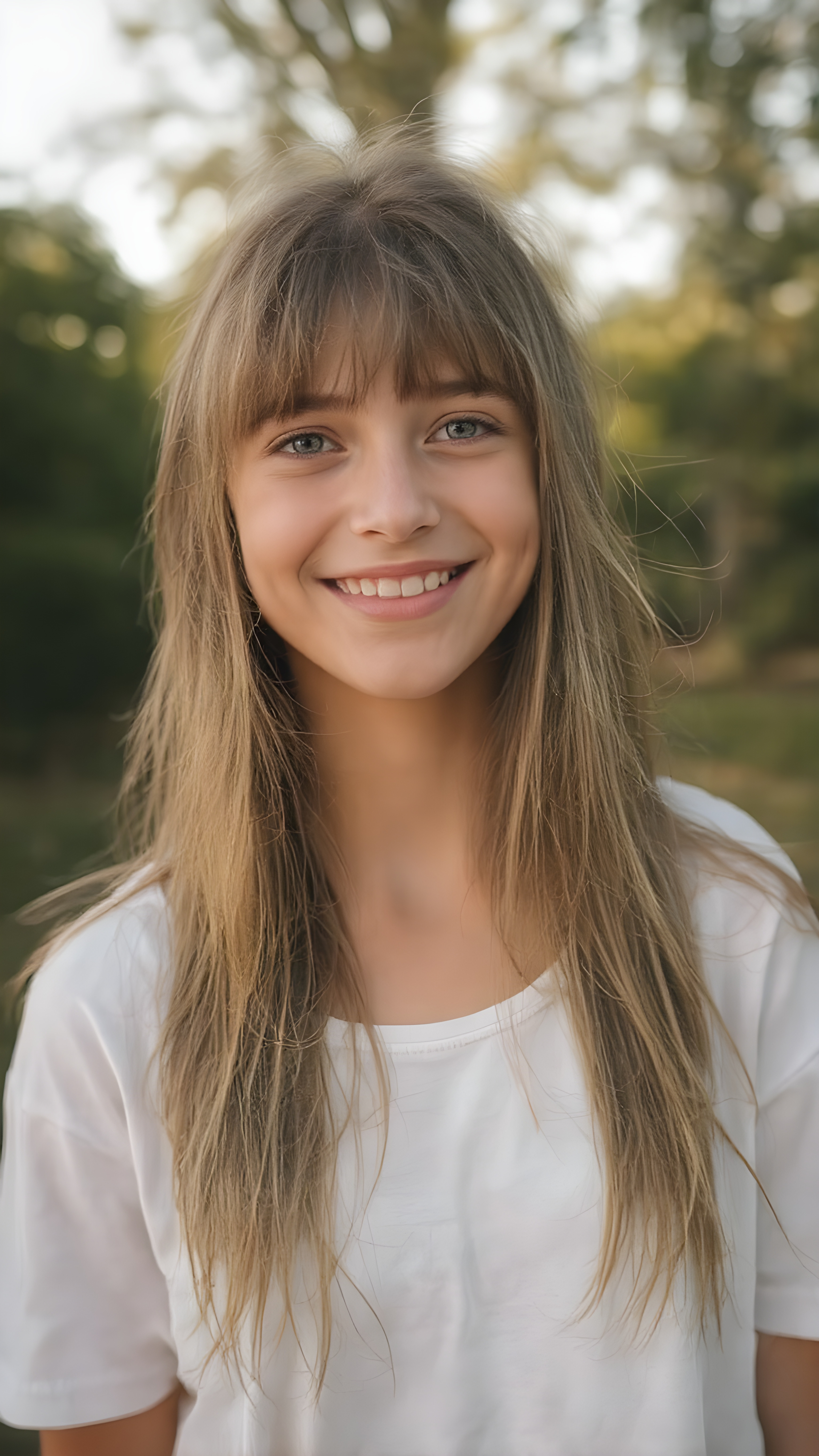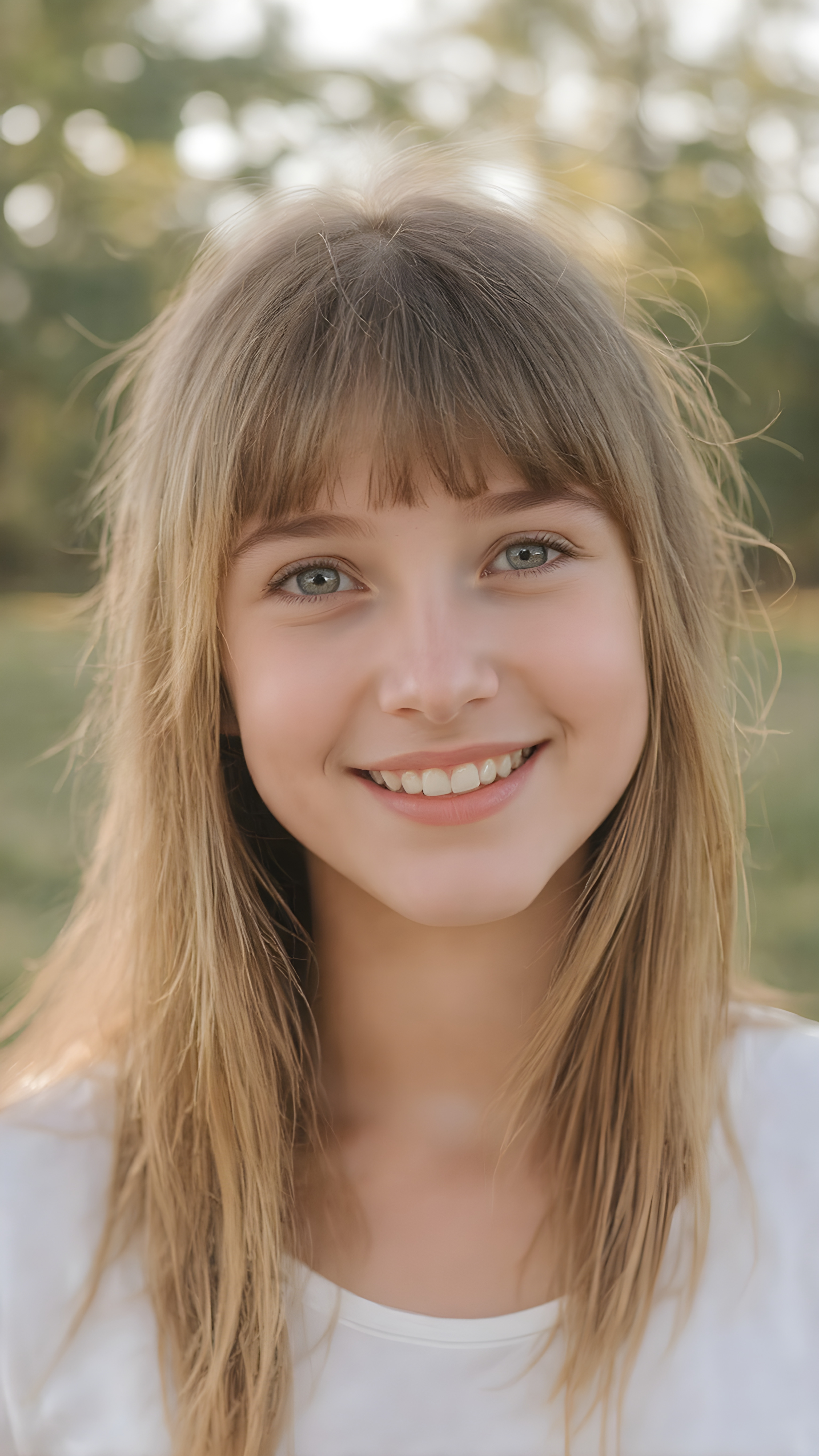 beautiful young happy teen girl, with radiant eyes and the cutest smile in the world, sporting long straight and thick silky soft light amber hair, bangs, and white clothing adorned with nothing but a delicate and super soft white t-shirt. The scene captures her upper body in a close-up view, emphasizing her youthful features and natural beauty. In a wide open outdoor space with warm and soft lighting, she stands in a serene and happy expression, surrounded by trees and nature’s beauty. Her smile radiates happiness and contentment, perfectly capturing the essence of a joyful moment in a serene natural setting.
