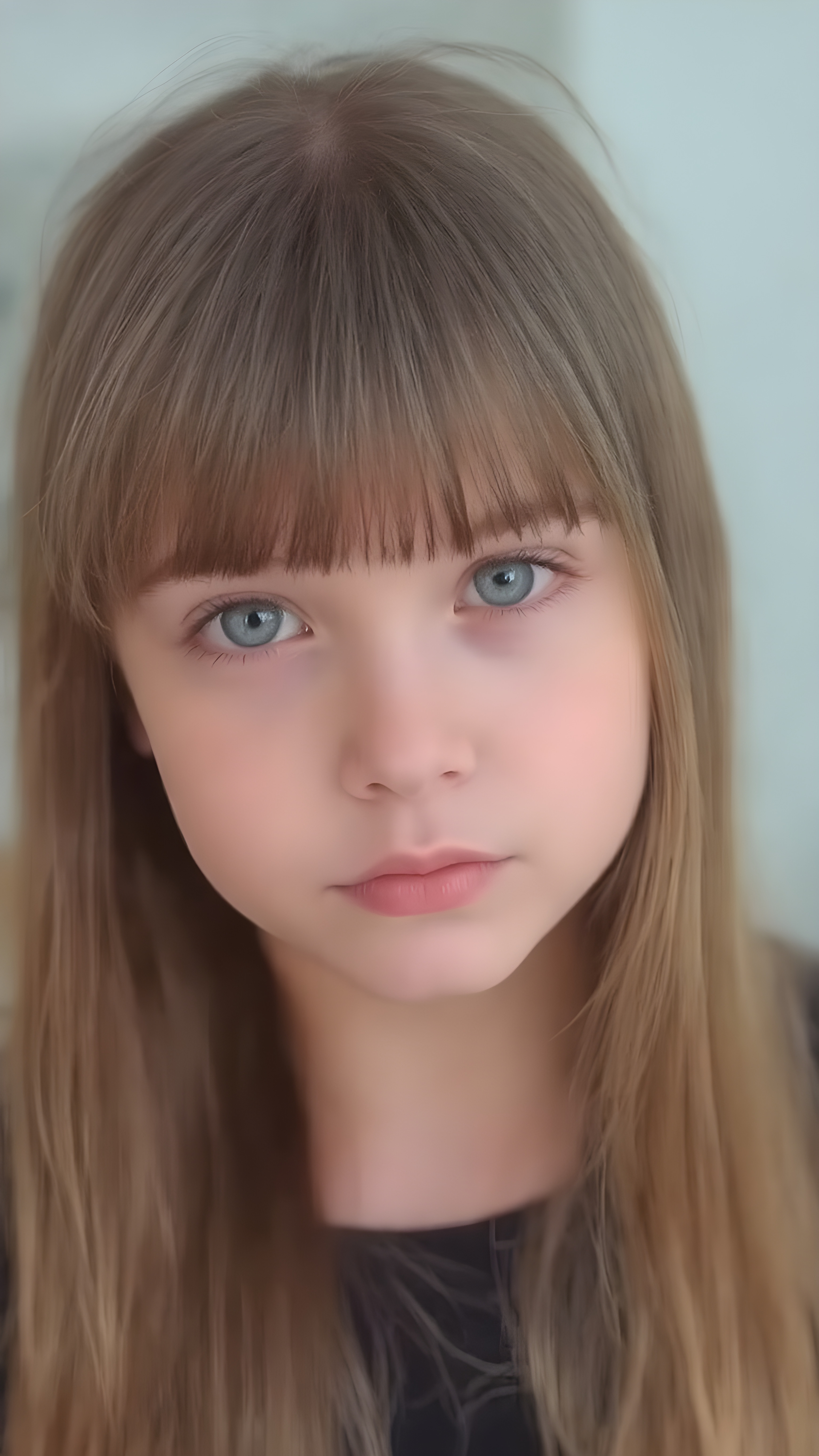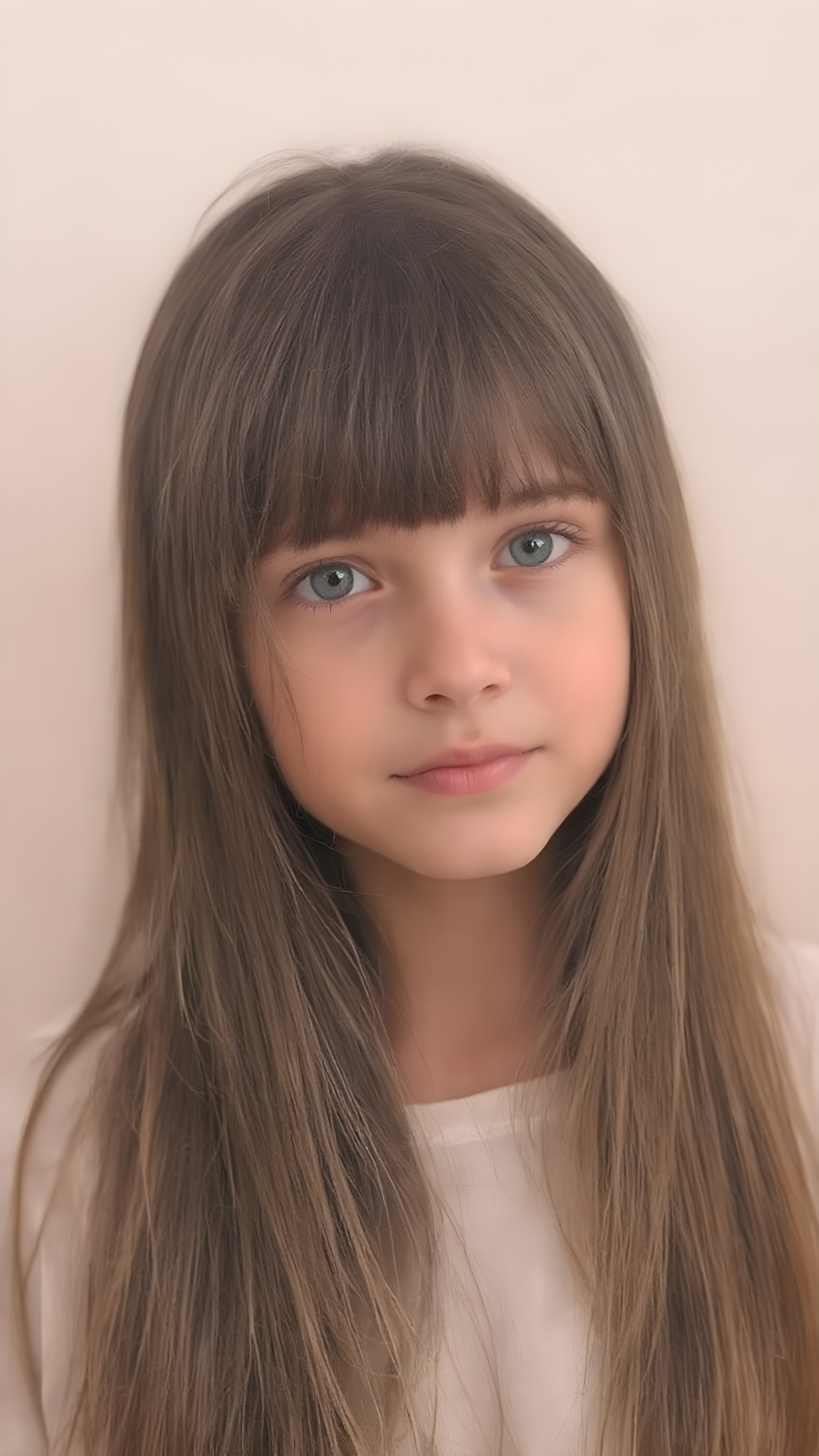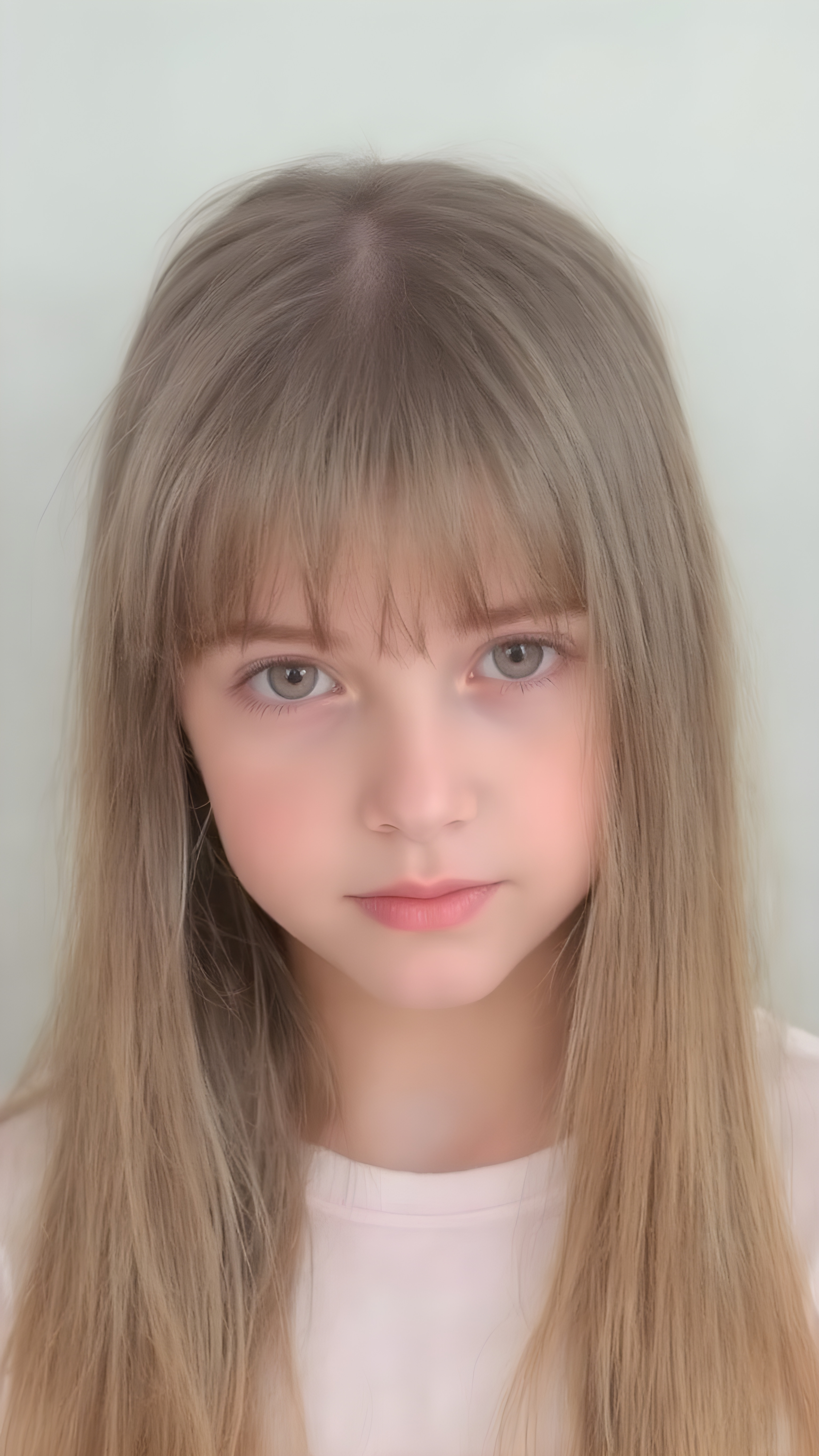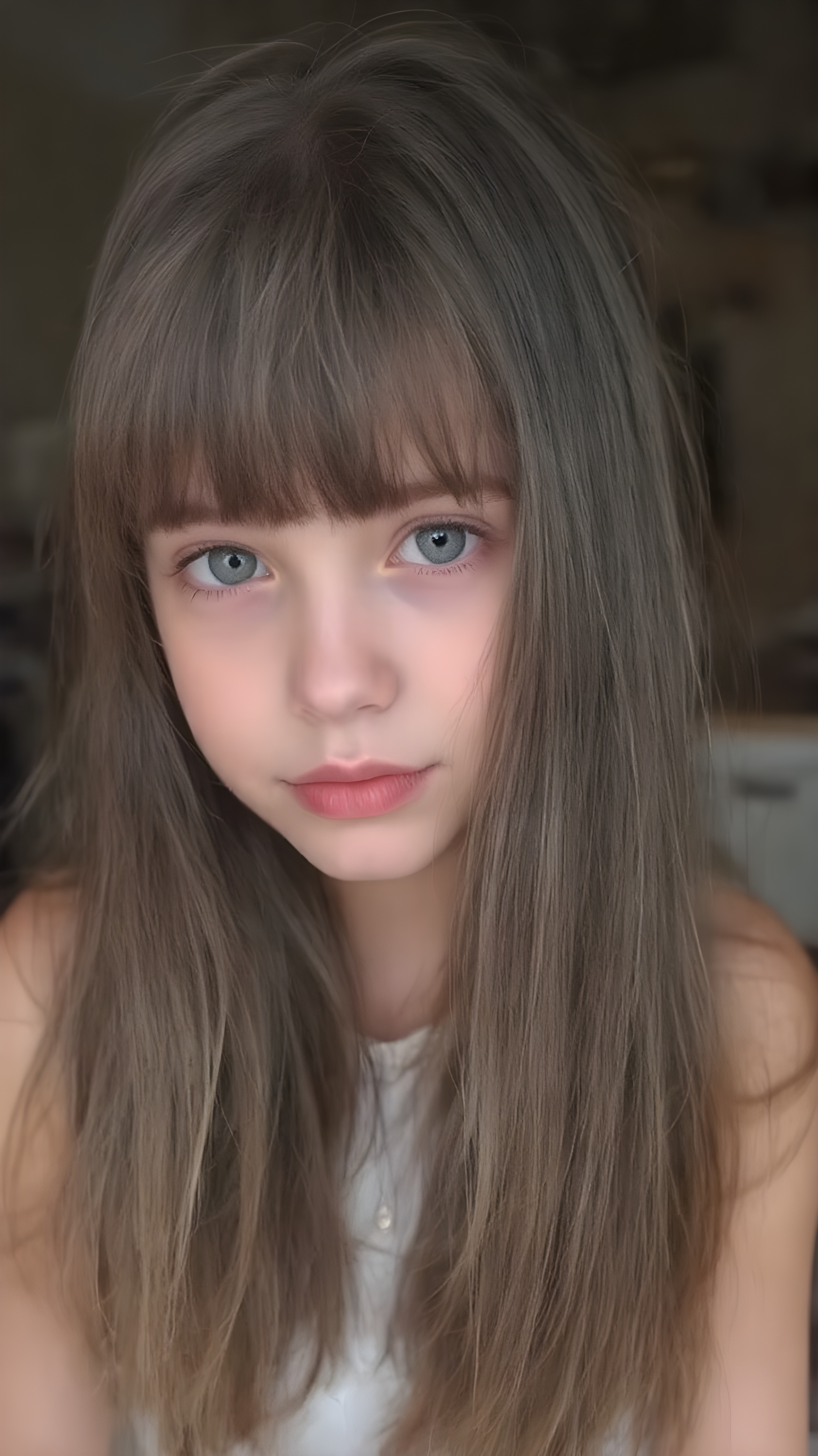 beautiful young happy teen girl, with radiant eyes and the cutest smile in the world, sporting long straight and thick silky soft light amber hair, bangs, and white clothing adorned with nothing but a delicate and super soft white t-shirt. The scene captures her upper body in a close-up view, emphasizing her youthful features and natural beauty. In a wide open outdoor space with warm and soft lighting, she stands in a serene and happy expression, surrounded by trees and nature’s beauty. Her smile radiates happiness and contentment, perfectly capturing the essence of a joyful moment in a serene natural setting.
