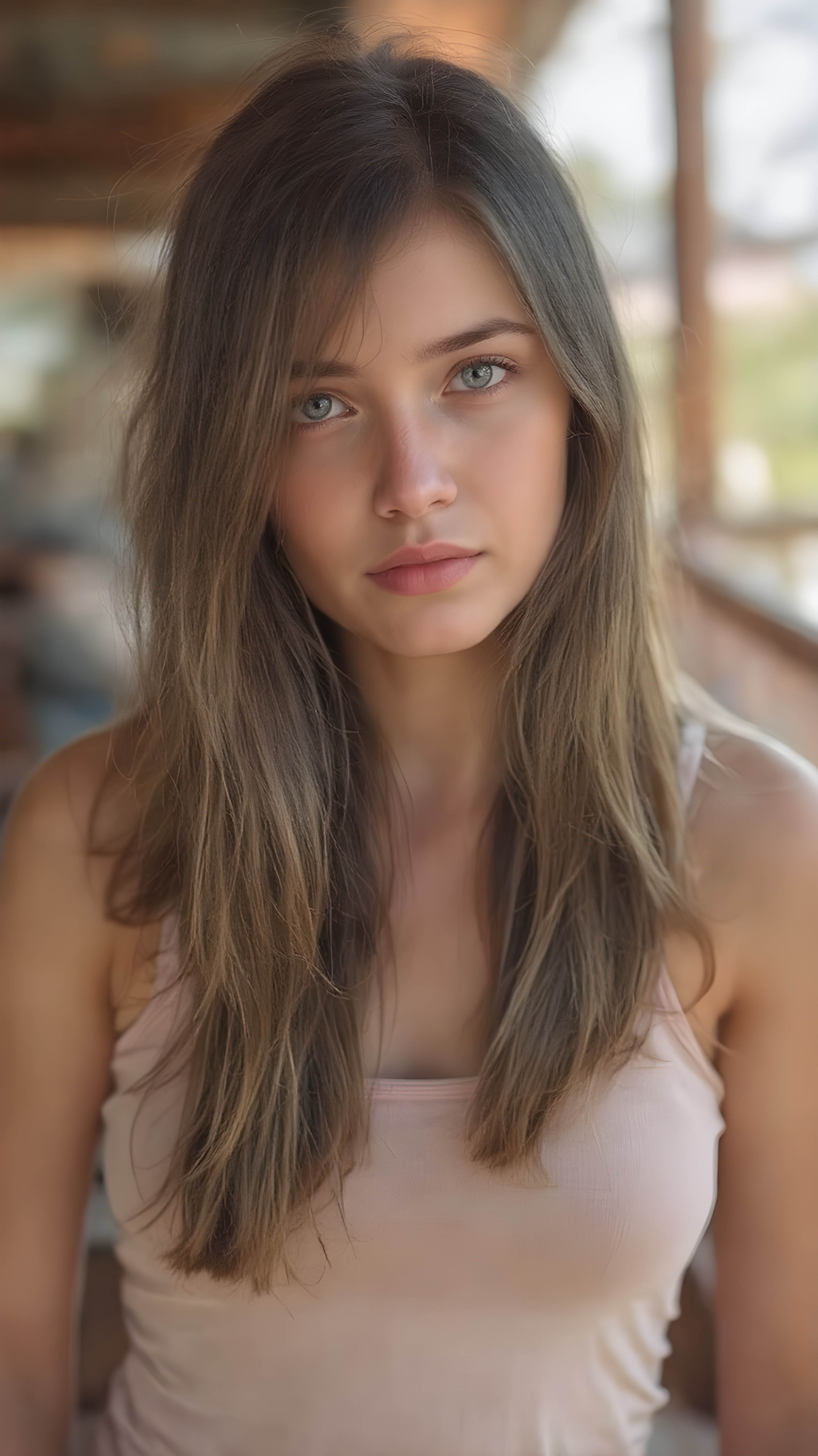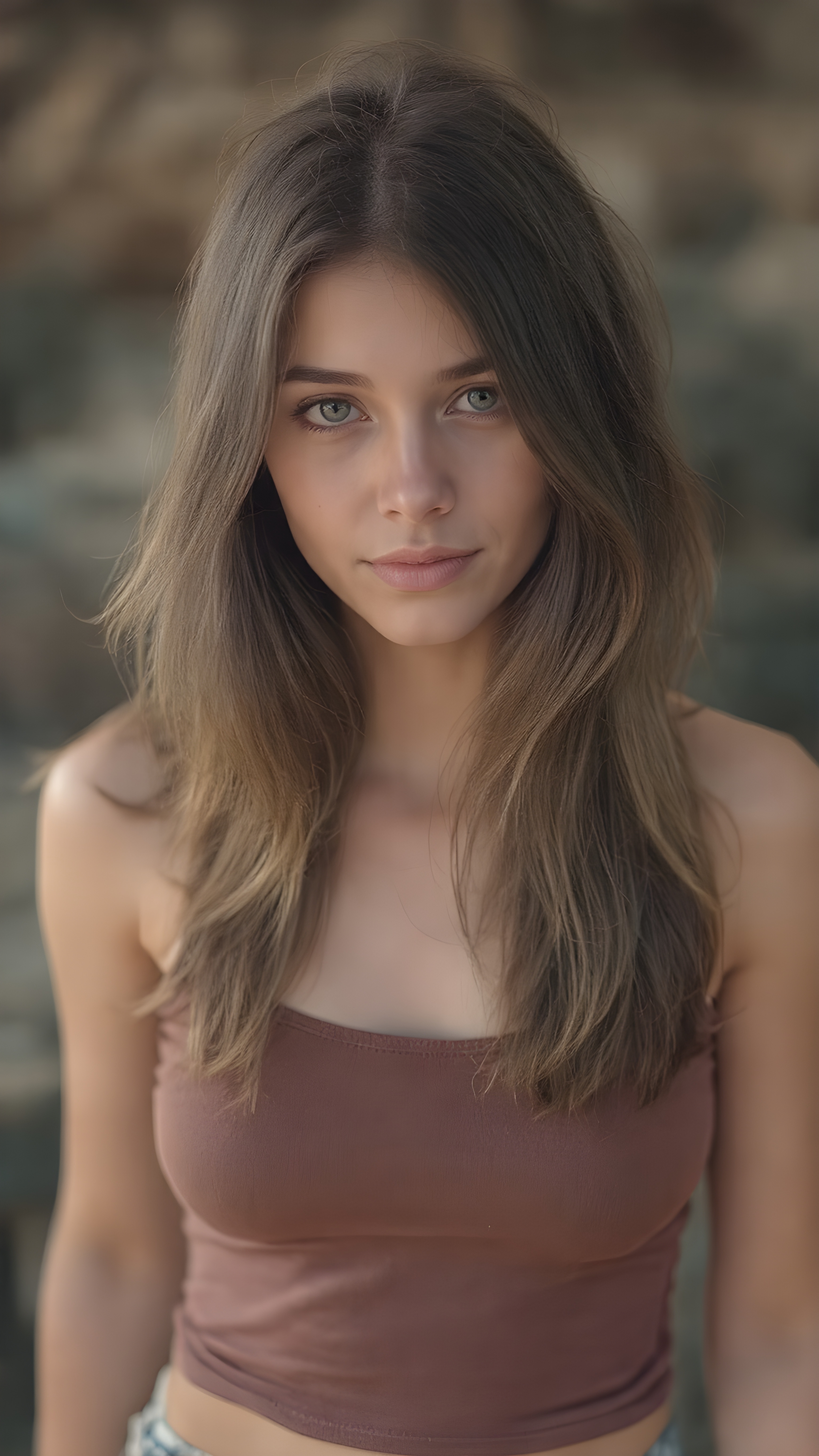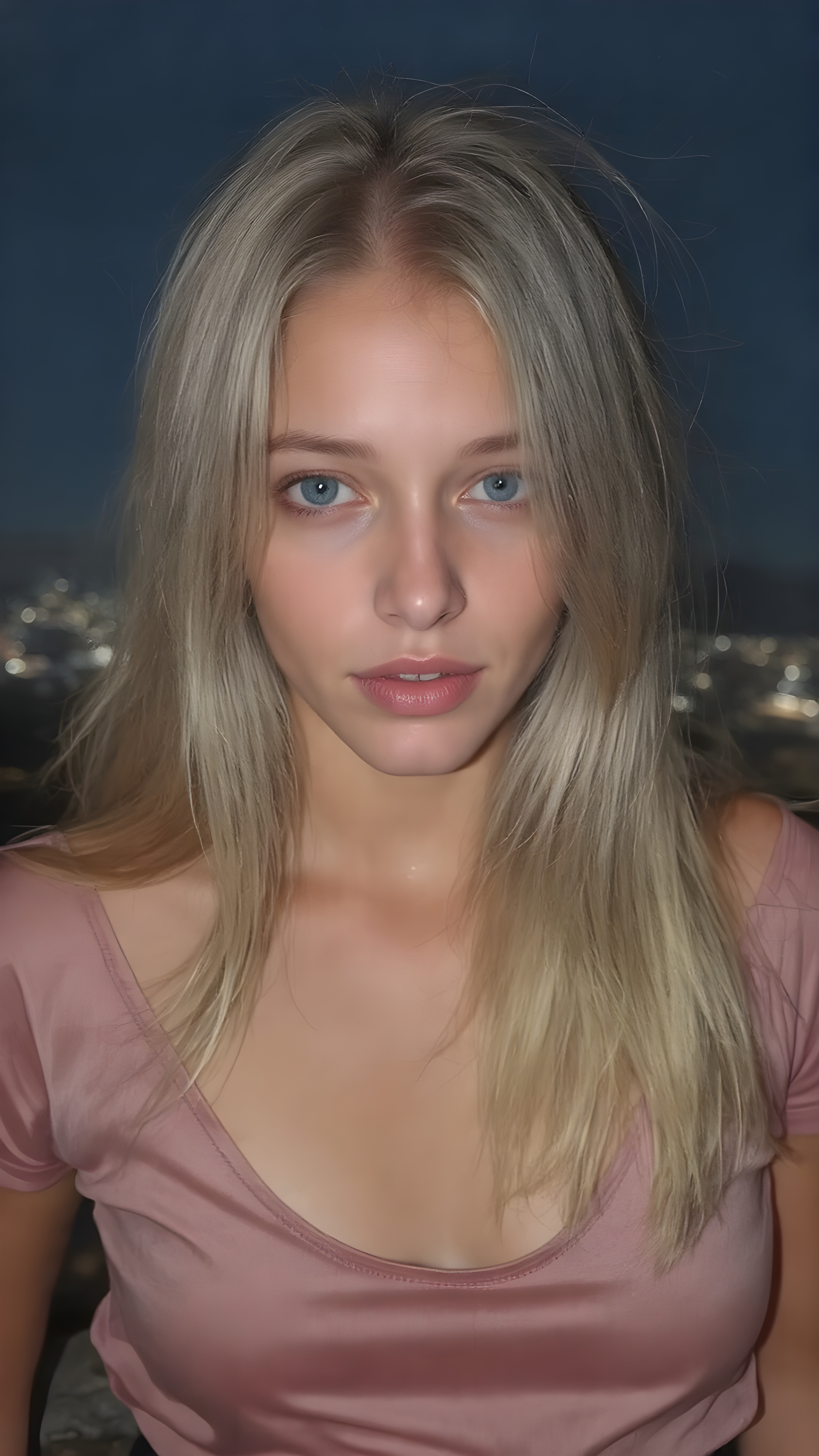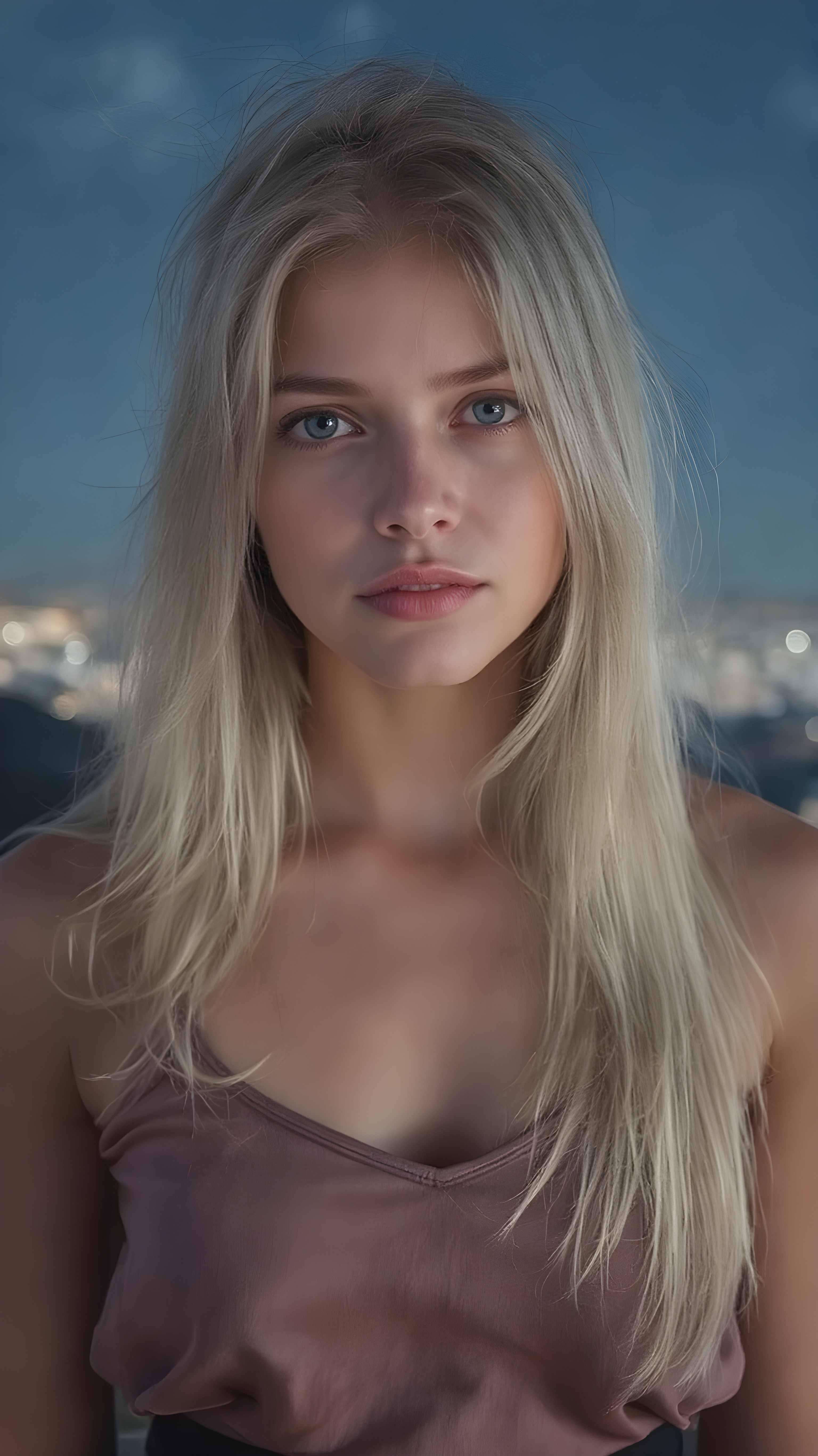 A (((beautiful girl))), age 18, with flowing (((white blonde hair))), straight and smooth hair that extends down to her shoulders, capturing light and emphasizing her face’s delicate features. Her skin is a (pale) light blue, with slightly soft (smooth) lines that reflect the sun’s rays, enhancing her face’s natural beauty. Her lips are a (soft) light blue, with (straight) lines that match the texture of her skin. She wears a (low-cut) silk t-shirt and a (tightly tied) black skirt, both of which highlight her flawless figure and natural beauty. The scene is set at night on a (mountain top) overlooking the city below, under a (starry sky) backdrop, perfect for a romantic evening