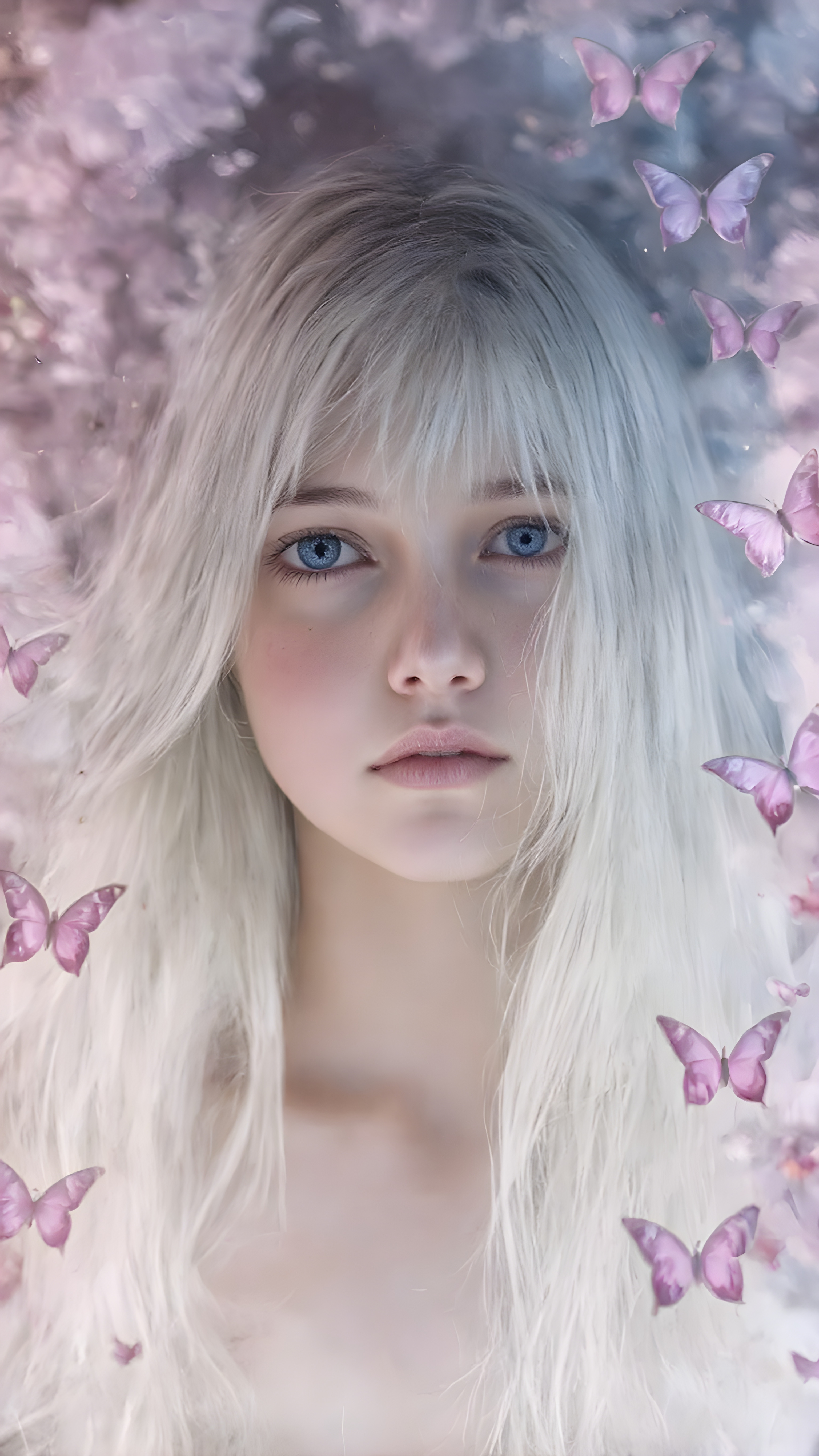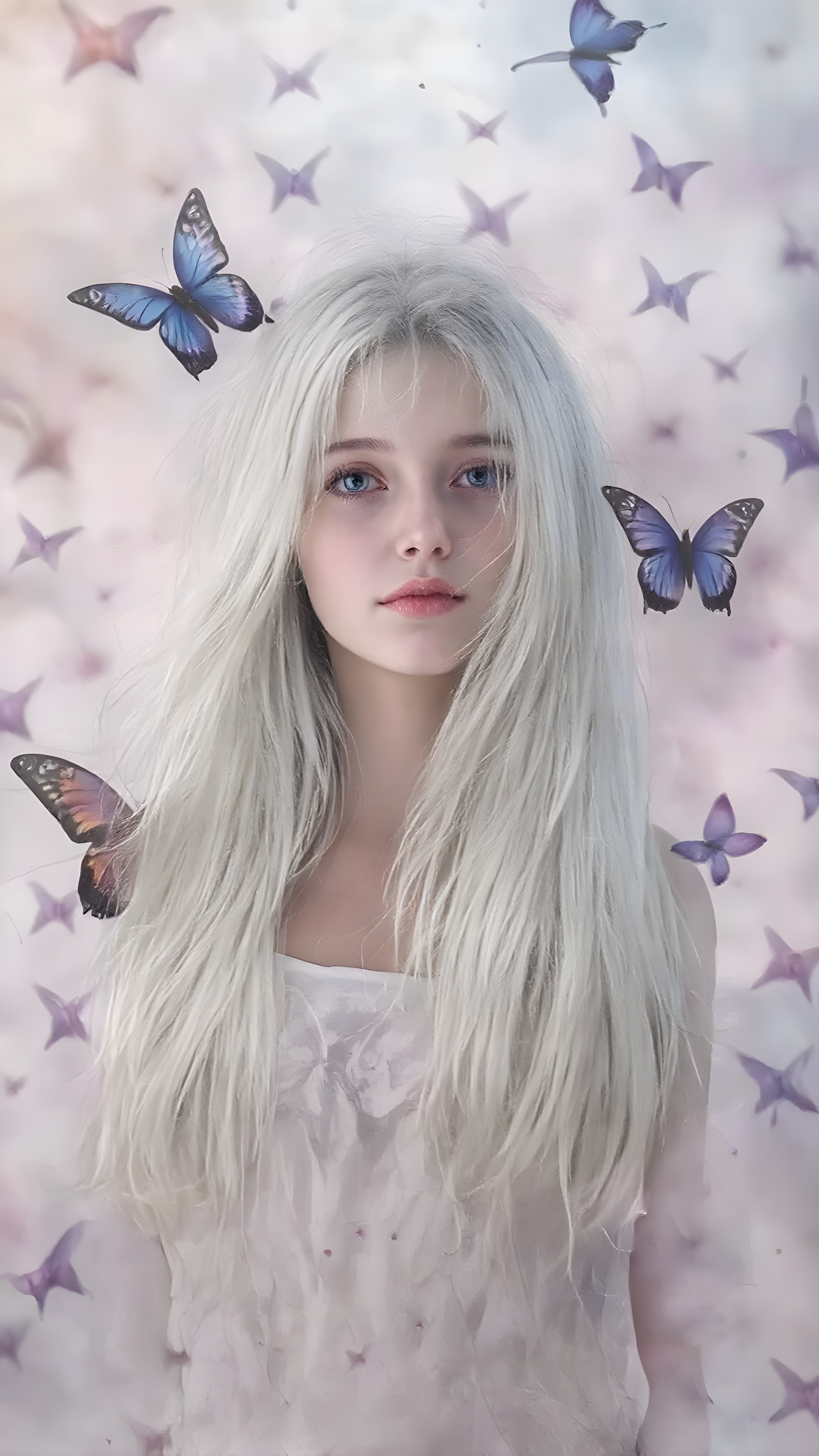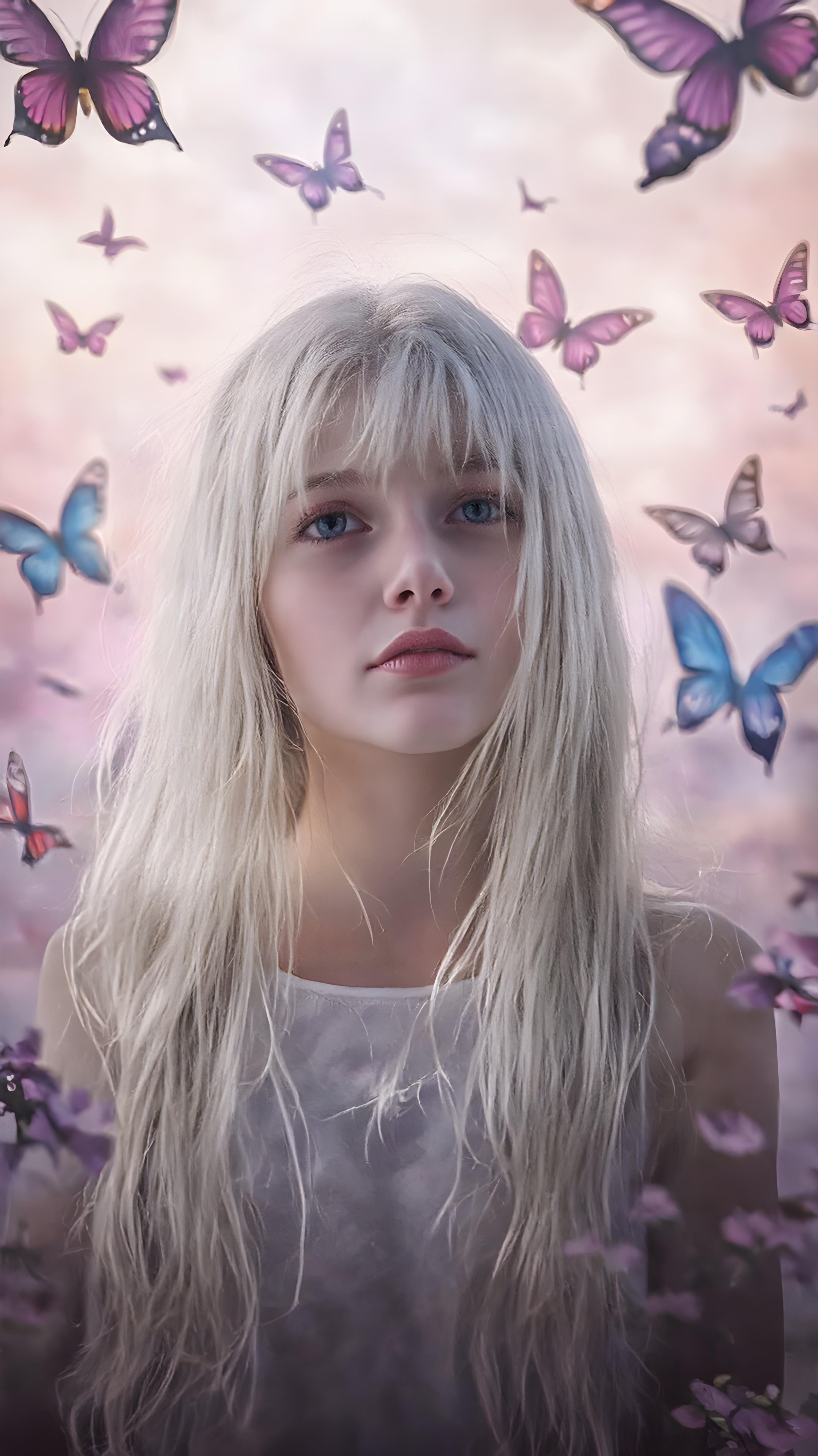 A beautifully drawn (((8K Ultra HD image))), featuring a (((girl with long, flowing white hair and pale skin))), exuding an ethereal glow that radiates from her face. Her expression is one of wonder and awe, as she stands surrounded by a (((floating, colorful butterfly landscape))), with vibrant butterflies in shades of pink, blue, and purple, all framed by a backdrop of (softly glowing, pastel clouds)