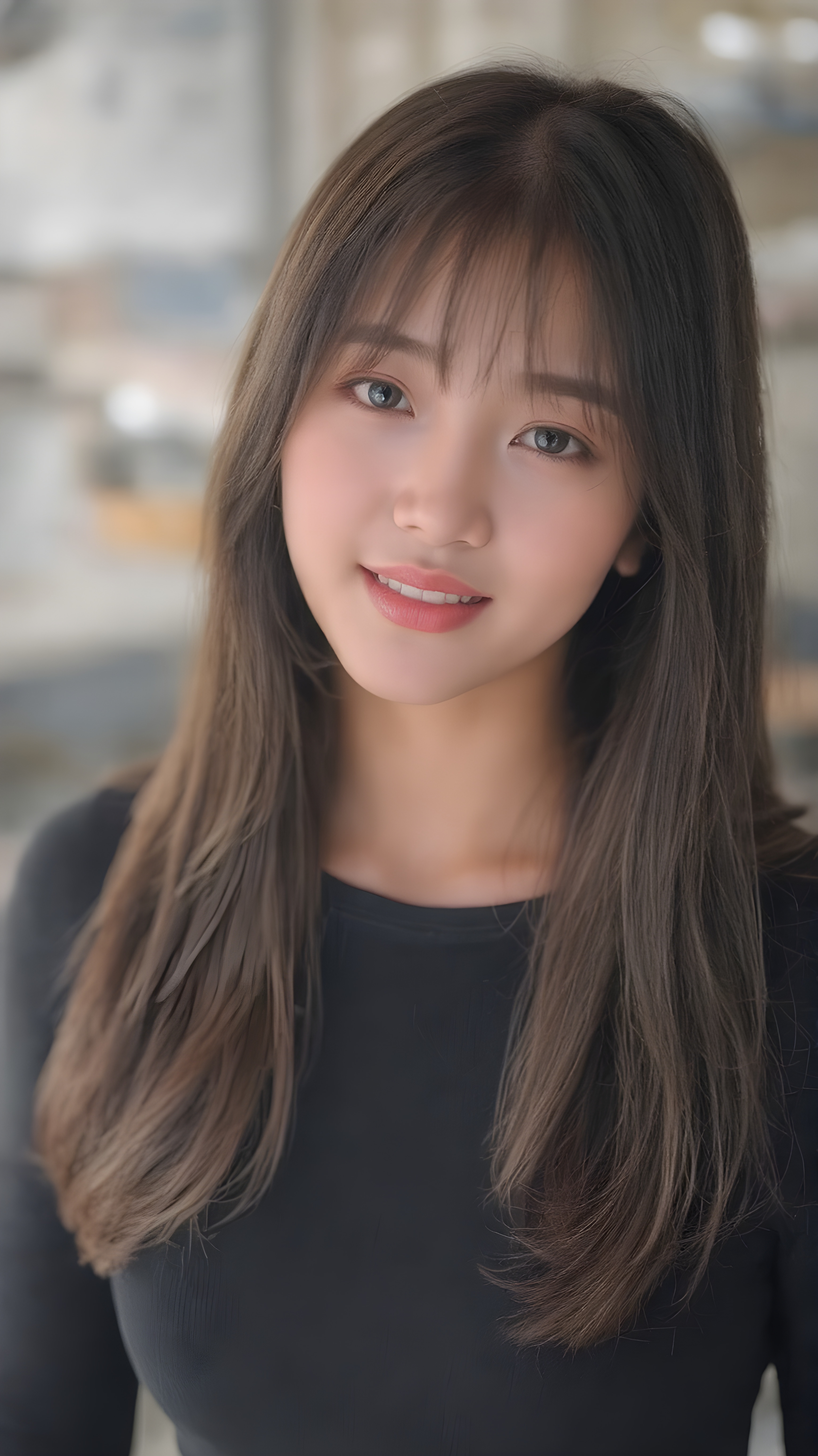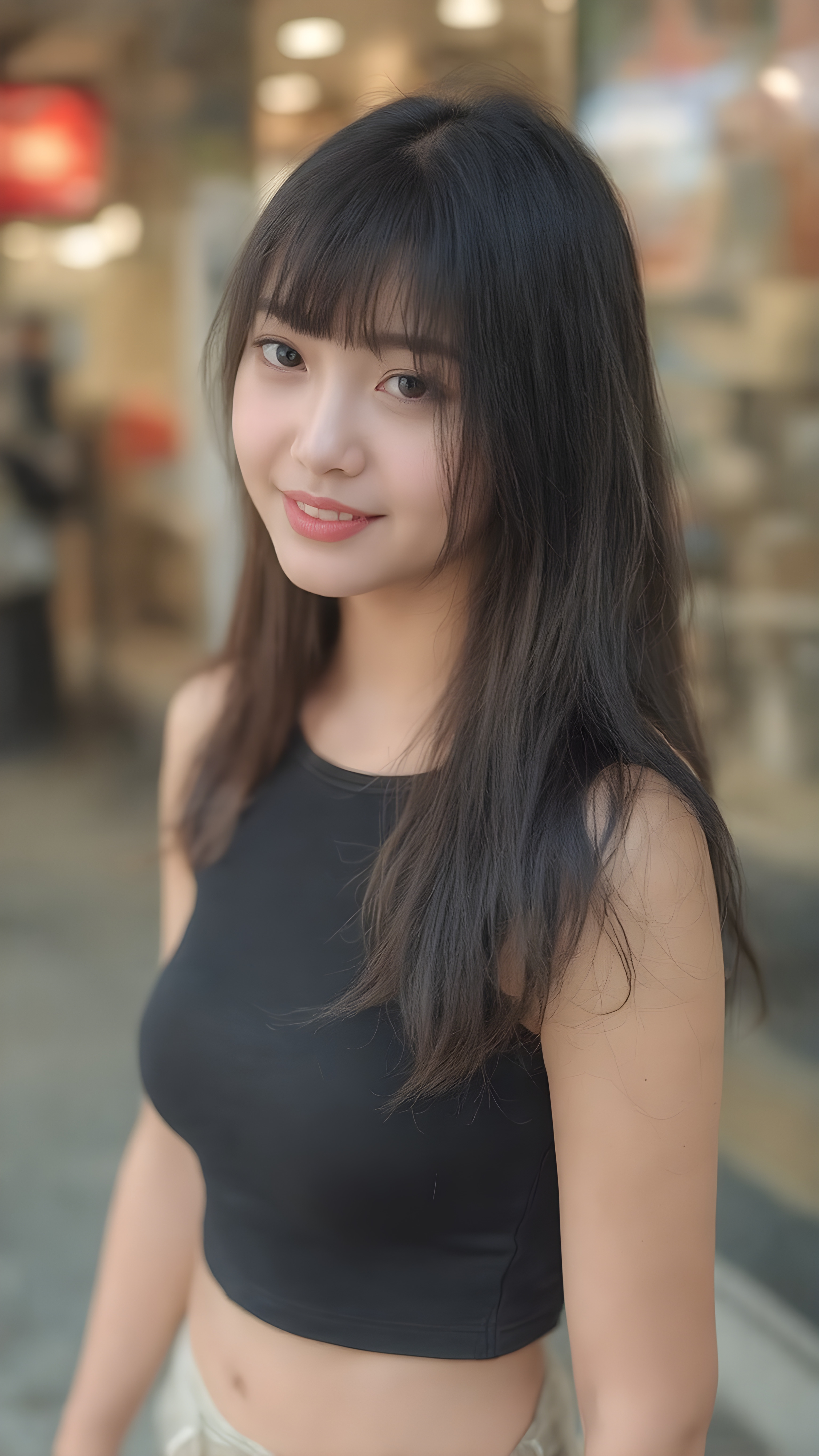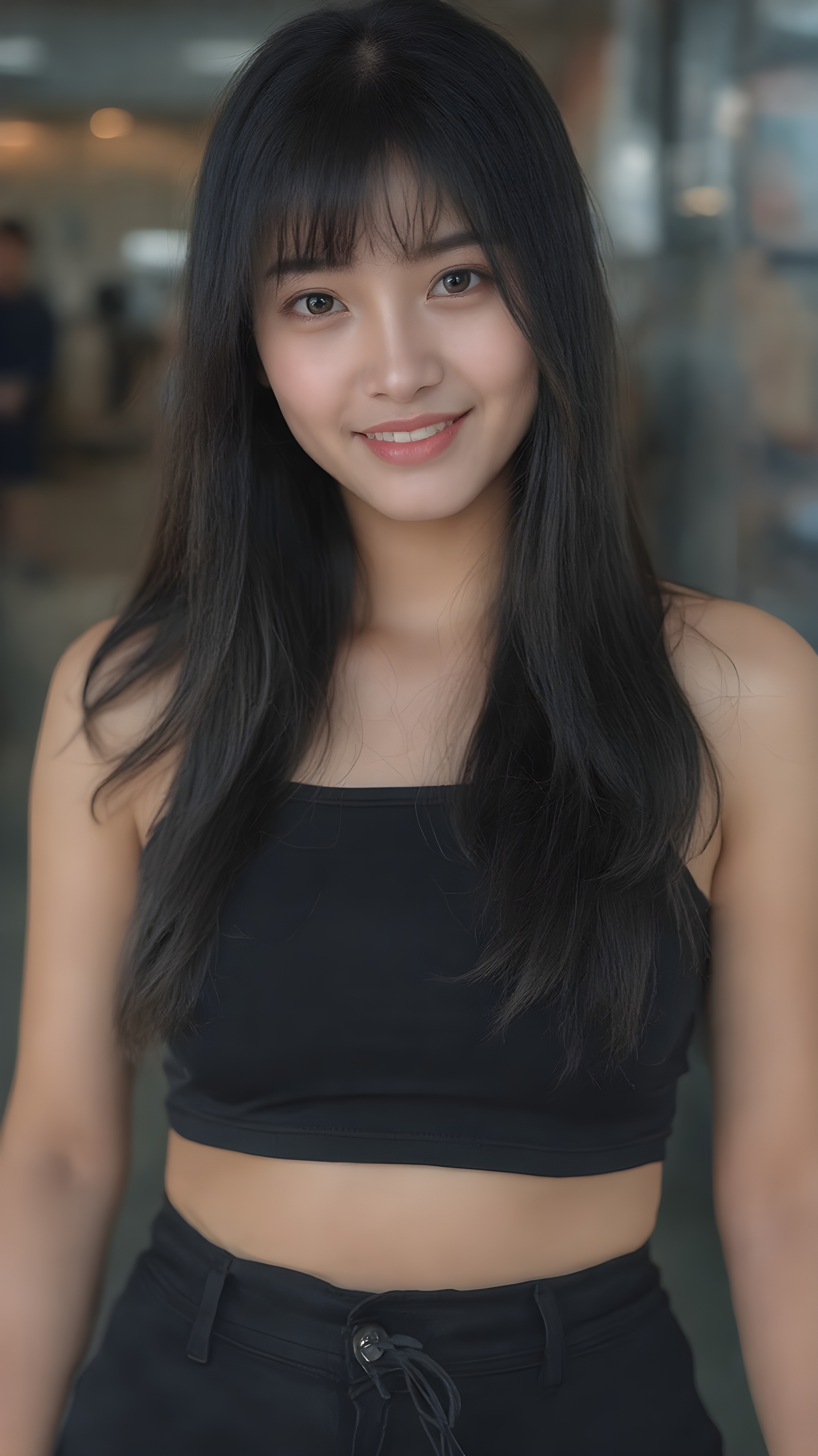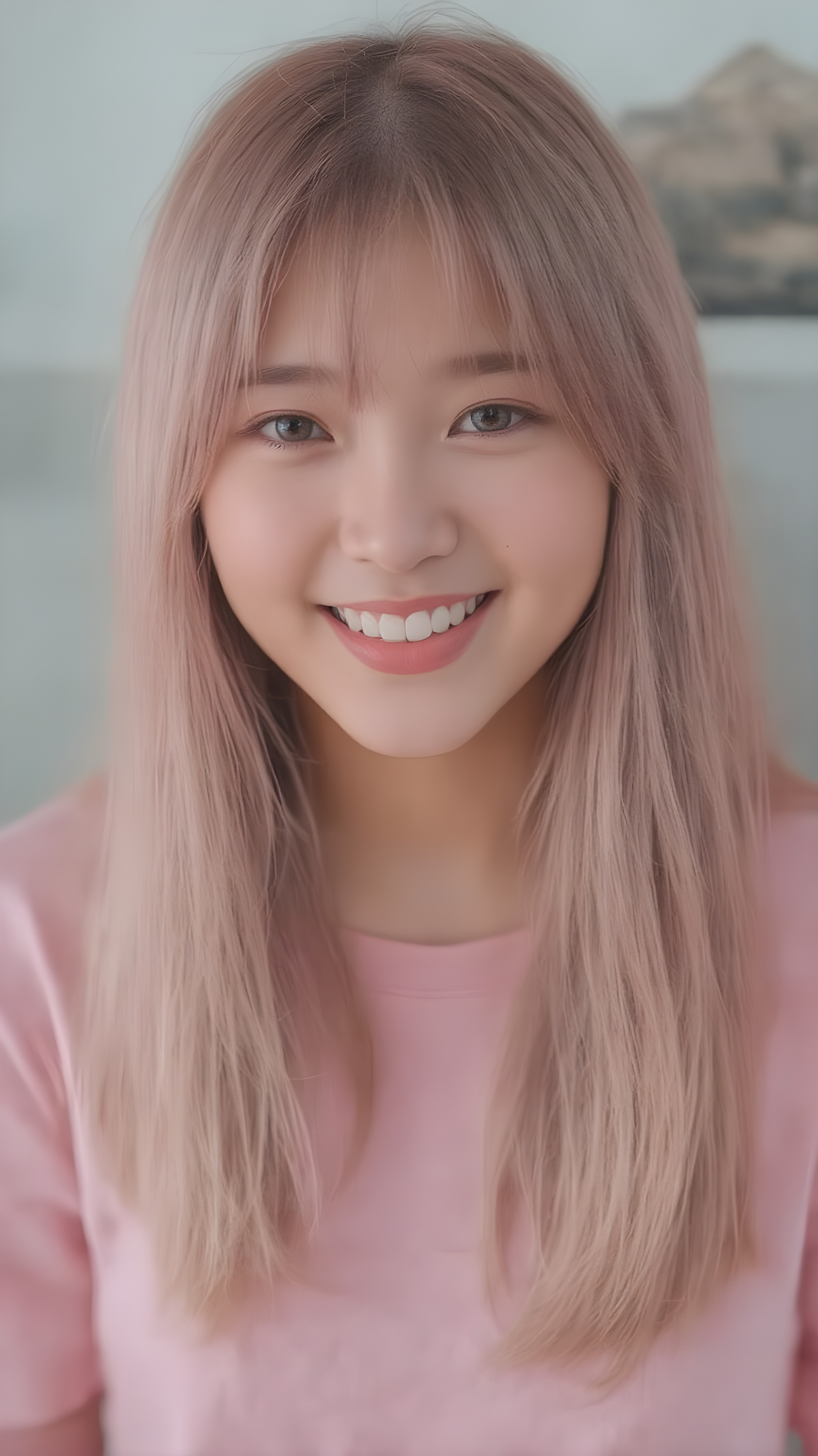 perfect realistic beautiful teenage girl, with gorgeous jet pink hair, early 2000s, styling her hair in straight long soft waves with the exact same length left an right, that exude an air of cuteness. Her features are Korean-inspired, with long, straight hair as the norm for Korean girls of her age. She’s also got perfectly straight white teeth, which is rare for someone her age, and beautiful jet pink lips that perfectly complements her face. She’s wearing a super short tight pink shirt that emphasizes her navel, and loose fitting jeans that enhance her perfect curved body. Her smile is sunny and inviting, giving the impression of a happy, joyful, and inviting personality. (((She is beautiful and cute, full body image)))