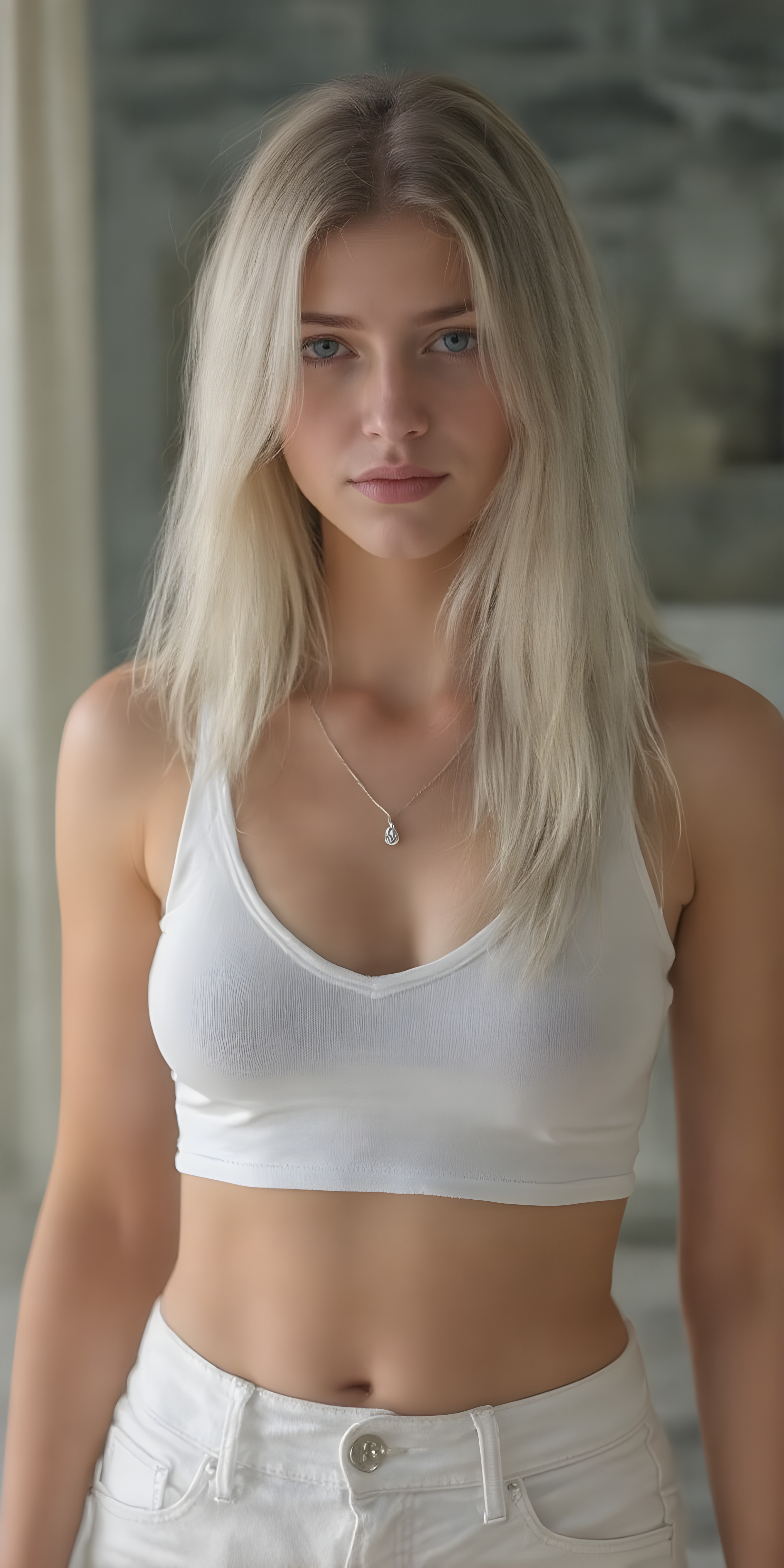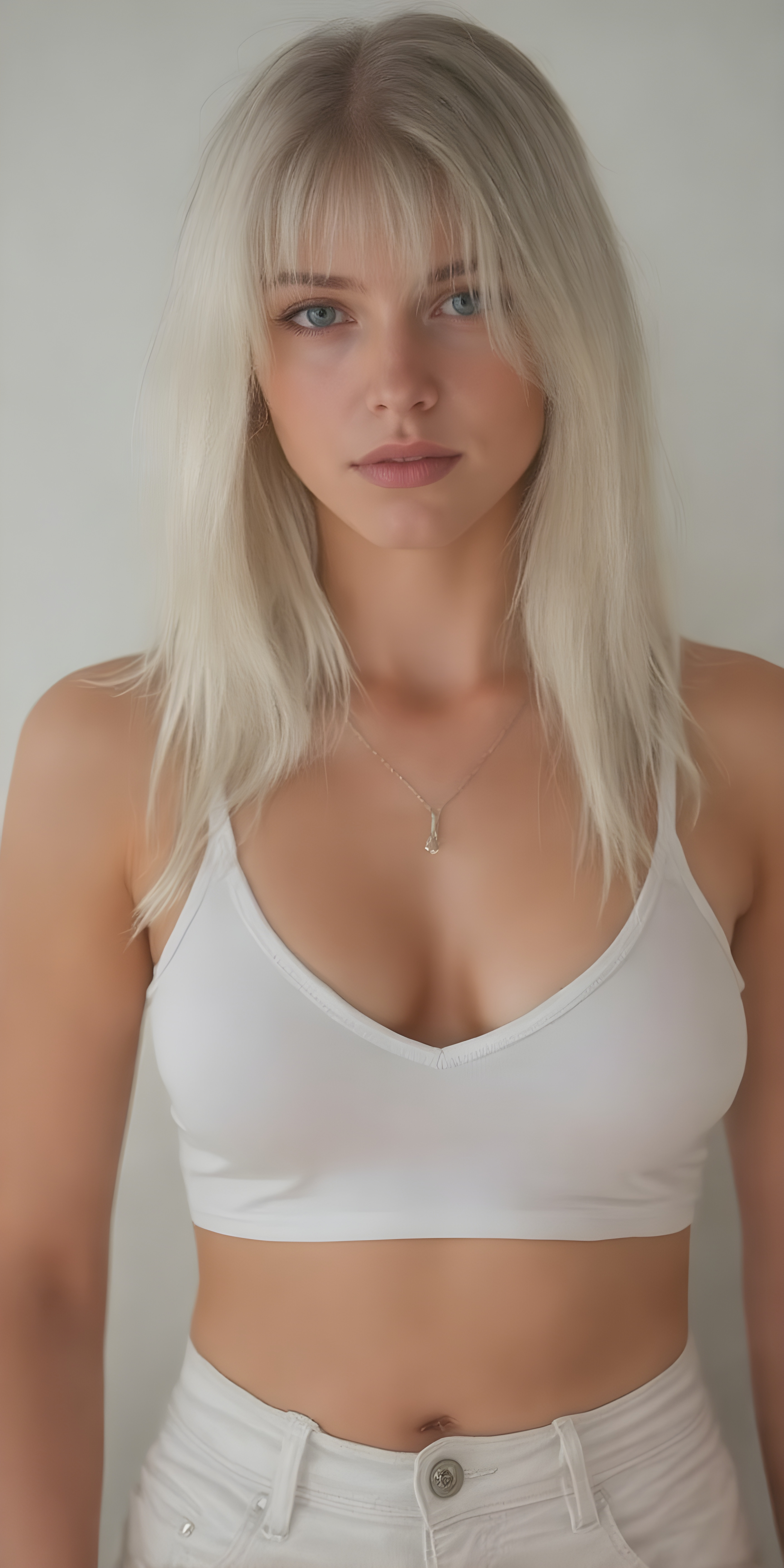 A (((perfectly realistic full body figure))) of a (((beautiful very well busty teen girl))) with white skin, intricate details and flowing platinum white locks, dressed in a (((white tank top deep v-neck, and short white jeans pants))), as if captured by a (professional photographer) in a (realistically captured moment) that exudes a sense of (seduction), silver necklace, perfect belly button