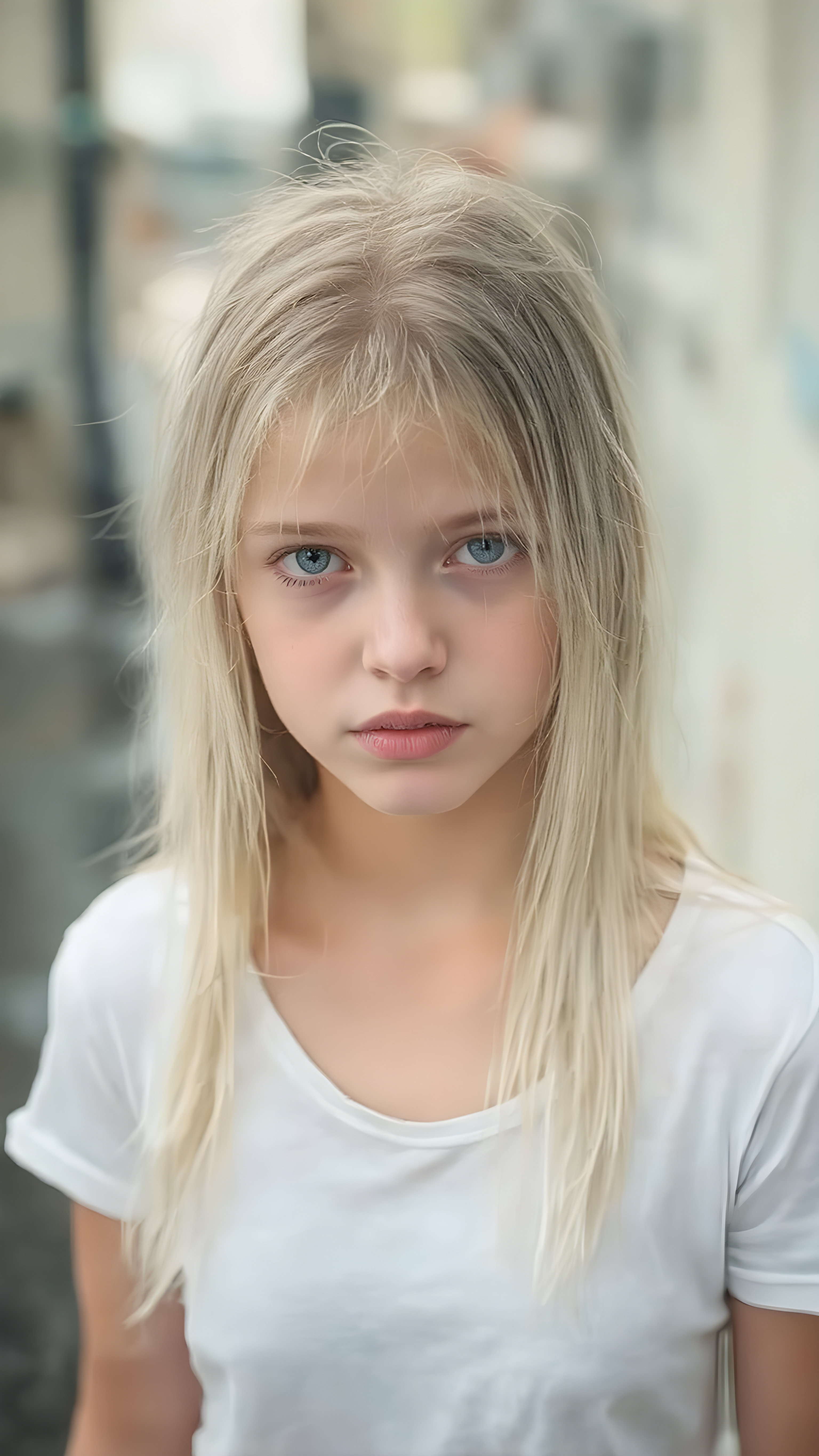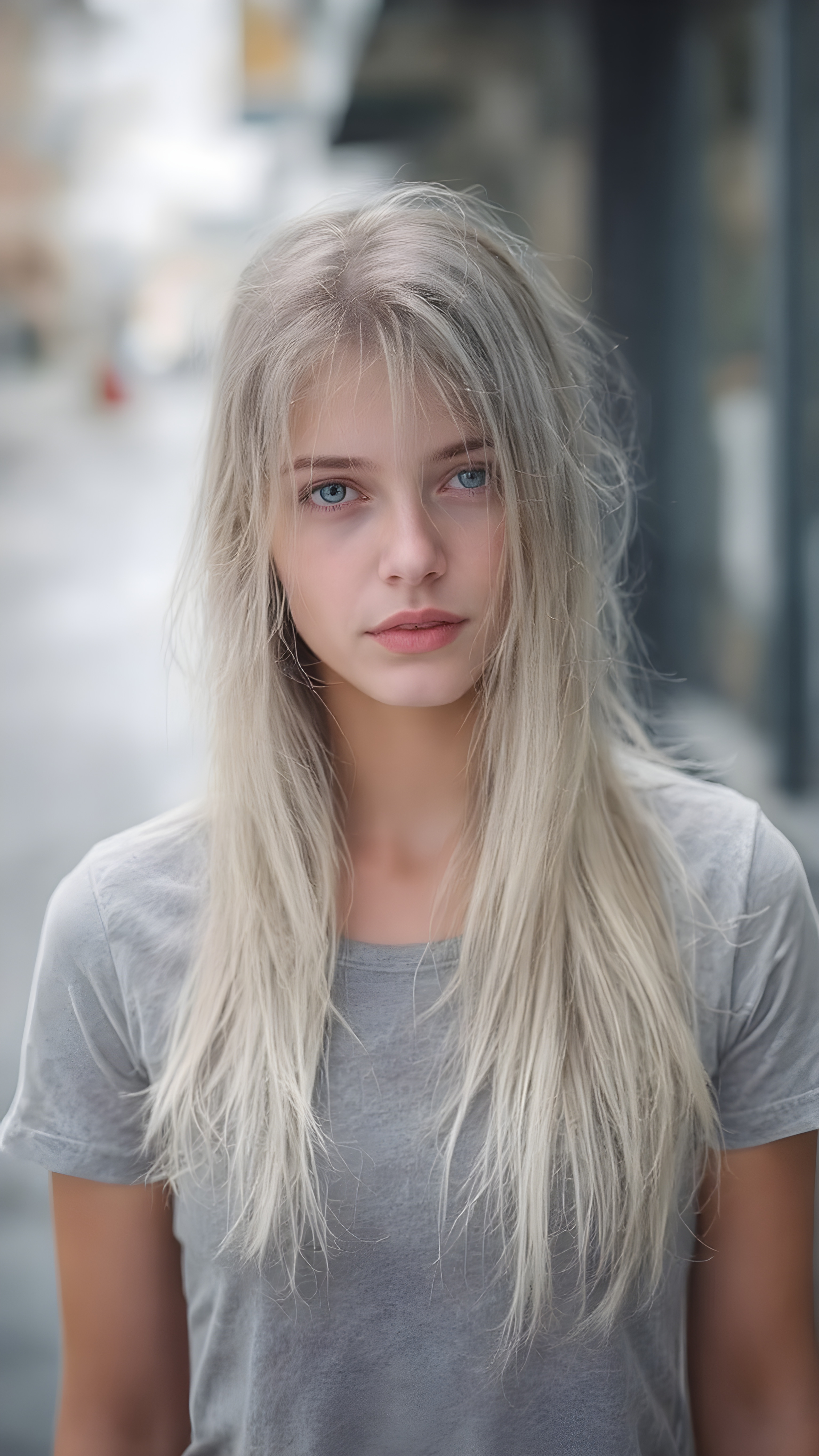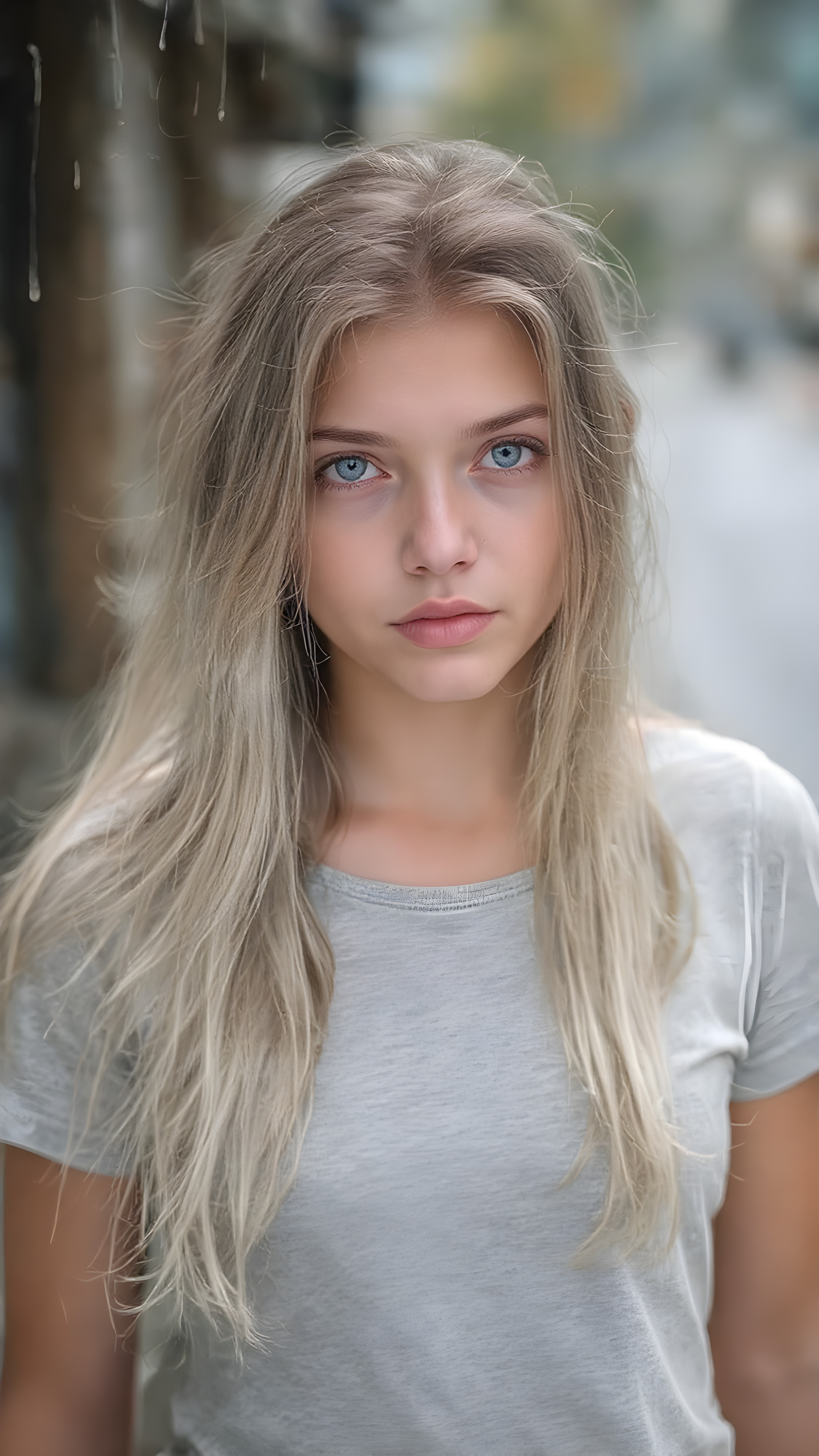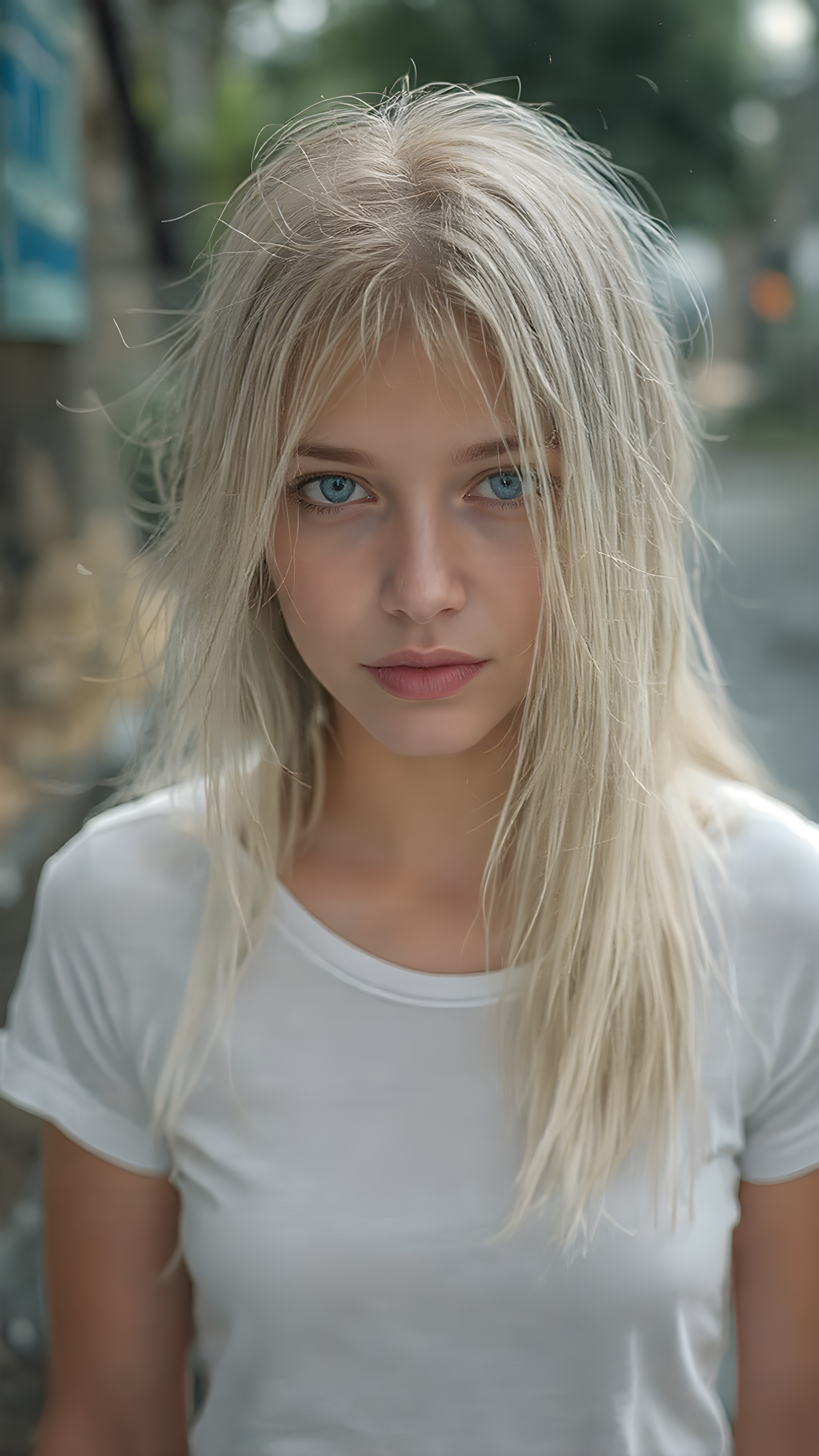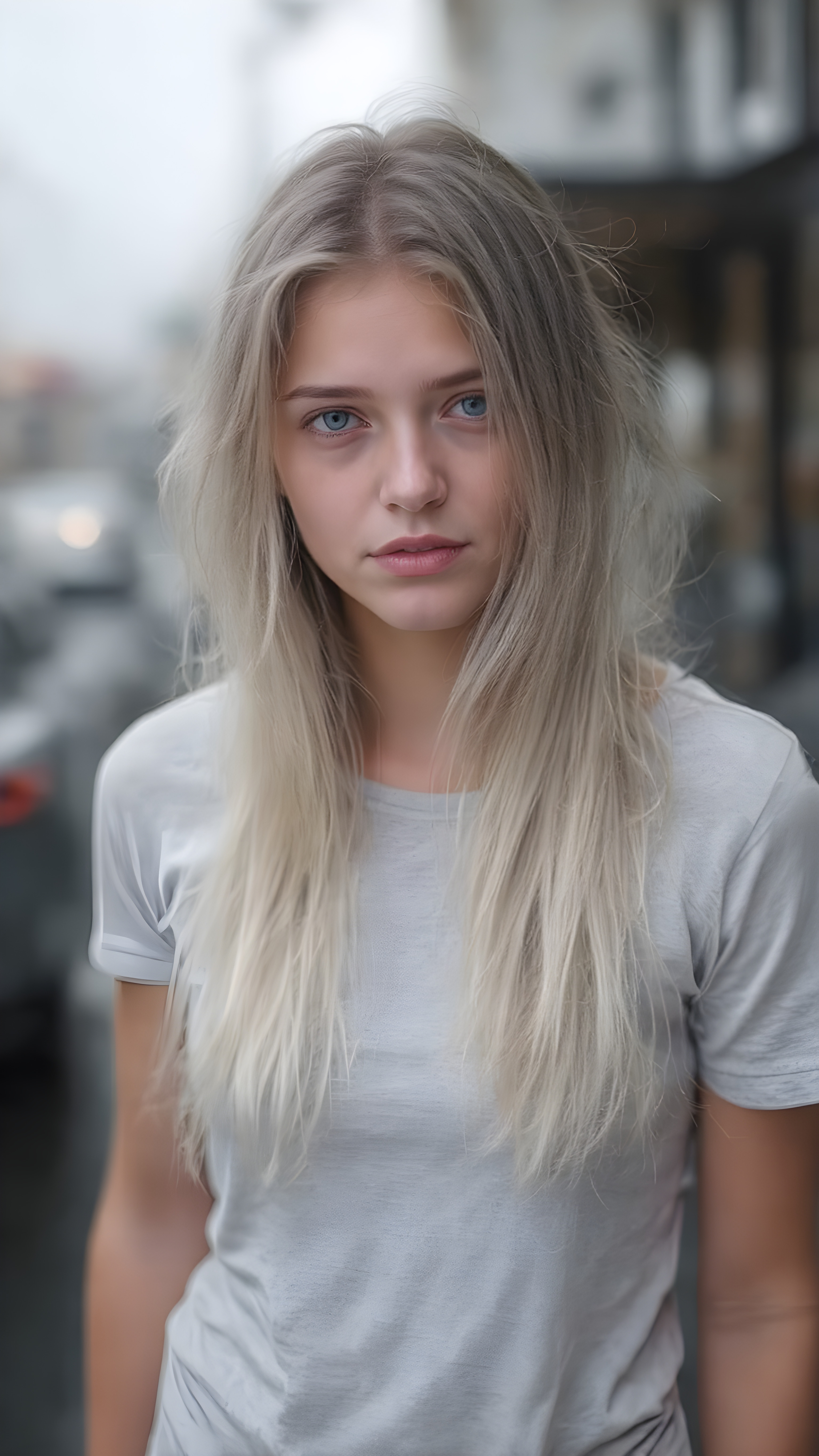 an ultra realistic hyper-detail photograph capturing a (((very cute adult teen girl))) with pale skin and (((white wet hair))), standing alone on a street in the rain. Her hair is long, soft, and straight, with natural white streaks. She is wearing a (white t-shirt) that clings to her body like a second skin, accentuating her (skinny figure). Her face is bright and open, with (natural looking eyes) that match her tresses in color and texture. The overall image is (ethereal and beautiful), with the light refracting off her wet skin and hair, creating a magical, natural-looking atmosphere.
