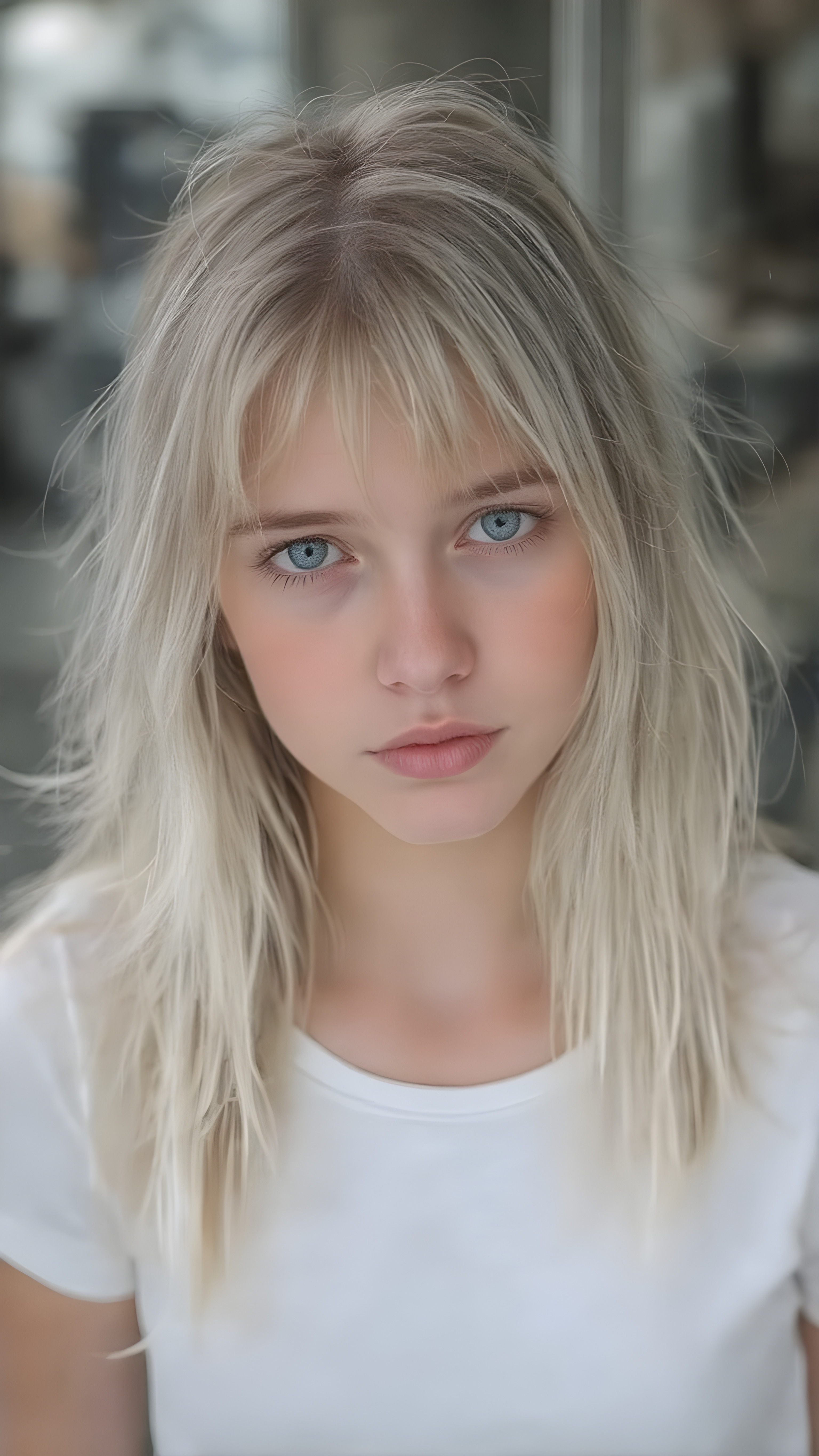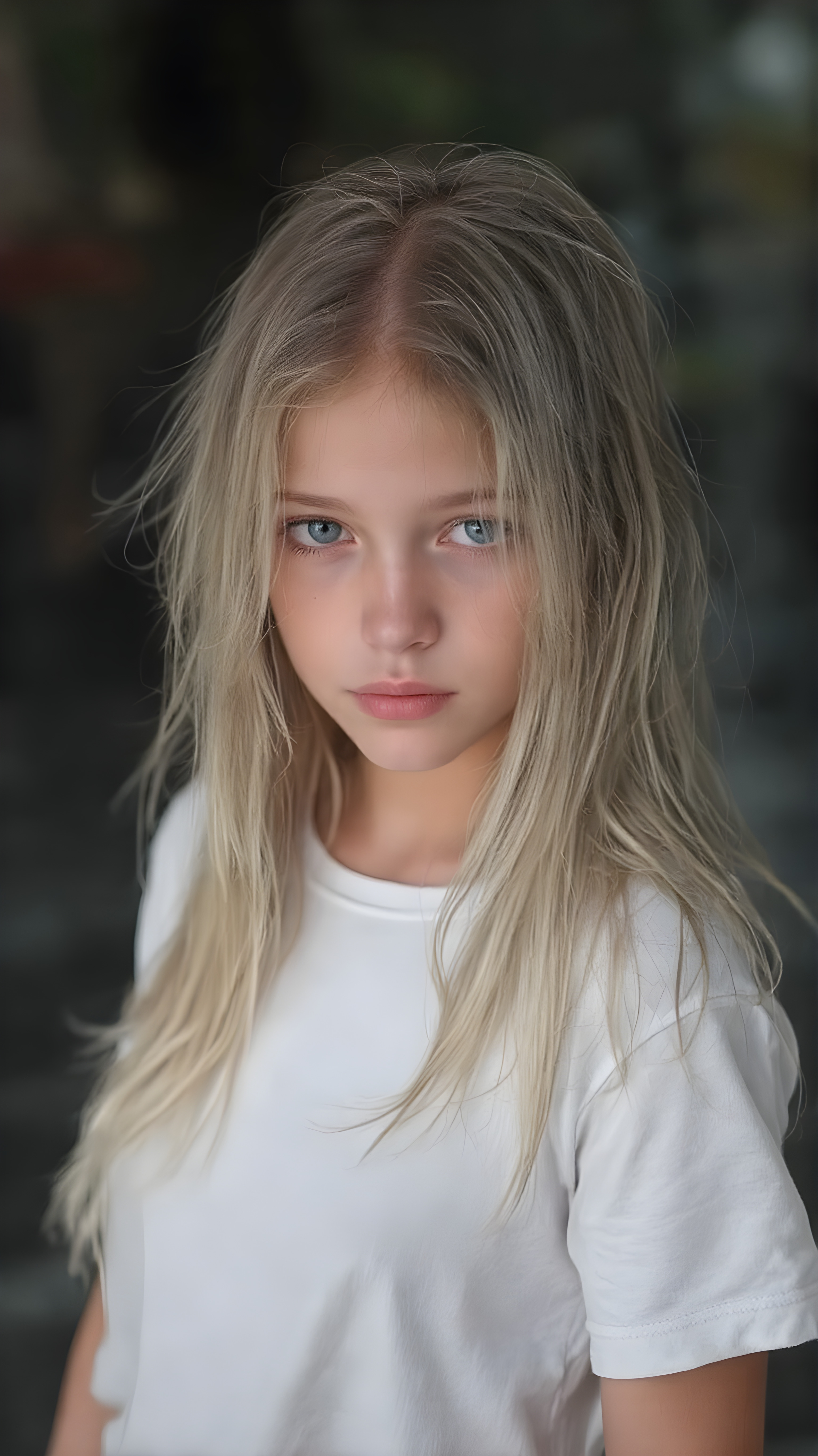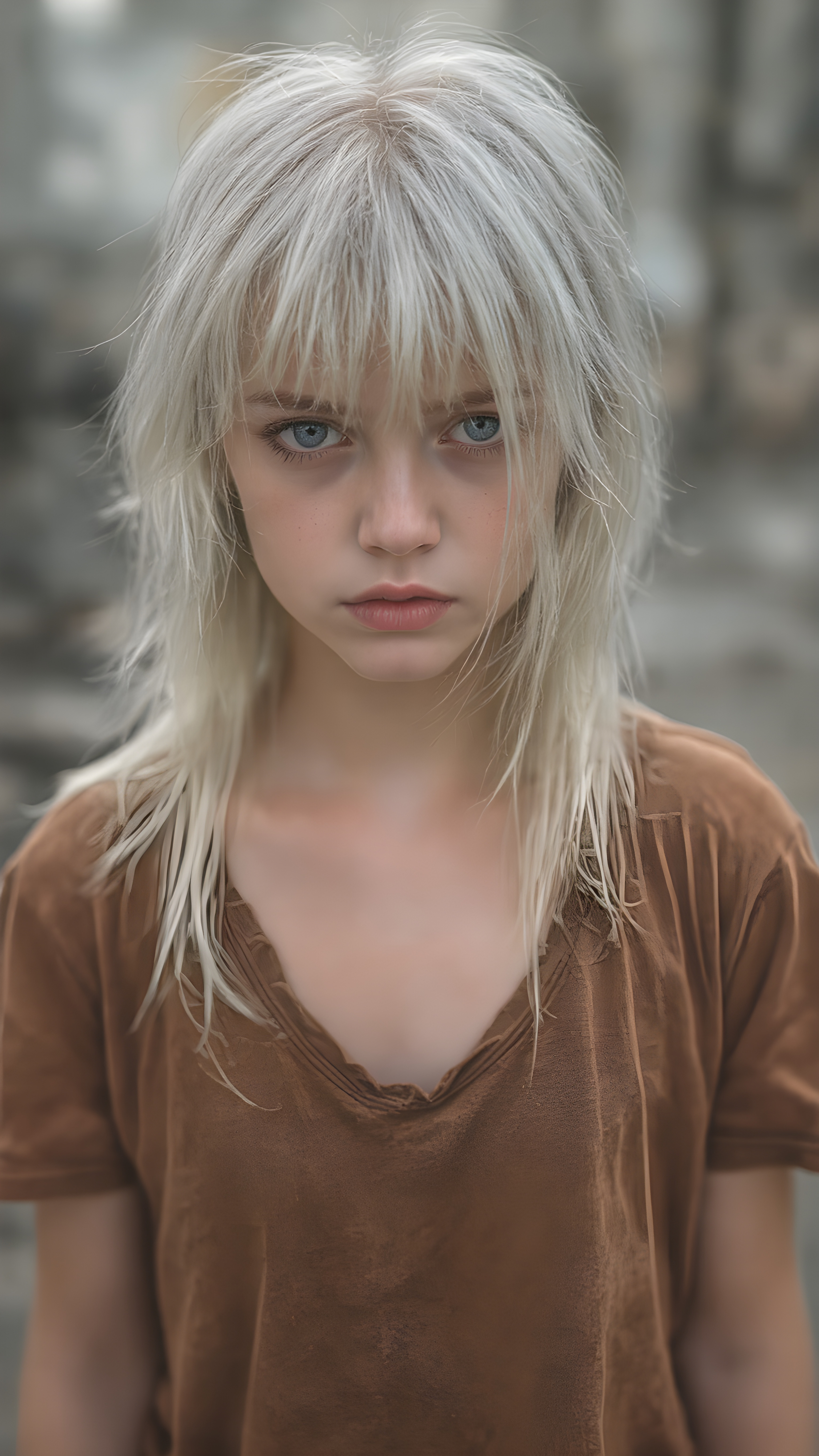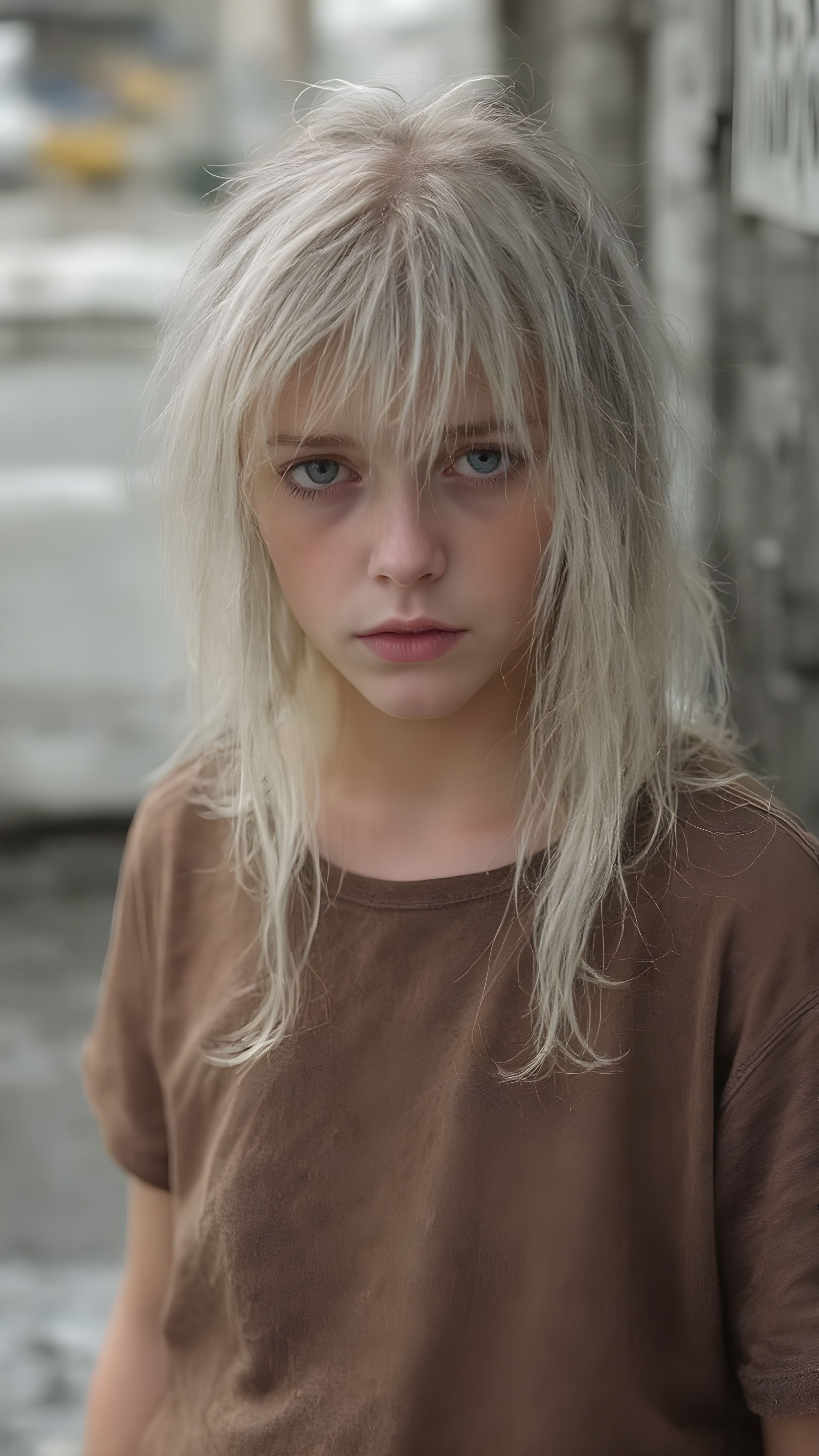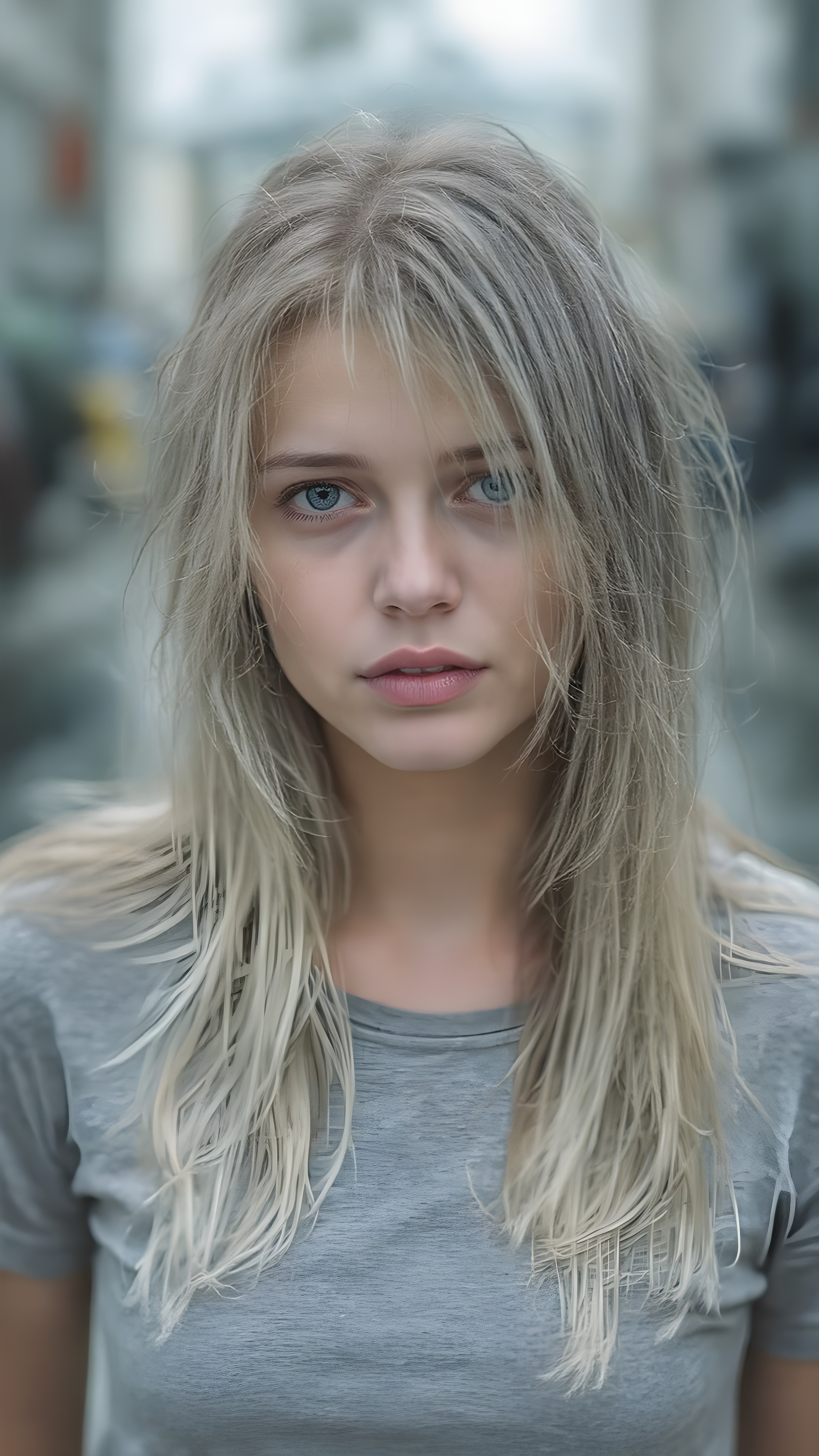 an ultra realistic hyper-detail photograph capturing a (((very cute adult teen girl))) with pale skin and (((white wet hair))), standing alone on a street in the rain. Her hair is long, soft, and straight, with natural white streaks. She is wearing a (white t-shirt) that clings to her body like a second skin, accentuating her (skinny figure). Her face is bright and open, with (natural looking eyes) that match her tresses in color and texture. The overall image is (ethereal and beautiful), with the light refracting off her wet skin and hair, creating a magical, natural-looking atmosphere.