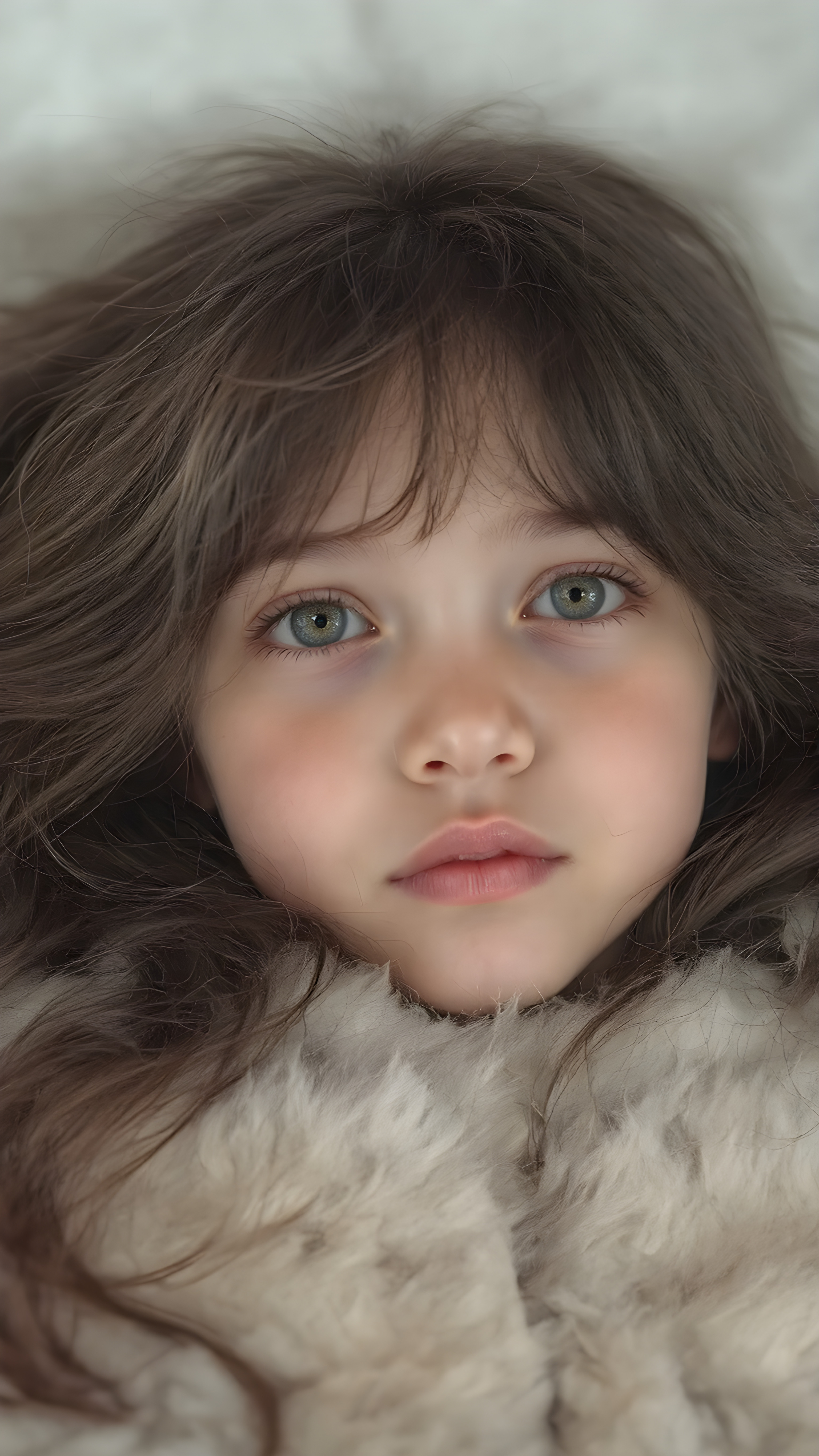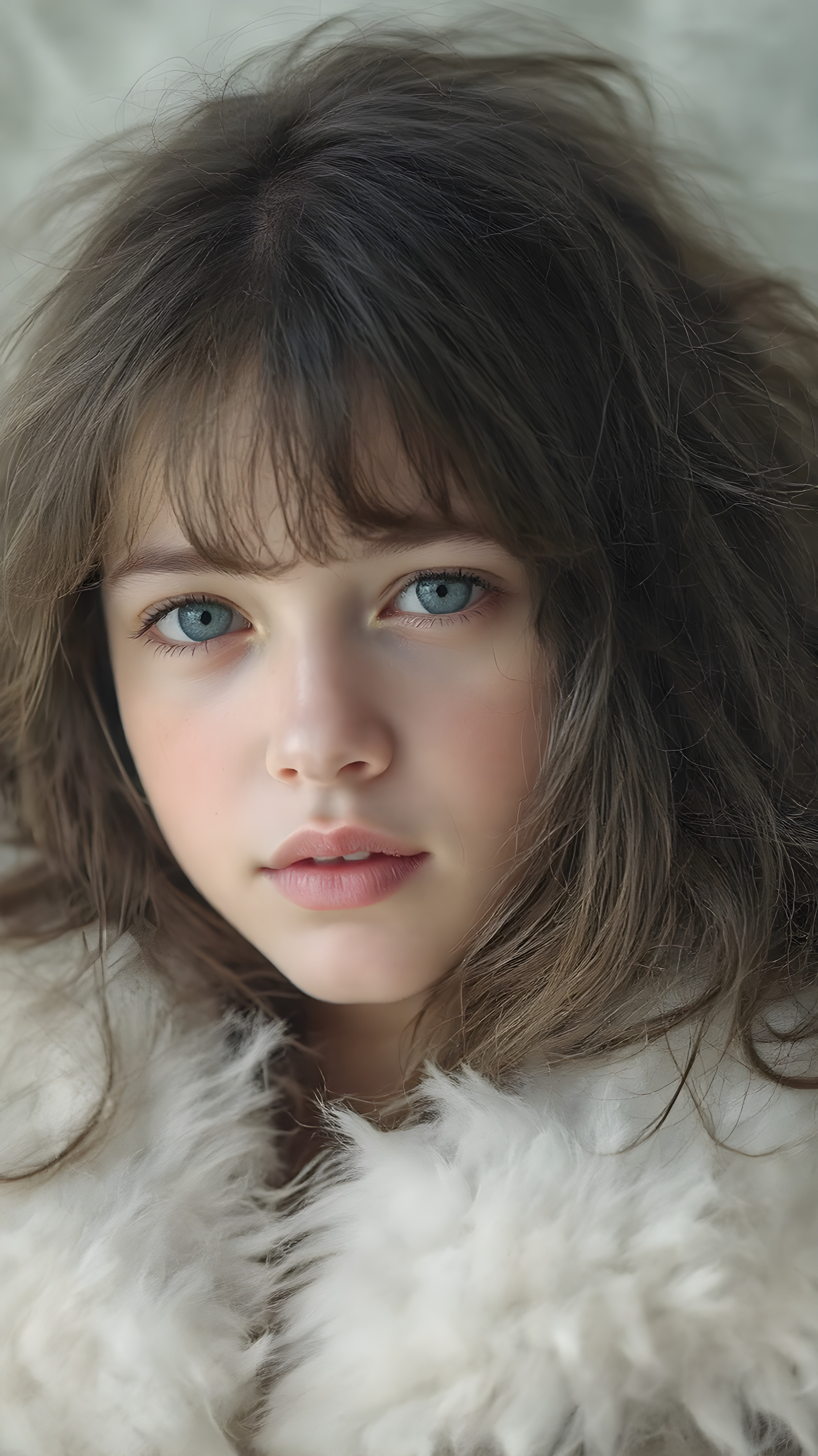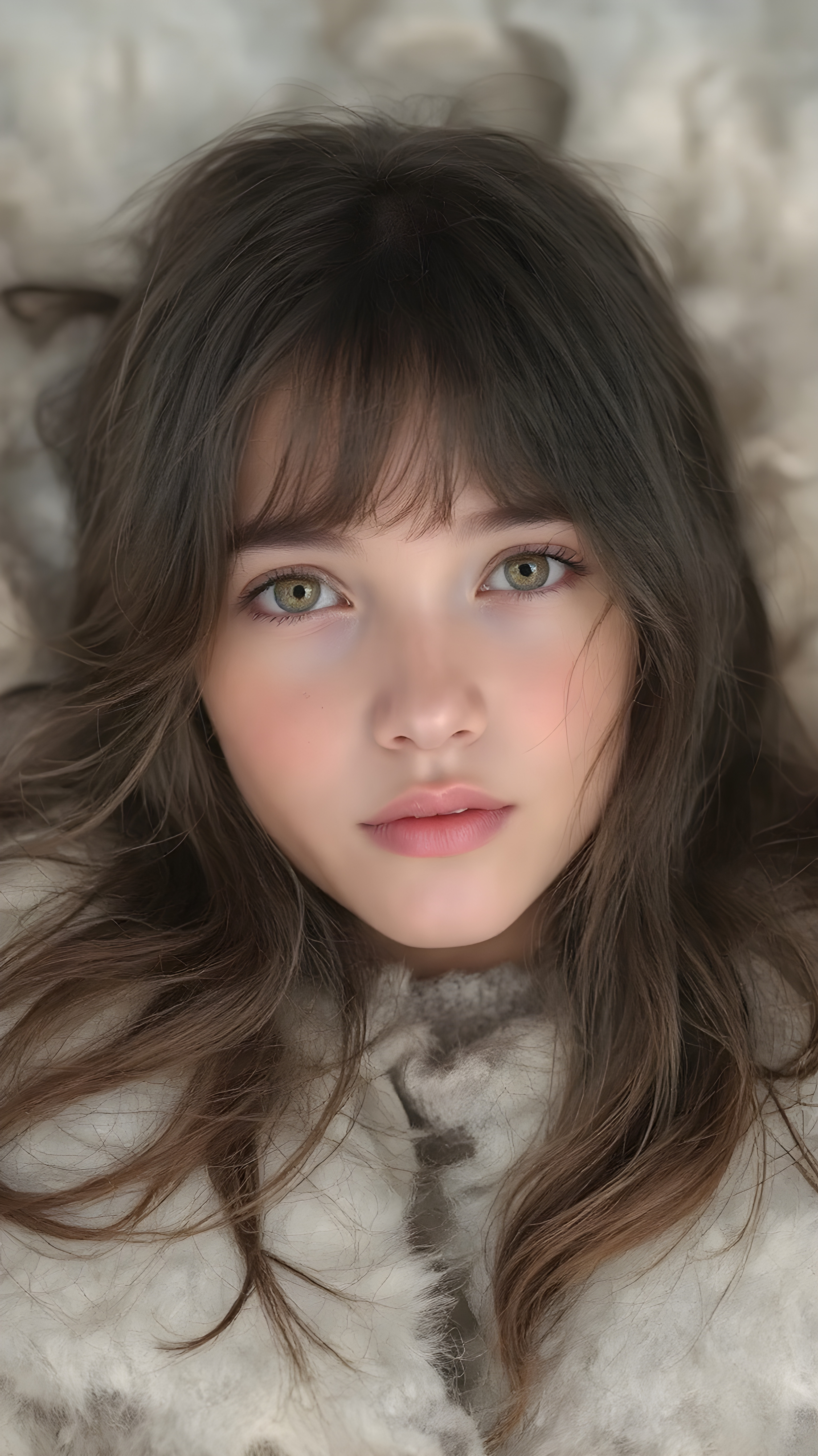 a (((super cute girl))) who exudes an air of warmth and cuteness, with her locks of (((black brown soft hair))), which cascades down in soft, gentle waves, framing her face perfectly; she has (((perfect amber eyes))), her lips are a soft shade of (light pink), and her skin is (extremely soft) and (extremely white as snow), on which she lays comfortably, in a (super soft winter fur outfit) that complements her overall look. She adds a touch of (extraordinary detail) to her ensemble, with a luxurious winter fur coat that adds a sense of (high-end opulence)