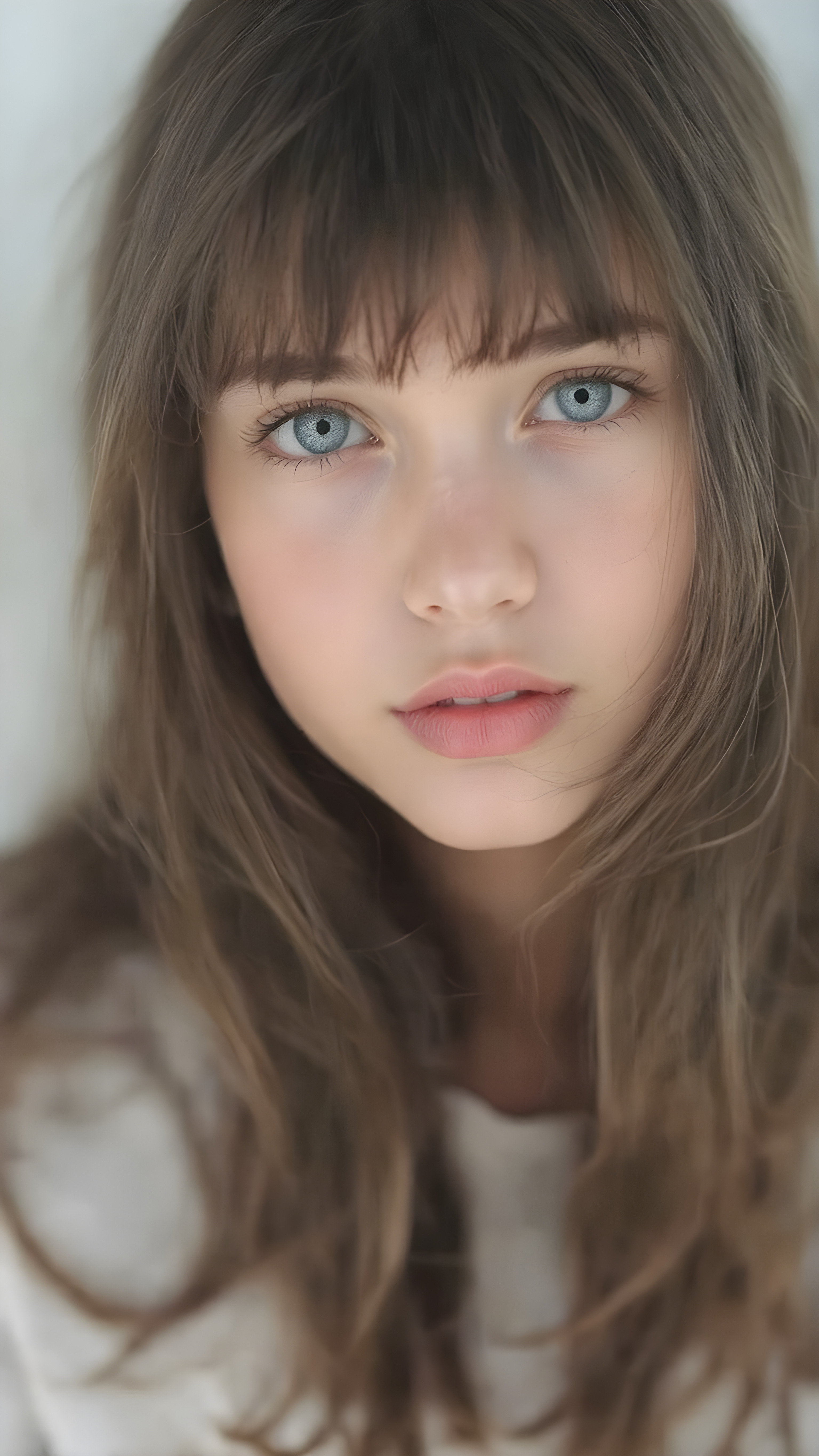 a (((super cute girl))) who exudes an air of warmth and cuteness, with her locks of (((black brown soft hair))), which cascades down in soft, gentle waves, framing her face perfectly in bangs cut; she has (((perfect deep blue eyes))), her lips are a soft shade of (light pink), and her skin is (extremely soft).