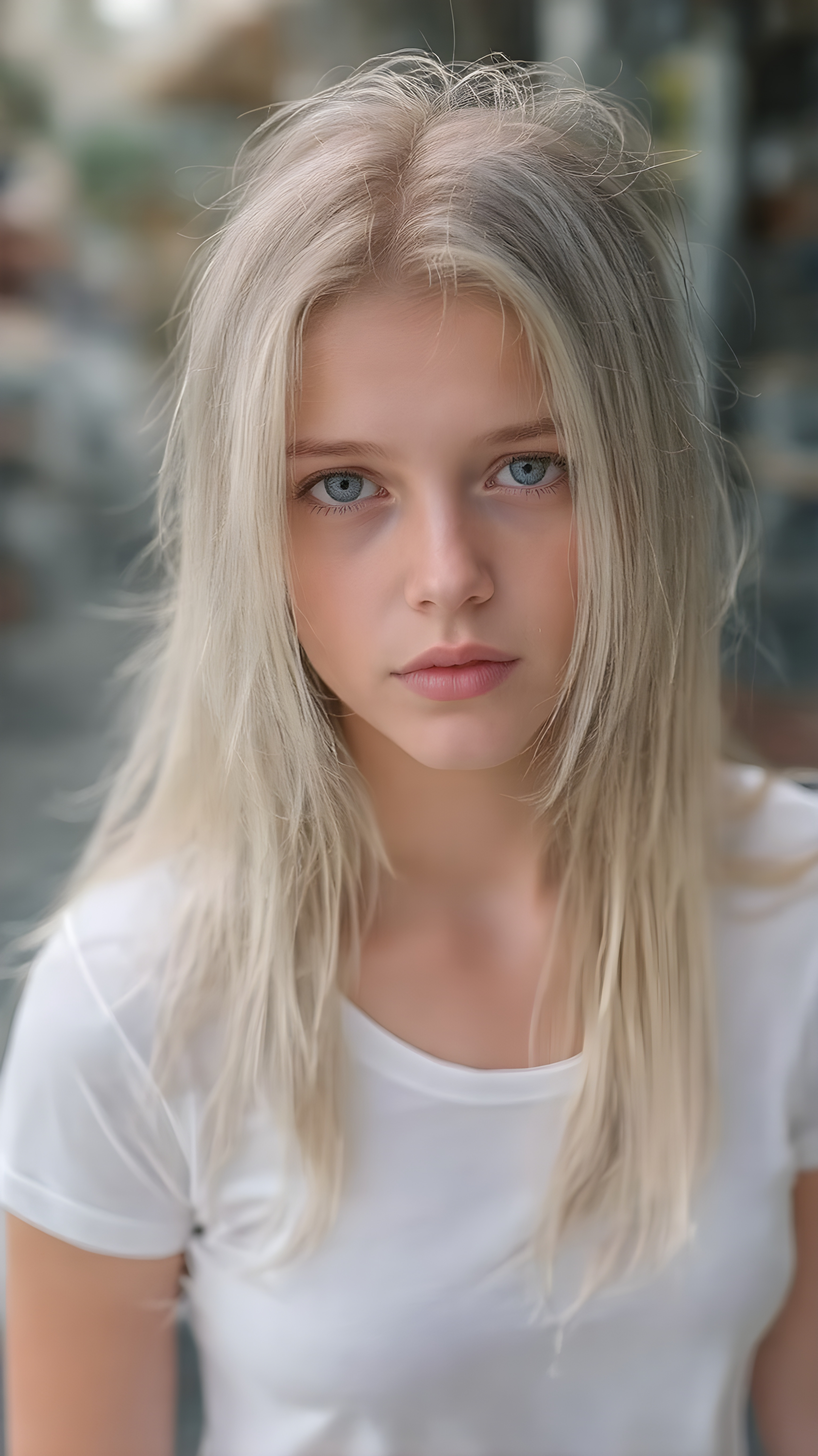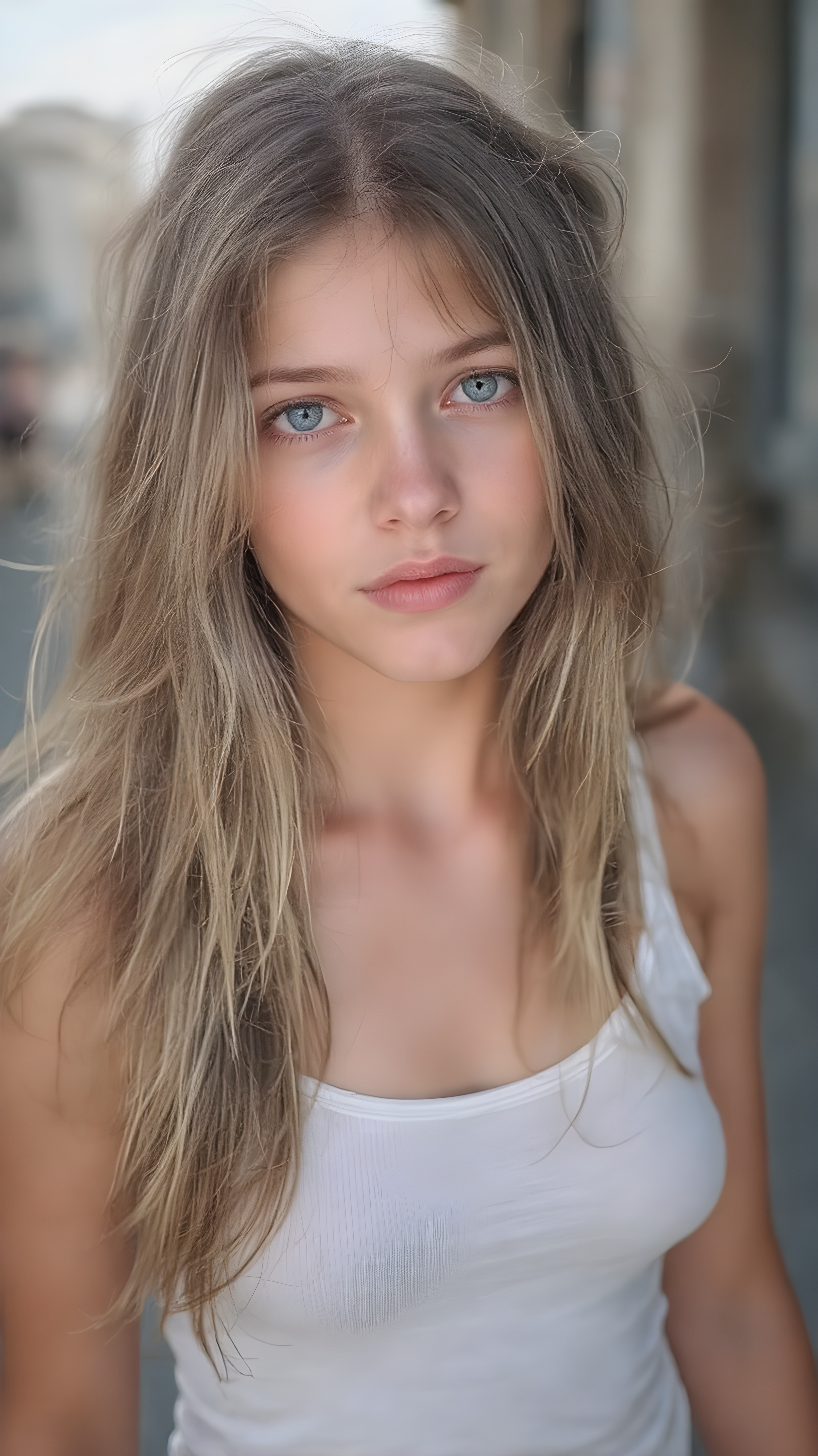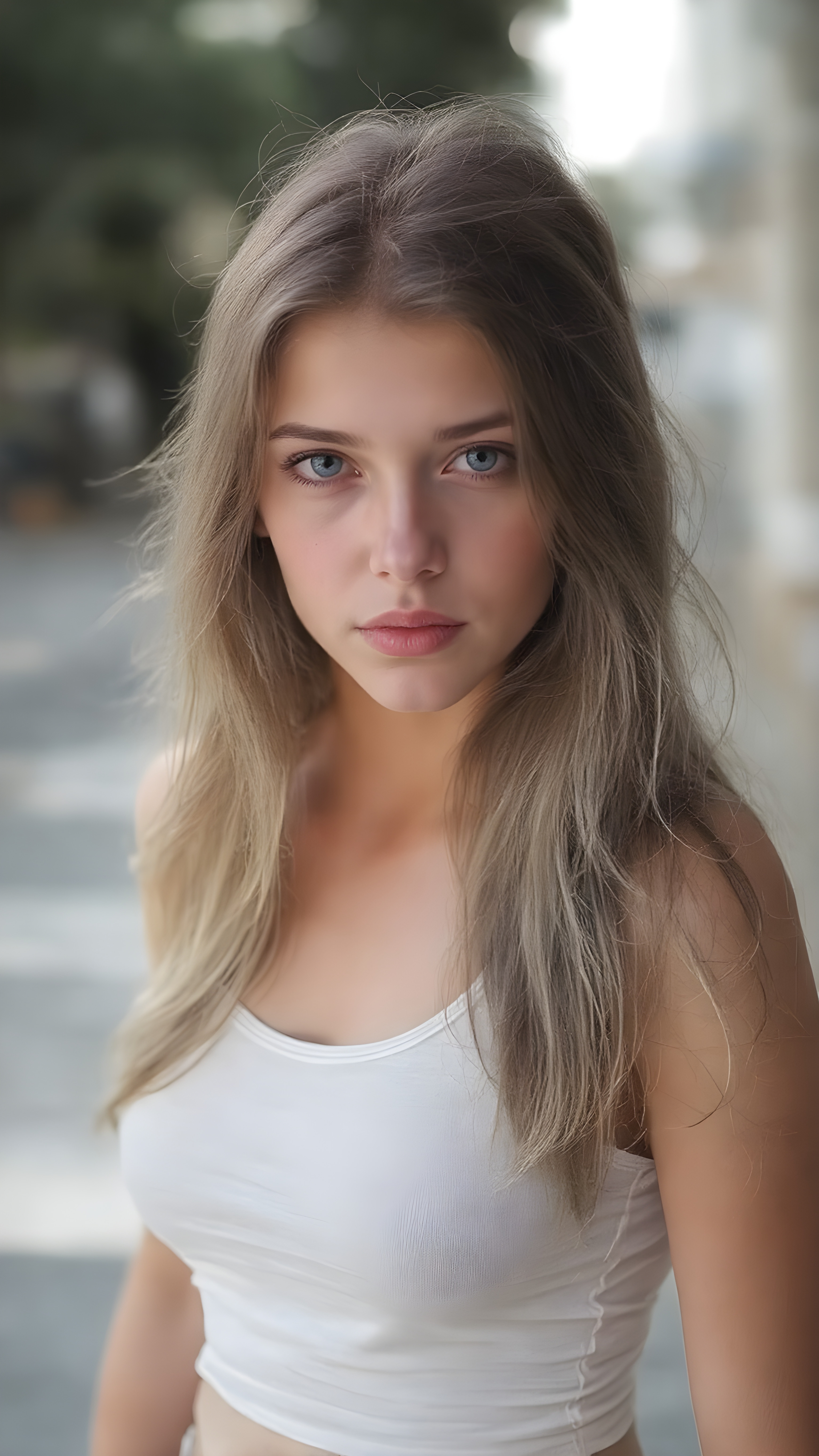 an ultra realistic hyper-detail photograph capturing a (((very cute adult pretty well busty teen girl))) with pale skin and (((brown hair))), standing alone on a street. Her hair is long, soft, and straight, with natural white streaks. She is wearing a (light white tank top) that clings to her body like a second skin, accentuating her (skinny figure). Her face is bright and open, with (natural looking eyes) that match her tresses in color and texture. The overall image is (ethereal and beautiful), with the light refracting off her skin and hair, creating a magical, natural-looking atmosphere.