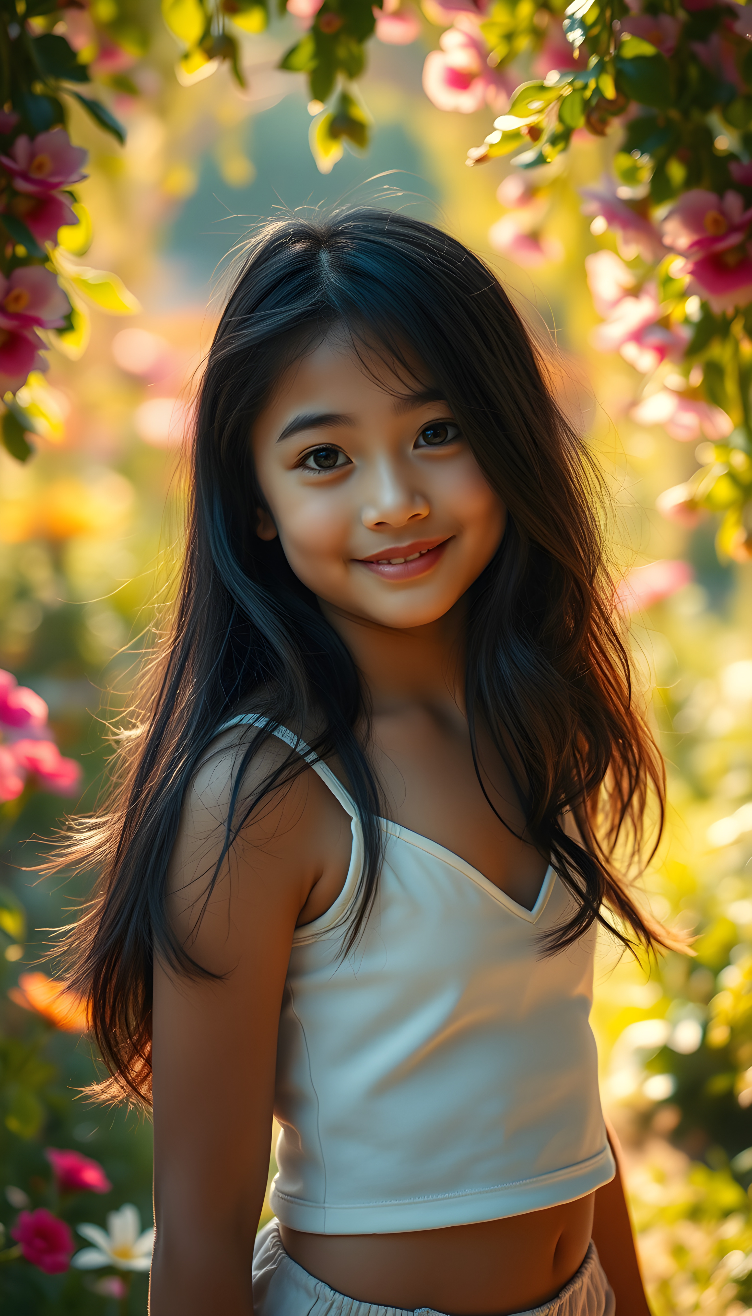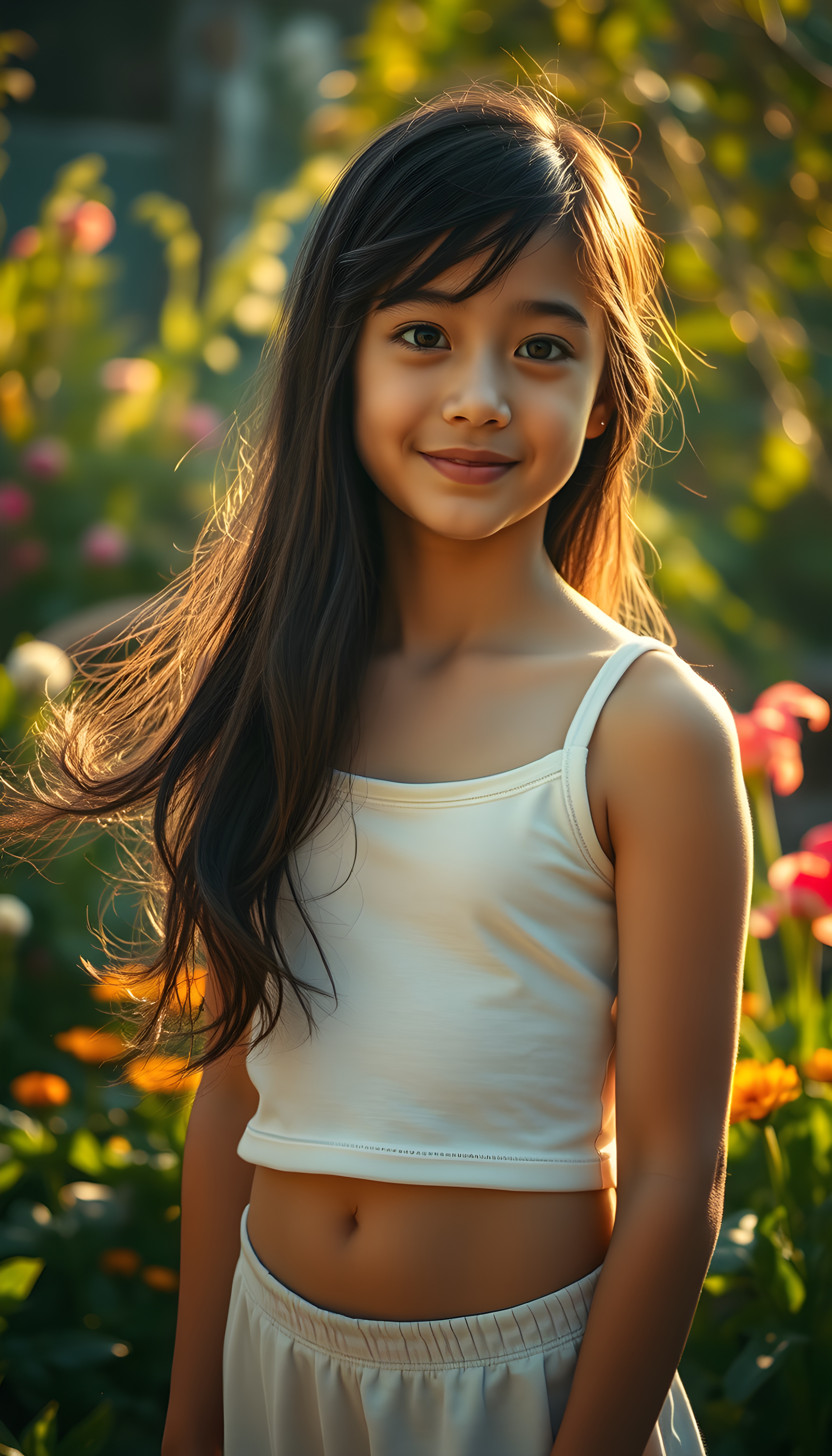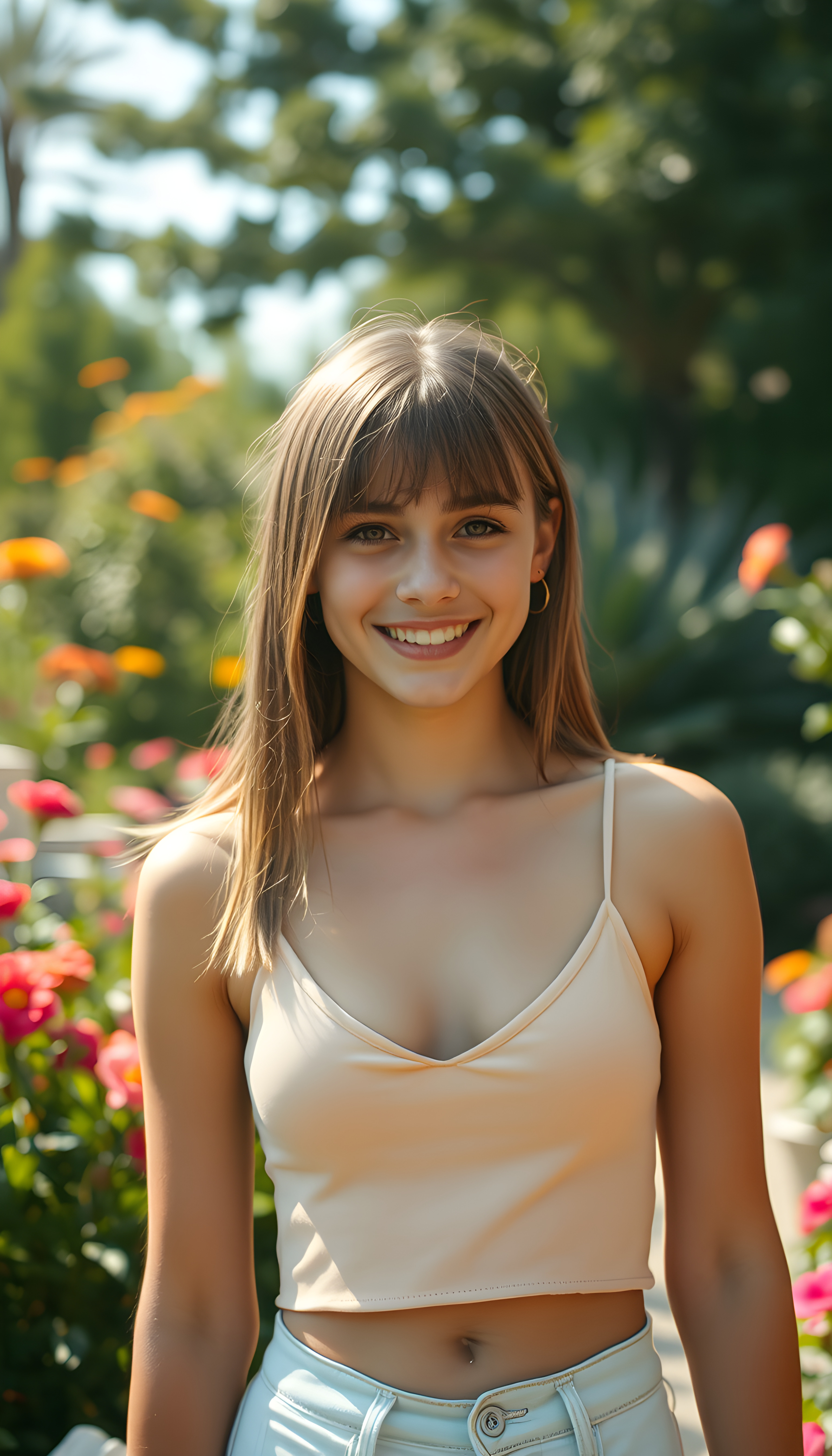 A young, tanned well busty teenage girl standing confidently in a sunlit garden. Her hair is straight and light brown, and she has a playful, mischievous smile. The garden is lush with vibrant flowers and greenery, and the sunlight casts a warm, golden glow, highlighting her features and creating a dreamy, magical atmosphere. Dressed in a short cropped spaghetti tank top, deep v-neck and wide open front, bright and cheerful, with a focus on her joyful expression and the beauty of the natural surroundings.