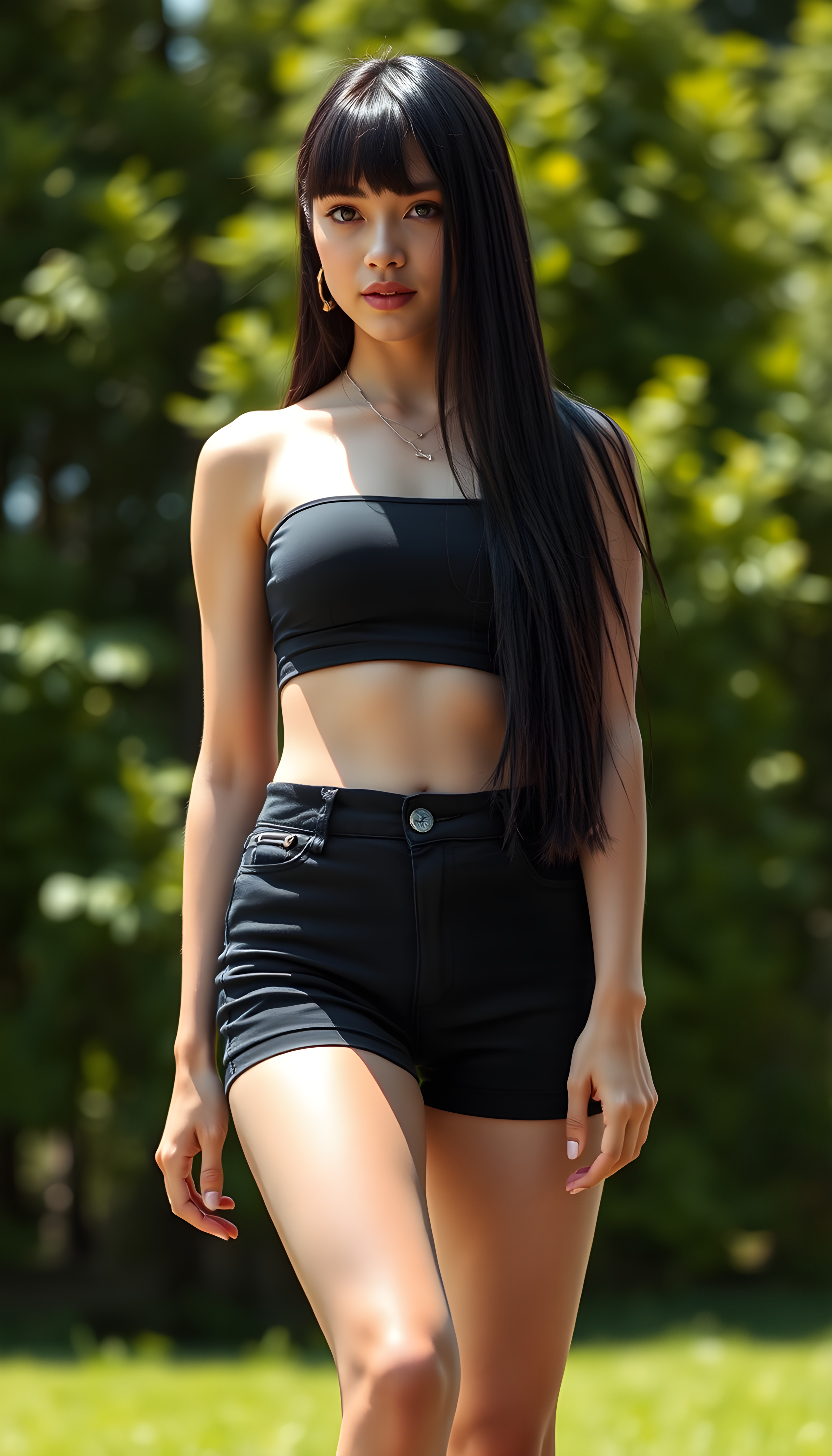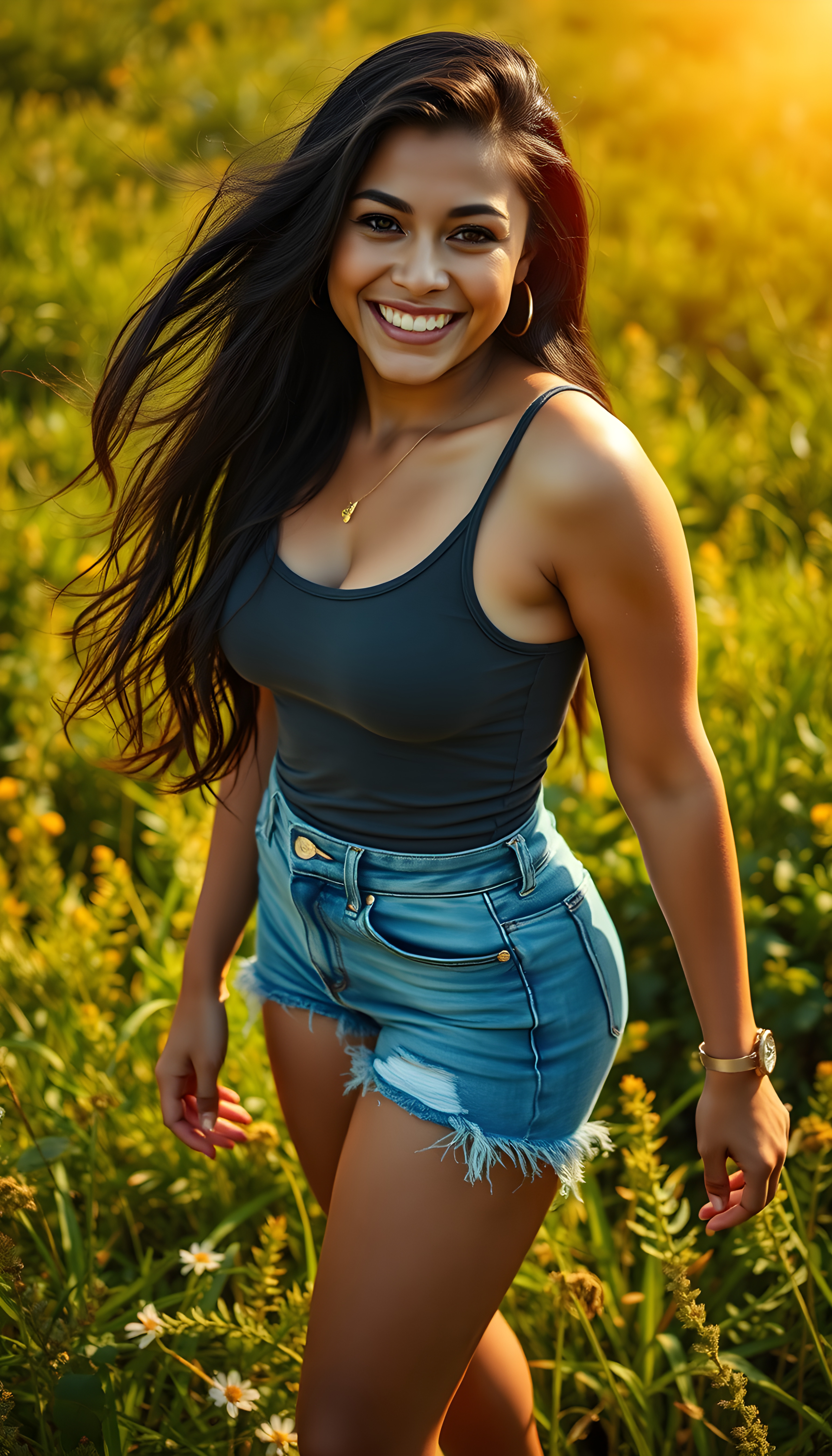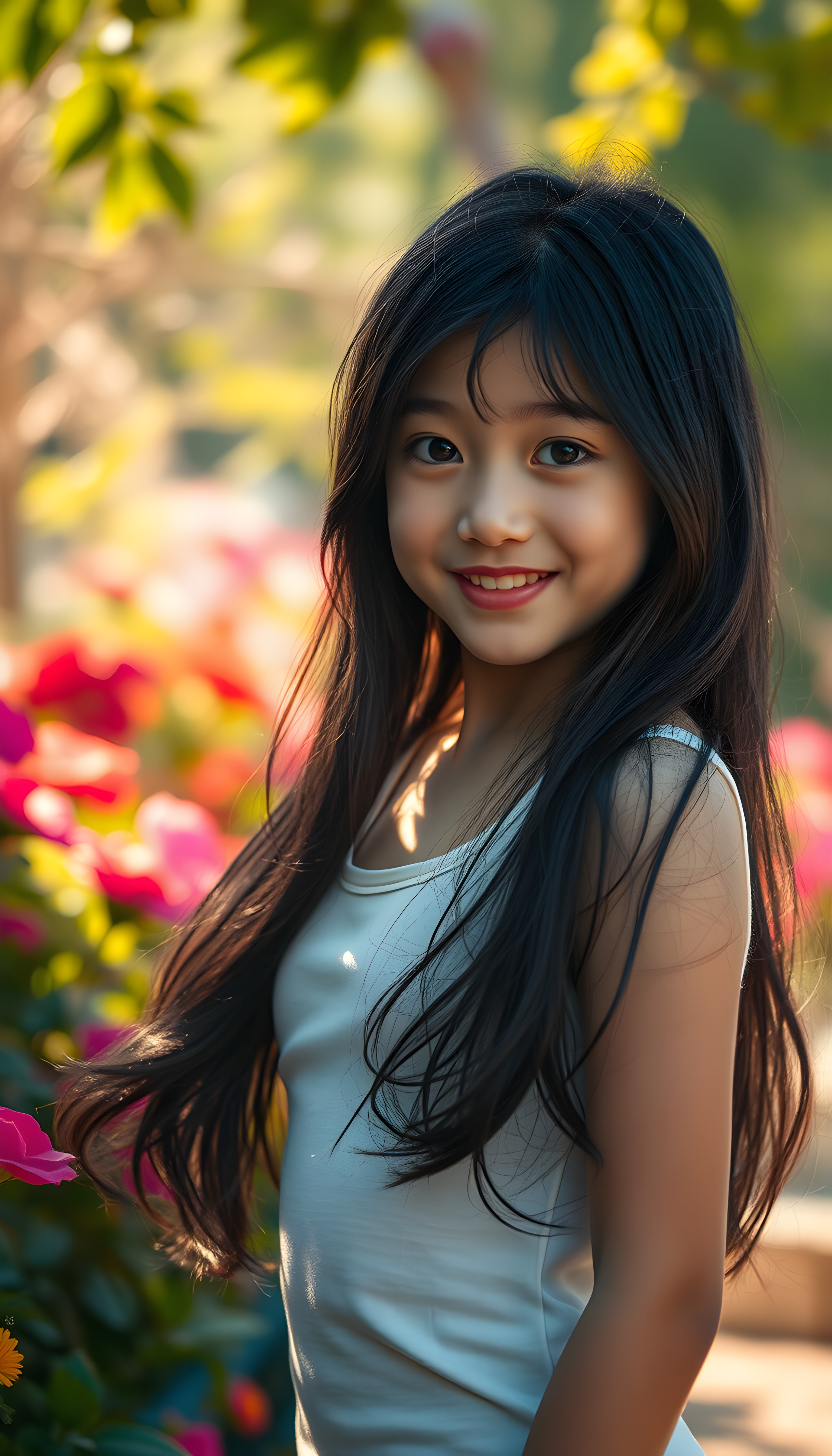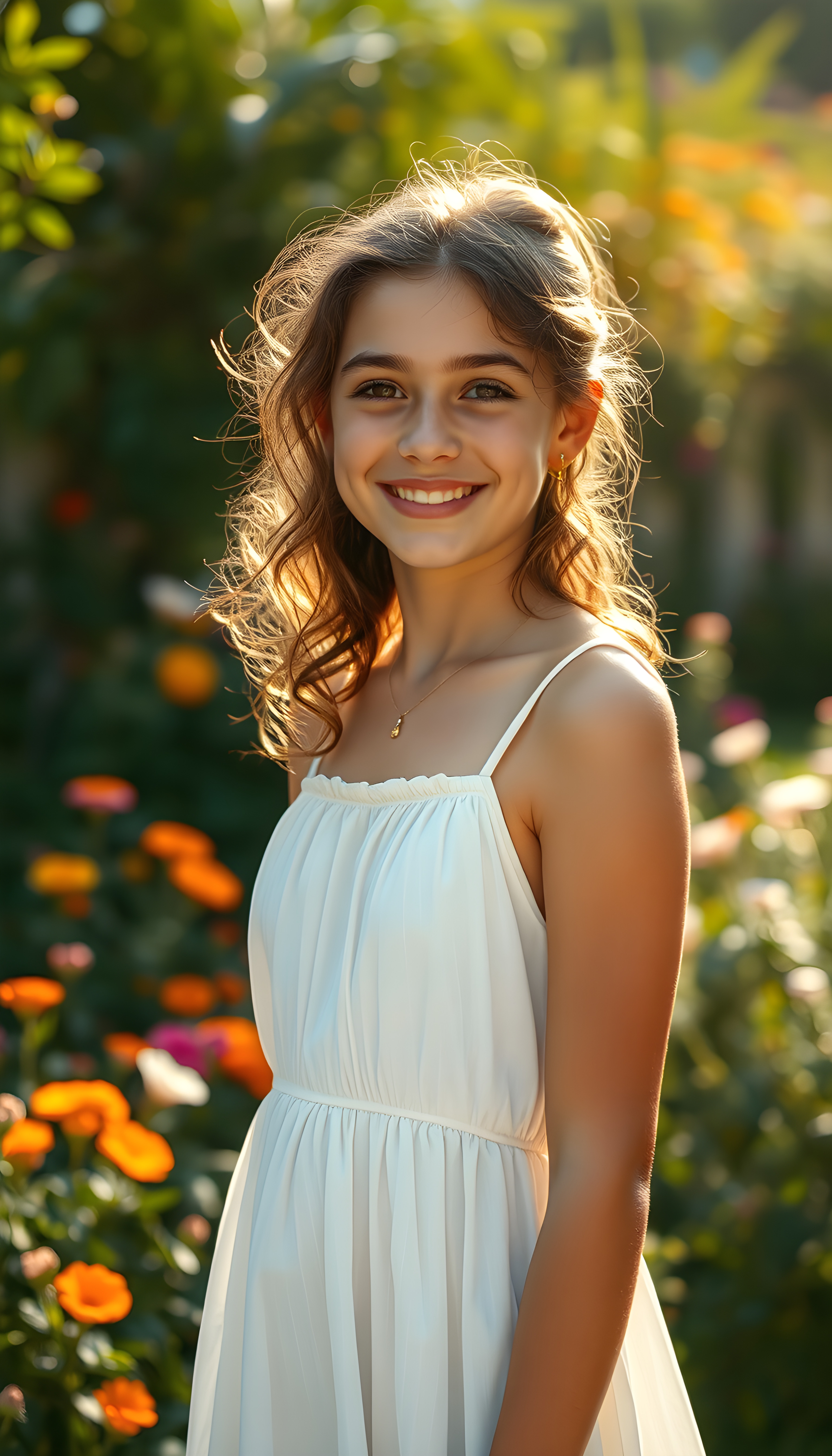 A young, tanned well busty teenage girl standing confidently in a sunlit garden. Her hair is straight and light brown, and she has a playful, mischievous smile. The garden is lush with vibrant flowers and greenery, and the sunlight casts a warm, golden glow, highlighting her features and creating a dreamy, magical atmosphere. Dressed in a short cropped spaghetti tank top, deep v-neck and wide open front, bright and cheerful, with a focus on her joyful expression and the beauty of the natural surroundings.