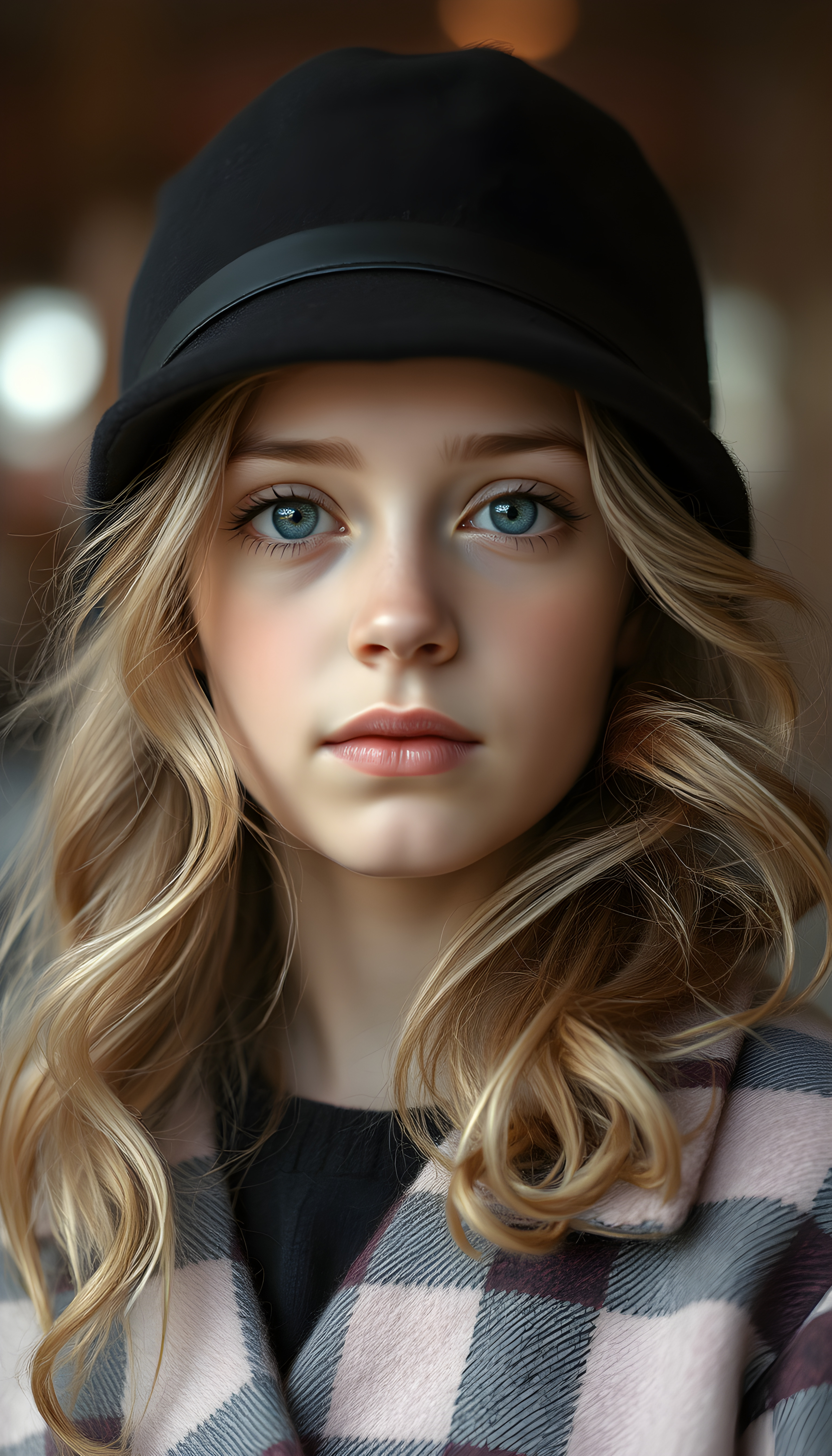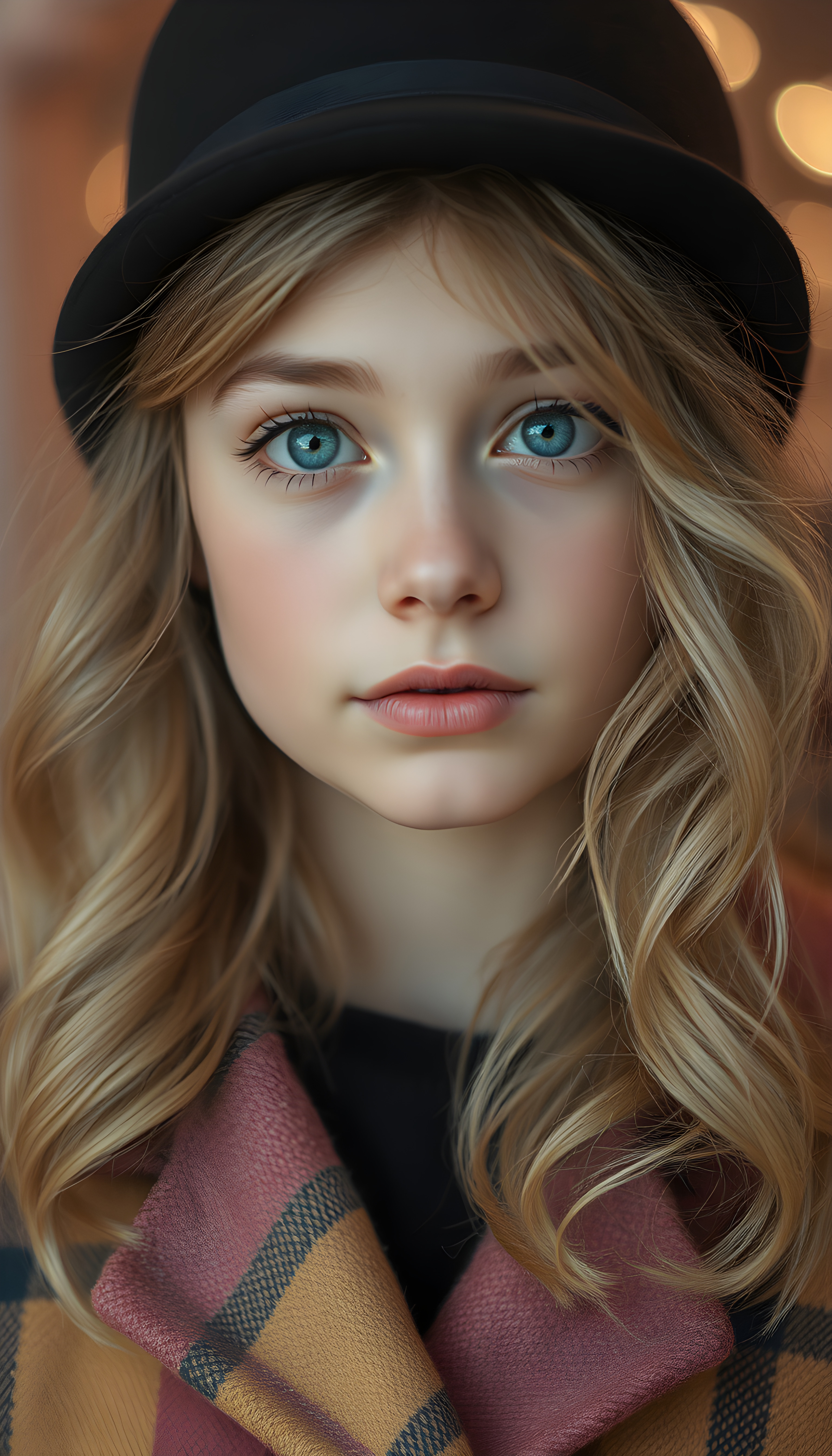 A detailed portrait of a 15-year-old girl with a youthful, radiant expression, looking directly at the viewer. She wears a stylish black hat and a vibrant checkered coat, contrasting with her soft, wavy blonde hair. Her eyes are a captivating light blue, framed by delicate eyelashes, and her full lips are subtly pink. The image is rendered in soft, pastel colors, with a gentle glow enhancing her features. The background is a dreamy blend of pastel hues, creating a serene and enchanting atmosphere.