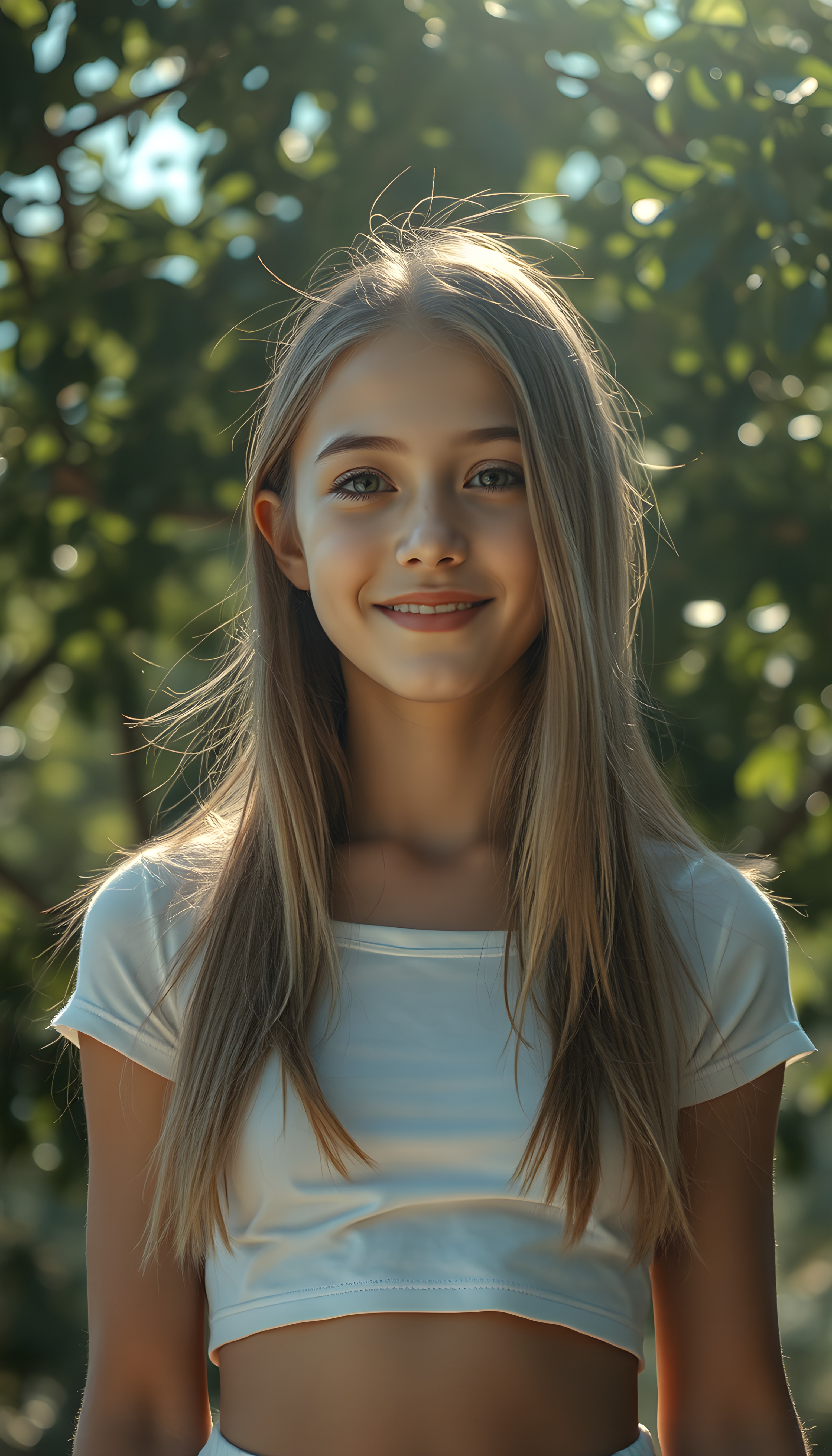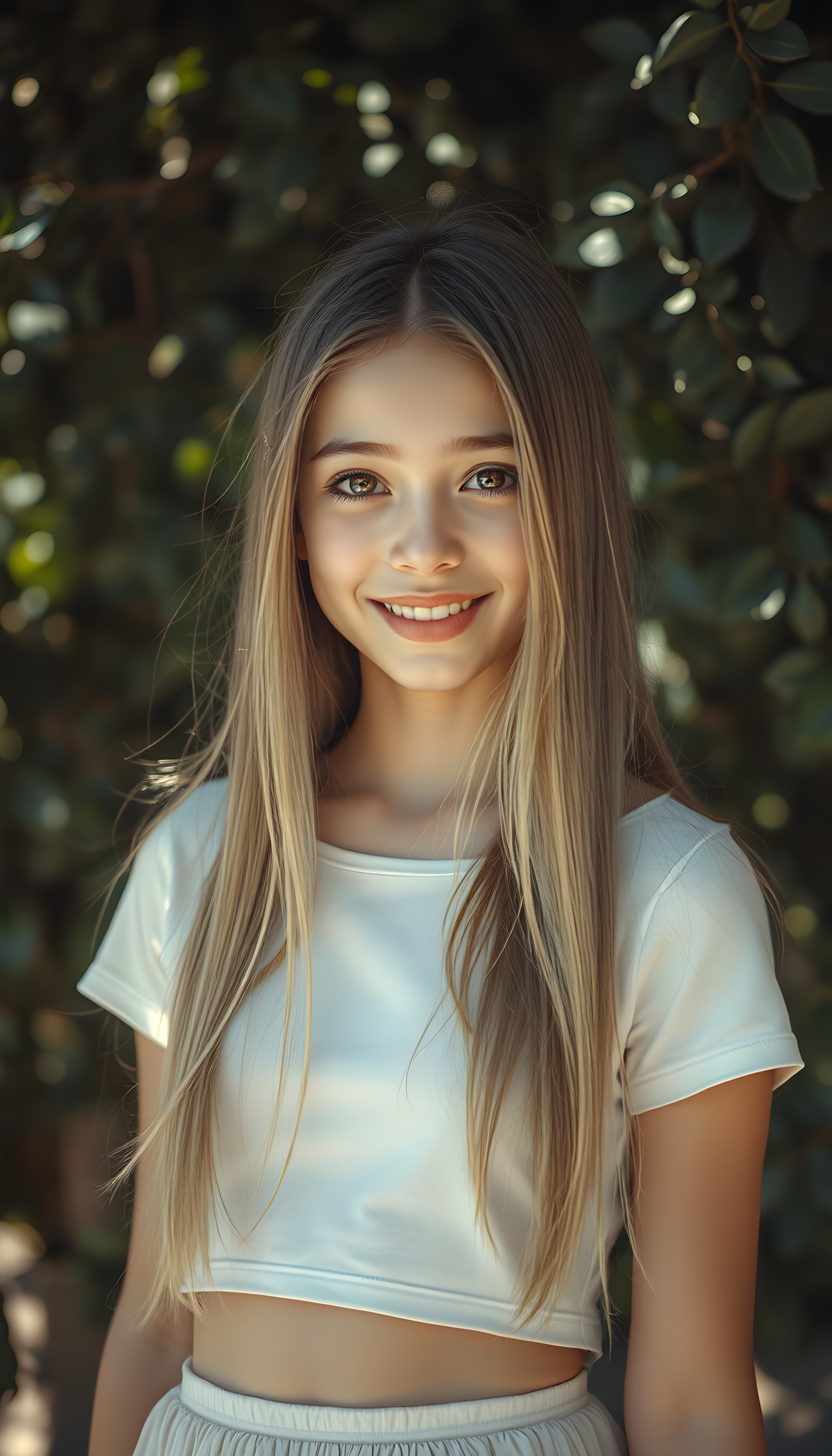 In a surrealist beautiful setting, a beautiful well busty young girl with porcelain skin adorned with delicate, bright face focus, round face. Her warm, brown eyes, smiles and her open long glossy golden straight shinning hair. She wears a light white crop t shirt with long skirt. The light reflects and refracts, creating an interplay of light and shadow that enhances the ethereal atmosphere. Perfect round belly button. The background is a dark green leaves tree, flowing colors, adding depth and a sense of magic to the composition.