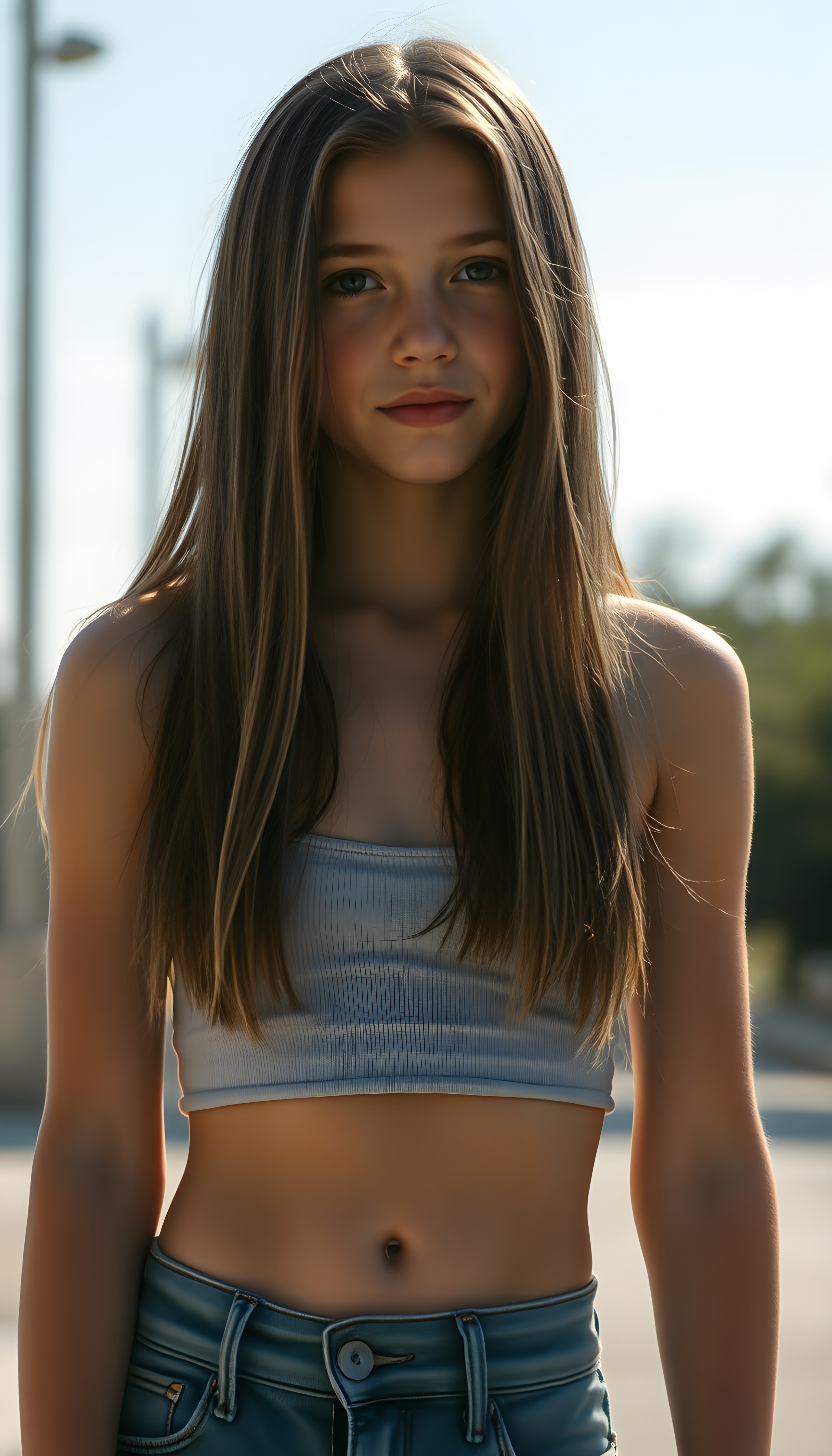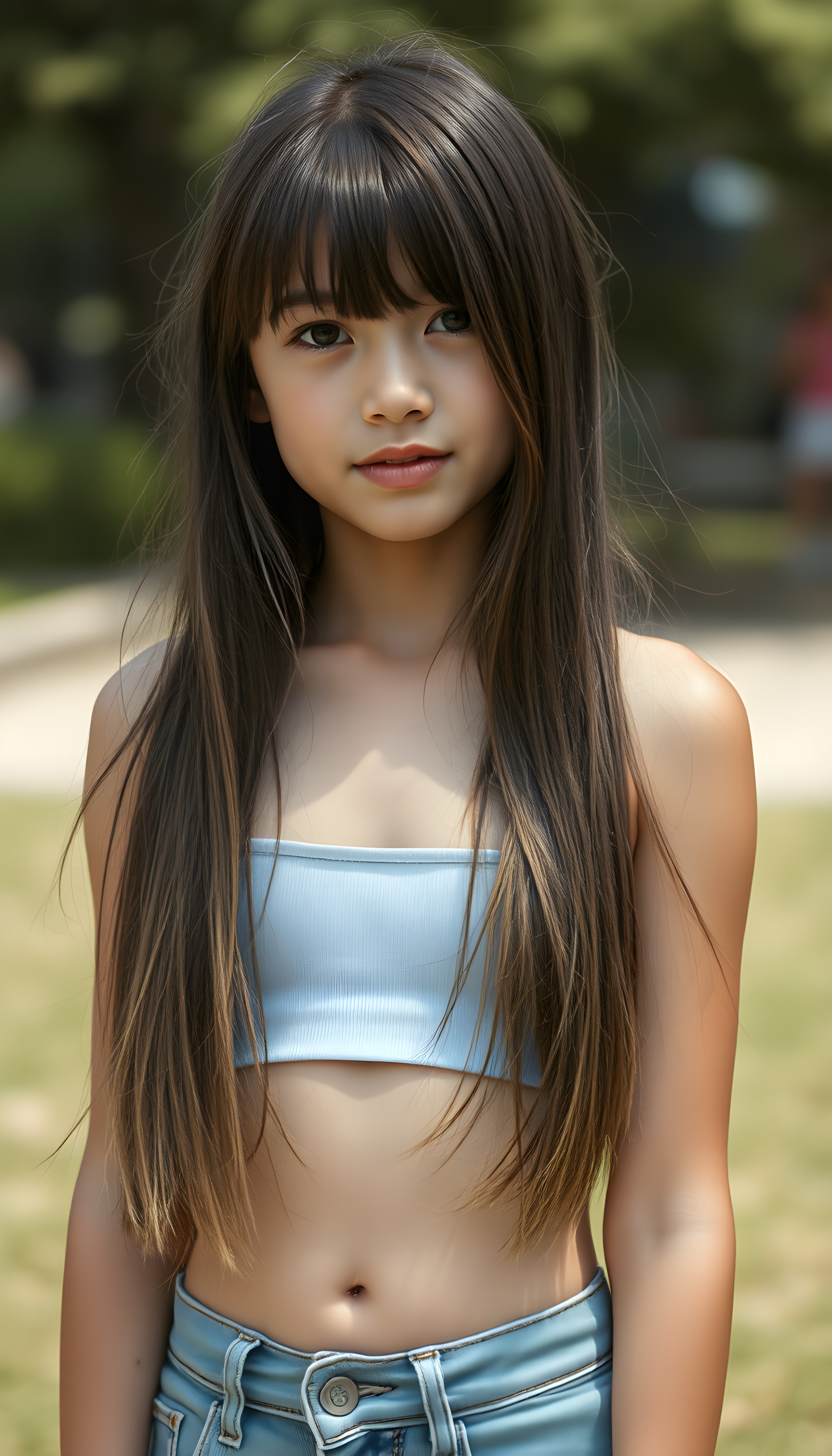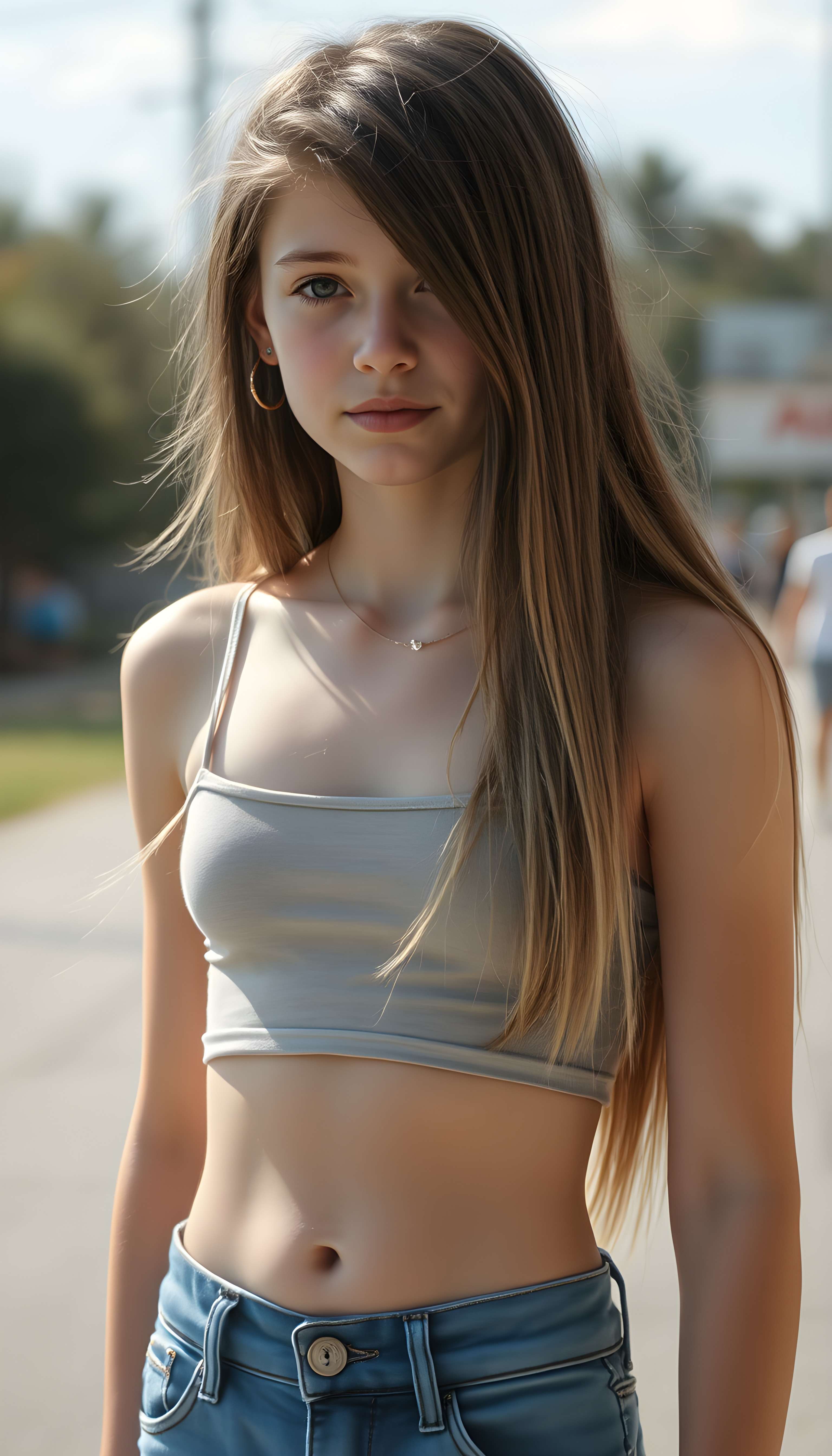 a full body shot (((detailed and realistic photo))), capturing a (((very young teenage girl))), with (long, silky, soft straight jet dark hair and blonde fine strands, same length right and left), wearing a (((cropped spaghetti tank top, belly button))), accessorized with (((blue short jeans))), all against a backdrop of a (beautiful, sunny day)